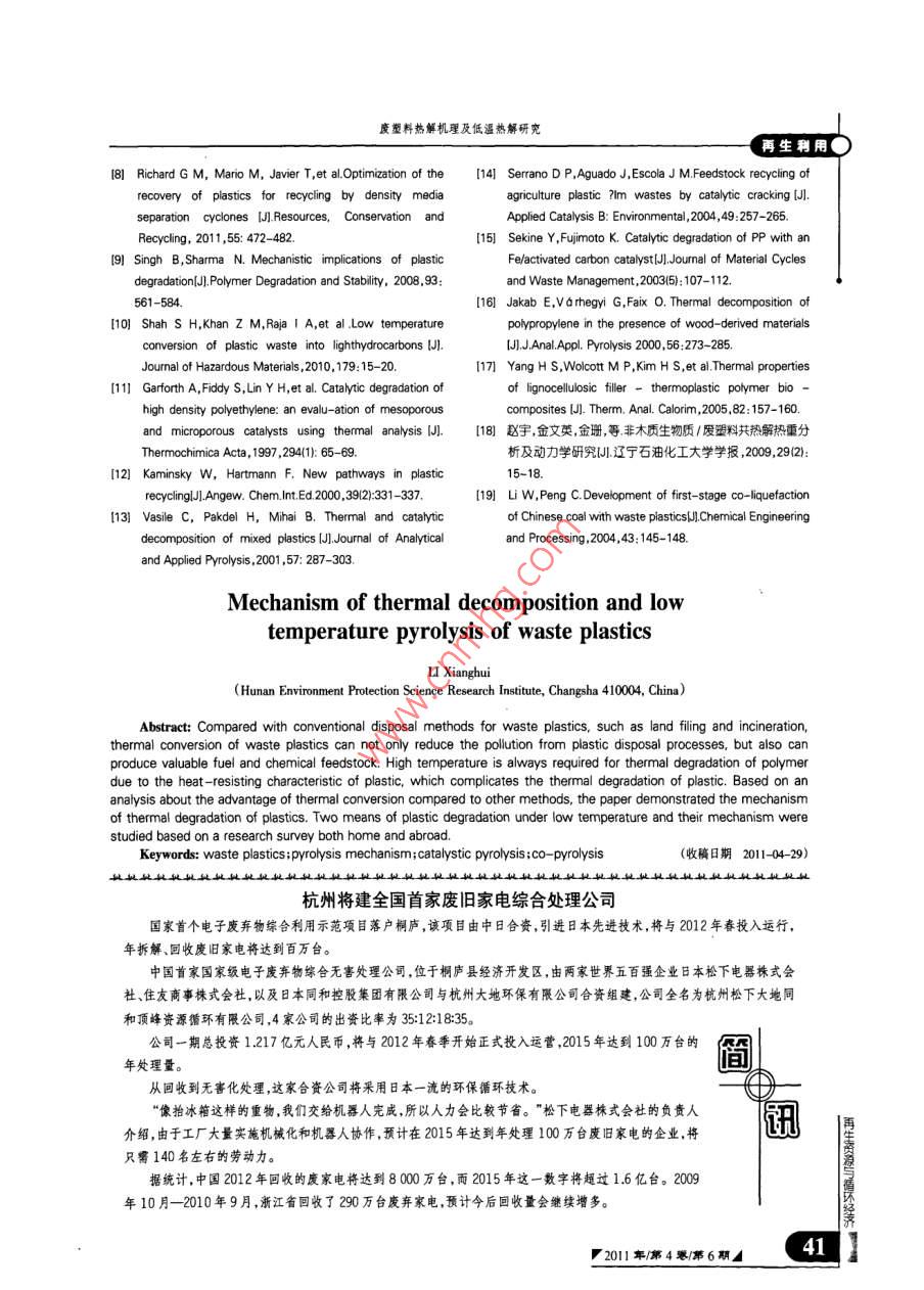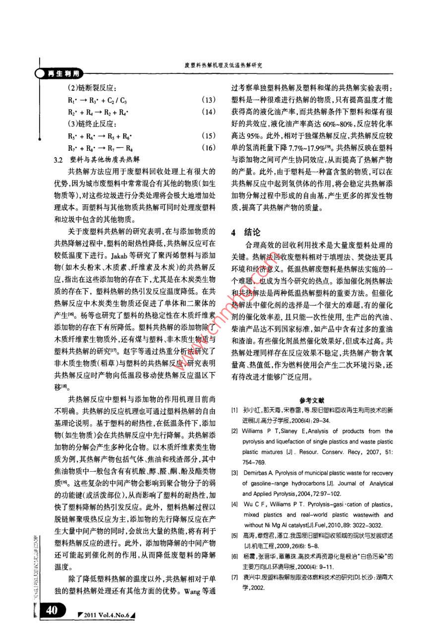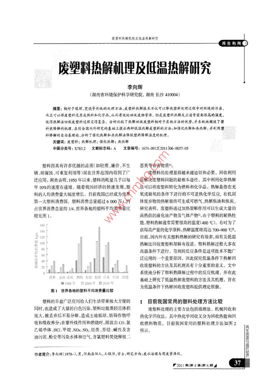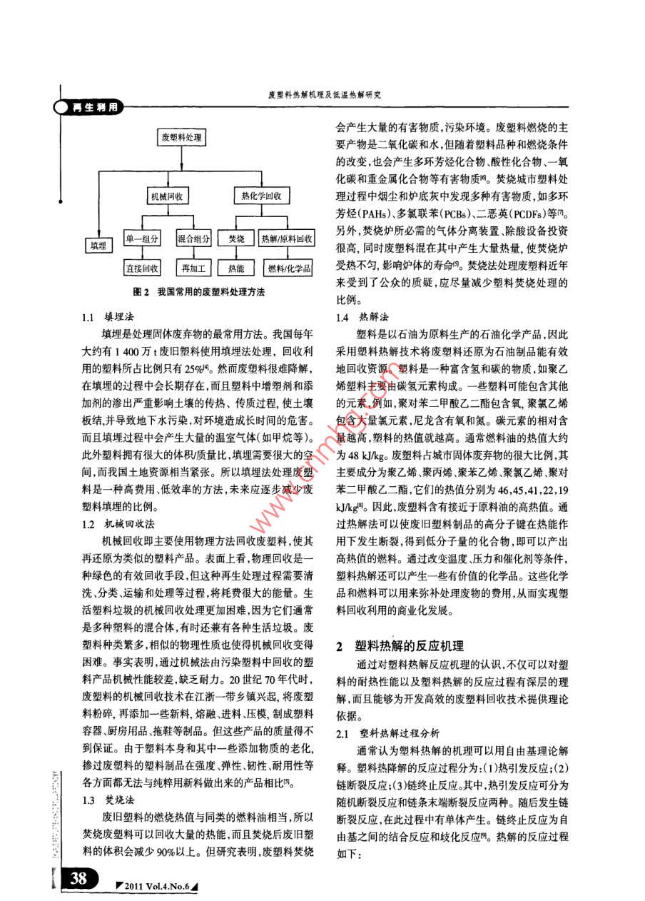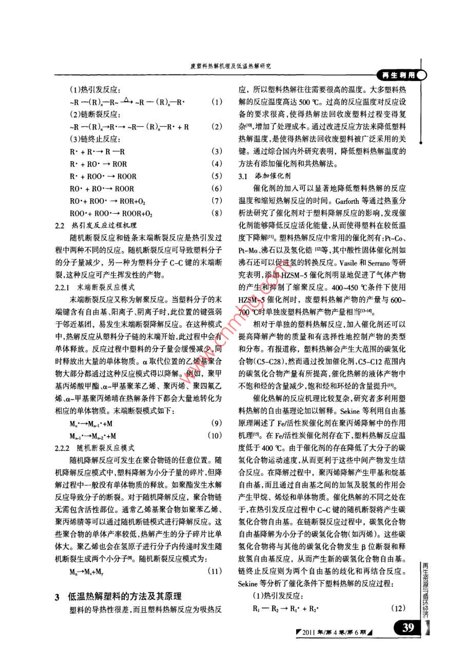 成塑料熱解機(jī)理及低溫?zé)峤庋芯? 再生利用.廢塑料熱解機(jī)理及低溫?zé)峤庋芯坷钕蜉x(湖南省環(huán)境保護(hù)科學(xué)研究院,湖南長(zhǎng)沙410004)摘要:相對(duì)于填埋、焚燒等傳統(tǒng)的處理方法,廢塑料熱解技術(shù)不僅可以降低塑料處理過程中對(duì)環(huán)境的污染,而且可以將廢塑料還原成燃料和化學(xué)品.從而有效地回收廢物資源。但是廢塑料熱解反應(yīng)通常需要很高的溫度,使得熱解法回收廢塑料過程變得復(fù)雜。分析比較了熱解回收廢塑料相對(duì)于其他方法的優(yōu)勢(shì),并系統(tǒng)地闡述了塑料熱降解的機(jī)理。在綜合國(guó)內(nèi)外研究的基礎(chǔ)上提出兩種低溫?zé)峤鈴U塑料的方法:加催化熱解和共熱解。并利用塑料降解的自由基理論.分析了催化熱解和共熱解法降低塑料降解溫度的機(jī)理。關(guān)鍵詞:廢塑料;熱解機(jī)理;催化熱解;共熱解中圖分類號(hào): X783.2文獻(xiàn)標(biāo)志碼:A 文章編號(hào): 1674-0912(2011 )06 0037-05塑料因具有許多優(yōu)越的品質(zhì)(如輕質(zhì)、廉價(jià)、不生惡英等有害物質(zhì)"。銹、耐腐蝕、可重復(fù)利用等)而在世界范圍內(nèi)得到了廣廢塑料的處理顯得越來越迫切和必要。回收利用泛應(yīng)用。調(diào)查表明,1950年以來,塑料消耗量幾乎以每是解決廢塑料問題的最根本途徑,其中利用化學(xué)熱解年10%的速度在遞增。隨著我國(guó)經(jīng)濟(jì)的快速發(fā)展,塑法可以將廢塑料轉(zhuǎn)化為燃料和化學(xué)品。熱解是指在無料的人均消費(fèi)量大幅度增長(zhǎng)。目前我國(guó)已經(jīng)成為世界氧或缺氧的條件下進(jìn)行的不可逆熱化學(xué)反應(yīng),有機(jī)固第一大塑料消費(fèi)國(guó),塑料消費(fèi)總量超過6 000萬1,約體廢棄物的熱解最終可生成可燃?xì)?、熱解焦油和焦炭。占世界消費(fèi)總量的14。世界各地的塑料平均消費(fèi)量比研究表明,廢塑料通過加熱裂解作用可以生成大量的較見圖1。高熱值的液化油產(chǎn)物及氣體產(chǎn)物”。由于塑料的耐熱性能.塑料熱解通常需要很高的溫度(400 C)。有時(shí)為了60「40 t獲得高產(chǎn)量的化學(xué)原料,熱解溫度將高達(dá)700-900 CR。120 t目前,國(guó)內(nèi)外有關(guān)塑料熱解的研究有很多,而有關(guān)低溫100 t熱解法回收廢塑料卻鮮有報(bào)道。塑料熱解過程大多在高溫條件下進(jìn)行,苛刻的反應(yīng)條件是這項(xiàng)技術(shù)不能廣60泛應(yīng)用的一-個(gè)重要原因,因此探究低溫條件下熱解回收廢塑料的方法及其機(jī)理具有十分重要的意義。文中世界亞洲非洲西歐東歐美國(guó)日本中國(guó)印度系統(tǒng)地分析了塑料熱降解過程中的反應(yīng)機(jī)理,并在此基礎(chǔ)上研究了低溫?zé)峤鈴U塑料的方法及其機(jī)理,旨在■1980年口2000年 口2010年為低溫條件下熱解回收廢塑料提供理論依據(jù)。圖1世界各地的塑料平均消費(fèi)量比較塑料的日益廣泛應(yīng)用給人們生活帶來極大方便的1目前我 國(guó)常用的塑料處理方法比較同時(shí),也造成了大量的白色污染。塑料垃圾質(zhì)輕且體積廢塑料處理的主要方法包括填埋法,機(jī)械回收和龐大,被丟棄后不易分解.造成土地板結(jié),妨礙作物呼熱化學(xué)回收法。其中熱化學(xué)回收又分為回收熱能和回吸和吸收養(yǎng)分;在紫外線作用和燃燒時(shí),排放出C0.氯收燃料物質(zhì)。目前我國(guó)常用的塑料處理方法如圖2乙烯單體.HCI.甲烷.NOx .SO、烴類、芳烴、堿性及含所示油污泥、粉塵等污染水體和空氣,含氨塑料焚燒釋放二作者簡(jiǎn)介:李向輝(1979-),男,河南洛陽人,工程師,學(xué)士,研究方向:廢水治理與固廢資源化。r 2011年/第4卷/第6期▲廢塑料熱解機(jī)理及低溫?zé)峤庋芯吭偕脮?huì)產(chǎn)生大量的有害物質(zhì),污染環(huán)境。廢塑料燃燒的主廢塑料處理I要產(chǎn)物是二氧化碳和水,但隨著塑料品種和燃燒條件的改變,也會(huì)產(chǎn)生多環(huán)芳烴化合物、酸性化合物、一氧化碳和重金屬化合物等有害物質(zhì)間。焚燒城市塑料處|機(jī)械同收|熱化學(xué)回收理過程中煙塵和爐底灰中發(fā)現(xiàn)多種有害物質(zhì),如多環(huán)芳烴(PAHs)、多氯聯(lián)苯(PCBs)、二惡英(PCDFs)等四?;旌辖M分焚澆 ] 熱解/原料回收另外,焚燒爐所必儒的氣體分離裝置,除酸設(shè)備投資[填埋]很高,同時(shí)廢塑料混在其中產(chǎn)生大量熱量,使焚燒爐直按回收再加工兒熱能」[ 燃料化學(xué)品受熱不勻,影響爐體的壽命9。焚燒法處理廢塑料近年來受到了公眾的質(zhì)疑,應(yīng)盡量減少塑料焚燒處理的圈2我國(guó)常用的廢塑料處理方法比例。1.1 填埋法;.4 熱解法填埋是處理固體廢棄物的最常用方法。我國(guó)每年塑料是以石油為原料生產(chǎn)的石油化學(xué)產(chǎn)品,因此大約有1 400萬t廢舊塑料使用填埋法處理,回收利采用塑料熱解技術(shù)將廢塑料還原為石油制品能有效用的塑料所占比例只有25%月。然而廢塑料很難降解,地回收資源。塑料是- -種富 含氫和碳的物質(zhì).如聚乙在填埋的過程中會(huì)長(zhǎng)期存在,而且塑料中增塑劑和添烯塑料主要由碳?xì)湓貥?gòu)成。一些塑料可能包含其他加劑的滲出嚴(yán)重影響土壤的傳熱、傳質(zhì)過程,使土壤的元素,例如,聚對(duì)苯二甲酸乙二酯包含氧,聚氯乙烯板結(jié),并導(d