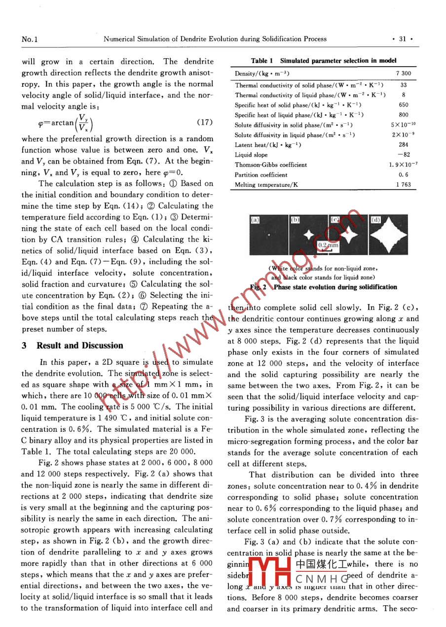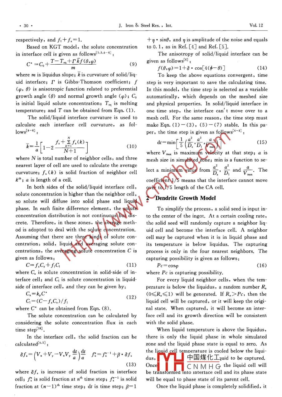 Vol.12 No. 1J. Iron & Steel Res. , Int.Jan, 2005Numerical Simulation of Dendrite Evolution during Solidification ProcessLI Qiang',GUO Qiao-yi?,REN Chuan-fu3(1. Shenyang University of Technology, Shenyang 110023, China;2. Shenyang Ligong University,Shenyang 110168, China; 3. Shenyang University, Shenyang 110044, China)Abstract: In order to precisely describe the dendrite evolution during solidification process, especially in micro-scale, a continuous method is presented to deal with the discontinuous physical properties beside the solid/liquidinterface. In this method, the physical properties are used as averaging physical properties of solid phase and liquidphase in the interface zone, which can smooth the property gap between solid and liquid phases, and make theproperties from liquid phase to solid phase. The simulated results show that the method can represent the side-branches and the solute micro-segregation well.Key words: numerical simulation; continuous method; dendrite evolution; micro segregationSolidification is a very complicated process indifferent values. So some researchers used othercluding heat and solute transfer, phase transitionmethods to deal with the discontinuous properties,and interface migration processes which directly in-Damir JuricCL3] adopted the Front-Tracking methodfluence solidification microstructure. Solidification(FT) using complex expression to define the posi-microstructure is an important index to evaluate me-tion of solid/ liquid interface, which limits the calcu-chanical and other physical properties of the finallating scale. The sharp -interface method (SI), usedproduct. In the past, most of researchers used ex-by Udaykumar H S14, has too much calculation ofperimental and theoretical methods to study the so-the interface temperature by iterating the solute con-lidification theory[1,2].However, experimentalcentration. The phase field (PF) method requiresmethods are expensive and cannot avoid the limita-the mesh size to be smaller than the interface thick-tion caused by the conditions, while the theoreticalnessl1s,16], which also limits the calculation scale.methods cannot describe the solidification micro-As stated by Christof Eck et al[1],these models re-structure preciselyt3. The numerical simulationquire much more details of dendrite in order to ob-method can overcome the problems and predict the tain reasonable results, which are only suitable tosolidification microstructure accurately, so there ismicro-scale. In this paper, Cellular Automatonmuch interest on this method in recent years4- 17] .(CA) method is adopted because this method is notDendrite is one of the most common morpholo-limited by simulated size and CA rules are simple togies of solidification microstructure and has a directunderstand.impact on the final casting mechanical propertiesConsidering the discontinuous properties in in-through the local cooling conditions. Therefore, terface zone, a continuous method is developed, assimulation of the dendrite formation and evolutionillustrated in Fig. 1. In this method, the propertieshas attracted much attention[4- 17].of interface can be treated as a continuous functionWhen liquid transforms into solid phase, heat of solid fraction to smooth property gap between theconductivity, specific heat and density of the liquid solid and liquid phases, so that the unstable heat andmaterial change greatly. In order. to solve these dis-solute transfers can be reflected to precisely describecontinuous problems, some researchers took the sol-the solid fraction, interface velocity and solute con-id and liquid physical properties as a constant and re-centration redistribution in interface zone. Mean-garded their values as equalC4- 12]. However, this apwhile, the averaging solute concentration is adoptedproximate simulation make the results deviate from to keep the total solute concentration conservation.real dendrite morphology because the heat transferand solute diffusing rates in different phases have of th中國煤化工。-only requires its ve-Bography: LI Qiang(1973-), Male Doctor, Letureship; E mail: qli@imr. acTHCNM H G,No.1Numerical Simulation of Dendrite Evolution during Solidification ProcessIn the interface cell, solute conservation equa-Volume elementLiquid.tion is given[14-6] as:physical,2(0propertyLiquidphysica(1-k,)C*Vx=D.(N).-D(),(3)l propertyIn addition, the chemical potential is assumedSold Liquidas equilibrium beside the solid/liquid interface,x_(0x(0)which causes the redistribution of solute concentra-tion, as follows:hak.f+kxhC,=kpc*(4)f+f=1Boundary conditions:SoldpaC=0aT_(5)an)第=q q=h(T" - Tm)Liquid : Iteiface i0 f(x)→5,T(1=0,x,y)= To(x,y), C(=0,x,y)=Co(x,y)Initial conditions: .(6)Fig. 1 Continuous method to deal withdiscontinuous propertieswhere ρ is density; Cp is specific heat; k is thermalconductivity; Ln is latent heat released by phaselocity and which cell it' s located. Therefore, there istransition from liquid to solid phase; f, is solid frac-no much calculation for tracking and can be extendedtion; T is temperature, t is time; C is solute concen-to macro-scale simulation. Moreover, the stochastictration; D is solute diffusion coefficient, and in solidmethod is used to show the nucleation and growth,and liquid cell, D is equal to D and D, respective-thus the evolution can reflect the random feature ofy; C* is solute concentration in interface cell; Vx issolidification microstructure.normal velocity of solid/ liquid interface; kp is soluteContinuous Method of Heat and Speciespartition coefficient in interface cell, which is as-sumed as a constant and reflects solutal concentra-Transfertion gap between solid and liquid phase beside inter-Dendrite evolution process involves two primaryface; n is normal direction of solid/ liquid interface;aspects: heat and solute transfer model, and nuclea-Tm is temperature of boundary cell; h is heat trans-tion and interface migrating process in undercoolingfer rate on boundary; Tsur i