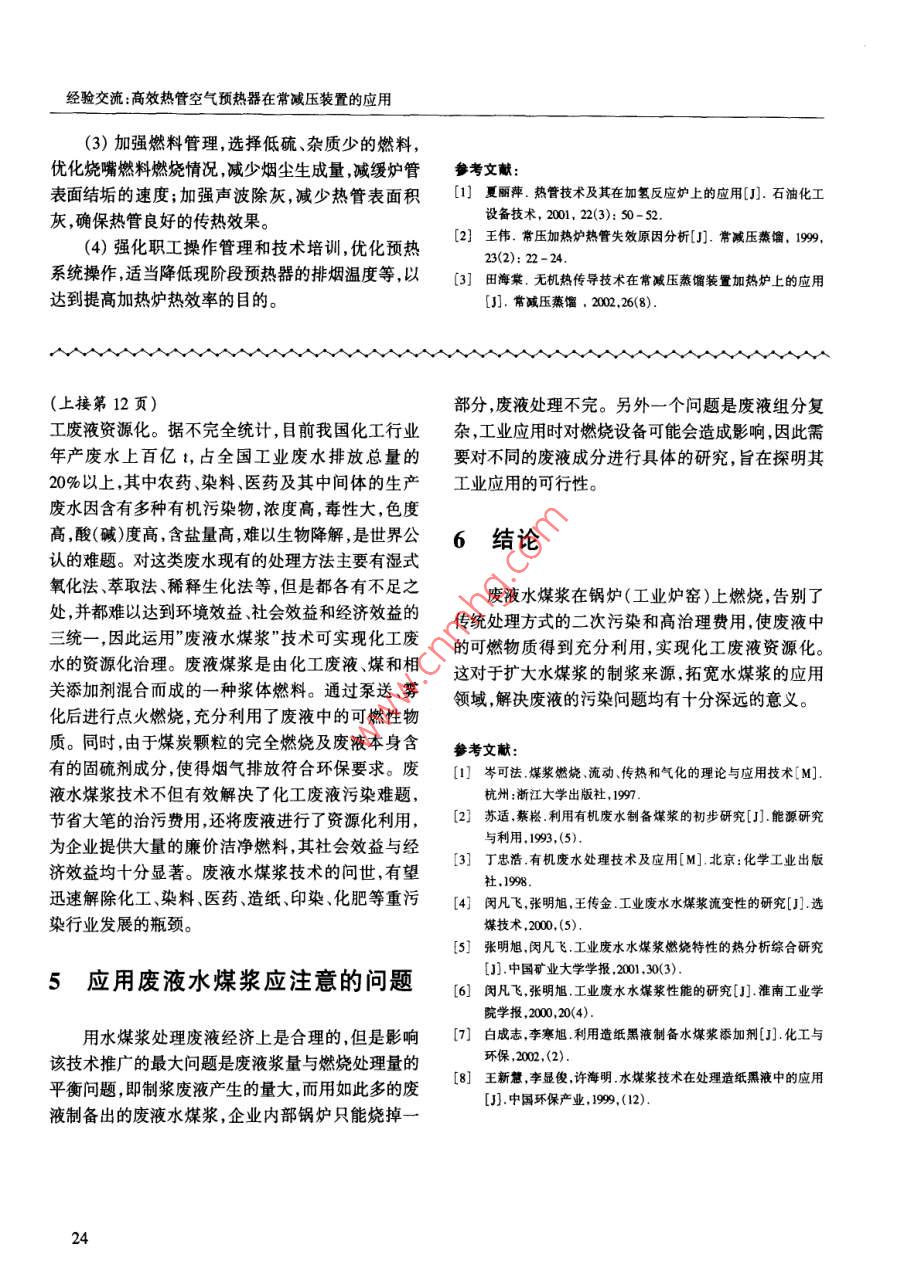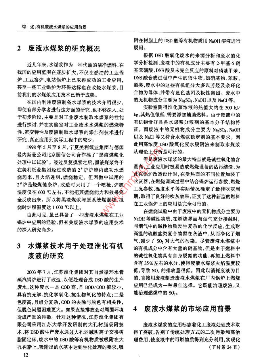 Industrial FurnaceVol 26 No 5 Sept 2004文章編號(hào):10012004)05-0011-02有機(jī)廢液水煤漿的發(fā)用前景孫粉梅1,陳春華2(1.福建省電力勘測(cè)設(shè)計(jì)院,福建福州3500032.華陽(yáng)電業(yè)有限公司,福建漳州363105)摘要:對(duì)有機(jī)廢液的來(lái)源及水煤漿的應(yīng)用現(xiàn)狀進(jìn)行綜述。介紹國(guó)內(nèi)廢液水煤漿的研究概況,水煤漿技術(shù)用于處理準(zhǔn)化有機(jī)廢液的研究并對(duì)廢液水煤漿的市場(chǎng)應(yīng)用前景進(jìn)行分析。認(rèn)為廢液水煤漿實(shí)現(xiàn)了廢液的資源化利用,對(duì)應(yīng)用廢液水煤漿技術(shù)可能出現(xiàn)的問(wèn)題進(jìn)行了探討。關(guān)鍵詞:廢液水煤漿;應(yīng)用;前景中圖分類號(hào):TQ5344文獻(xiàn)標(biāo)識(shí)碼:BApplication and Prospect of Orgnic Waste Liquid CWSSUN Fen-mei CHEN Chun-hua(1. Fujian Province Electric Power Design Institute, Fuzhou 350003, China;2. Huayang Electric Power Limited Corporation, Zhangzhou 363105, China)Abstract: The source of organic waste liquid and the application status of CWM are summarized. Introdresearch status of waste liquid CWS and application in Huaihua. Analysis the market application foreground of wasteliquid CWS. Think that waste liquid CWS realize the resource using of waste liquid. At last discuss the problem thatwill appKey words: waste liquid CWM: application; prospect0引言無(wú)毒物或毒性變?nèi)醯奈镔|(zhì),無(wú)疑具有環(huán)保意義。我國(guó)化工行業(yè)年生產(chǎn)廢水上百億,占全國(guó)工業(yè)1有機(jī)廢液的來(lái)源及特點(diǎn)廢水排放總量的20%以上,尤其是高濃度難生物降排放有機(jī)廢液的行業(yè)比較多,主要來(lái)源于食品、解的有毒有機(jī)廢水,其處理方法一直是困擾環(huán)保領(lǐng)發(fā)酵、屠宰、造紙、制糖、橡膠、紡織、印染、農(nóng)藥、焦域的“老大難問(wèn)題”。因此大力開(kāi)展工業(yè)廢水的治理化、石油化工等工業(yè)廢水及城鎮(zhèn)生活污水。常用生研究,不斷改進(jìn)廢水處理技術(shù)是保護(hù)環(huán)境和造福人化需氧量(BOD)和化學(xué)需氧量(COD)綜合表示其含類的重要任務(wù)量,是有機(jī)廢液處理去除的主要指標(biāo)。有機(jī)廢液中焚燒法處理廢液是將含高濃度有機(jī)物的廢液在污染物的成分、形態(tài)、性質(zhì)濃度相差很大,有機(jī)廢液高溫下進(jìn)行氧化分解,使有機(jī)物轉(zhuǎn)化為水、二氧化碳中往往含有大量的懸浮態(tài)膠體態(tài)和溶解態(tài)的有機(jī)等無(wú)害物質(zhì)。在焚燒處理時(shí),根據(jù)其熱值的髙低確物質(zhì)和其它雜質(zhì),許多廢液還帶有一些致病性微生定是否需要輔助燃料。如果利用這些廢水來(lái)制備水物。有機(jī)廢液排放到環(huán)境中,必然對(duì)環(huán)境造成污染煤漿,通過(guò)水煤漿的燃燒將其中的有毒物質(zhì)分解成破壞生態(tài)環(huán)境,損害人體健康影響自然水的利用對(duì)人類和整個(gè)社會(huì)的可持續(xù)發(fā)展造成威脅收稿日期:2004-04-30;修回日期:2004-08-31作者簡(jiǎn)介:孫粉梅(1976),女,工學(xué)碩士現(xiàn)從事火力發(fā)電廠設(shè)備設(shè)計(jì)工作11綜述:有機(jī)廢液水煤漿的應(yīng)用前景附在樹(shù)脂上的DSD酸等有機(jī)物質(zhì)用NaOH溶液進(jìn)行2廢液水煤漿的研究概況脫附。根據(jù)DSD酸氧化廢水的來(lái)源分析和廢水的化近幾年來(lái)水煤漿作為一種代油的潔凈燃料,在學(xué)分析檢測(cè),廢液中的有機(jī)成分主要有2甲基5硝我國(guó)的應(yīng)用范圍在逐步擴(kuò)大,不僅在燃油的工業(yè)鍋基苯磺酸、DNS酸及未完全反應(yīng)的原料對(duì)硝基甲苯、爐、工業(yè)窯爐、電站鍋爐上已取得成功的工業(yè)應(yīng)用,DNs酸合成過(guò)程中產(chǎn)生的衍生物,如硝基物苯胺甚至一些工業(yè)鍋爐為環(huán)保達(dá)標(biāo)也在改燒水煤漿,目酚類,廢水中的這些有機(jī)組分大多以芳烴及雜環(huán)化前我們的水煤漿應(yīng)用技術(shù)已趨于成熟。合物為母體并帶有顯色基團(tuán)及極性集團(tuán)。廢水中在國(guó)內(nèi)利用廢液制備水煤漿的技術(shù)介紹很少,的無(wú)機(jī)物成分主要為NaSO4、NBOH以及NC等。即使有部分學(xué)者進(jìn)行這方面的研究,也不夠深入,處實(shí)驗(yàn)室測(cè)得淮化蒸濃液的熱值大約在300kJ于初步階段,主要是對(duì)工業(yè)廢水制取水煤漿的性能kg,其熱值很低,需要添加輔助燃料。由于廢液中的進(jìn)行探討,并在實(shí)驗(yàn)室對(duì)工業(yè)廢水水煤漿的燃燒特有機(jī)物恰好具備水媒漿分散劑的基本分子結(jié)構(gòu)特性、流變特性及廢液制取水煤漿的添加劑技術(shù)進(jìn)行征。而廢液中的無(wú)機(jī)物成分主要為N2SO4、NaOH研究,真正應(yīng)用到實(shí)際工程中的較少。以及NaC1等又符合水煤漿穩(wěn)定劑的基本要求。因198年5月至8月,寧夏美利紙業(yè)集團(tuán)與德國(guó)此用高濃度DSD酸氧化廢水脫附液來(lái)制取水煤漿曼內(nèi)斯曼公司北京圓信公司合作搞了“黑液煤漿化從理論上分析是可行的。處理中試試驗(yàn)”。經(jīng)過(guò)反復(fù)摸索之后,黑液煤漿終于但是廢液水煤漿的最大特點(diǎn)就是堿性氧化物含在美利紙業(yè)集團(tuán)經(jīng)過(guò)改造的2爐爐膛內(nèi)成功地燃量高,工業(yè)應(yīng)用時(shí)極易造成燃燒設(shè)備的沾污結(jié)渣,為燒起來(lái),且火