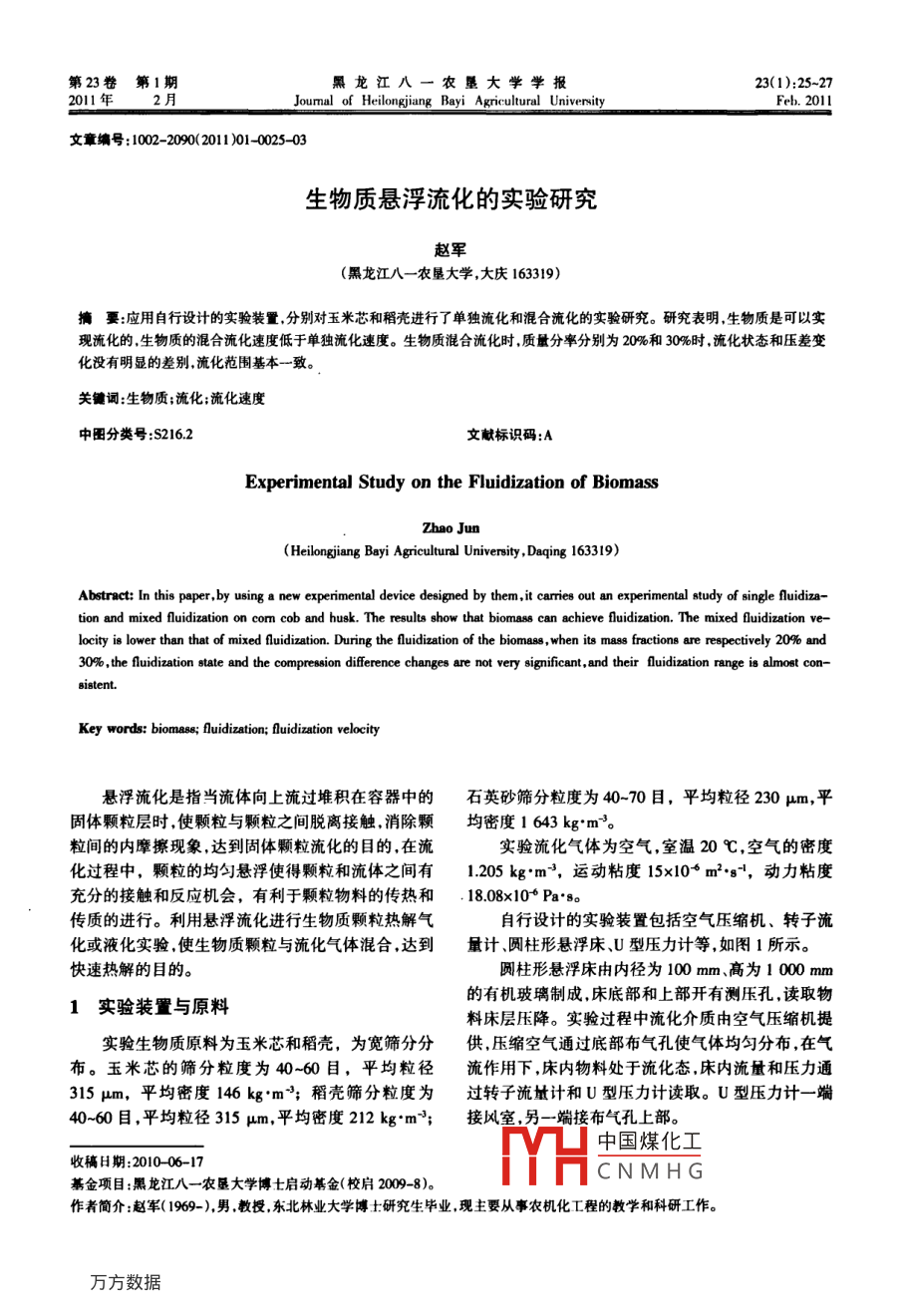 第23卷第1期黑龍江八一農(nóng)墾大學(xué)學(xué)報23(1):25-272011年Joumal of Heilongjiang Bayi Agricultural UniversityFeb. 201文章編號:1002-2090(2011)01-002503生物質(zhì)懸浮流化的實驗研究趙軍黑龍江八一農(nóng)墾大學(xué),大慶163319)摘要:應(yīng)用自行設(shè)計的實驗裝置分別對玉米芯和稻殼進行了單獨流化和混合流化的實驗研究。研究表明,生物質(zhì)是可以實現(xiàn)流化的,生物質(zhì)的混合流化速度低于單獨流化速度。生物質(zhì)混合流化時質(zhì)量分率分別為20%和30%時流化狀態(tài)和壓差變化沒有明顯的差別,流化范圍基本一致。關(guān)鍵詞:生物質(zhì);流化;流化速度中圖分類號:S2162文獻標(biāo)識碼:AExperimental Study on the Fluidization of BiomassZhao JunHeilongjiang Bayi Agricultural University, Daqing 163319)Abstract: In this paper, by using a new experimental device designed by them, it carries out an experimental study of single fluidize-tion and mixed fluidization on com cob and husk. The results show that biomass can achieve fluidization The mixed fluidization velocity is lower than that of mixed fluidization. During the fluidization of the biomass, whenfractions are respectively 20% and0%, the fluidization state and the compression difference changes are not very significant, and their fluidization range is almost condistentKey words: biomass; fluidization; fluidization velocity懸浮流化是指當(dāng)流體向上流過堆積在容器中的石英砂篩分粒度為40-70目,平均粒徑230μm,平固體顆粒層時,使顆粒與顆粒之間脫離接觸消除顆均密度1643kg·m3。粒間的內(nèi)摩擦現(xiàn)象,達到固體顆粒流化的目的,在流實驗流化氣體為空氣,室溫20℃,空氣的密度化過程中,顆粒的均勻懸浮使得顆粒和流體之間有1.205kg·m3,運動粘度15×10。m2·s-,動力粘度充分的接觸和反應(yīng)機會,有利于顆粒物料的傳熱和18.08×1046Pa·s傳質(zhì)的進行。利用懸浮流化進行生物質(zhì)顆粒熱解氣自行設(shè)計的實驗裝置包括空氣壓縮機、轉(zhuǎn)子流化或液化實驗使生物質(zhì)顆粒與流化氣體混合,達到量計圓柱形懸浮床、U型壓力計等,如圖1所示??焖贌峤獾哪康摹A柱形懸浮床由內(nèi)徑為100mm、高為1000mm1實驗裝置與原料的有機玻璃制成,床底部和上部開有測壓孔,讀取物料床層壓降。實驗過程中流化介質(zhì)由空氣壓縮機提實驗生物質(zhì)原料為玉米芯和稻殼,為寬篩分分供,壓縮空氣通過底部布氣孔使氣體均勻分布,在氣布。玉米芯的篩分粒度為40-60目,平均粒徑流作用下,床內(nèi)物料處于流化態(tài),床內(nèi)流量和壓力通315μm,平均密度146kg·m3;稻殼篩分粒度為過轉(zhuǎn)子流量計和U型壓力計讀取。U型壓力計一端40~60目,平均粒徑315μm,平均密度212kgm3;接風(fēng)室,另一端接布氣孔上部1中國煤化工收稿日期:201006-17CNMHG基金項目:黑龍江八一農(nóng)墾大學(xué)博士啟動基金(校啟2009-8)。作者簡介:趙軍(1969-),男教授東北林業(yè)大學(xué)博士研究生畢業(yè),現(xiàn)主要從事農(nóng)機化工程的教學(xué)和科研工作黑龍江八一農(nóng)墾大學(xué)學(xué)報第23卷圖1實驗裝置示意圖圖3不同流化風(fēng)速下玉米芯壓差隨床高度的變化(H=14D)Fig. 1 The schematic diagram of experimental deviceFig 3 The pressure with altitude at different fluidization1空氣壓縮機2轉(zhuǎn)子流量計3圓柱形懸浮床4U型壓力計wind speed on Com Cob(H=l4D)2生物質(zhì)單獨流化實驗研究圖4表示玉米芯在相同流化風(fēng)速(v=0425m·s)對玉米芯進行單獨流化實驗。觀察實驗過程得不同料層高度下,壓差隨床高度的變化。由圖看出,壓出:流化風(fēng)速較低時,床中頂部有少量玉米芯被流差隨物料量的增大而增大的,由于流化風(fēng)速一定,物化,其它玉米芯沒有移動。隨著流化風(fēng)速增加,床中料量增加,顆粒被流化時的曳力增加,壓差也增大玉米芯的流化量增加,底部的玉米芯也開始移動,但稻殼的流化過程與玉米芯相似,如圖5、圖6、圖移動速度緩慢。流化風(fēng)速繼續(xù)增加,床層底部玉米芯7所示。由于稻殼的密度比玉米芯大,不同的流化風(fēng)快速移動,床層頂部玉米芯流化量顯著增加。速下流化時的壓差也較大。床高度較大時(H=14D),圖2圖3所示玉米芯在不同流化風(fēng)速下壓差隨流化風(fēng)速不同,各測量點的壓差波動較小床高度的變化曲線,其中玉米芯料層高度分別為1D(D為床直徑)和14D。由圖可見,壓差隨床高度的增加而增大,達到某一高度后,壓差基本保持不變,說明床層下部濃相顆粒的壓差變化較小;床層頂部稀相壓差變化較大顆粒處于流化狀態(tài)。當(dāng)流化風(fēng)速變化時,每一個測壓點的壓差變化不大,沒有一定的規(guī)律性,床層高度較大時(14D),不同的流化風(fēng)速下床層壓差變化較小。因此,流化風(fēng)速對床內(nèi)壓差影響較小。圖4不同料層玉米芯壓差隨床高度的變化Fig 4 The pressure with altitude under different stock on Corm Cob中國煤化工圖2不同流化風(fēng)速下玉米芯壓差隨床高度的變化(H=1D)CNMHG高度的變化(H=1DFig.2 The pressure with altitude at different fluidizationwind speed on Com Cob(H=ID)peed on Rice hull( H=lD)趙軍生物質(zhì)懸浮流化的實驗研究2日6不同流化風(fēng)速下稻殼壓差隨床高度的變化H=14D圖8玉米芯與石英砂混合流化曲線Fig 6 The pressure with altitude at different FluidizationFig 8 Mixed fluidization curves of com cob and sandwind speed on Rice Hull(H=l 4D)合圖7不同料層稻殼壓差隨床高度的變化圖9稻殼與石英矽混合流