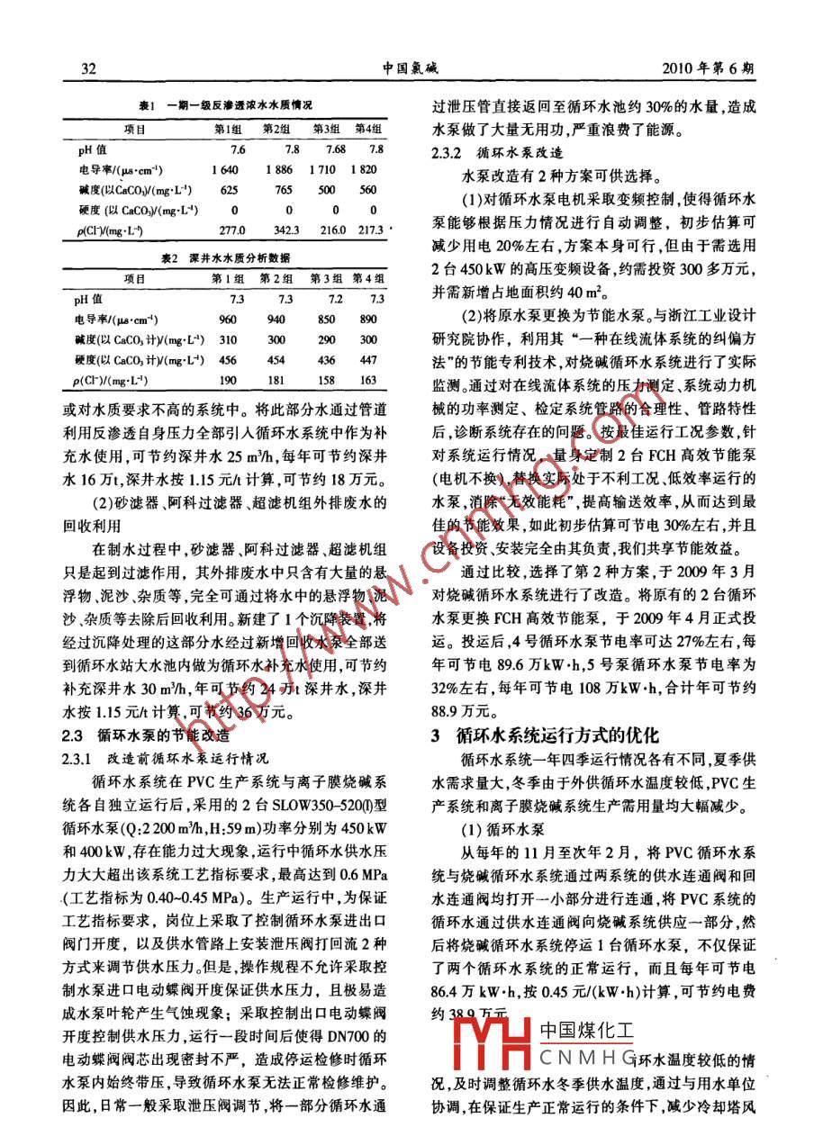 第6期中國氯堿No.602010年6月China Chlor- - AlkaliJu.,2010氯堿生產(chǎn)裝置中循環(huán)水系統(tǒng)的優(yōu)化運行與節(jié)能改造劉影,張二軍(昊華宇航化工有限責任公司,河南焦作454000)摘要;介紹了 氯堿生產(chǎn)裝置中循環(huán)水系統(tǒng)運行方式的優(yōu)化及節(jié)能改造措施。關(guān)鍵詞;氯堿生產(chǎn);循環(huán)水;優(yōu)化;節(jié)能中圖分類號:TQ1 14.26文獻標識碼:B文章編號:1009-1785(2010)06 -0030-03Optimized operation and energy saving innovation ofcirculating water system of Chlor- alkali equipmentLIU Ying, ZHANG Erjun(Haohua Yuhang Chemical Co, Ltd, Jiaozuo 454000, China)Abstract: Optimized operation and energy saving measures of circulating water system of Chlor - alkaliequipment was introduced.Key words: circulating water; optimized; energy saving1概述力指標為0.6MPa左右。改進后,兩系統(tǒng)均保持了正昊華宇航化工有限責任公司于2005年8月投常穩(wěn)定運行,但是整個系統(tǒng)仍存在運行成本高等問產(chǎn)了10萬t/a PVC、10萬t/a離子膜燒堿項目。該項題,針對這些問題,對運行方式進行優(yōu)化、對系統(tǒng)進行目循環(huán)水系統(tǒng)配套設(shè)計了6臺1 000 m?/h的無填料節(jié)能改造,使循環(huán)水系統(tǒng)實現(xiàn)了節(jié)能運行。噴霧冷卻塔,4臺2 200 m2/h的循環(huán)水泵(開3備2系統(tǒng)節(jié)能改造1)、2套加藥裝置及相應(yīng)的旁濾和加氯裝置。PVC生2.1 加藥方式改造產(chǎn)與離子膜生產(chǎn)系統(tǒng)共用1套循環(huán)水系統(tǒng),但運行2.1.1原加藥方式過程中,循環(huán)水供水溫度不能滿足PVC聚合工序工l旁速裝置藝要求,PVC產(chǎn)量受到嚴重影響。該公司于2006年冷卻塔對原循環(huán)水供水系統(tǒng)的供水方式進行了系統(tǒng)改進,燒堿系統(tǒng)換熱設(shè)備將PVC生產(chǎn)用循環(huán)水系統(tǒng)與離子膜燒堿用循環(huán)水塔下水池[吸水池]- +[循環(huán)水泵系統(tǒng)分開,各自獨立運行。循環(huán)水系統(tǒng)供水工藝流程見圖1, PVC生產(chǎn)系統(tǒng)采用3臺2 200 m?/h循環(huán)水兩系統(tǒng)回水連通閥供水連通閥泵(開2備1)供水,4臺1 000 m/h的無填料噴霧冷卻塔進行冷卻降溫;燒堿循環(huán)水系統(tǒng)采用2臺中國煤化工-PVC系統(tǒng)2 200 m循環(huán)水泵供水(新增1臺),2臺1000m/h和1臺800m2/h(新增)的無填料噴霧冷卻塔進行冷卻YHCNMHG降溫。改進后的燒堿循環(huán)水系統(tǒng)供水壓力指標為.l旁濾裝置}0.40~0.45 MPa,PVC生產(chǎn)系統(tǒng)的循環(huán)水系統(tǒng)供水壓團1循環(huán)水系統(tǒng)供水工藝流程圈第6期劉影,等:氯堿生產(chǎn)裝置中循環(huán)水 系統(tǒng)的優(yōu)化運行與節(jié)能改造31循環(huán)水系統(tǒng)原配套設(shè)計了2套加藥裝置,由攪.制,工藝流程如圖2。拌槽和計量泵組成,每套裝置運行功率為0.74 kW。再生水排放|反洗水排放在運行過程中,需首先由操作工將藥劑(水質(zhì)穩(wěn)定劑、降堿劑、殺茵滅藻劑等桶裝藥劑)提至高約1.5m的加深井水.砂濾器原水泵阿科過德 器|藥平臺,倒人加藥裝置的攪拌槽內(nèi),然后根據(jù)需要調(diào)節(jié)循環(huán)水中的加藥量調(diào)節(jié)計量泵,由計量泵連續(xù)輸送至循環(huán)水塔下水池內(nèi)。加藥過程不僅浪費電能,而且-期一級反滲透十軟水器r H超謔水泵一超濾機組勞動強度較大,同時,將每桶25 kg的藥劑人工提至E期一級反滲透阻垢劑反洗水排故平臺再向攪拌槽內(nèi)傾倒也存在一定的危險性。2.1.2改造后的加藥方式濃水排放地溝30m2根據(jù)循環(huán)水系統(tǒng)設(shè)計上的特點,利用循環(huán)水吸水池上的大平臺設(shè)計了2個塑料加藥槽,根據(jù)需加| 中間水箱一 二級反滲透一一- 混床-- +去離子水藥量,在塑料加藥槽的下部開幾個小孔,然后將加藥槽安裝在緊靠循環(huán)水吸水池大平臺處的塔下水池濃水排放地溝25mh團2制水工藝流程圖上,使得加藥槽與吸水池在一個平面上,購進的藥劑也全部存放在循環(huán)水吸水池大平臺上,使加藥位置由圖2可以看出,深井水逐級經(jīng)過砂濾器、疊片緊鄰藥品存放位置。由于加藥面與吸水池平臺在一式過濾器、超濾機組以及軟水器處理,水中的各種懸.個平面,加藥時,操作工只需將桶裝藥劑直接倒入浮物、泥沙、微粒、膠體、細菌、雜質(zhì)、有機物和硬度加藥槽內(nèi),藥劑通過加藥槽底部的小孔連續(xù)滴加均已被過濾去除,再經(jīng)雙級反滲透膜分離,水中絕至循環(huán)水中,不僅保持了連續(xù)滴加的方式,而且大大部分的離子被截留在濃水中,從而制取電導(dǎo)率為大降低了工作強度,減少了計量泵連續(xù)運行對電5 us/cm以下的水。再經(jīng)過混床的進一步 精制得到能的消耗。棄用的加藥裝置移送至污水處理站做電導(dǎo)率為2 μs/cm以下的去離子水。在制水過程中,為投加鹽酸、氫氧化鈉以及次氯酸鈉使用(該崗位二級反滲透濃水因離子濃度較低,直接被系統(tǒng)回收向攪拌槽內(nèi)加藥通過管道注人)。每年可節(jié)約電能利用;一級反滲透的濃水因離子濃度高,不能再回收11 840kW .h,按0.45元/(kW.h)計,可節(jié)約5328元。至制水系統(tǒng)中,直接被排放。2個- -級反滲透平均外2.2.循環(huán)水 系統(tǒng)運行補水改造排濃水55m/h,其他設(shè)備如砂濾器也需要定期進行2.2.1循環(huán)水系統(tǒng)日 常補水情況反洗.再生以保證正常運行,阿科超濾機組、軟化器循環(huán)水系統(tǒng)由于