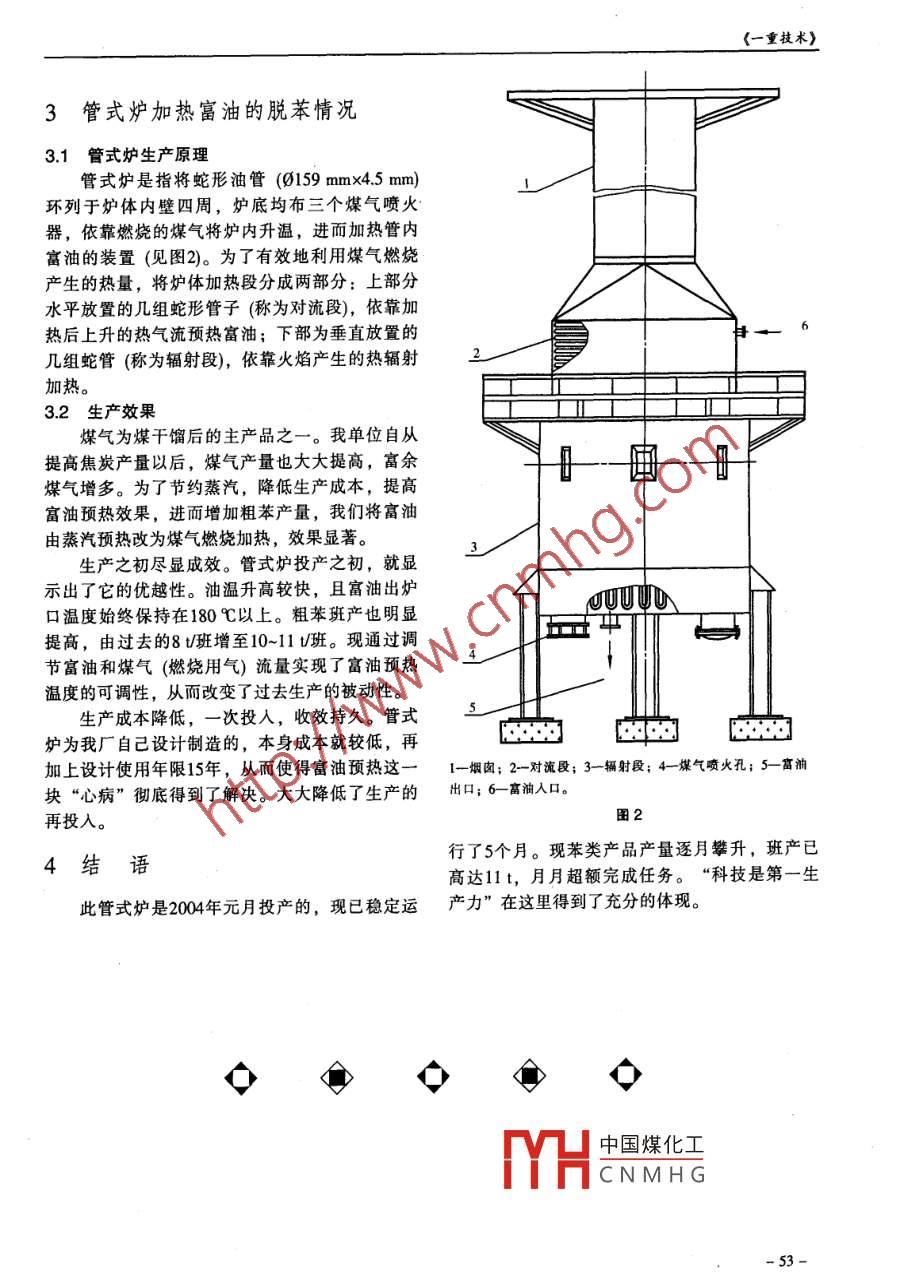2005年第1期(總103期)富油預(yù)熱系統(tǒng)的改造于淑宏,劉大軍1(1.黑化集團焦化廠助理工程師,黑龍江富拉爾基161041)摘要:富油預(yù)熱是后續(xù)脫苯生產(chǎn)工序必不可少的環(huán)節(jié)之一,預(yù)熱溫度的高低將直接影響粗苯的產(chǎn)量關(guān)鍵詞:富油;預(yù)熱器;管式爐中圖分類號:TQ082文獻標識碼:B富油是指富含苯類的洗油,是粗苯生產(chǎn)的原2料。如果要提取富油中的苯,則必須將富油加熱至160-170℃。當富油溫度升到這一區(qū)間后,其中含有的苯類有機物便會氣化成苯氣,從下面的脫苯工序中脫出來。富油預(yù)熱中的溫度控制對脫苯效果影響非常大。我廠的化產(chǎn)回收系統(tǒng)中的粗苯工段,在多年的生產(chǎn)實際中逐漸摸索經(jīng)驗,借鑒相關(guān)的資料將富油由蒸汽預(yù)熱改為煤氣燃燒預(yù)熱,粗苯產(chǎn)量提高很多為,工廠創(chuàng)造了可觀的經(jīng)濟效益。蒸汽預(yù)熱時富油脫苯情況蒸汽預(yù)熱是指富油通過預(yù)熱器(固定管板式換熱器,見圖1)熱交換后將富油加熱至160-170℃,從而將苯氣化而后脫苯的過程。氣源采用的一富油入口;2一蒸汽出口;3一富油出口;4一蒸汽人口。是我公司熱電廠自產(chǎn)的P≤09MPa低壓蒸汽。在煤氣量不變的情況下,采用此法班產(chǎn)粗苯7-8t(2)富油含水量大富油蒸汽預(yù)熱過程中,常出現(xiàn)換熱器列管竄2存在的問題漏。這對于富油的質(zhì)量影響很大。因為當泄漏點在管束與管板脹接處時,蒸汽因壓力大于油壓而(1)自產(chǎn)蒸汽壓力難以保證常常竄入油中,使富油含水量增加,進而影響脫因我單位使用蒸汽部門較多,且冬季設(shè)有保苯的效果。溫、保熱等,需蒸汽量較大,再加上新建的28萬(3)生產(chǎn)成本高U年尿素項目的大量用汽,使蒸汽消耗特別大蒸汽作為化工廠生產(chǎn)的中間產(chǎn)品,其自身成出現(xiàn)了低壓汽壓力不穩(wěn)的現(xiàn)狀。蒸汽壓力的波本達45-53元,而每生產(chǎn)1t苯,蒸汽用量將占成動,直接影響了富油預(yù)熱溫度的控制,從而很難保證生產(chǎn)所需的(0170℃這一溫度指標,(時常1%-15%左右。同時富油蒸氣預(yù)熱時對列管換熱在150℃以下)造成富油中的苯收率降低。中國煤化工就得更換一次設(shè)備CNMHG收稿日期:2004-10-15;修回日期:2004-11-25《一重技術(shù)》3管式爐加熱富油的脫苯情況3.1管式爐生產(chǎn)原理管式爐是指將蛇形油管(159mm×4.5mm)環(huán)列于爐體內(nèi)壁四周,爐底均布三個煤氣噴火器,依靠燃燒的煤氣將爐內(nèi)升溫,進而加熱管內(nèi)富油的裝置(見圖2)。為了有效地利用煤氣燃燒產(chǎn)生的熱量,將爐體加熱段分成兩部分:上部分水平放置的幾組蛇形管子(稱為對流段),依靠加熱后上升的熱氣流預(yù)熱富油;下部為垂直放置的幾組蛇管(稱為輻射段),依靠火焰產(chǎn)生的熱輻射加熱32生產(chǎn)效果煤氣為煤干餾后的主產(chǎn)品之一。我單位自從提高焦炭產(chǎn)量以后,煤氣產(chǎn)量也大大提高,富余煤氣增多。為了節(jié)約蒸汽,降低生產(chǎn)成本,提高富油預(yù)熱效果,進而增加粗苯產(chǎn)量,我們將富油由蒸汽預(yù)熱改為煤氣燃燒加熱,效果顯著。生產(chǎn)之初盡顯成效。管式爐投產(chǎn)之初,就顯示出了它的優(yōu)越性。油溫升高較快,且富油出爐口溫度始終保持在180℃以上。粗苯班產(chǎn)也明顯提高,由過去的8t班增至10-11班?,F(xiàn)通過調(diào)節(jié)富油和煤氣(燃燒用氣)流量實現(xiàn)了富油預(yù)熱溫度的可調(diào)性,從而改變了過去生產(chǎn)的被動性。生產(chǎn)成本降低,一次投入,收效持久。管式爐為我廠自己設(shè)計制造的,本身成本就較低,再加上設(shè)計使用年限15年,從而使得富油預(yù)熱這一1-煙囪;2一對流段;3輻射段;4媒氣噴火孔;5畜油塊“心病”徹底得到了解決。大大降低了生產(chǎn)的出口;6-富油人口再投入。圖24結(jié)語行了5個月?,F(xiàn)苯類產(chǎn)品產(chǎn)量逐月攀升,班產(chǎn)已高達11t,月月超額完成任務(wù)?!翱萍际堑谝簧斯苁綘t是2004年元月投產(chǎn)的,現(xiàn)已穩(wěn)定運產(chǎn)力”在這里得到了充分的體現(xiàn)。中國煤化工CNMHG