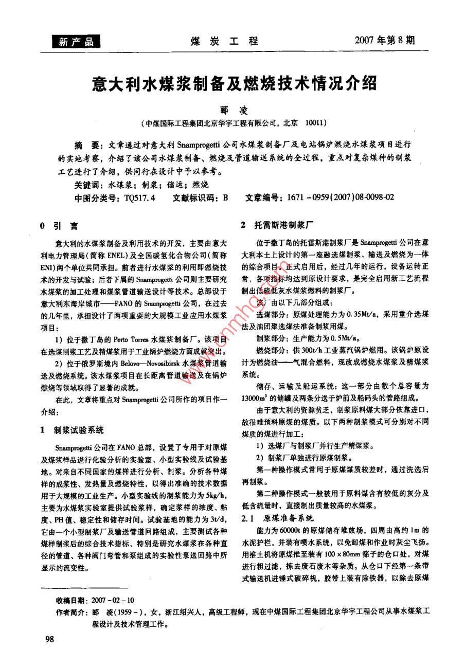 意大利水煤漿制備及燃燒技術(shù)情況介紹