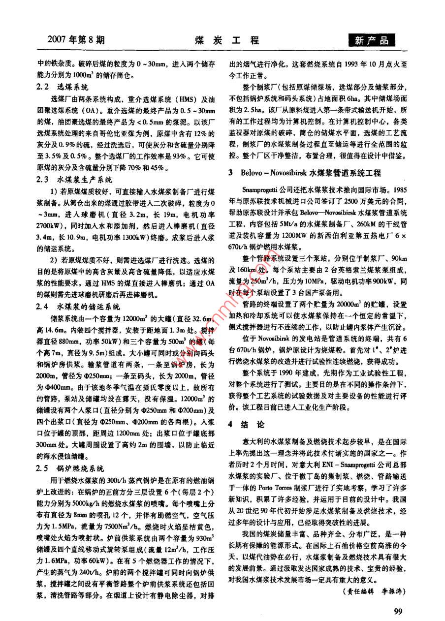 新產(chǎn)品煤炭工程2007年第8期意大利水煤漿制備及燃燒技術(shù)情況介紹郾凌(中煤國(guó)際工程集團(tuán)北京華宇工程有限公司,北京10011)摘要:文章通過對(duì)意大利 Snamprogetti公司水煤漿制備廠及電站鍋爐燃燒水煤漿項(xiàng)目進(jìn)行的實(shí)地考察,介紹了該公司永煤漿制備、燃燒及管道輸送系統(tǒng)的全過程,重點(diǎn)對(duì)復(fù)雜煤種的制漿工藝進(jìn)行了介紹,供同行在設(shè)計(jì)中予以參考。關(guān)鍵詞:水煤漿;制漿;儲(chǔ)運(yùn);燃燒中圖分類號(hào):TQ5174文獻(xiàn)標(biāo)識(shí)碼:B文章編號(hào):1671-0959(2007080098020引言2托雷斯港制漿廠意大利的水煤漿制備及利用技術(shù)的開發(fā),主要由意大位于撤丁島的托雷斯港制漿廠是 Snamprogetti公司在意利電力管理局(簡(jiǎn)稱ENEL)及全國(guó)碳?xì)浠衔锕?簡(jiǎn)稱大利本土上設(shè)計(jì)的第一座融選煤制漿、輸送及燃燒為一體EN)兩個(gè)單位共同承擔(dān)。前者進(jìn)行水煤漿的利用即燃燒技的綜合項(xiàng)目。正式啟用后,經(jīng)過幾年的運(yùn)行,設(shè)備運(yùn)轉(zhuǎn)正術(shù)的開發(fā)與試驗(yàn);后者下屬的 Snamproge公司則主要研究常,各項(xiàng)指標(biāo)均達(dá)到原設(shè)計(jì)要求,是完全啟用新工藝流程水煤漿的加工處理和煤漿管道輸送設(shè)計(jì)等技術(shù)??偛吭O(shè)于制出低硫低灰水煤漿燃料的制漿廠意大利東海岸城市—FANO的 Snamprogetti公司,在過去該廠由以下幾部分組成的幾年里,承擔(dān)設(shè)計(jì)了兩項(xiàng)重要的大規(guī)模工業(yè)應(yīng)用水煤漿選煤部分:原煤處理能力為035M/a,采用重介選煤項(xiàng)目:法及油團(tuán)聚選煤法準(zhǔn)備制漿用煤。1)位于撒丁島的 Porto Tom水煤漿制備廠。該項(xiàng)目制漿部分:生產(chǎn)能力為05M/a。在選煤制漿工藝及精煤漿用于工業(yè)鍋爐燃燒方面成就突出。燃燒部分:供300/h工業(yè)蒸汽鍋爐燃用。該鍋爐原設(shè)2)位于俄羅斯境內(nèi) BelovoNovosibinsk水煤漿管道輸計(jì)為燃燒油—?dú)饣旌先剂?現(xiàn)改成燃燒水煤漿及精煤漿送及燃燒系統(tǒng)。該水煤漿項(xiàng)目在長(zhǎng)距離管道輸送及在鍋爐系統(tǒng)燃燒等領(lǐng)域取得了顯著的成就儲(chǔ)存、運(yùn)輸及船運(yùn)系統(tǒng):這一部分由數(shù)個(gè)總?cè)萘繛樵诖?文章將重點(diǎn)對(duì) Snamproget公司所作的項(xiàng)目作一1300的儲(chǔ)罐及兩條分送于爐前及船碼頭的管路組成介紹:由于意大利的資源貧乏,制漿原料煤大部分依靠進(jìn)口故很難預(yù)料原煤的煤質(zhì)。以下兩種制漿模式可分別對(duì)不同1制漿試驗(yàn)系統(tǒng)煤質(zhì)的煤進(jìn)行加工Snamprogett公司在FANO總部,設(shè)置了專用于對(duì)原煤1)選煤廠與制漿廠并行生產(chǎn)精煤漿。及煤漿樣品進(jìn)行化驗(yàn)分析的實(shí)驗(yàn)室、小型實(shí)驗(yàn)線及試驗(yàn)基2)制漿廠單獨(dú)進(jìn)行原煤制漿。地。對(duì)來自不同國(guó)家的煤樣進(jìn)行分析、制漿。分析各種煤第一種操作模式常用于原媒煤質(zhì)較差時(shí),通過洗選后樣的成漿性、發(fā)熱量及燃燒特性,以得出準(zhǔn)確的技術(shù)數(shù)據(jù)再制漿。用于大規(guī)模的工業(yè)生產(chǎn)。小型實(shí)驗(yàn)線的制漿能力為5kg/h,第二種操作模式一般被用于原料煤含有較低的灰分及主要為水煤漿實(shí)驗(yàn)室提供試驗(yàn)漿樣,確定漿樣的濃度、粘低含硫量時(shí),直接制出質(zhì)量較高的水煤漿。度、陽(yáng)H值、穩(wěn)定性和儲(chǔ)存時(shí)間。試驗(yàn)基地的能力為3d,2.1原煤準(zhǔn)備系統(tǒng)它由一個(gè)小型制漿廠及輸送管道回路組成,主要測(cè)試各種能力為60000的原煤儲(chǔ)存堆放場(chǎng),四周由高約1m的煤樣制漿后的綜合技術(shù)指標(biāo),特別是研究水煤漿在各種直水泥護(hù)欄,并裝有噴水系統(tǒng),以免卸煤和作業(yè)時(shí)灰塵飛揚(yáng)。徑的管道、各種閥門彎管和泵組成的實(shí)驗(yàn)性泵送回略中所用推土機(jī)將原煤推至裝有100×80mm篩子的倉(cāng)口處,對(duì)煤顯示的流變性。進(jìn)行粗過濾,揀去廢石廢木等雜質(zhì)。從倉(cāng)口下經(jīng)第一條帶式輸送機(jī)進(jìn)錘式破碎機(jī),膠帶上裝有除鐵器,以除去原煤收稿日期:2007-02-10作者簡(jiǎn)介:酈凌(1959-),女,浙江紹興人,高級(jí)工程師,現(xiàn)在中煤國(guó)際工程集團(tuán)北京華字工程公司從事水煤漿工程設(shè)計(jì)及技術(shù)管理工作。982007年第8期煤炭工程中的鐵雜質(zhì)。破碎后煤的粒度為0-30mm,進(jìn)入兩個(gè)儲(chǔ)存出的煙氣進(jìn)行凈化。這套燃燒系統(tǒng)自193年10月點(diǎn)火至能力分別為1000m3的儲(chǔ)存筒倉(cāng)今工作正常。2.2選煤系統(tǒng)整個(gè)制漿廠(包括原煤儲(chǔ)煤場(chǎng),選煤部分及儲(chǔ)漿部分,選煤廠由兩條系統(tǒng)構(gòu)成,重介選煤系統(tǒng)(HMs)及油不包括鍋爐系統(tǒng)和碼頭系統(tǒng))占地面積ha。其中儲(chǔ)煤場(chǎng)面團(tuán)棗選煤系統(tǒng)(OA)。重介選煤的最終產(chǎn)品為0.5~30mm積為25ha該廠從原料媒進(jìn)入第一條帶式輸送機(jī)開始,所的煤,油團(tuán)秦選煤的最終產(chǎn)品為<05mm的煤泥。以該廠有的工作過程均為計(jì)算機(jī)控制。在計(jì)算機(jī)控制中心,各類選煤系統(tǒng)處理的來自哥倫比亞煤為例,原煤中含有12%的監(jiān)視器對(du