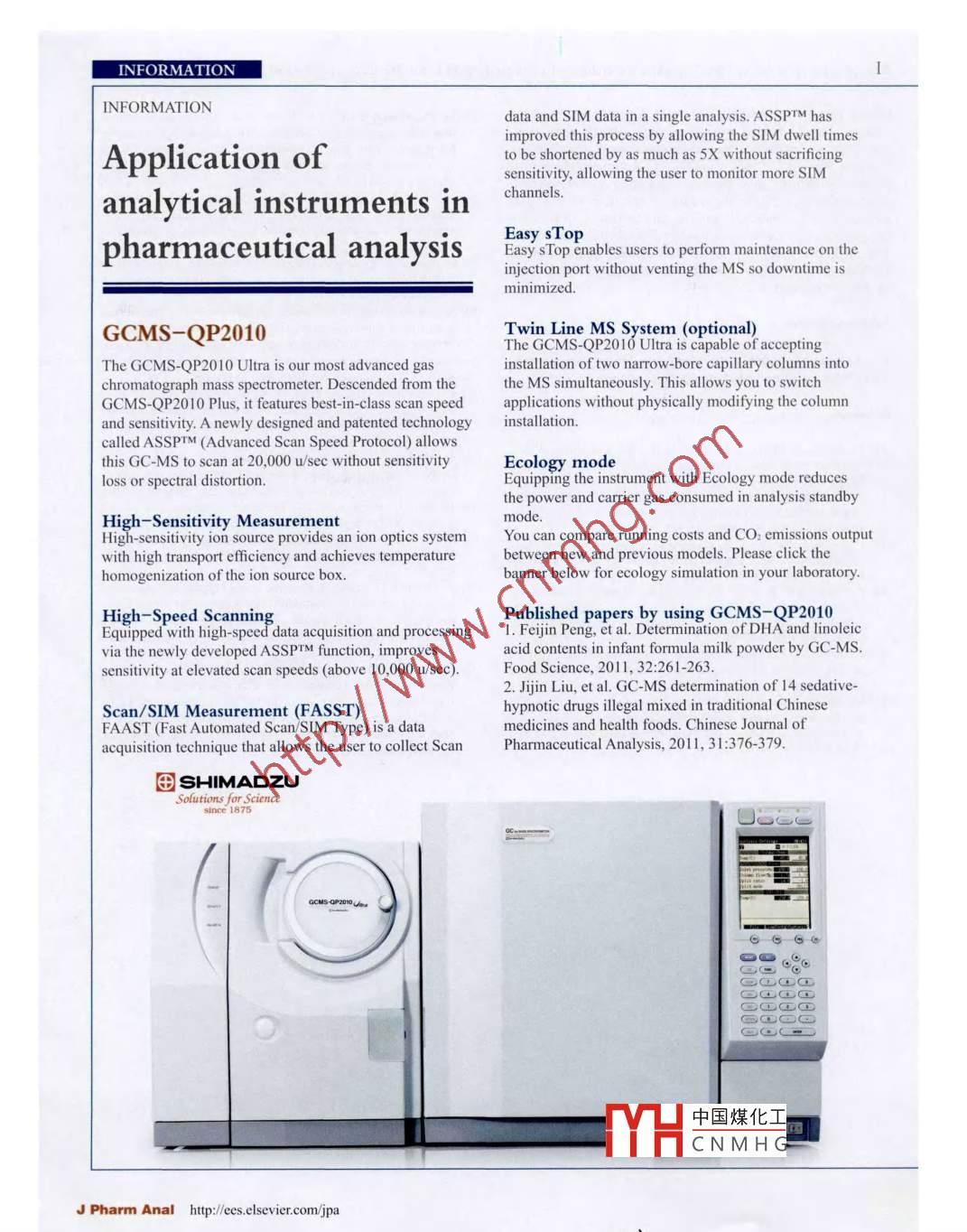 INFORMATIONIILCMS-IT-TOFHigh resolution & High precision in MS"measurementThe LCMS-IT-TOF is a new type of mass spectrometerThe stable high-resolution spectra achieved throughout athat combines QIT (ion trap) and TOF (time-of-fight)wide mass range and high precision MS data are derivedtechnologies. When combining QIT and TOF, the greatest from the DSR: Dual-Stage Reflectron and the use of BIE:technological challenges were the efficient introductionBallistic lon Extraction.of ions into the QIT and the simultaneous ection ofThese instrument advances can strongly assist in the usetrapped ions to the TOF. Here, we introduce the newlyof MS for predicating accurate structural details.developed technologies used to solve these problems. Thesouree design, desolvation capillary and reduced cllision High Throughpution focusing Q-Array were adapted from Shimadzu'sIncreased amounts of information are obtained forsuccessful single-quad HPLC mass spectrometer. Theeach measurement enabling much higher reliability inOctapole Lens can introduce eluted ions from the LC tostructural analysis. High-throughput analysis can bethe ion trap by CII (Compressed lon Injection) methodrealized with the world's best performance hybrid MSefficiently. The ion trap QIT gives an efficient MS"used for structural analysis in terms of high-speed masscapability with our new cleaning technology. In addition,spectrum measurement and high-speed ion polarityBIE (Ballistic lon Extraction) technology, providesswitching.high resolution/accuracy for all MS, MS ... modes.The temperature control of the fight tube gives a massHigh Sensitivitystability with stabilizing the length of the ion flight andHigh-Sensitivity detection of low concentration samplesion acceleration voltage which affects the mass stability.is derived through the use of Compressed lon InjectionDual-Stage Reflectron gives an excellent resolution with(CI) within the ion optics, allowing for the ions to beoptimizing energy absorption and time convergence.placed eficiently into the ion trap.田SHIMADZUSolutions for Sciencesince 1875LCMS-IT-TOF”Published papers by using LCMS-IT-TOF1. Qundi Liu, et al. High-speed counter-current chromatography preparation and separation of naringin, meranzin hydrateand isomeranzin from Exocarpium Citri Grandis. Chinese Journal of Pharmaceutical Analysis, 2011, 31:831-834.2. Hong Chang, et al. Isolation and identification of anthocyanins in the fruits of Prunus Humilis Bunge. Food Science,2011, 32:59-63.3. Naoko Yoshinaga, et al. Fatty acid amides, previously identified in caterpil中國煤化Igryllustaiwanemma and fruit fly drosophila melanogaster larvae. Jourmal of ChemicaYHCNMH GJ Pharm Anal hpt/e elsevier con/jpaJ Pharm Anal Vol 2, No 6, December 2012IVNEXERA UHPLC Systemoptions enable a wide variety of system configurations,including 2D, method development, and applicatedNexera is an all-round LC system like no other and issystems.truly worthy of being called a next-generation UHPLCsystem. It uses revolutionary technology to offer high-Reliability & dependabilityperformance ultra-high speed LC analysis and theEngineered using the core competencies of Shimadzu'sflexibility to allow configuring systems for a wide rangeexperience, Nexera provides superior data quality,of applications, such as systems for general-purposerobustness, and long-term performance.analysis or green LC systems that reduce the usage oforganic solvents.Published papers by using NEXERA UHPLCSystemThe Only no compromise UHPLC system1. Szabolcs Fekete, et al. The impact of extra-columnHigh speedband broadening on the chromatographic eficiency ofHigh-speed injection, extra-low gradient delay volume5cm long narrow-bore very efficient columns. Journalcombined with the lowest carryover without rinsingof Chromatography A, 2011, 1218:5286-5291.enable ultra-high-speed cycle time.2. Tamara P. Kondratyuk, et al. Resveratrol derivativesas promising chemopreventive agents with improvedHigh resolutionpotency and selectivity. Molecular Nutrition & FoodWidest pressure/flow range (130 MPa up to 3 mL/min)Research, 2011, 55(8):1249- 1265.allows for the use of long small-particle columns to3. Michelle L. Colgrave, et al. What is in a beer?maximize peak capacity.Proteomic characterization and relative quantfication ofhordein (gluten) in beer. Journal of Proteome Research,Flexibility & expandability2012, 11(1): 386-396.Modular design, pre-treatment autosampler, and valve田SHIMADZUSolutions for ScienceE:中國煤化工YHCNMH GJ Pharm Anal htp:/ees.elsevier.com/ipao