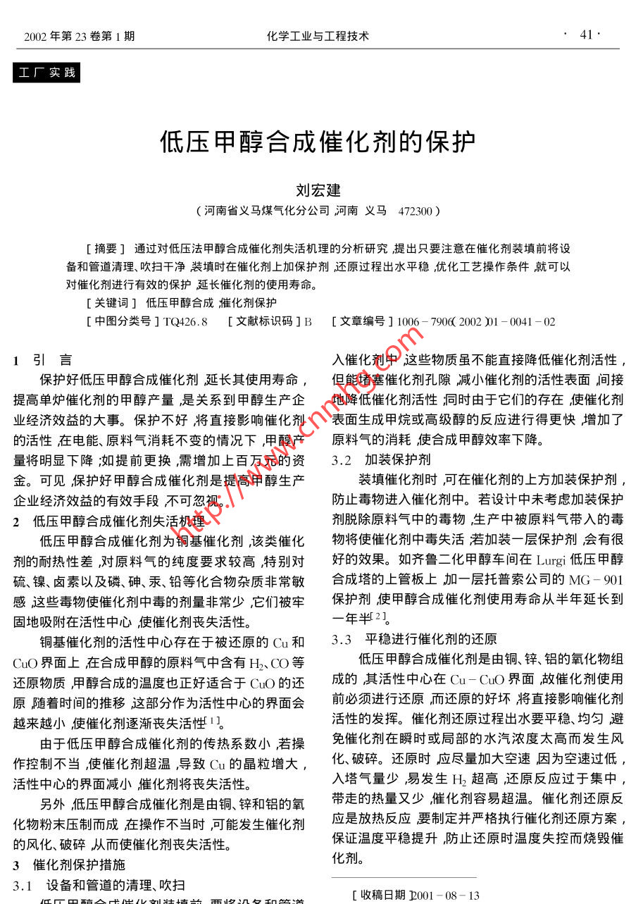 化學(xué)工業(yè)與工程技術(shù)2002年第23卷第1期3.4優(yōu)化工藝操作條件均,有時出現(xiàn)局部溫度突然上升,使Cu的晶粒增3.4.1提高原料氣的凈化度 減少其中的毒物大催化劑活性下降。有時為了盡快恢復(fù)到開車狀對于低壓甲醇合成催化劑而言,硫化物、鹵化態(tài)停車中進行保壓處理使催化劑處于靜態(tài)化學(xué)反物、鎳、磷、砷、汞、鉛的化合物都是活潑的毒素。根應(yīng)之中局部會出現(xiàn)過熱現(xiàn)象。停車卸壓太快使催據(jù)原料氣和用后催化劑的分析數(shù)據(jù)能被原料氣帶化劑受到的壓力過大造成催化劑粉碎、下沉導(dǎo)致入的毒物主要是硫化物。根據(jù)經(jīng)驗判斷,如果銅基氣體偏流影響催化劑的使用壽命。催化劑吸附硫化物達(dá)到重量的2%催化劑活性將3.4.5 開車時要用 N2氣升溫喪失所以要嚴(yán)格控制原料氣中硫化物的含量使總?cè)缬迷蠚馍郎?,開始時由于合成塔溫度低不硫不超過0.1x 10-6。通常采用氧化鋅精脫硫工能合成甲醇,但隨著合成塔溫度升高到催化劑的活藝脫除原料氣中的微量的硫化物。性溫度時,由于原料氣的有效成分高會使合成反應(yīng)3.4.2控制原料氣中適量CO2 含量劇烈進行放出大量的反應(yīng)熱使催化劑溫度突然上因CO2生成甲醇較CO生成甲醇的熱效應(yīng)小,升導(dǎo)致Cu晶粒增大催化劑活性下降。開車時要.且在合成甲醇過程中變換反應(yīng)處于平衡狀態(tài)溫度用N2氣升溫若無N2氣,也可用CH4等惰性氣體升高將促進吸熱的逆變換反應(yīng)溫度降低將有利于升溫待合成塔升到催化劑的活性溫度后再緩慢切放熱的變換反應(yīng)。故CO2的存在,可使反應(yīng)溫度易換成原料氣。于控制,避免超溫使催化劑失活。同時CO2的存3.4.6其它方面在,在一定程度上可防止催化劑中CuO完全被還停車時充N2或CH4等惰性氣體保護,防止因原,而使催化劑衰老失活。一般認(rèn)為 原料氣中CO2空氣進入導(dǎo)致催化劑重新氧化失去活性。在生產(chǎn)含量控制在1% ~ 3%較適合。時應(yīng)盡量保持負(fù)荷平穩(wěn),避免負(fù)荷或原料氣中CO3.4.3選擇低溫活性高的催化劑 盡量在低溫下操的成分大范圍波動若負(fù)荷或原料氣中CO波動太作大,由于催化劑的導(dǎo)熱性差將使熱點溫度突然增目前國產(chǎn)新型低壓甲醇合成催化劑NC306型高,促使Cu的晶粒增大使催化劑的活性下降。和XNC- 98型低溫活性高,能在190 ~ 200C下長4結(jié)論時間具有很高的活性。所以,針對其活性溫度低的硫中毒和Cu的晶粒增大,是造成低壓甲醇合特點在能滿足產(chǎn)量要求的情況下應(yīng)盡量采用較低成催化劑失活的主要原因?qū)υO(shè)備和管道清理、吹掃的操作溫度即催化劑使用初期和中期都在較低的干凈加裝保護劑優(yōu)化工藝操條件,可有效地改善溫度下操作盡量延長催化劑在低溫高活性區(qū)的使催化劑的使用條件對催化劑進行有效的保護延長用時間。當(dāng)?shù)蜏夭僮鞑荒軡M足生產(chǎn)要求時方可提催化劑的使用壽命。高反應(yīng)溫度,但每次只能提高1~2C。這樣操作可[參考文獻(xiàn)]使催化劑在各個溫度段的活性充分發(fā)揮出來,延長[1]馮元琦.聯(lián)醇生產(chǎn)[M]北京:化學(xué)工業(yè)出版社,1994.93- 101.3.4.4盡量 減少開停車次數(shù)[2]楊玉蘭劉振洪左繼功等.甲醇合成催化劑使用經(jīng)驗開車時氣量較小,阻力影響較大,氣流分布不總結(jié)J]天然氣化工2000(2)37.簡訊粉煤氣化裝置在陜西城化投運本刊訊國家火炬計劃項目一灰熔聚流化床粉煤 氣化制取合成氨原料氣工業(yè)化示范裝置近日在陜西城化股份有限公司順利投料生產(chǎn)出合格的半水煤氣產(chǎn)品。據(jù)了解,該粉煤氣化工藝是以煙煤為原料以氧氣為氣化劑應(yīng)用流化床技術(shù)在常壓、高溫條件下生產(chǎn)合成氨所需合成氣的一種新技術(shù),該技術(shù)具有煤種適應(yīng)性廣、氣化強度大設(shè)備易制造和工藝流程簡單、環(huán)境污染小等優(yōu)點。該裝置與德士古、謝爾、魯奇等煤氣化技術(shù)相比投資較少。該工業(yè)化示范裝置的投運成功標(biāo)志著我國在先進煤氣化技術(shù)開發(fā)方面實現(xiàn)了零的突破,為我國化工行業(yè)節(jié)能降耗、降低成本、環(huán)境保護開辟了新的途徑。