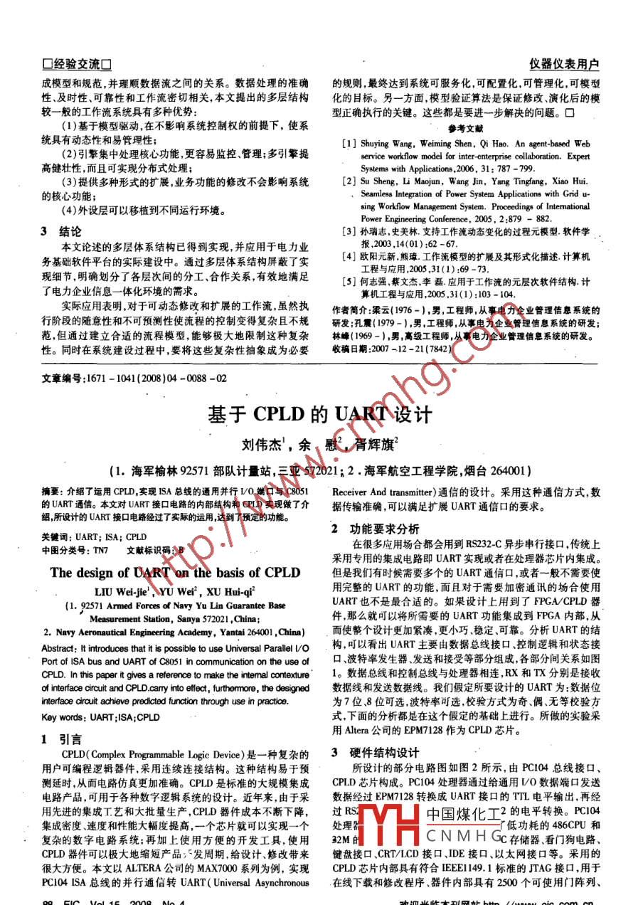 口經(jīng)驗交流口儀器儀表用戶成模型和規(guī)范,并理順數(shù)據(jù)流之間的關(guān)系。數(shù)據(jù)處理的準(zhǔn)確的規(guī)則,最終達(dá)到系統(tǒng)可服務(wù)化,可配置化,可管理化,可模型性、及時性、可靠性和工作流密切相關(guān),本文提出的多層結(jié)構(gòu)化的目標(biāo)。另一方面,模型驗證算法是保證修改、演化后的模較一般的工作流系統(tǒng)具有多種優(yōu)勢:型正確執(zhí)行的關(guān)鍵。這些都是要進(jìn)-步解決的問題。0(1)基于模型驅(qū)動,在不影響系統(tǒng)控制權(quán)的前提下,使系參考文獻(xiàn)統(tǒng)具有動態(tài)性和易管理性;[1] Shuying Wang, Weiming Shen, Qi Hao. An agent-based Web(2)引擊集中處理核心功能,更容易監(jiān)控管理;多引擎提serice workflow model for inter enterpise cllaboration. Expert高健壯性,而且可實現(xiàn)分布式處理;Systems with Applications ,2006, 31: 787 -799.(3)提供多種形式的擴(kuò)展,業(yè)務(wù)功能的修改不會影響系統(tǒng)[2] Su Sheng, Li Maojun, Wang Jin, Yang Tingfang, Xiao Hui.的核心功能;Seamless Integration of Power System Applications with Grid u(4)外設(shè)層可以移植到不同運行環(huán)境。sing Worldflow Management System. Proceedings of IntemationalPower Engineering Conference, 2005, 2:879 - 882.3結(jié)論[3]孫瑞志,史美林.支持工作流動態(tài)變化的過程元模型.軟件學(xué)本文論述的多層體系結(jié)構(gòu)已得到實現(xiàn),并應(yīng)用于電力業(yè)報,2003,14(01):62 -67.務(wù)基礎(chǔ)軟件平臺的實際建設(shè)中。通過多層體系結(jié)構(gòu)屏蔽了實[4]歐陽元新,熊璋.工作流模型的擴(kuò)展及其形式化描述計算機(jī)工程與應(yīng)用2005 ,31(1):69 -73.現(xiàn)細(xì)節(jié),明確劃分了各層次間的分工、合作關(guān)系,有效地滿足[5]何志強.蔡文杰,李磊.應(yīng)用于工作流的元層次軟件結(jié)構(gòu).計了電力企業(yè)信息- -體 化環(huán)境的需求。算機(jī)工程與應(yīng)用,2005 ,31(1):103 - 104.實際應(yīng)用表明,對于可動態(tài)修改和擴(kuò)展的工作流,雖然執(zhí)作者簡介:梁云(1976- ),男,工程師,從事電力企業(yè)管理信息系統(tǒng)的行階段的隨意性和不可預(yù)測性使流程的控制變得復(fù)雜且不規(guī)研發(fā);孔震{1979-),男,工程師,從事電力企業(yè)管理儕息系統(tǒng)的研發(fā);范,但通過建立合適的流程模型,能夠極大地限制這種復(fù)雜林峰(1969-),男,高級工程師,從事電力企業(yè)管理信息系統(tǒng)的研發(fā)。性。同時在系統(tǒng)建設(shè)過程中,要將這些復(fù)雜性抽象成為必要收稿日期:2007 -12 -21(7842)文章編號:1671 - 1041 (2008)04 -0088 -02基于CPLD的UART設(shè)計劉偉杰',余慰’, 胥輝旗.(1.海軍榆林92571部隊計量站,三亞572021; 2.海軍航空工程學(xué)院,煙臺264001)摘要:介紹了運用CPLD,實現(xiàn)ISA總線的通用并行v0端口與C8051Receiver And transmiter) 通信的設(shè)計。采用這種通信方式,數(shù)的UART通信。本文對UART接口電路的內(nèi)部結(jié)構(gòu)和CPLD實現(xiàn)做了介據(jù)傳輸準(zhǔn)確,可以滿足擴(kuò)展UART通信口的要求。紹,所設(shè)計的UART接口電路經(jīng)過了實際的運用,達(dá)到了預(yù)定的功能。2功能要求分析關(guān)鍵詞: UART; ISA; CPLD在很多應(yīng)用場合都會用到RS232-C異步串行接口,傳統(tǒng)上中圖分類號: TN7文獻(xiàn)標(biāo)識碼: B采用專用的集成電路即UART實現(xiàn)或者在處理器芯片內(nèi)集成。The design of UART on the basis of CPLD但是我們有時候需要多個的UART通信口,或者一般不需要使LIU Wei-je' , YU Wei? , XU Hui-qi2用完整的UART的功能,而且對于需要加密通訊的場合使用(1.92571 Armed Forces of Navy Yu Lin Guarantee BaseUART也不是最合適的。如果設(shè)計上用到了FPGAVCPLD器Measurement Station, Sanya 572021 ,China;件,那么就可以將所需要的UART功能集成到FPGA內(nèi)部,從2. Navy Aeronautical Engineering Academy, Yantail 264001 ,China)而使鰵個設(shè)計更加緊湊,更小巧、穩(wěn)定、可靠。分析UART的結(jié)Abstract: It introduces that it is possible to use Universal Parallel 10構(gòu),可以看出UART主要由數(shù)據(jù)總線接口、控制邏輯和狀態(tài)接Port of ISA bus and UART of C8051 in communication on the uso of口、波特率發(fā)生器、發(fā)送和接受等部分組成,各部分間關(guān)系如圖CPLD. In this paper it gives a reference to make the intemal contexture'1。數(shù)據(jù)總線和控制總線與處理器相連,RX和TX分別是接收of itertace crcuit and CPLD cary into efect, furthemore, the designed數(shù)據(jù)線和發(fā)送數(shù)據(jù)線。我們假定所要設(shè)計的UART為:數(shù)據(jù)位intertace circuit achieve predicted function through use in practice.為7位.8位可選,波特率可選,校驗方式為奇、偶、無等校驗方Key words: UART;SA;CPLD式,下面的分析都是在這個假定的基礎(chǔ)上進(jìn)行。所做的實驗采用Altera公司的EPM7128作為CPLD芯片。1引言CPLD( Complex Programmable logic Device)是- -種復(fù)雜的3硬件結(jié)構(gòu)設(shè)計用戶可編程邏輯器件.采用連續(xù)連接結(jié)構(gòu)。這種結(jié)構(gòu)易于預(yù)所設(shè)計的部分電路圖如圖2所示,由PC104總線接口、測延時,從而電路仿真更加準(zhǔn)確。CPLD 是標(biāo)準(zhǔn)的大規(guī)模集成CPLD芯片構(gòu)成。PC104處理器通過給通用V0數(shù)據(jù)端口發(fā)送電路產(chǎn)品,可用于各種數(shù)字邏輯系統(tǒng)的設(shè)計。近年來,由于采數