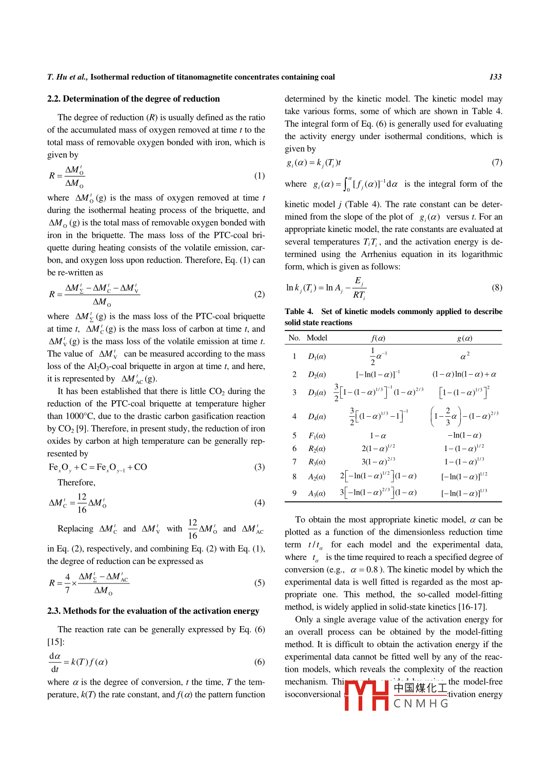 International Journal of Minerals, Metallurgy and MaterialsVolume 21, Number 2, February 2014, Page 131Do:10.1007/s12613-014-0875-zIsothermal reduction of titanomagnetite concentrates containing coalTu Hu.2, Xue-wei Lil, Chen-guang Bai", and Gui-bao Qiu"1)College of Materials Science and Engineering, Chongqing University, Chongqing 400044, China2)Faculty of Metallurgical and Energy Engineering, Kunming University of Science and Technology, Kunming 650093, China(Received: 9 September 2013: revised: 29 October 2013: accepted: 3 November 2013)Abstract: The isothermal reduction of the Panzhihua titanomagnetite concentrates(Prc) briquette containing coal under argon atmospherewas investigated by thermogravimetry in an electric resistance furnace within the temperature range of 1250-1350.C. The samples reduced iargon at 1350C for different time were examined by X-ray diffraction(XRD) analysis. Model-fitting and model-free methods were used toevaluate the apparent activation energy of the reduction reaction. It is found that the reduction rate is very fast at the early stage, and then, at alater stage, the reduction rate becomes slow and decreases gradually to the end of the reduction. It is also observed that the reduction of PTCby coal depends greatly on the temperature. At high temperatures, the reduction degree reaches high values faster and the final valueachieved is higher than at low temperatures. The final phase composition of the reduced PTC-coal briquette consists in iron arof about 68 kJ-mol'and by three-dimensional diffusion for reduction degree greater than 0.7 5 withe d wustite(FeO)are intermediaterous-pseudobrookite(FeTi2O ), while Fe275Ti02504, Fe2sTiosO4, Fe2.25Ti07504, ilmenite(FeTiO3)anproducts. The reaction rate is controlled by the phase boundary reaction for reduction degree less than 0. 2 with an apparent activation energy134 kJ mol. For the reduction degree in the range of 0. 2-0.75, the reaction rate is under mixed control, and the activation energy increaseswith the increase of the reduction degreeKeywords: titanomagnetite; carbothermal reduction; thermogravimetric analysis; kineticsThe direct reduction of Panzhihua titanomagnetite con1 Introductionentrates(PtC) by solid reductants has been widely studiedfor many decades [1-6]. It was found that the reduction ofVanadium-titanium-bearing magnetite of Panzhihua, titanomagnetite was slower than that of magnetite due to theChina, is a complex iron ore composed by the coexistence different crystal structures and the presence of titarof vanadium and titanium that accounts for more than 90% sulting in a higher thermodynamic stability of titanomagnetof the titanium reserves in China. Most of the titanomagnet- ite [7-13]. Here, the kinetics of the carbothermal reductionte concentrates are now used as the main materials for the of PtC was studied by using thermogravimetry. During theblast furnace process in Panzhihua area. Most of the iron heating process of the composite briquette of PTc and coaland, partly, vanadium can be reduced into the hot metal; the mass loss is caused by the release of volatiles from coalhowever, almost all of the titanium remains in the slag, carbon loss, and removal of oxygen by reduction. Aforming a high-titanium slag with contents of TiO2 varying pseudo-kinetic parameter, fraction of reaction () has beenfrom 22wt% to 25wt %. There is no an appropriate and used to measure the reaction rate. It has been observed thateconomic method to deal with such slag [l] so far. Recently, the estimation of the pseudo-kinetic parameter ( is notmost of the studies focused on developing an alternative identical to that of the degree of reduction and can only pro-route to use the titanomagnetite concentrates highlighting vide a rough estimate of the extent and characteristics of thethe rotary hearth furnace(RHF)process, which involves the reduction [141reduction of composite briquette of titanomagnetite concenIn the present work, the isothermal reduction of Prc bytrates with coal, and the smelting of the reduced sample in coal was investigated by thermogravimetry, and the reducan electric arc furnacetion degree was used to analyze the kinetic dataorrespondingauthorTuHuE-mail:hutu1219@@126.comO University of Science and Technology Beijing and Springer-Verlag Berlin Heidelberg 2014中國煤化工 springerCNMHGIntJ. Miner. Metall. Mater., Vol. 21, No. 2, Feb. 20142. Experimentalthe Ptc was mixed homogenously with the coal with a mo-2. 1. Specimen preparation and experimental procedurees lar ratio(Cfixed/O obonded with Fe)of 1.2. Themixture was madeinto spheroid briquettes at 15 MPa with a briquette makerThe chemical compositions and size distributions of the The diameter of the briquette was about 30 mm, and theraw materials were examined and are presented in Tables tal mass of the sample was about 25 g. The other type of1-3. Fig. I shows the X-ray diffraction(XRD) pattern of briquette made of coal and alumina particles, which has thePTC. The mineral compositions were mostly titanomagnet- same amount of coal and the same geometries as the briite, magnetite, and ilmenite. Two types of specimens were quette made of PTC and coal, was made under the sameprepared. One type contained PTC and coal, and the other conditions. All the briquettes were dried at 120 C for 6hcontained alumina particles and coal. For the former type, before the reduction experiTable 1. Chemical composition of Panzhihua titanomagnetite concentrates (tC) and coalwt%oTFe Feo T1O2 V2Os SiO Cao MgO AlO3Volatile526232.0012004.201.302.603.9081.956.9510410.69Table 2. Size distribution of Panzhihua titanomagnetite concentrates (ptc<7474-8080-9696-109109-12020-150Content/wt%3.264.201.810.320.15Table 3. Size distribution of coalDiameter /um<100150-180180-250550-1700Total20.8051.3414.89.871.1argon quickly after the sample was taken out from the fnace. Two types of briquettes were heated under the same150FeTi,O.experimental conditions at each temperature. Three iden