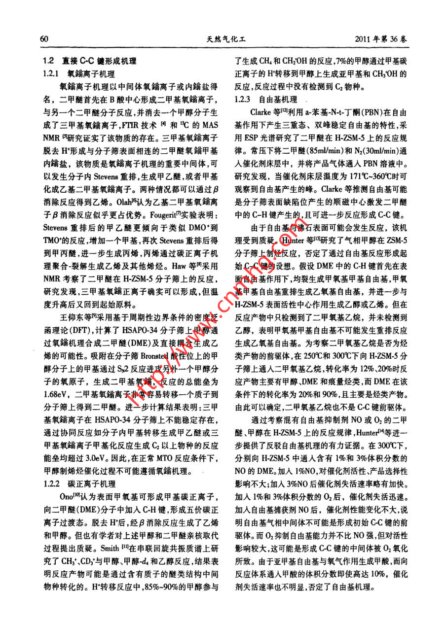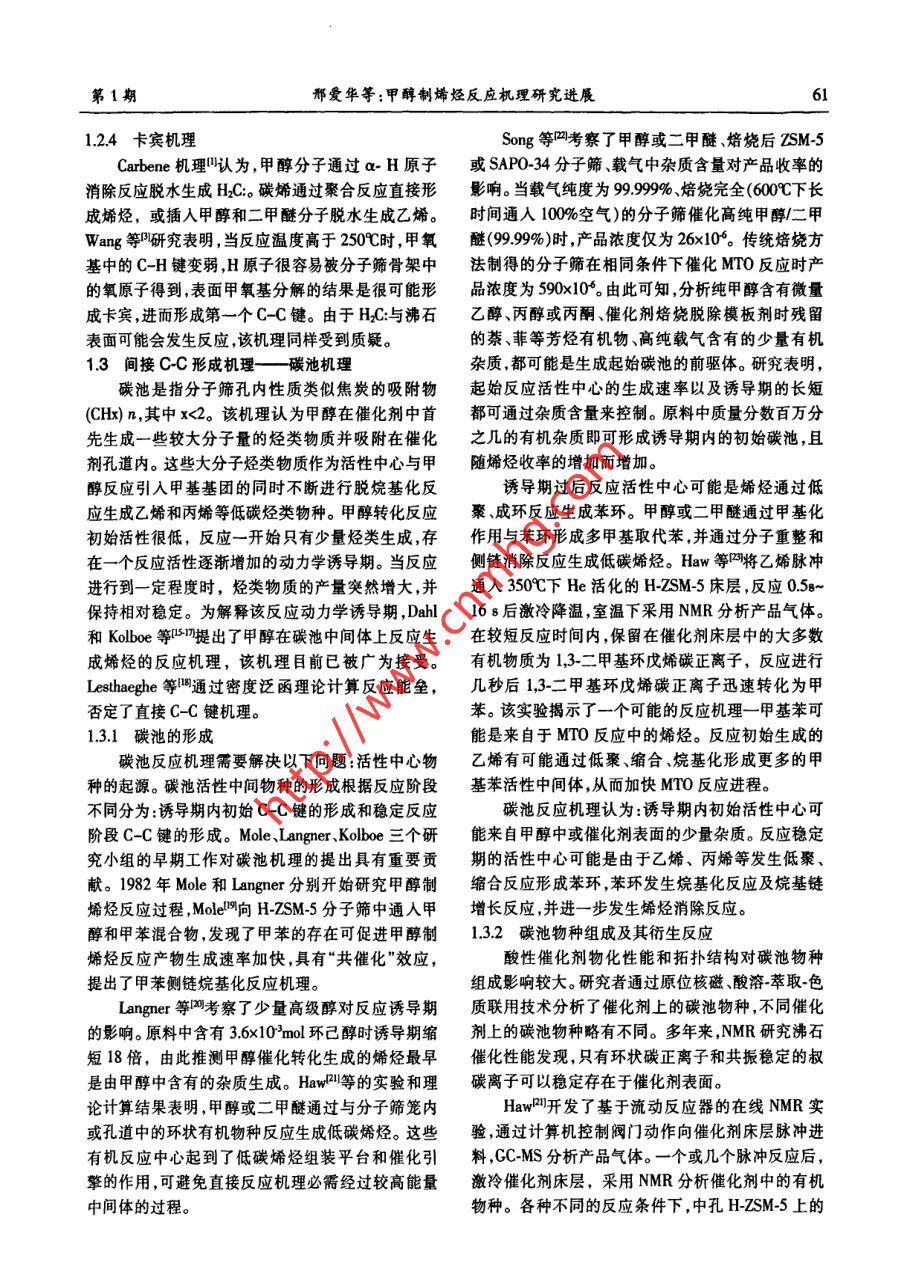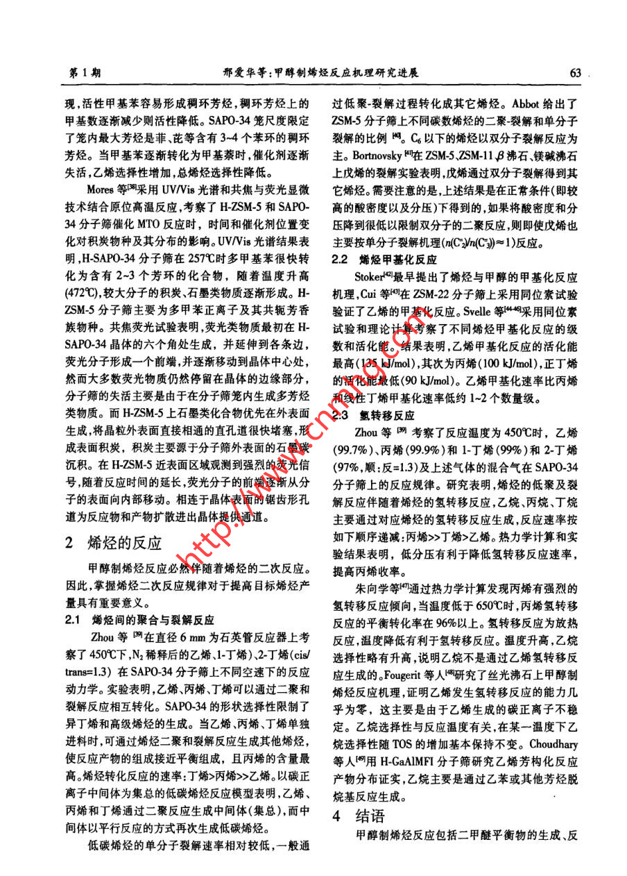 .第1期邢愛華等:甲醇制烯烴反應(yīng)機(jī)理研究進(jìn)展55者論綜湖甲醇制烯烴反應(yīng)機(jī)理研究進(jìn)展邢愛華,林泉,朱偉平,岳 國(中國神華煤制油化工有限公司北京研究院,北京101)精要深人理部甲旅制爆烴反應(yīng)機(jī)理,對開發(fā)高效催化制優(yōu)化反應(yīng)工藝(g lgid mamiea)的狀者,以提高始經(jīng)選擇性具有重要意義。本文對甲靜制娜經(jīng)反應(yīng)機(jī)理發(fā)展歷程進(jìn)行了垛述,對氧端離子機(jī)理,碳正青子機(jī)理、自由著機(jī)理、卡賓機(jī)理在內(nèi)的直接CC鍵形機(jī)理進(jìn)行了簡要介紹,詳細(xì)分析了近期被廣泛接受的間接CC健形成機(jī)理(碳她機(jī)理),包括初始碳池形成、碳池物質(zhì)種類碳他物種反應(yīng)、碳池失活發(fā)展歷程。簡要介紹了烯烴二次反應(yīng)機(jī)理。關(guān)鍵詞:甲醇:烯烴;MTO;反應(yīng)機(jī)理;碳正離子;碳池;催化劑中圈分類號:TQ 21文獻(xiàn)標(biāo)識碼:A文章編號:001-919(2011)01-59.07乙始和丙烯是現(xiàn)代化學(xué)工業(yè)的重要基礎(chǔ)原料。1甲 醇制烯烴反應(yīng)歷程,現(xiàn)有低碳烯烴生產(chǎn)技術(shù)嚴(yán)重依賴石油資源,生產(chǎn)乙烯和丙烯的傳統(tǒng)方法為輕油(石腦油.輕柴油)裂解Chang等將MTO反應(yīng)歷程分為三步:(1)甲醇工藝。由于石油資源的有限性和昂貴的價(jià)格,世界.脫水生成二甲醚,形成甲醇、二甲醚和水的平衡體各國開始致力于非石油路線制乙烯和丙烯等低碳系;(2)低碳烯烴的生成;(3)高碳烯烴、正構(gòu)/異構(gòu)鏈烯烴的技術(shù)開發(fā),其中以天然氣或煤為原料經(jīng)甲醇烷烴、環(huán)烷烴芳香烴等的生成。通常認(rèn)為二甲醚的制取低碳烯烴技術(shù)逐漸成為研究開發(fā)的熱點(diǎn)。反應(yīng)歷程為:甲醇分子與分子篩表面Bronsted酸中經(jīng)歷實(shí)驗(yàn)室和工業(yè)試驗(yàn)裝置的運(yùn)行,國內(nèi)外取心通過親核反應(yīng)脫水生成穩(wěn)定的表面甲氧基,另一得了較好成果的甲醇制烯烴工藝包括UOP公司的甲醇分子親核攻擊固體酸催化劑表面的甲氧基生MTO工藝(Methanol to olefin)、大連化物所的DM-成二甲醚。步驟(3)主要按碳正離子機(jī)理進(jìn)行,包括TO工藝、中石化的SMTO工藝、Lurgji 公司開發(fā)的鏈增長、裂解以及氫轉(zhuǎn)移反應(yīng)。MTP工藝和清華大學(xué)開發(fā)的流化床甲醇制丙烯的表面甲氧基及二甲醚的生成FMTP工藝。隨著MTO和MTP工業(yè)化進(jìn)程的推進(jìn),原位紅外和核磁(NMR)技術(shù)證實(shí),穩(wěn)定的表面甲醇制烯烴反應(yīng)機(jī)理理論計(jì)算和實(shí)驗(yàn)研究也逐步甲 氧基在二甲 醚和烴類生成之前出現(xiàn)(。甲醇分子深入。30年的基礎(chǔ)研究提出了至少20種不同的反與SAPO-34分子篩表面酸性位形成的穩(wěn)定表面甲應(yīng)機(jī)理。MTO催化反應(yīng)活性位不單指無機(jī)骨架上的氧基與MTO反應(yīng)中所有烴類化合物的生成有關(guān)。H質(zhì)子,而是觸合了結(jié)構(gòu)-恬性、拓?fù)涓拍畹挠袡C(jī)無Wang等叫使用同位素標(biāo)定技術(shù),在較低的反應(yīng)機(jī)超分子。甲醇制烯烴反應(yīng)機(jī)理研究,有助于了解溫度下(00C),分別向HY.H-ZSM-5和H-SAPO.MTO反應(yīng)的轉(zhuǎn)化途徑及規(guī)律;掌握催化劑物化結(jié)34分子篩表面脈沖注人少量甲醇,高純N2在高溫構(gòu)、反應(yīng)條件對MTO反應(yīng)歷程、中間產(chǎn)物種類、目下吹掃除去分子篩表面的水分后原位C MAS-的產(chǎn)物和副產(chǎn)物生成規(guī)律的影響;建立完善的反應(yīng).NMR分析表明,催化劑表面物種為純凈的表面甲氧動(dòng)力學(xué),指導(dǎo)催化劑開發(fā)及工藝優(yōu)化;推動(dòng)物質(zhì)結(jié)基。上述表面甲氧基的反應(yīng)活性很高.室溫下可與構(gòu)研究。本文對甲醇制烯烴反應(yīng)機(jī)理發(fā)展歷程進(jìn)行水反應(yīng)生成甲醇,在160C和220C下還能與甲苯和了概述,并重點(diǎn)分析了近年獲得廣泛認(rèn)可的碳池反,環(huán)已烷等探針分子發(fā)生甲基化反應(yīng)。高活性表面甲應(yīng)機(jī)理。氧基在較低溫度下(T≤250 C)可與氣相中的甲醇分子反應(yīng)生成二甲醚,并快速達(dá)到熱力學(xué)平衡。在較收稿日期:2010-10-16;作者筒介:邢愛華(1970-),女,博士,高的反應(yīng)溫度下,表面甲氧基的C-0和C-H鍵變高級工程師,電話13120458448,電郵xingaihua@csclc.com弱,獲得較高的反應(yīng)活性。6(天然氣化工2011年第36卷1.2 直接C-C鍵形成機(jī)理了生成CH.和CH20H的反應(yīng),7%的甲醇通過甲基碳1.2.1氧鐲離子機(jī)理正離子的H'轉(zhuǎn)移到甲醇上生成亞甲基和CH;:OH的氧鑰離子機(jī)理以中間體氧鑰離子或內(nèi)鑰鹽得反應(yīng),反應(yīng)過程中沒有檢測到C2物種。名,二甲醚首先在B酸中心形成二甲基氧鑰離子,1.2.3自由基機(jī)理與另一個(gè)二甲醚分子反應(yīng),并消去一個(gè)甲醇分子生Clarke等凹利用a-苯基-N-t-丁酮(PBN)在自由成了三甲基氧鑰離子,FTIR技術(shù)4和C的MAS基作用下產(chǎn)生三重態(tài)、雙峰穩(wěn)定自由基的特性,采.NMR [研究證實(shí)了該物質(zhì)的存在。三甲基氧鑰離子用ESP光譜研究了二甲醚在H-ZSM-5上的反應(yīng)規(guī)脫去H'形成與分子篩表面相連的二甲醚氧鑰甲基律。 常壓下將二甲醚(85m/min)和N(30ml/min)通內(nèi)鑰鹽,該物質(zhì)是氧鑰離子機(jī)理的重要中間體,可入催化劑床