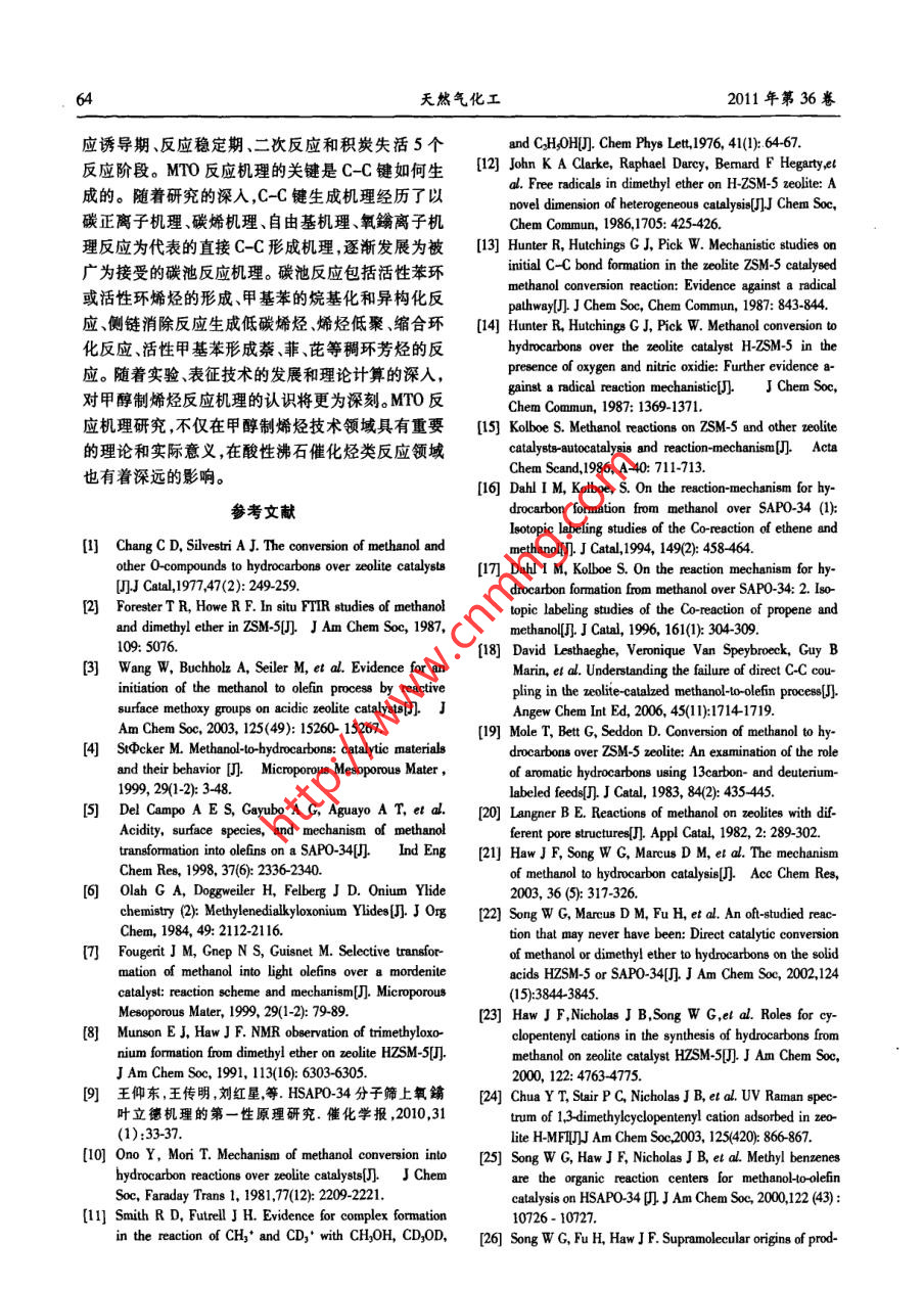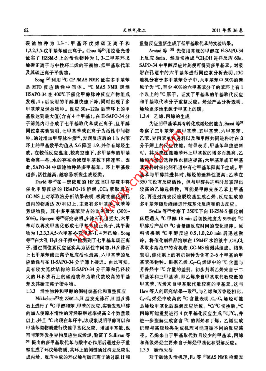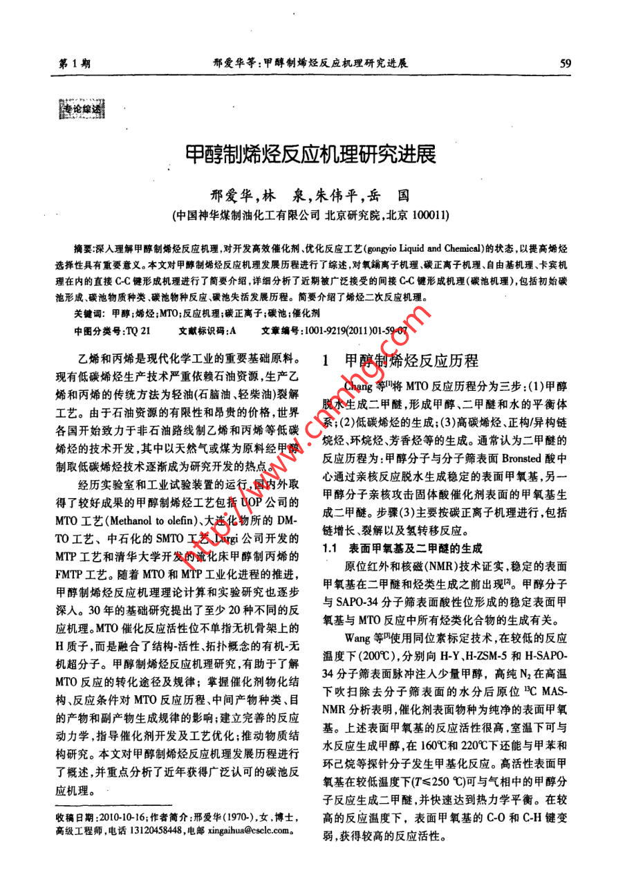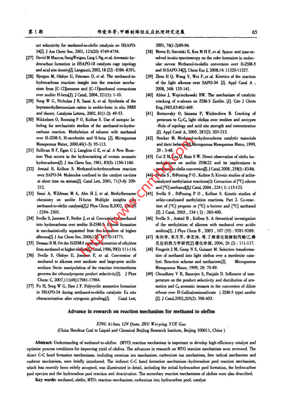 .第1期邢愛華等:甲醇制烯烴反應(yīng)機(jī)理研究進(jìn)展55者論綜湖甲醇制烯烴反應(yīng)機(jī)理研究進(jìn)展邢愛華,林泉,朱偉平,岳 國(中國神華煤制油化工有限公司北京研究院,北京101)精要深人理部甲旅制爆烴反應(yīng)機(jī)理,對開發(fā)高效催化制優(yōu)化反應(yīng)工藝(g lgid mamiea)的狀者,以提高始經(jīng)選擇性具有重要意義。本文對甲靜制娜經(jīng)反應(yīng)機(jī)理發(fā)展歷程進(jìn)行了垛述,對氧端離子機(jī)理,碳正青子機(jī)理、自由著機(jī)理、卡賓機(jī)理在內(nèi)的直接CC鍵形機(jī)理進(jìn)行了簡要介紹,詳細(xì)分析了近期被廣泛接受的間接CC健形成機(jī)理(碳她機(jī)理),包括初始碳池形成、碳池物質(zhì)種類碳他物種反應(yīng)、碳池失活發(fā)展歷程。簡要介紹了烯烴二次反應(yīng)機(jī)理。關(guān)鍵詞:甲醇:烯烴;MTO;反應(yīng)機(jī)理;碳正離子;碳池;催化劑中圈分類號:TQ 21文獻(xiàn)標(biāo)識碼:A文章編號:001-919(2011)01-59.07乙始和丙烯是現(xiàn)代化學(xué)工業(yè)的重要基礎(chǔ)原料。1甲 醇制烯烴反應(yīng)歷程,現(xiàn)有低碳烯烴生產(chǎn)技術(shù)嚴(yán)重依賴石油資源,生產(chǎn)乙烯和丙烯的傳統(tǒng)方法為輕油(石腦油.輕柴油)裂解Chang等將MTO反應(yīng)歷程分為三步:(1)甲醇工藝。由于石油資源的有限性和昂貴的價(jià)格,世界.脫水生成二甲醚,形成甲醇、二甲醚和水的平衡體各國開始致力于非石油路線制乙烯和丙烯等低碳系;(2)低碳烯烴的生成;(3)高碳烯烴、正構(gòu)/異構(gòu)鏈烯烴的技術(shù)開發(fā),其中以天然氣或煤為原料經(jīng)甲醇烷烴、環(huán)烷烴芳香烴等的生成。通常認(rèn)為二甲醚的制取低碳烯烴技術(shù)逐漸成為研究開發(fā)的熱點(diǎn)。反應(yīng)歷程為:甲醇分子與分子篩表面Bronsted酸中經(jīng)歷實(shí)驗(yàn)室和工業(yè)試驗(yàn)裝置的運(yùn)行,國內(nèi)外取心通過親核反應(yīng)脫水生成穩(wěn)定的表面甲氧基,另一得了較好成果的甲醇制烯烴工藝包括UOP公司的甲醇分子親核攻擊固體酸催化劑表面的甲氧基生MTO工藝(Methanol to olefin)、大連化物所的DM-成二甲醚。步驟(3)主要按碳正離子機(jī)理進(jìn)行,包括TO工藝、中石化的SMTO工藝、Lurgji 公司開發(fā)的鏈增長、裂解以及氫轉(zhuǎn)移反應(yīng)。MTP工藝和清華大學(xué)開發(fā)的流化床甲醇制丙烯的表面甲氧基及二甲醚的生成FMTP工藝。隨著MTO和MTP工業(yè)化進(jìn)程的推進(jìn),原位紅外和核磁(NMR)技術(shù)證實(shí),穩(wěn)定的表面甲醇制烯烴反應(yīng)機(jī)理理論計(jì)算和實(shí)驗(yàn)研究也逐步甲 氧基在二甲 醚和烴類生成之前出現(xiàn)(。甲醇分子深入。30年的基礎(chǔ)研究提出了至少20種不同的反與SAPO-34分子篩表面酸性位形成的穩(wěn)定表面甲應(yīng)機(jī)理。MTO催化反應(yīng)活性位不單指無機(jī)骨架上的氧基與MTO反應(yīng)中所有烴類化合物的生成有關(guān)。H質(zhì)子,而是觸合了結(jié)構(gòu)-恬性、拓?fù)涓拍畹挠袡C(jī)無Wang等叫使用同位素標(biāo)定技術(shù),在較低的反應(yīng)機(jī)超分子。甲醇制烯烴反應(yīng)機(jī)理研究,有助于了解溫度下(00C),分別向HY.H-ZSM-5和H-SAPO.MTO反應(yīng)的轉(zhuǎn)化途徑及規(guī)律;掌握催化劑物化結(jié)34分子篩表面脈沖注人少量甲醇,高純N2在高溫構(gòu)、反應(yīng)條件對MTO反應(yīng)歷程、中間產(chǎn)物種類、目下吹掃除去分子篩表面的水分后原位C MAS-的產(chǎn)物和副產(chǎn)物生成規(guī)律的影響;建立完善的反應(yīng).NMR分析表明,催化劑表面物種為純凈的表面甲氧動(dòng)力學(xué),指導(dǎo)催化劑開發(fā)及工藝優(yōu)化;推動(dòng)物質(zhì)結(jié)基。上述表面甲氧基的反應(yīng)活性很高.室溫下可與構(gòu)研究。本文對甲醇制烯烴反應(yīng)機(jī)理發(fā)展歷程進(jìn)行水反應(yīng)生成甲醇,在160C和220C下還能與甲苯和了概述,并重點(diǎn)分析了近年獲得廣泛認(rèn)可的碳池反,環(huán)已烷等探針分子發(fā)生甲基化反應(yīng)。高活性表面甲應(yīng)機(jī)理。氧基在較低溫度下(T≤250 C)可與氣相中的甲醇分子反應(yīng)生成二甲醚,并快速達(dá)到熱力學(xué)平衡。在較收稿日期:2010-10-16;作者筒介:邢愛華(1970-),女,博士,高的反應(yīng)溫度下,表面甲氧基的C-0和C-H鍵變高級工程師,電話13120458448,電郵xingaihua@csclc.com弱,獲得較高的反應(yīng)活性。6(天然氣化工2011年第36卷1.2 直接C-C鍵形成機(jī)理了生成CH.和CH20H的反應(yīng),7%的甲醇通過甲基碳1.2.1氧鐲離子機(jī)理正離子的H'轉(zhuǎn)移到甲醇上生成亞甲基和CH;:OH的氧鑰離子機(jī)理以中間體氧鑰離子或內(nèi)鑰鹽得反應(yīng),反應(yīng)過程中沒有檢測到C2物種。名,二甲醚首先在B酸中心形成二甲基氧鑰離子,1.2.3自由基機(jī)理與另一個(gè)二甲醚分子反應(yīng),并消去一個(gè)甲醇分子生Clarke等凹利用a-苯基-N-t-丁酮(PBN)在自由成了三甲基氧鑰離子,FTIR技術(shù)4和C的MAS基作用下產(chǎn)生三重態(tài)、雙峰穩(wěn)定自由基的特性,采.NMR [研究證實(shí)了該物質(zhì)的存在。三甲基氧鑰離子用ESP光譜研究了二甲醚在H-ZSM-5上的反應(yīng)規(guī)脫去H'形成與分子篩表面相連的二甲醚氧鑰甲基律。 常壓下將二甲醚(85m/min)和N(30ml/min)通內(nèi)鑰鹽,該物質(zhì)是氧鑰離子機(jī)理的重要中間體,可入催化劑床