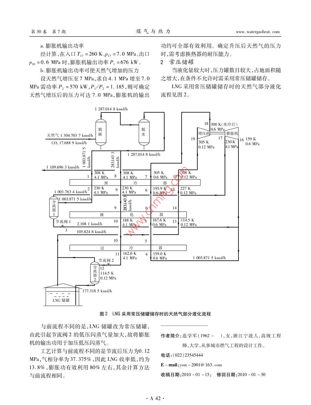 第30卷第7期煤氣與熱力Vol. 30 No. 72010年7月GAS & HEATJul. 2010天然氣部分液化工藝計算范學軍,袁樹明,杜建梅,常 玉春,于建國(中國市政工程華北設計研究總院,天津300074)摘要:提出了壓力罐儲存、常壓罐儲存的天然氣部分液化工藝流程,結合實例進行了液化.工藝計算關鍵詞:液化天然氣; 部分液化;壓力罐儲存; 常壓罐儲存; 工藝計算中圖分類號: TU996文獻標識碼: A文章編號: 1000 -4416(2010)07 -0A40 -03Process Calculation of Partial Liquefaction of Natural GasFAN Xue-jun,YUAN Shu-ming,DU Jian-mei,CHANG Yu-chun,YU Jian-guoAbstract: The process flow of partial liquefaction of natural gas stored in pressurized and atmos-pheric tanks is presented. The liquefaction process calculation is performed.Key words: LNG; partial liquefaction; pressurized tank storage ; atmospheric tank storage ;process calculation天然氣部分液化用以調峰, LNG可采用壓力罐⑥為方便計算,分離器2氣相出口不進人過儲存,也可采用常壓罐儲存,二者計算方法略有區(qū)冷器,而直接進人液化器。1.2工藝計算1壓力罐儲存1.2.1 已知條件LNG采用壓力罐儲存時天然氣部分液化流程①凈化后 天然氣各組分摩爾分數如下:見圖1。CH4: 0. 950 33n- C3Hp: 0.000 201.1 流程說明C2H6: 0. 034 47i-C,H2: 0. 000 41①當LNG儲罐為壓力罐時,可利用增壓機將C3Hg:0.00618 .n-C&H4: 0.000 70膨脹前天然氣壓力提高,可提高至7 ~8 MPa,具體n-C,H6: 0.001 12N2: 0. 005 47視換熱器的承壓能力而定,可利用膨脹機的輸出功i-C,H6:0.001 12率80%左右。②膨脹后天然氣溫度已達深冷溫度,故天然②天然氣溫度為35 C,壓力(絕對壓力,以下同)為4.1 MPa。氣不僅需脫水,還需脫碳。③閥1~3 為切換閥,開始運行時打開閥1,③天然氣流量為 70x 10* m^/d,凈化后為.關閥3、2。當膨脹機開始輸出功時,逐漸關閉閥1,69.055 x10* m'/d。④LNG儲罐工作壓力為0.6MPa。同時逐漸打開閥2、閥3。④為膨脹機正常運行 ,應控制其出口溫度,使1.2.2工藝計算在出口壓力下的氣體液化率<5%。①設定液化率⑤膨脹天然氣出預冷器溫度若低于露點,則應滿足3個換熱器的熱平衡,此處取26%。必須設置分離器1。②計算膨脹后溫度 Ti6.A40.www. watergasheat. com范學軍,等:天然氣部分液化工藝計算第30卷第7期1 287.014 8 kmol/ht 308 K(水冷后)7.0 MPa脫t膨脹機天然氣1 304.703 7 kmol/h傾19 308K 17260KCO217.688 9 kmo/h4.1 MPa 70MPa158.9 K閥1閥3| 0.6 MPa閥21 023.033 4 kmol/h308 K,308K一305K305 K_17.0MPa_84.1MPa70.6MPa15↑0.6MPa預2260 K260KT235.1KT257K7.0 MPa 4.1 MPa°.0.6 MPa 0.6 MPa952.391 0 kmol/h_ 952.391 0 kmol/h I景冒64|液比器節(jié)流閥1;0 kmol/h .1(3 139.2 Kt 0.6 MPa70.642 4 kmol/h10 200K 5 179K4.1MPa 50.6 MPa _過冷161.9K 41T58.9K節(jié)流閥24.1 MPa L 0.6 MPa離130.139.21LNG).6 MPa儲263.981 4 kmol/h圖1 LNG 采用壓力罐儲存時的天然氣部分液化流程以膨脹機入口T,=T2 =260 K,prz=pz =7.0下的溫度。于是利用To =200 K,p1o=4.1 MPa,可MPa,計算入口比焓h,= -78 424 kJ/kmol ,然后以得hpo= -84 183.3 kJ/kmol, 則以熱平衡計算可求出口壓力P16 =0.6 MPa作閃蒸計算,求得出口比焓得T,=179.068 K。hg= - 80 979.8 kJ/kmol ,進而得T6=158. 887 K,⑥作液化器熱平衡計算液化率L=0.041 ,滿足要求。利用此熱平衡可求T。。按慣例T。= T2 =260③計算點4的溫度K,T4=T2-3 K=257 K,則可求得T。=235.075 K。由于點2的溫度是按膨脹后L<0.05經試算確⑦作3個換熱器的熱平衡計算定的,T2 =260 K,此時T2遠離露點,故分離器1無設定液化率L=0.26,作3個換熱器的熱平衡液相,則T,=Ti。=158.887 K。計算,天然氣流量按69. 055 x10* m2/d計算。預冷④計算液化天然氣節(jié)流閥2后的溫度器需冷量835. 594 kW ,供冷量:843. 249 kW ;液化器Tl=T4 +3 K=161. 887 K,p1 =4.1 MPa,此條需冷量555.884kW,供冷量:555.894kW;過冷器需件下h= -87 349.3 kJ/kmol, 按hu =hp,可求得冷量:294.283 kW, 供冷量:294. 289 kW。T2=139.209 K,氣化率V2=0.211 11。計算結果分析:3個換熱器供冷量均略大于需⑤作過冷 器熱平衡計算冷量。若反之,則應減小液化率,以試算的方法求為此需設定TIo =200 K,此溫度應取天然氣完之。上述條件下液化天然氣收率為20.51%。全液化后的溫度,即液化率L=1或氣化率V=0以⑧增壓后天然氣的壓力.A41●第30卷第7期煤氣與熱力www. watergasheat. coma.膨脹機輸出功率功約可全部有效利用。確定升壓后天然氣的壓力經計算,在人口T,=260 K P17 =7.0 MPa、出口時,需考慮換熱器的耐壓能力。P16=0.6MPa時,膨脹機輸出功率P=676kW。2常壓儲罐b.膨脹機輸出功率可使天然氣增加的壓力當液化量較大時,壓力罐數目較大,占地面積隨設天然氣增壓至7 MPa,求自4.1 MPa增至7.0之增大, 在條件不允許時需采用常壓儲罐儲存。MPa需功率P2 =570 kW,P/P2=1.185,則可確定LNG采用常壓儲罐儲存時的天然氣部分液化天然氣增壓后的壓力可達7.0MPa,膨脹機的輸出流程見圖2。1 287.014 8 kmol/h18 308 K(水冷后)說|0.6 MPar天然氣1 304.703 7 kmolh|碳k|增壓機膨脹機17 016159KCO2 17.688 9 kmol/h0.12 MPa305 KO 0.6 MPa4.1 MPa1 109.696 3 kmo/h!308K,15 SOSK冷器1 001.763 4 kmol/h'230K。9|230K 6 195.9K 14227 K0.6 MPaI 0.12 MPa1003.871 5 kmol/h64節(jié)流閥12.108 1 kmol/h1(188 K167.6K13↑1I4.5K105.824 8 kmol/h162.0k159.0 K1節(jié)流閥2L 0.6 MPa1 003.871 5 kmol/h分H.114.5 K).12 MPa177.318 5 kmol/h-----LNG儲罐圖2LNG采用常壓儲罐儲存時的天然氣部分液化流程與前流程不同的是,LNG儲罐改為常壓儲罐,由此引起節(jié)流閥2的低壓閃蒸氣量加大,故將膨脹作者簡介:范學軍(1962- ),女, 浙江寧波人,高級工程機的輸出功用于加壓低壓閃蒸氣。師,大學,從事城市燃氣工程的設計工作。工藝計算與前流程不同的是節(jié
