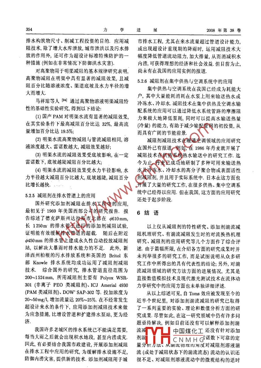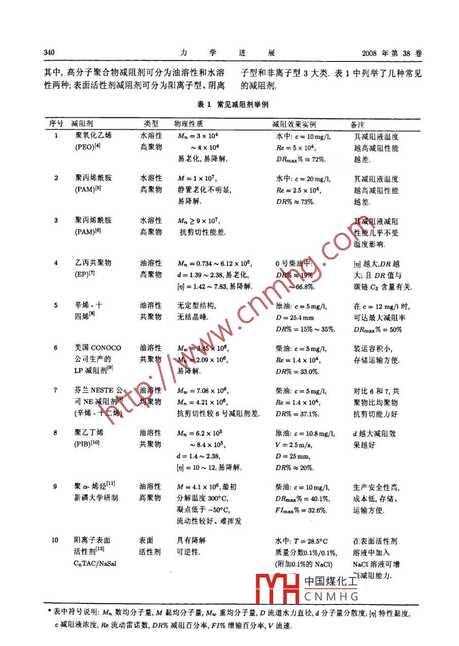 第38卷第3期力.學(xué)進(jìn)展Vol.38 No.32008年5月25日ADVANCES IN MECHANICSMay25,2008添加劑湍流減阻流動(dòng)與換熱研究綜述*焦利芳李鳳臣↑哈爾濱工業(yè)大學(xué)能源科學(xué)與I程學(xué)院,哈爾濱150001摘要添加劑湍流減阻是指在液體的管道湍流中添加少量的高分子聚合物或某種表面活性劑從而使湍流阻力大大降低的現(xiàn)象.從其被發(fā)現(xiàn)至今,經(jīng)過近半個(gè)世紀(jì)的研究(實(shí)驗(yàn)研究、理論分析、數(shù)值模擬和實(shí)際系統(tǒng)的應(yīng)用研究),盡管對(duì)這一現(xiàn)象及其實(shí)際應(yīng)用價(jià)值已有了較為深入的認(rèn)識(shí),但仍有許多方面尚有欠缺,例如對(duì)湍流減阻的機(jī)理仍然在探索中.本文歸納評(píng)述了高分子聚合物或表面活性劑添加劑湍流減阻流動(dòng)與換熱現(xiàn)象的研究現(xiàn)狀,從湍流減阻劑的特性、減阻劑的湍流減阻機(jī)理、湍流減阻發(fā)生時(shí)的換熱機(jī)理、減阻流動(dòng)速度場(chǎng)分布和換熱控制等幾個(gè)方面綜述了添加劑湍流減阻流動(dòng)與換熱特性,并綜述了湍流減阻劑在實(shí)際工業(yè)系統(tǒng)中的應(yīng)用情況,在對(duì)添加劑湍流減阻機(jī)理、有湍流減阻發(fā)生時(shí)的對(duì)流換熱機(jī)理等的理解方面進(jìn)行了新的總結(jié).關(guān)鍵詞高分子聚合物, 表面活性劑,湍流減阻,對(duì)流換熱,節(jié)能1引言湍流減阻的認(rèn)識(shí)日漸豐富,湍流減阻現(xiàn)象在實(shí)際應(yīng)用方面也取得了一-定的進(jìn)展.本文旨在對(duì)添加1948年Tomsl1首次報(bào)道了在液體湍流中添.劑湍流減阻的研究現(xiàn)狀做一綜述,主要從湍流減加少量的高分子聚合物會(huì)使湍流阻力大大降低,阻劑的特性、湍流減阻機(jī)理、湍流減阻流動(dòng)的換該現(xiàn)象后來被稱為"Toms效應(yīng)”.在強(qiáng)剪切力、高熱機(jī)理等幾個(gè)方面闡述.本文的另一個(gè)目的是對(duì)溫等因素作用下,高分子聚合物的柔性分子長(zhǎng)鏈我國在添加劑湍流減阻領(lǐng)域的研究現(xiàn)狀做一調(diào)查,結(jié)構(gòu)被破壞,且破壞后無法自動(dòng)修復(fù),導(dǎo)致其減阻因此-一些共性的方面主要介紹我國學(xué)者的研究成效果的永久性喪失.20世紀(jì)90年代開始某些表面果,在減阻劑的實(shí)際應(yīng)用方面也著重介紹了我國活性劑添加劑也被發(fā)現(xiàn)具有減小湍流阻力的作用,的應(yīng)用研究情況.并且其減阻性能在受到剪切力、溫度等因素影響而暫時(shí)喪失后,待流動(dòng)狀態(tài)恢復(fù)到有效減阻參數(shù)2減阻劑的特性研究范圍內(nèi)時(shí)可自動(dòng)、快速恢復(fù).在實(shí)驗(yàn)室中的直管道理想條件下,對(duì)于水的湍流摩擦阻力在加入表面2.1 減阻劑簡(jiǎn)介活性劑減阻劑后最高甚至可降低90%(2],即推動(dòng)相1948年,Toms首次發(fā)現(xiàn)高分子聚合物的湍流同流量的水流動(dòng)只需要原來泵功率的10%.在實(shí)減阻(drag reduction)現(xiàn)象(1,引起了學(xué)術(shù)界廣泛際應(yīng)用系統(tǒng)中,因管道比較復(fù)雜,如彎管、分支、突注意 1949 年, Mysels注冊(cè)了第1個(gè)減阻劑專擴(kuò)(縮)、換熱器的不規(guī)則形狀等的影響,會(huì)使減阻利問。20世紀(jì)60年代,減阻劑的研究已取得了效果降低,但在合理的流動(dòng)條件下,高分子聚合物很大的進(jìn)展.我國在80年代中期才開始減阻劑減或表面活性劑添加劑湍流減阻率-般仍可達(dá)50%阻的研究,也取得了一定的效果.左右這-減阻效應(yīng)無疑擁有很大的應(yīng)用潛力,可這里所說的減阻劑專指那些只需添加微量即用于降低長(zhǎng)距離液體輸送系統(tǒng)或液體循環(huán)系統(tǒng)的可使流體的湍流摩阻顯著降低的化學(xué)添加劑經(jīng)驅(qū)動(dòng)泵功率,達(dá)到節(jié)能、增輸?shù)男Ч?過過去60多年的研究,已發(fā)現(xiàn)很多有效的減阻劑,經(jīng)過近半個(gè)世紀(jì)的不懈努力,人們對(duì)添加劑可分中國煤化工:些表面活性劑.收稿日期: 2007-07-23,修回H期: 2008-05-15YHCNMHG.●哈爾濱科技創(chuàng)新人才專項(xiàng)基金(2006RFLXS013)資助項(xiàng)目↑E mail: lifch@hit.edu.cn340力學(xué)進(jìn)2008年第38卷其中,高分子聚合物減阻劑可分為油溶性和水溶子型和非離子型3大類.表1中列舉了幾種常見.性兩種;表面活性劑減阻劑可分為陽離子型、陰離的減阻劑表1常見減阻劑舉例序號(hào)減阻劑類型物理性質(zhì)減阻效果實(shí)例備注聚氧化乙烯水溶性Mn =3x 104水中: c= 10mg/l,其減阻液溫度(PEO)41高聚物~4x 104Re=5x 104,越高減阻性能易老化,易降解.DRmx%≈72%.越差.聚丙烯酰胺M=1x 107,水中: c= 20mg/l, .(PAM)(51高聚物.靜置老化不明顯,Re=2.5x 104,易降解.DR%≈73%.Mn≥9x 107,其減阻液減阻(PAM)6]抗剪切性能差.性能幾乎不受溫度影響.4乙丙共聚物油溶性Mn = 0.734 ~ 6.12x 105,0號(hào)柴油中:[m]越大,DR越(EP)7]d=1.39~2.38,易老化,.DR%≈19%大;且DR值與[m] = 1.42 ~ 7.83,易降解.~ 66.8%.碳鏈C3含量有關(guān).辛烯-十無定型結(jié)構(gòu),原油: c= 5mg/,在c= 12 mg/1時(shí),四烯閭共聚物.無結(jié)晶峰.D=25.4mm可達(dá)最大減阻率DR% = 15% ~ 35%.DRmax% = 50%美國CONOCOMw = 3.85x 10%,柴油: c= 5mg/), .裝運(yùn)容積小,.公司生產(chǎn)的共聚物Mn = 2.09 x 10%,Re=14x 10*,存儲(chǔ)運(yùn)輸方便.LP減阻劑間DR% = 33.0%.芬蘭NESTE公Mw =7.08 x 10%,柴油: c= 5mg/L,對(duì)比6和7,共司NE減阻