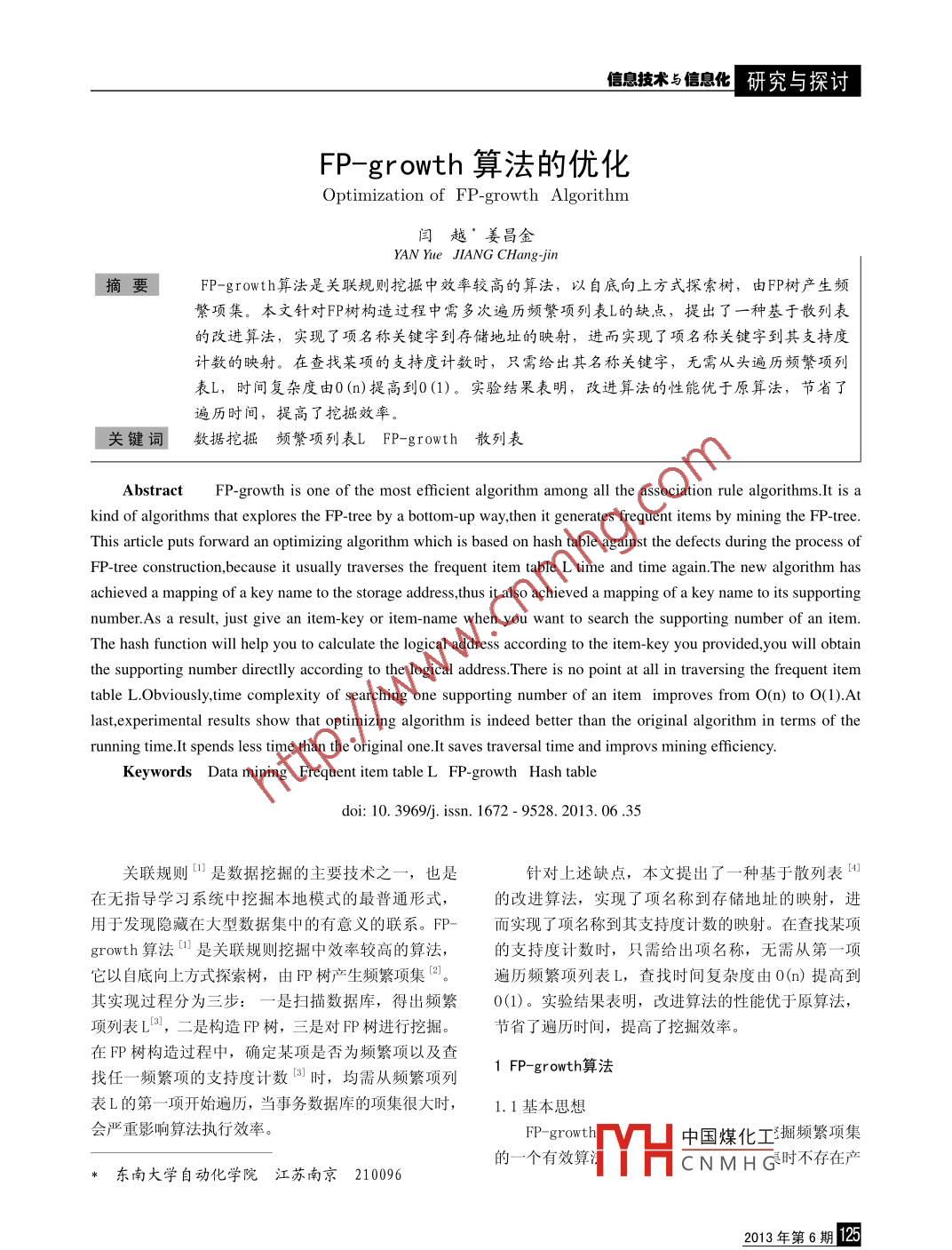 信息技術(shù)與信息化研究與探討FP-gr owth算法的優(yōu)化Optimization of FP-growth Algorithm閆越’姜昌金YAN Yue JIANG CHang-jin摘要FP-growth算法是關(guān)聯(lián)規(guī)則挖掘中效率較高的算法,以自底向.上方式探索樹,由PP樹產(chǎn)生頻繁項(xiàng)集。本文針對(duì)PP樹構(gòu)造過(guò)程中需多次遍歷頻繁項(xiàng)列表L的缺點(diǎn),提出了一種基于散列表的改進(jìn)算法,實(shí)現(xiàn)了項(xiàng)名稱關(guān)鍵字到存儲(chǔ)地址的映射,進(jìn)而實(shí)現(xiàn)了項(xiàng)名稱關(guān)鍵字到其支持度計(jì)數(shù)的映射。在查找某項(xiàng)的支持度計(jì)數(shù)時(shí),只需給出其名稱關(guān)鍵字,無(wú)需從頭遍歷頻繁項(xiàng)列表L,時(shí)間復(fù)雜度由0(n)提高到0(1)。實(shí)驗(yàn)結(jié)果表明,改進(jìn)算法的性能優(yōu)于原算法,節(jié)省了遍歷時(shí)間,提高了挖掘效率。關(guān)鍵詞數(shù)據(jù)挖掘頻繁項(xiàng)列表L FP-growth 散列表AbstractFP-growth is one of the most eficient algorithm among all the association rule algorithms.It is akind of algorithms that explores the FP-tree by a bottom-up way,then it generates frequent items by mining the FP-tree.This article puts forward an optimizing algorithm which is based on hash table against the defects during the process ofFP-tree consruction,because it usually traverses the frequent item table L time and time again.The new algorithm hasachieved a mapping of a key name to the storage address,thus it also achieved a mapping of a key name to its supportingnumber.As a result, just give an item-key or item-name when you want to search the supporting number of an item.The hash function will help you to calculate the logical address according to the item-key you provided,you will obtainthe supporting number directlly according to the logical address.There is no point at all in traversing the frequent itemtable L.Obviously,time complexity of searching one supporting number of an item improves from O(n) to 0(1).Atlast,experimental results show that optimizing algorithm is indeed better than the original algorithm in terms of the :running time.It spends less time than the original one.It saves traversal time and improvs mining efficiency.Keywords Data mining Frequent item table L FP-growth Hash tabledoi: 10. 3969/j. issn. 1672 - 9528. 2013. 06.35關(guān)聯(lián)規(guī)則[n是數(shù)據(jù)挖掘的主要技術(shù)之一,也是針對(duì)上述缺點(diǎn),本文提出了一種基于散列表4在無(wú)指導(dǎo)學(xué)習(xí)系統(tǒng)中挖掘本地模式的最普通形式,的改進(jìn)算法,實(shí)現(xiàn)了項(xiàng)名稱到存儲(chǔ)地址的映射,進(jìn)用于發(fā)現(xiàn)隱藏在大型數(shù)據(jù)集中的有意義的聯(lián)系。FP-而實(shí)現(xiàn)了項(xiàng)名稱到其支持度計(jì)數(shù)的映射。在查找某項(xiàng)growth算法1是關(guān)聯(lián)規(guī)則挖掘中效率較高的算法,的支持度計(jì)數(shù)時(shí),只需給出項(xiàng)名稱,無(wú)需從第一項(xiàng)它以自底向上方式探索樹,由FP樹產(chǎn)生頻繁項(xiàng)集(2。遍歷頻繁項(xiàng)列表L,查找時(shí)間復(fù)雜度由0(n)提高到其實(shí)現(xiàn)過(guò)程分為三步::是掃描數(shù)據(jù)庫(kù),得出頻繁0(1)。實(shí)驗(yàn)結(jié)果表明,改進(jìn)算法的性能優(yōu)于原算法,項(xiàng)列表L8,二是構(gòu)造FP樹,三是對(duì)FP樹進(jìn)行挖掘。節(jié)省了遍歷時(shí)間,提高了挖掘效率。在FP樹構(gòu)造過(guò)程中,確定某項(xiàng)是否為頻繁項(xiàng)以及查1 FP-growth算法找任一-頻繁項(xiàng)的支持度計(jì)數(shù)[3]時(shí),均需從頻繁項(xiàng)列表L的第一項(xiàng)開始遍歷,當(dāng)事務(wù)數(shù)據(jù)庫(kù)的項(xiàng)集很大時(shí),1. 1基本思想會(huì)嚴(yán)重影響算法執(zhí)行效率。FP-growth中國(guó)煤化工掘頻繁項(xiàng)集東南大學(xué)自動(dòng)化學(xué)院江蘇南京210096的一個(gè)有效算注YHCN MH G時(shí)不存在產(chǎn)2013年第6期125研究與探討信息技術(shù)與信息化生候選集的繁瑣過(guò)程,而是采取分治策略[5。首先,1.2.2.2構(gòu)造 FP-tree5)將提供頻繁項(xiàng)的數(shù)據(jù)庫(kù)壓縮到一棵頻繁模式樹(FP創(chuàng)建FP樹的根節(jié)點(diǎn),以“null”標(biāo)記它。對(duì)于樹) ,但仍保留項(xiàng)集關(guān)聯(lián)信息。然后,將壓縮后的數(shù)事務(wù)數(shù)據(jù)集中每個(gè)事務(wù)trans,設(shè)排序后頻繁項(xiàng)列表?yè)?jù)庫(kù)劃分成一組條件數(shù)據(jù)庫(kù),每個(gè)條件數(shù)據(jù)庫(kù)關(guān)聯(lián)一(即表3中每條事務(wù))為[p|P],其中,p是第-一個(gè)元素,個(gè)頻繁項(xiàng),并分別對(duì)每個(gè)條件數(shù)據(jù)庫(kù)進(jìn)行挖掘。而P是剩余元素的列表。對(duì)每個(gè)事務(wù)調(diào)用insert_1.2算法描述 .tree([p|P],T),其中T為相對(duì)父節(jié)點(diǎn)。該過(guò)程執(zhí)1.2.1 掃描數(shù)據(jù)庫(kù),得到頻繁項(xiàng)列表L .行情況如下:如果T有一個(gè)子女N,使得N. item-對(duì)事務(wù)數(shù)據(jù)集(格式見表1)進(jìn)行一次掃描,確name=p. item- name,則N的計(jì)數(shù)增加1;否則,創(chuàng)建定每個(gè)項(xiàng)的支持度計(jì)數(shù)。丟棄非頻繁項(xiàng),將頻繁項(xiàng)按個(gè)新節(jié)點(diǎn)N,將其計(jì)數(shù)設(shè)置為1, 鏈接到它的父節(jié)支持度遞減排序[2。之所以這樣排序,是因?yàn)镕P樹點(diǎn)T,并通過(guò)節(jié)點(diǎn)鏈結(jié)構(gòu)將其鏈接到具有相同item-中的每-一個(gè)路徑也是依照此