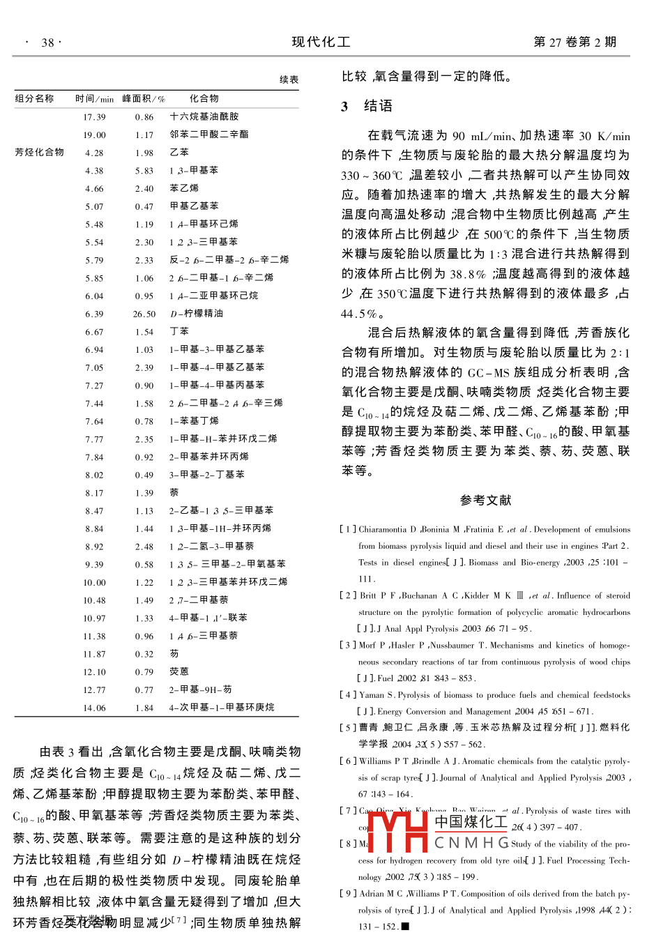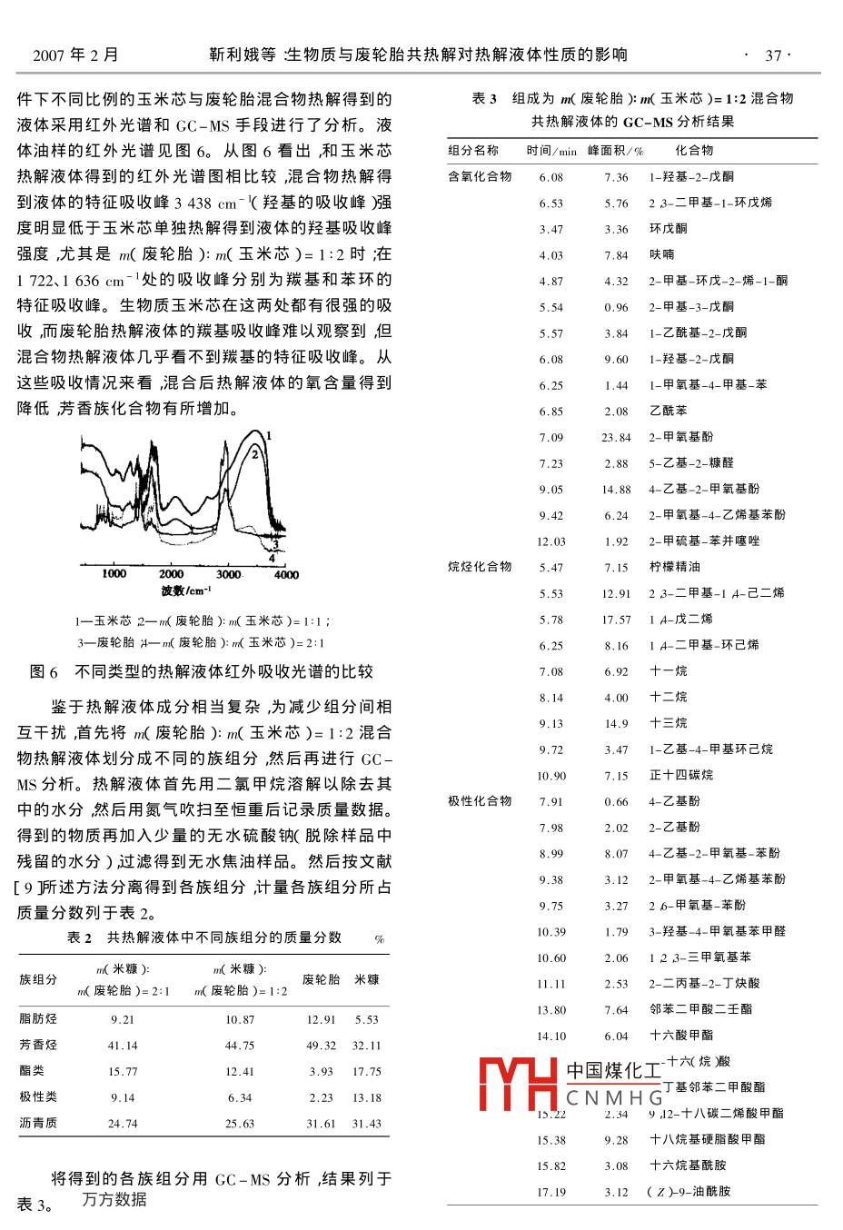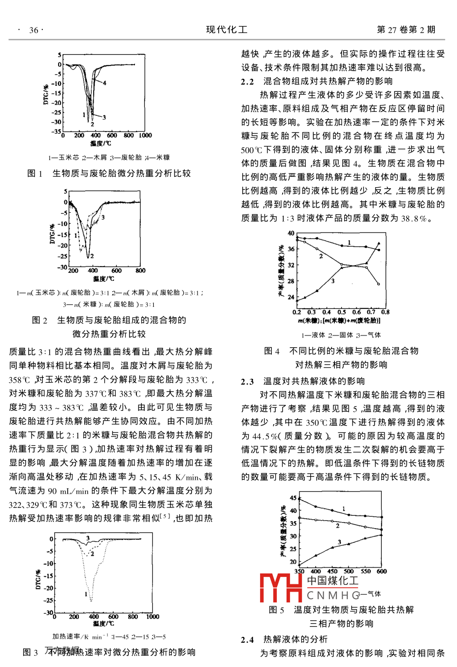 Feb.2007現(xiàn)代化工第27卷第2期Modern chemical industr2007年2月生物質與廢輪胎共熱解對熱解液體性質的影響靳利娥!高永強鮑衛(wèi)仁曹青21.太原理工大學煤科學與技術教育部和山西省重點實驗室山西太原0300242.太原理工大學化學工程與技術學院山西太原030024)摘要研究了影響生物質與廢輪胎共熱解得到的液體性質及組成的因素。結果表明生物質和廢輪胎最大熱分解溫度均發(fā)生在33~360℃℃共熱解能夠產(chǎn)生協(xié)同效應。隨著加熱速率的増大,大熱分解溫度逐漸向髙溫處移動泩生物質比例越低熱解得到的液體越多溫度越高得到的液體越少在350℃下進行共熱解得到的液體最多?;旌虾鬅峤庖后w的氧含量比生物質單獨熱解得到液體的氧含量有所降低芳香族化合物有所增加并分析了熱解液體的族組成,關鍵詞洪熱解生物質菠輪胎中圖分類號S216文獻標識碼:A文章編號m253-4320(20072-0034-05Influence of co-pyrolysis for the mixture of biomass and waste tires on pyrolyticpropertJIN Li-e, GA0 Yong-qiang, BAO Wei-ren, CA0 Qing2(I Key Laboratory of Coal Science and Technology of the Ministry of Education and Shanxi Province Taiyuan Universityof Technology Taiyuan 030024, China; 2. Institute of Chemical Engineering Taiyuan University of TechnologyTaiyuan 030024, ChinaAbstract: The factors that influence the liquid product obtained from co-pyrolysis of biomass and waste tires and itscomposition are studied. Results show that the maximum thermal decomposition of biomass and waste tires is both at 330360C which can predict a synergistic effect. With the increment of heating rate the maximum temperature of thermdecomposition moves to the higher region a lower proportion of biomass can bring a higher yield of liquid product and a highersmaller vield of350C). The amount of oxygen is reduced and the aromatic compounds increase comparing to the liquid obtained whenpyrolyzed. At last the fraction analy生物質作為能源利用受到國內(nèi)外高度重燃料以節(jié)約煤、石油等化石類物質的研究一直在進視1-4生物質熱解產(chǎn)生的液體主要是含氧較高的行δ-8。雖然廢輪胎熱解得到的燃料熱值較高但有機物如苯酚、甲酚及醚類等5但這種液體直接因其所含多環(huán)芳烴化合物較高燃燒性能并不理想用作燃料尚存在一些問題有待解決如氧含量較高、而且熱解過程會對周圍作物及生態(tài)環(huán)境產(chǎn)生嚴重污熱值較低及點火時間延遲、對發(fā)動機有嚴重腐蝕等。染而難以推廣。鑒于這2類物質單獨熱解都存在各高壓條件下加氬、催化脫氧熱解雖可改善液體燃料自的缺點筆者通過研究生物質與廢輪胎的共熱解的性能用于機動車燃料但因對設備、技術操作條件探索其新的利用途徑此方面工作鮮見文獻報道要求較高以及此條件下催化劑容易發(fā)生積炭、堵塞等現(xiàn)象得到的燃料其成本難以同其他液體燃料相1實驗部分競爭從而制約該技術的發(fā)展。廢輪胎是另一類可1.1中國煤化工再生的資源目前在西方發(fā)達國家的廢輪胎利用率CNMHG郊木料加工廠的下腳不足25%而在國內(nèi)不足30%探索廢舊輪胎作為料玉米芯、米糠來自于太原近郊農(nóng)業(yè)加工廠。廢輪收稿日期2006-10-25基金項目國家自然科學基金資助項目(50576062)山西省自然科學基金資助項目(2006011020)作者簡介有藏據(jù)4-)女博土生副教授主要從事化學工程與技術的研究1im016cm2007年2月靳利娥等生物質與廢輪胎共熱解對熱解液體性質的影響胎購于青島綠葉公司。所有原料均需烘干、粉碎、過GDX-502的雙柱氮氣為載氣。其中用熱重法(TCD篩(60目)其工業(yè)分析與元素分析見表1。檢測)分析H2、CH4、CO、CO2江紅外吸收光譜(FID檢表1原料的工業(yè)分析和元素分析測分析C2H、C2H2、C3H、C3H、CH4通過外標準曲原料文業(yè)分析質量分數(shù))%元素分標質量分數(shù))%線進行定量;液體用紅外光譜儀(Bio-IR及色質聯(lián)固定碳揮發(fā)分灰分水分CH0SN用儀GC-Ms(HP-6890/5973)分析熱重分析采用德廢輪眙26.5066.904.801.8082.107.507.400.671.66國 NETZSCH-STA409C熱重分析儀。玉米芯17.1677.671.533.6447.634.9137.720.140.84木屑14.5781.030.593.8150.405.4944.080.010.022結果與討論米糠18.9570.557.203.3049.694.9244.700.050.422.1熱重分析對不同種類的生物質、廢輪胎及其混合物進行1.2實驗裝置及過程了熱重分析考察生物質與廢輪胎2種物料之間能實驗裝置下部為熱解反應區(qū),上部為脫硫區(qū)。否產(chǎn)生協(xié)同效應。在載氣流速為90mL/min、加熱速加熱功率分別為2.2、0.8kW由程序溫控儀控制溫率30K/min的條件下生物質、廢輪胎及混合物的度。熱解過程產(chǎn)生的氣體經(jīng)冷凝管冷凝收集在燒瓶失重過程分別見圖1和圖2。從圖1可以看出盡管內(nèi)未冷凝下來的氣體通過氣囊收集后分析。實驗生物質種類不同但和廢輪胎失重的起始溫度和終時先將約300g原料放入下部反應器,上部加入氧點溫度相近均在178~521℃其最大熱分解的溫度化鋅后連接好各接口檢驗密封性。然后通入氮氣相差不大。尤其是木屑、玉米芯的第2個最大熱分〔流速為φom/min),開始加熱升溫。升溫速率為解溫度(360℃)幾乎和廢輪胎的最大熱分解溫度30K/min其終點溫度分別為350、400、450、500、550(361℃湩合而米糠的最大熱分解溫度為330.4℃。600℃加熱至無氣體產(chǎn)生為止,般需3~4h為考察共熱解相互產(chǎn)生的影響對生物質和廢輪胎1.3樣品分析與表征不同比例質量比1:1、1:2、3:1)的混合物熱重行為氣體用氣相色譜儀GC900-DC
