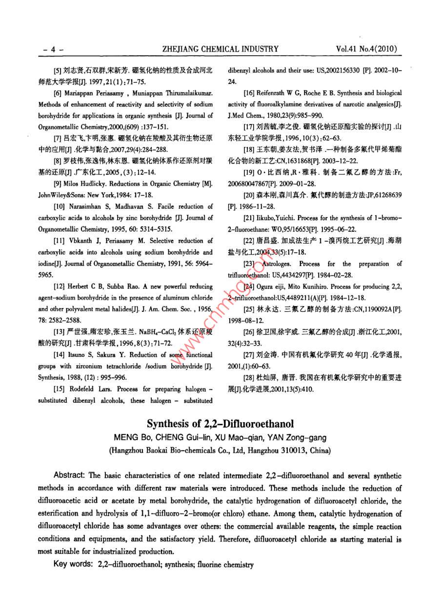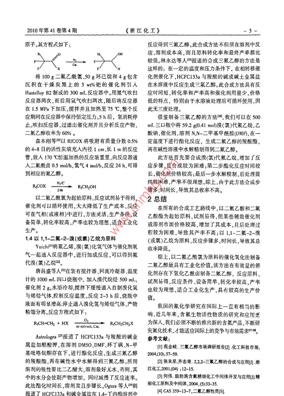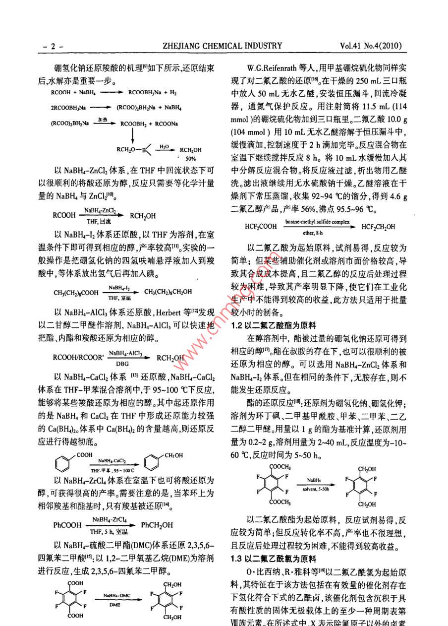 2010年第41卷第4期《浙江化工》1-文章編號:064184204-01-04化工二氟乙醇的合成方法孟博1程桂林1許茂乾12閻宗剛1(1杭州寶凱生物化學品有限公司,浙江杭州310013;2浙江科技學院,浙江杭州310023摘要:介紹了脂肪族含氟中間體二氟乙醇的基本特性,并按照其原料不同,簡述了幾種基本的合成方法:以二氟乙酸或二氟乙酸酯為原料的金屬硼氫化物還原法、以二氟乙酰氯為原料的催化氫化法、以1,1-二氟-2-溴(或氯)乙烷為原料的酯化水解法。中,以二氟乙酰氯為起始原料,反應試劑易得,條件設備簡單,產(chǎn)率較為理想,最為適合工業(yè)化生產(chǎn)。關鍵詞:二氟乙醇;合成;氟化學0引言學家與氟科研單位繼續(xù)努力,加速發(fā)展我國的氟化近年來,我國在氟化工開發(fā)與生產(chǎn)上已經(jīng)初具學事業(yè)。規(guī)模,有機氟化學在原子能工業(yè)、火箭和宇航技術、1二氟乙醇的合成醫(yī)藥、農(nóng)藥等諸多領域中都有及其重要的應用,一二氟乙醇含有二氟甲基的特殊結構,因此使其直表現(xiàn)出蓬勃發(fā)展的趨勢。但我國主要研究與生產(chǎn)性質不同于其他醇類可以參與多種有機合成反應,的方向多集中在芳香族含氟中間體的開發(fā)與生產(chǎn)上尤其用于合成含氟的醫(yī)藥、農(nóng)藥和染料,國內外對其面,而對脂肪族含氟中間體關注較少。這些脂肪族中的需求逐漸增多,已成為含氟精細化學品的重要中間體主要用于合成表面活性劑、織物整理劑、新型醫(yī)間體之一。二氟乙醇的合成路線按照其原料不同,主藥和農(nóng)藥合成原料及溶劑、新材料合成原料與助劑,要有以下幾種方法:以二氟乙酸或二氟乙酸酯為原非常具有開發(fā)前景,如三氟乙醇三氟乙醛、三氟料的金屬硼氫化物還原法、以二氟乙酰氯為原料的乙酸、六氟丁醇、六氟丙酮等等,均為高附加值、發(fā)展催化氫化法、以1,1-二氟-2-溴(或氯)乙烷為原料前景良好的基礎含氟有機中間體,許多脂肪族含氟的酯化水解法。中間體及其下游產(chǎn)品已成為市場新寵1.1以二氟乙酸為原料本文主要介紹脂肪族含氟中間體一二氟乙醇的在現(xiàn)代有機合成中,金屬氫化物是一類重要的一些合成方法。2,2-二氟乙醇常溫下為無色液體,沸試劑,其中最常用的就是硼氫化鈉(NaBH NaBH點96℃,熔點-28.2℃,相對密度171.3084,折射率用于有機物的還原反應條件溫和,可以很容易的將1.338,酸性與苯酚相當,溶于水、酸、乙醇、乙醚等溶醛或酮還原為醇,在質子溶劑中將亞胺或亞胺鹽還劑,有毒,性質穩(wěn)定。該醇是重要的含氟有機合成中原為胺,經(jīng)過修飾的硼氫化鈉還可以還原羧酸、羧間體用作殺蟲劑和除草劑等國內現(xiàn)在對二氟乙酸酯胺基化合物和猜等硼氫化鈉還原法成本適醇的開發(fā)與研究仍處于初步水平,還需要我國氟化中用途十分廣泛。011收稿日期:2009-11-0作者簡介:孟博(1983-),女遼寧省錦州市人,從事氟精細化學品研究開發(fā)工作。2- ZHEJIANG CHEMICAL INDUSTRYol.41no.4(2010)硼氫化鈉還原羧酸的機理如下所示還原結束wg.Reifenrath等人,用甲基硼烷硫化物同樣實后水解亦是重要一步?,F(xiàn)了對二氟乙酸的還原在干燥的250mL三口瓶 RCOOH+nabh RCOOBHna+2中放入50mL無水乙醚,安裝恒壓漏斗,回流冷凝 2RCOOBH)Na-(RCOO)BH2Na NaBH器,通氮氣保護反應。用注射筒將11.5mL(114 (RCOO)BH2Na RCOOBH2 +RCOONammol)的硼烷硫化物加到三口瓶里。二氟乙酸10.0g(104mmol)用10mL無水乙醚溶解于恒壓漏斗中, RCH2O-BHRCH;OH緩慢滴加,控制速度于2h滴加完畢。反應混合物在50%室溫下繼續(xù)攪拌反應8h。將10mL水緩慢加入其以NaBH4-ZnCl2體系,在THF中回流狀態(tài)下可中分解反應混合物將反應液過濾,析出物用乙醚以很順利的將酸還原為醇,反應只需要等化學計量洗濾出液繼續(xù)用無水硫酸鈉干燥乙醚溶液在干量的NaBH4與ZnCl2。燥劑下常壓蒸餾,收集92~94℃的餾分,得到4.6g RCOOH NaBH,,OH二氟乙醇產(chǎn)品,產(chǎn)率56%,沸點95.5~96℃。THF回流 HCFCOOH borane-methy sulfide complex HCF,CH,OH以NaBH4-12體系還原酸,以THF為溶劑,在室 ether,8h溫條件下即可得到相應的醇,產(chǎn)率較高實驗的一以二氟乙酸為起始原料,試劑易得,反應較為般操作是把硼氫化鈉的四氫呋喃懸浮液加入到羧簡單;但某些輔助催化劑或溶劑市面價格較高,導酸中,等體系放出氫氣后再加入碘。致其合成成本提高,且二氟乙醇的反應后處理過程 NaBR,H(C2COOHCH(Ch2)aCH2OH較為困難,導致其產(chǎn)率明顯下降,使它們在工業(yè)化THF,室溫生產(chǎn)中不能得到較高的收益,此方法只適用于批量以NaBH4-ACl3體系還原酸, Herbert等發(fā)現(xiàn)較小時的制備。以二甘醇二甲醚作溶劑,NaBH4-ACl3可以快速地1.2以二氟乙酸酯為原料把酯、內酯和羧酸還原為相應的醇。在醇溶劑中,酯被過量的硼氫化鈉還原可得到 RCOOH/RCOOR NaBH-aicl3rch2OH相應的醇酯在叔胺的存在下,也可以很順利的被 DBG還原為相應的醇。可以選用NaBH4-ZnCl2體系和以Nah4-cal2體系還原酸,abh4-CaCl2 NaBH--l2體系但在相同的條件下,無胺存在,則不體系在THF-甲苯混合溶劑中,于95-100℃下反應,能發(fā)生還原反應。能夠將某些羧酸還原為相應的醇。其中起還原作用酯的還原反應還原劑為硼氫化鈉、硼氫化鉀;的是NaBH4和CaCl2在THF中形成還原能力較強溶劑為環(huán)丁砜、二甲基甲酰胺、甲苯、二甲苯、二乙的Ca(BH4)2體系中Ca(BH42的含量越高,則還原反二醇二甲醚用量以1g的酯為基準計算,還原劑用應進