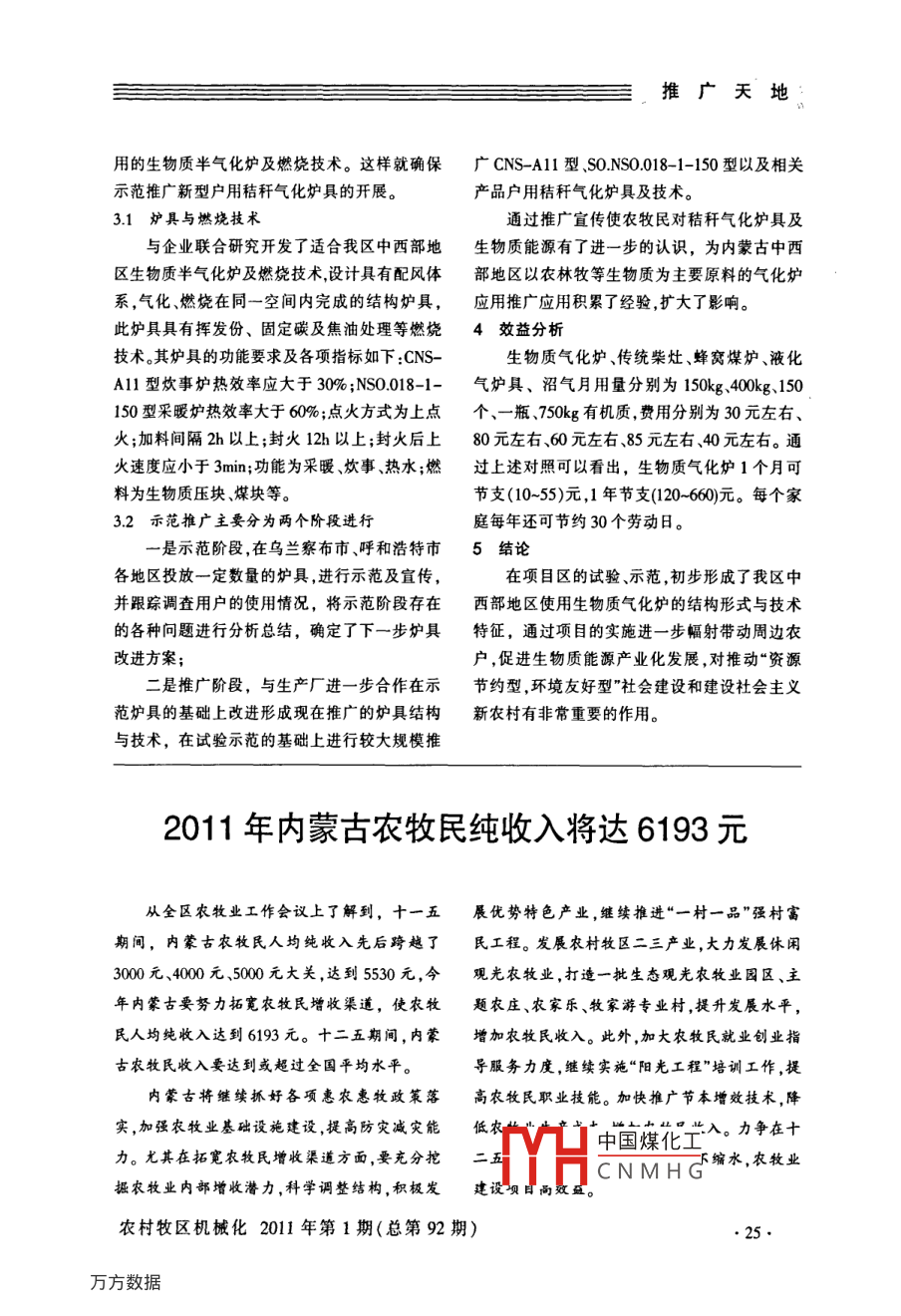 推廣天地生物質氣化爐示范推廣于波' 牛世平21.內蒙古農牧業(yè)機械技術推廣站2.巴 彥淖爾市農機化研究所[摘要]本文簡要介紹了生物質能及其他斷型能源,戶用生物質氣化爐結構特點及技術參數(shù),以及在我區(qū)的試驗示范推廣情況。[關鍵詞]生物質能 氣化爐 示范推廣1生物質能一類是生物質半氣化爐。在2009中國民用爐具生物質能是一種新興能源又稱非常規(guī)能研討會上多數(shù)專家學者及生產廠家代表認為由源。新興能源是指傳統(tǒng)能源之外的各種能源形于生物質完全氣化爐結構相對較復雜、制造成式,如太陽能、地熱能、風能、海洋能、生物質能本較高,燃燒時產生的煙及焦油不能完全燃燒,和核聚變能等。這些剛開始開發(fā)利用或正在積釋放在屋內對人身健康有一定危害,不適宜推極研究、有待推廣的能源是我國“十二五”規(guī)范廣應用。而生物質半氣化爐由于結構簡單,成本中的重點發(fā)展領域。生物質能和風能、太陽能一低,對揮發(fā)份.固定碳的燃燒以及產生焦油問題樣是可再生能源,取之不盡、用之不竭。我國每基本得到解決,有利于推廣應用,因此生物質半年可利用的生物質量約有6億多t,相當于4億氣化爐將 會是今后發(fā)展方向。t標煤。將生物質加工成具有得高密度的成型燃3示范推廣料是一種新型的利用方式,實現(xiàn)清潔燃燒,成為戶用秸稈氣化爐具示范推廣是內蒙古科技新型能源,完全可以代替煤炭和石油,應用于商廳 2009年招標下達的應用技術研究與開發(fā)資業(yè)場所和居民家庭的供暖、炊事和洗浴等。生物金項目,項目主持單位為內蒙古自治區(qū)農牧業(yè)機質能是國際上公認的綠色、無污染、可再生的新械技術推廣站。項目主要實施地區(qū)為呼和浩特型能源。近年來隨著環(huán)保、節(jié)能的嚴格要求,生市、烏蘭察布市、巴彥淖爾市等。項目主持單位物質燃料開始被人們廣泛關注和接受,進入應根據項目合同書要求,制定項目實施方案,并組用時期,發(fā)揮其獨有的優(yōu)勢,成為一種重要的能織進行項目的實施。能否順利完成示范推廣新源補充和替代。型戶用秸稈氣化爐具的目標任務,爐具的選擇2氣化爐至關重要。通過對全國幾十家生產的爐具進行伴隨著生物質能的開發(fā)利用,生物質爐具調查與了解, 并結合我區(qū)中西部地區(qū)的實際情研究開發(fā)也運用而生,生物質爐具研究開發(fā)在況司生產的爐具,我國仍屬起步階段。我國現(xiàn)階段民用生物質爐與我YH中國煤化工一步的協(xié)商與.具可分為兩大類:-類是生物質完全汽化爐,另合作C N MH. G中西部地區(qū)使●24●農村牧區(qū)機械化2011 年第1期(總第92期)推廣天地用的生物質半氣化爐及燃燒技術。這樣就確保廣CNS- A11型、SO.NS0.018- 1-150型以及相關示范推廣新型戶用秸稈氣化爐具的開展。產品戶用秸稈氣化爐具及技術。3.1 爐具與燃燒技術通過推廣宣傳使農牧民對秸稈氣化爐具及與企業(yè)聯(lián)合研究開發(fā)了適合我區(qū)中西部地生物質能源有了進一步的認識,為內蒙古中西區(qū)生物質半氣化爐及燃燒技術,設計具有配風體部地區(qū)以農林牧等生物質為主要原料的氣化爐系,氣化燃燒在同一空間內完成的結構爐具,應用推廣 應用積累了經驗,擴大了影響。此爐具具有揮發(fā)份、固定碳及焦油處理等燃燒4效益分析技術。其爐具的功能要求及各項指標如下:CNS-生物質氣化爐、傳統(tǒng)柴灶蜂窩煤爐、液化Al1型炊事爐熱效率應大于30% ;NS0.018-1-氣爐具、 沼氣月用量分別為150kg、400kg.150150型采暖爐熱效率大于60%;點火方式為上點.個、-瓶.750kg有機質,費用分別為30元左右、火;加料間隔2h以上;封火12h以上;封火后上80元左右、60元左右、85元左右、40元左右。通火速度應小于3min;功能為采暖.炊事熱水;燃過上述對照可以看出,生物質氣化爐1個月可料為生物質壓塊、煤塊等。節(jié)支(10~55)元,1年節(jié)支(120-660)元。每個家3.2示范推廣 主要分為兩個階段進行庭每年還可節(jié)約30個勞動日。一是示范階段,在烏蘭察布市呼和浩特市5結論.各地區(qū)投放一定數(shù)量的爐具,進行示范及宣傳,在項目區(qū)的試驗示范,初步形成了我區(qū)中并跟蹤調查用戶的使用情況,將示范階段存在西部地區(qū)使用生物質氣化爐的結構形式與技術的各種問題進行分析總結,確定了下一步爐具特征,通過項目的實施進一步幅射帶動周邊農改進方案;戶,促進生物質能源產業(yè)化發(fā)展,對推動“資源二是推廣階段,與生產廠進-步合作在示節(jié)約型,環(huán)境友好型"杜會建設和建設社會主義范爐具的基礎上改進形成現(xiàn)在推廣的爐具結構新農村有非常重要的作用。與技術,在試驗示范的基礎上進行較大規(guī)模推2011年內蒙古農牧民純收入將達6193元從全區(qū)農牧業(yè)工作會議上了解到,十一五展優(yōu)勢特色產業(yè),繼續(xù)推進“一村一品”強 村富期間,內蒙古農牧民人均純收入先后跨越了民工程。 發(fā)展農村牧區(qū)二三產業(yè),大力發(fā)展休閑3000元、4000元、500元大關,達到5530元,今觀光農牧業(yè) ,打造一批生態(tài)觀光農牧業(yè)園區(qū)、主年內蒙古要努力拓寬農牧民增收渠道,使農牧題農莊、農家樂、牧家游專業(yè)村,提升發(fā)展水平,民人均純收入達到6193元。十二五期間,內蒙增加農牧民收入。此外,加大農牧民就業