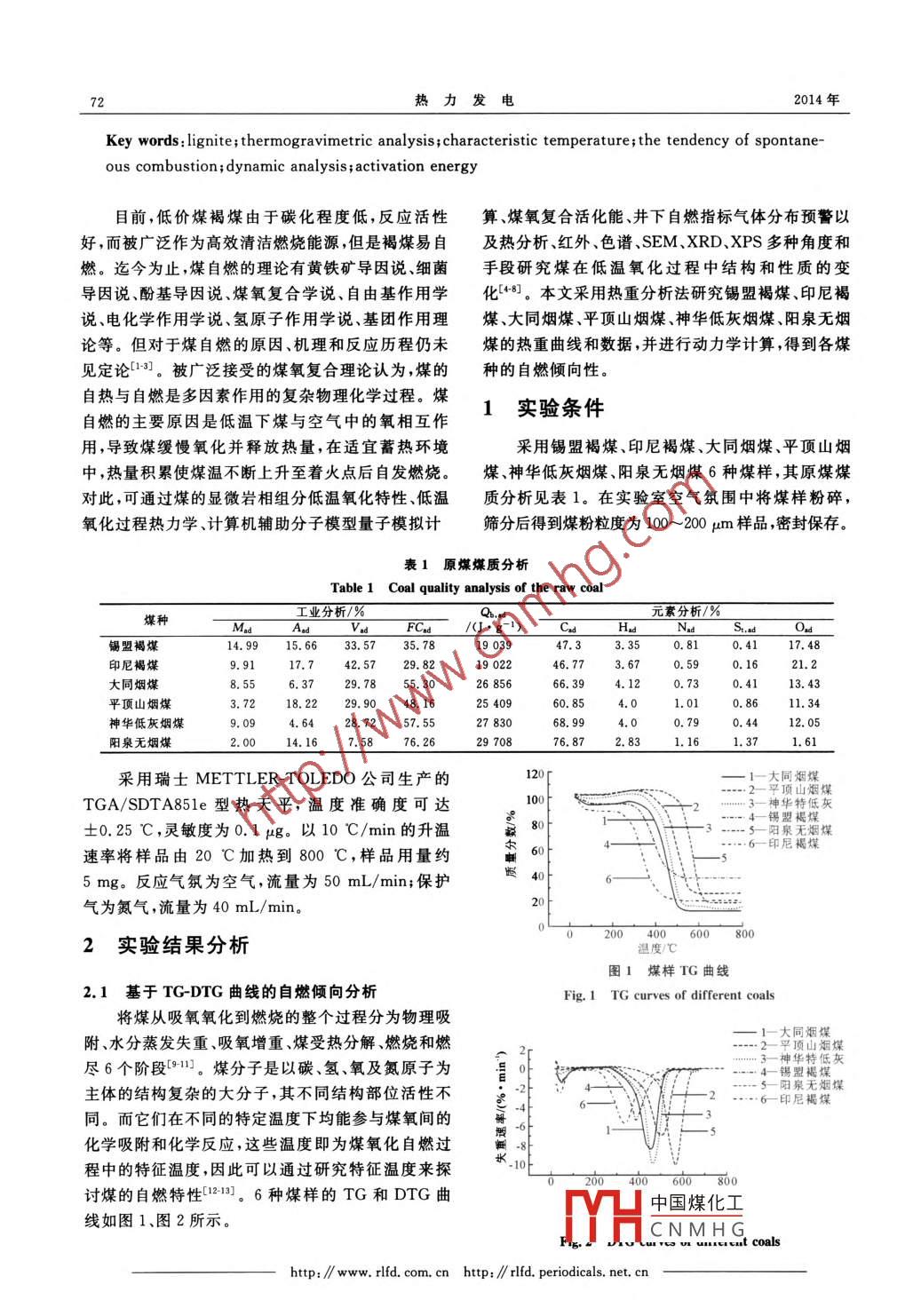 第43卷第6期熱力發(fā)電Vol 43 No 62014年6月THERMAL POWER GENERATIONJun.2014褐堞旬燃特性熱重實(shí)驗(yàn)及動(dòng)力學(xué)分析張斌1,劉建忠,趙衛(wèi)東2,袁紹1,王智化,周俊虎1,岑可法1(1.浙江大學(xué)能源清潔利用國家重點(diǎn)實(shí)驗(yàn)室,淅江杭州310027;2.西安熱工研究院有限公司,陜西西安710032)[摘要]對(duì)錫盟褐煤和印尼褐煤進(jìn)行熱重實(shí)驗(yàn),并與大同煙煤、平頂山煙煤、神華低灰煙煤、陽泉無煙煤等煤樣進(jìn)行了對(duì)比。通過分析熱重曲線,將煤從吸氧氧化到燃燒的整個(gè)過程分為物理吸附、水分蒸發(fā)失重、吸氧增重、煤受熱分解、燃燒和燃盡6個(gè)階段,并得到各階段的特征溫度點(diǎn)。結(jié)果表明,2種褐煤的自燃傾向明顯大于其他4種煙煤和無煙煤。通過 Coats-Redfern積分法研究煤樣的氧化燃燒動(dòng)力學(xué)特性,計(jì)算煤樣的活化能,得到6種煤的氧化過程屬于一級(jí)化學(xué)反應(yīng),且褐煤自燃傾向性較強(qiáng);煤樣粒度越小,褐煤自燃傾向性越強(qiáng);隨著氧氣濃度的增大,煤樣更易自燃。[關(guān)鍵詞]褐煤;熱重實(shí)驗(yàn);特征溫度;自燃傾向性;動(dòng)力學(xué)分析;活化能[中圖分類號(hào)]TQ530[文獻(xiàn)標(biāo)識(shí)碼]A[文章編號(hào)]1002-3364(2014)06-007106[DOⅠ編號(hào)]10.3969/issn.1002-3364.2014.06.071Thermogravimetric experiments and dynamic analysison spontaneous combustion characteristics of ligniteZHANG Bin, LIU Jianzhong, ZHAO Weidong, YUAN Shao'WANG Zhihua, ZHOU Junhu, CEN Kefal(1. State Key Laboratory of Clean Energy Utilization, Zhejiang University, Hangzhou 310027,China2. Xian Thermal Power Research Institute Co. Ltd Xian 710032, China)Abstract: Thermogravimetric experiments on Ximeng lignite and Indonesia lignite were carriedout, and the results were compared with that of the Datong bituminous coal, Pingdingshan bituminous coal, Shenhua low ash bituminous coal and Yangquan anthracite. By analyzing the Tg andDTG curves, the whole process from coal oxidation to coal combustion could be divided into sixstages: physical adsorption, water evaporation with losing weight, absorption of oxygen with in-creasing weight, thermal decomposition, combustion and burning out. The characteristic temperatures of each stage were obtained. The results show that, the tendency of spontaneous combustionf the above two lignite was significantly obvious than that of the other four bituminous coal andanthracite Coats-Redfern integral method was used to analyze the samples oxidative combustiondynamic characteristics. Moreover, activation energy of the six coal samples was calculated to ana-lyze the tendency of spontaneous combustion of coal. The calculation results show that, the oxida-tion process of the six coal samples belonged to the first-order reaction, and the tendency of spontaneous combustion of the two lignite coal was greater. The tendency of spontaneous combustionof Ximeng lignite was affected by particle size and oxygen density. analysis shows that: the smal-ler the particle size, the stronger the tendency of spontaneous combustion; the greater the oxygendensity, the stronger the tendency of spontaneous combustion in gener收稿日期:201306-05基金項(xiàng)目:國家重點(diǎn)基礎(chǔ)研究發(fā)展計(jì)劃基金資助項(xiàng)目(973計(jì)劃)(2012CB214906)作者簡(jiǎn)介:張斌(1989—),男,浙江溫州人,碩士研究生,研讀方向?yàn)闊崮芄こ蘃中國煤化工CNMHGE-mail: zhangbin8959@163. cor熱力發(fā)電2014年Key words: lignite; thermogravimetric analysis; characteristic temperature; the tendency of spontaneous combustion; dynamic analysis; activation energy目前,低價(jià)煤褐煤由于碳化程度低,反應(yīng)活性算、煤氧復(fù)合活化能、井下自燃指標(biāo)氣體分布預(yù)警以好,而被廣泛作為高效清潔燃燒能源,但是褐煤易自及熱分析、紅外、色譜、SEM、XRD、XPS多種角度和燃。迄今為止,煤自燃的理論有黃鐵礦導(dǎo)因說、細(xì)菌手段研究煤在低溫氧化過程中結(jié)構(gòu)和性質(zhì)的變導(dǎo)因說、酚基導(dǎo)因說、煤氧復(fù)合學(xué)說、自由基作用學(xué)化4。本文采用熱重分析法研究錫盟褐煤、印尼褐說、電化學(xué)作用學(xué)說、氫原子作用學(xué)說、基團(tuán)作用理煤、大同煙煤、平頂山煙煤、神華低灰煙煤、陽泉無煙論等。但對(duì)于煤自燃的原因、機(jī)理和反應(yīng)歷程仍未煤的熱重曲線和數(shù)據(jù),并進(jìn)行動(dòng)力學(xué)計(jì)算,得到各煤見定論[13。被廣泛接受的煤氧復(fù)合理論認(rèn)為,煤的種的自燃傾向性自熱與自燃是多因素作用的復(fù)雜物理化學(xué)過程。煤自燃的主要原因是低溫下煤與空氣中的氧相互作1實(shí)驗(yàn)條件用,導(dǎo)致煤緩慢氧化并釋放熱量,在適宜蓄熱環(huán)境采用錫盟褐煤、印尼褐煤、大同煙煤、平頂山煙中,熱量積累使煤溫不斷上升至著火點(diǎn)后自發(fā)燃燒。煤、神華低灰煙煤、陽泉無煙煤δ種煤樣,其原煤煤對(duì)此,可通過煤的顯微巖相組分低溫氧化特性、低溫質(zhì)分析見表1。在實(shí)驗(yàn)室空氣氛圍中將煤樣粉碎,氧化過程熱力學(xué)、計(jì)算機(jī)輔助分子模型量子模擬計(jì)篩分后得到煤粉粒度為100~200m樣品,密封保存。表1原煤煤質(zhì)分析Table 1 Coal quality analysis of the raw coal工業(yè)分析/%煤種/(J·g-1)錫盟褐煤14.9915.6633.5735.781903947.33.350.810.4117.48印尼褐煤9.9117.742.5729.8246.773.67大同煙煤8.550.41平頂山煙煤9048.1625409神華低灰煙煤9.0928.7257.552783068.990.790.4412.05陽泉無煙煤2.0014.1676.2676.871.161.37采用