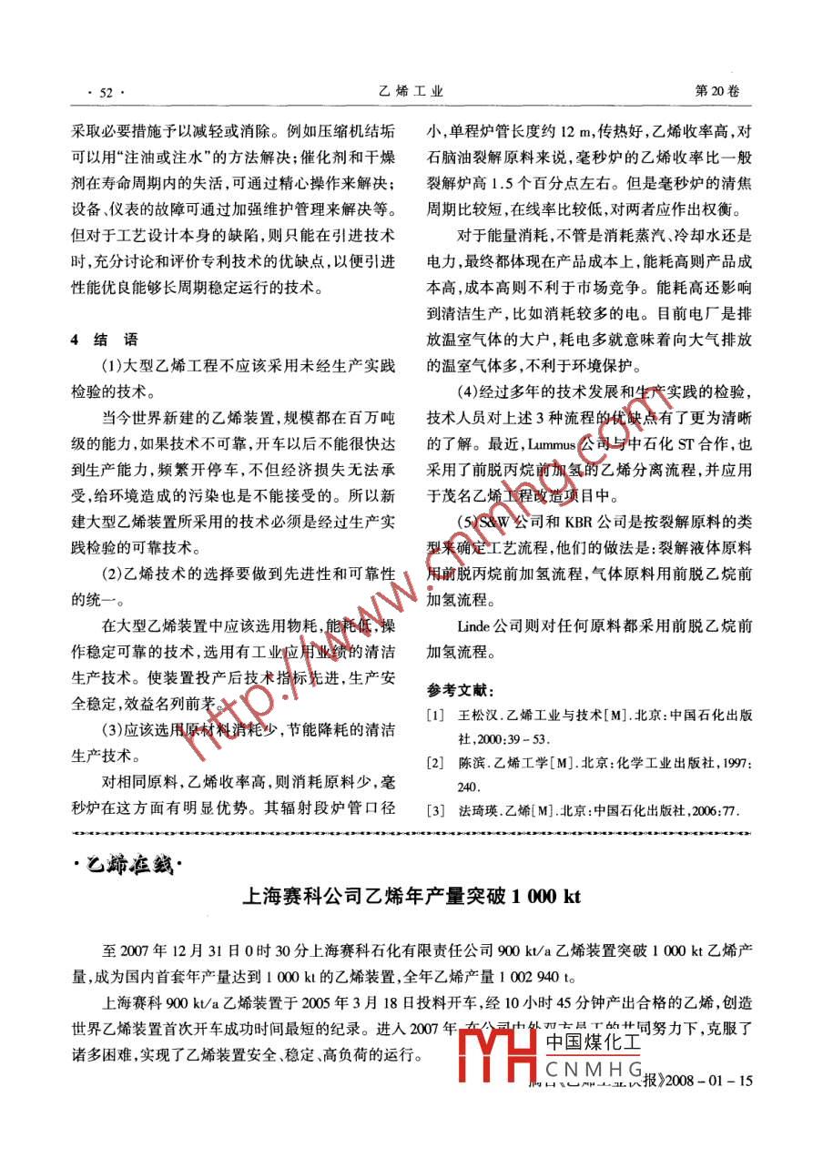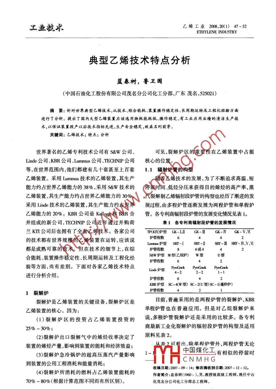 工業(yè)技術(shù).乙烯工業(yè)2008,20(1) 47~52ETHYLENE INDUSTRY典型乙烯技術(shù)特點分析藍春樹,魯衛(wèi)國(中國石油化工股份有限公司茂名分公司化工分部,廣東茂名,525021)摘要: 針對世界典型乙烯技術(shù),從技術(shù)、綜合能耗、裝置操作穩(wěn)定性、長周期運轉(zhuǎn)及工程化經(jīng)驗方面進行了分析。提出了國內(nèi)大型乙烯裝置應(yīng)該選用物耗能耗低、操作穩(wěn)定、有工業(yè)應(yīng)用業(yè)績的清潔生產(chǎn)技術(shù),以保證裝置投產(chǎn)以后技術(shù)指標先進,生產(chǎn)安全穩(wěn)定,效益名列前茅。關(guān)鍵詞:乙烯技術(shù);特點;分析世界著名的乙烯專利技術(shù)公司有S&W公司、可見,裂解爐區(qū)的重要性在乙烯裝置中占據(jù)Linde 公司、KBR公司、JLummus公司、TECHNIP公司.核心的位置。等,在世界范圍內(nèi),他們都建有幾十套甚至上百套1.1輻射爐管的構(gòu)型乙烯裝置。采用Lummus技術(shù)的乙烯裝置,其生產(chǎn)隨著乙烯技術(shù)的發(fā)展,為了不斷追求高溫、短能力約占世界乙烯能力的38% ,采用S&W技術(shù)的停留時間、低烴分壓來獲得目的烯烴的高產(chǎn)率,蒸乙烯裝置,其生產(chǎn)能力約占世界乙烯能力的30%。汽裂 解制乙烯輻射段爐管的構(gòu)型也經(jīng)歷了漸進的發(fā)采用Linde技術(shù)的乙烯裝置,其生產(chǎn)能力約占世界展過程,由多程爐管逐漸發(fā)展為兩程爐管和單程爐乙烯能力的20%。KBR公司是Kellogg 和B&R合管。各專利商輻射段爐管的發(fā)展變化情況見表1。并組成的新公司,TECHNIP公司近年通過并購荷表1各專利商輻射段爐管的發(fā)展情況蘭KTI公司后也擁有了全套乙烯技術(shù)。各家公司TP(KI)爐型CK-I1I CK-CK-IV CK- V,M的技術(shù)都有世界規(guī)模的乙烯裝置在運轉(zhuǎn),應(yīng)該說Lummus爐型SRT-I爐管程數(shù)6SRT-ISRrT-II SRT-IN,V,MI都是成熟可靠的技術(shù)。但在技術(shù)的細節(jié)上,在綜86或4合能耗裝置操作穩(wěn)定性、長周期運轉(zhuǎn)及工程化經(jīng)S&W爐型M型(乙烷爐) W 型U型驗等方面,尚有差別。下面對各家乙烯技術(shù)特點Linde 爐型PyoCnackPyoCackProCnak4-2進行分析介紹。KBR爐型SC-4(W型) SC-2(U型)SC- 1(毫秒爐)1裂解爐裂解爐是乙烯裝置的關(guān)鍵設(shè)備,裂解爐區(qū)是目前,普遍采用的是兩程爐管的裂解爐,KBR單程爐管也在普遍應(yīng)用。但是對乙烷裂解爐來乙烯裝置的核心。因為:(1)裂解爐區(qū)的投資占乙烯裝置投資的說,多程爐管裂解爐還是采用的比較多。各專利商最新工業(yè)化裂解爐的輻射段爐管的構(gòu)型及適用25% ~ 30%;(2)裂解爐出口裂解氣中的烯烴收率決定了原料見表2。裝置的烯烴產(chǎn)量,影響到裝置的能耗和經(jīng)濟效益;.從表2可看出.除單程爐管外,兩程爐管無論(3)裂解爐急冷鍋爐的超高壓蒸汽產(chǎn)量影響中國煤化工有相似的停留時YHCNMHG到裝置的公用工程消耗和能量消耗;收稿日期:2007 -09- 14;修改稿收到日期:2007- 12-12。(4)裂解爐所消耗的燃料占乙烯裝置能耗的作者簡介:藍春樹(1960- ),男,教授級高級工程師,現(xiàn)任中石70% ~ 80% (根據(jù)計算范圍不同而有所區(qū)別)?;止净し植靠偣こ處?。.●48.乙烯工業(yè)第20卷間。因此,僅從這一點考慮,這3種兩程輻射段爐油,氣體原料的資源很少;而中東地區(qū),大部分裂管基本具有相似的性能。解原料為氣體原料或輕石腦油,因此,我國與中東表2各裂解爐輻射段爐管構(gòu)型及 適用原料地區(qū)選擇裂解爐時應(yīng)有差異。爐管構(gòu)型單程爐管兩程爐管多程爐管目前,幾家專利商的裂解爐無論在技術(shù).上還爐管排布11-12-14-1適用的裂輕烴及液輕烴及液輕烴及液輕烴及液循環(huán)乙是在工程上都很成熟,關(guān)鍵是要選擇適合自身原解原料體原料 體原料 體原料 體原料 烷/丙烷料特點的裂解爐技術(shù)。KBR隨著單臺裂解爐能力的提高,絕大部分公司LummusJ 4-2-1-1S&W都出現(xiàn)了雙輻射爐膛共用一個對流段的爐型設(shè)TechnipLinde2-2-1-1計,或者出現(xiàn)了輻射爐膛內(nèi)雙排布置輻射爐管的停留時間/s 0.1-0. 150.2-0.250.2-0.250.2-0.25 0.4-0.7裂解爐。例如KBR公司的SC-1型裂解爐。單程爐管由于具有更短的停留時間,因此無TECHNIP公司的CK- VI 型裂解爐等。各公司都能做到在1個爐膛內(nèi)可以裂解兩種原料,或者是1疑要比兩程爐管的乙烯收率高。多程輻射爐管主要用于氣體原料的裂解,對臺爐子的兩個輻射爐膛可以1個爐膛正常生產(chǎn),1于液體原料,目前很少采用多程輻射爐管。個爐膛進行燒焦操作。眾所周知,輻射爐管的停留時間對裂解的乙1.2急冷鍋爐(TLE 或SLE)烯收率有較大的影響,但對不同的裂解原料裂解,與爐管構(gòu)型的變化相同,急冷鍋爐的形式也停留時間影響的程度是不同的。停留時間對不同在隨著技術(shù)的進步而改變。20 世紀90年代前,急冷鍋爐的形式主要是施密特(Schmidt)和包西格原料的乙烯收率的影響見圖1。(Borsig)型(TLE)。但是在目前,由于輻射爐管普8二遍采用兩程的結(jié)構(gòu),相應(yīng)的急冷鍋爐的形式也變R 16-r Pp為“線性雙套管式"(SLE)。S&W公司的U形爐管號1裂解爐、KBR公司的U形爐管及單程裂解爐、Linde公司的兩程爐管裂解爐均采用這種急冷鍋爐, TP(KTT)公司新開發(fā)的GK-VI型裂解爐也采用這種0.0.2 0.3 0.4).5 0.6急冷鍋爐。可見,“線性雙套管急冷鍋爐”已經(jīng)得.停留時間1s到各專利商比較普遍的認同。圖1停留
