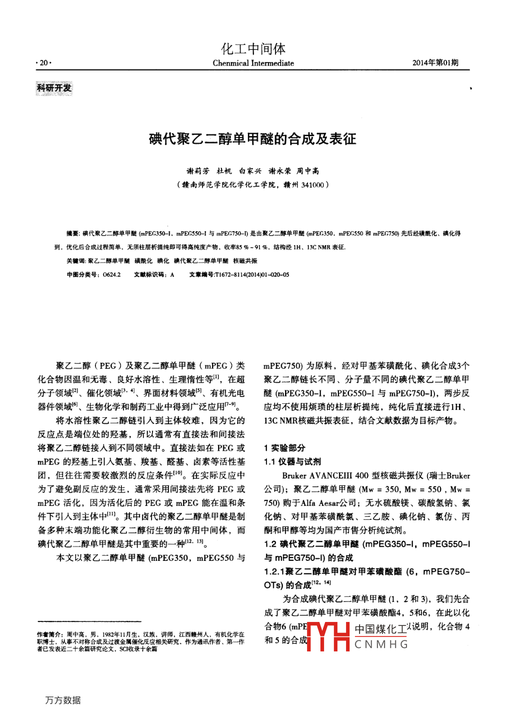 化工中間體20Chenmical Intermediate2014年第01期科研開發(fā)碘代聚乙二醇單甲醚的合成及表征謝莉芳杜帆白家興謝永蒙周中高(贛南師范學(xué)院化學(xué)化工學(xué)院,贛州341000)摘要:碘代聚乙二醇單甲醚(mPEG350-1,mPEG550-1與mPEG750-D是由聚乙二醇單甲醚(mPEG350,mPEG50和mPE750)先后經(jīng)磺酰化、碘化得到,優(yōu)化后合成過程簡單,無須柱層析提純即可得高純度產(chǎn)物,收率85%-91%,結(jié)構(gòu)經(jīng)1H、13CNMR表征關(guān)鍵詞:聚乙二醇單甲醚磺?;饣獯垡叶紗渭酌押舜殴舱裰袌D分類號:06242文獻(xiàn)標(biāo)識碼:A文章編號T1672-8114201401-020-05聚乙二醇(PEG)及聚乙二醇單甲醚(mPEG)類mPEG750)為原料,經(jīng)對甲基苯磺酰化、碘化合成3個化合物因溫和無毒、良好水溶性、生理惰性等,在超聚乙二醇鏈長不同、分子量不同的碘代聚乙二醇單甲分子領(lǐng)域、催化領(lǐng)域·、界面材料領(lǐng)域、有機(jī)光電醚(mPEG350-1,mPEG550-1與mPEG750-1),兩步反器件領(lǐng)域、生物化學(xué)和制藥工業(yè)中得到廣泛應(yīng)用。應(yīng)均不使用煩瑣的柱層析提純,純化后直接進(jìn)行1H將水溶性聚乙二醇鏈引人到主體較難,因?yàn)樗?3CNMR核磁共振表征,結(jié)合文獻(xiàn)數(shù)據(jù)為目標(biāo)產(chǎn)物。反應(yīng)點(diǎn)是端位處的羥基,所以通常有直接法和間接法將聚乙二醇鏈接入到不同領(lǐng)域中。直接法如在PEG或1實(shí)驗(yàn)部分mPEG的羥基上引人氨基、羧基、醛基、鹵素等活性基1.1儀器與試劑團(tuán),但往往需要較激烈的反應(yīng)條件。在實(shí)際反應(yīng)中Bruker aⅤ ANGELl400型核磁共振儀(瑞士 Bruker為了避免副反應(yīng)的發(fā)生,通常采用間接法先將PEG或公司);聚乙二醇單甲醚(Mw=350,Mw=550,Mw=mPEG活化,因?yàn)榛罨蟮腜EG或mPEG能在溫和條750)購于 Alfa aesar公司;無水硫酸鎂、碳酸氫鈉、氯件下引入到主體中叫。其中鹵代的聚乙二醇單甲醚是制化鈉、對甲基苯磺酰氯、三乙胺、碘化鈉、氯仿、丙備多種末端功能化聚乙二醇衍生物的常用中間體,而酮和甲醇等均為國產(chǎn)市售分析純試劑。碘代聚乙二醇單甲醚是其中重要的一種12碘代聚乙二醇單甲醚(mPEG350-1,mPEG550-1本文以聚乙二醇單甲醚(mPEG350,mPEG550與與mPEG750-)的合成1.21聚乙二醇單甲醚對甲苯磺酸酯(6,mPEG750-OTs)的合成2為合成碘代聚乙二醇單甲醚(1,2和3),我們先合成了聚乙二醇單甲醚對甲苯磺酸酯4,5和6,在此以化合物6(mPE作者簡介:周中高,男,1982年11月生,漢族.講師,江西贛州人,有機(jī)化學(xué)在H中國煤化工以說明,化合物4職博士,從事不對稱合成及過渡金屬催化反應(yīng)相關(guān)研究,作為通訊作者、第一作和5的合成者已發(fā)表近二十余篇研究論文,SC收錄十余篇CNMHG第01期碘代聚乙二醇單甲醚的合成及表征OH TsCI MeOTS Nal Men Et2Nn=7 mPEG3504.n=7 mPEG350-OTS1.n=7.mPEG350n=12 mPEG5505. n=12. mPEG550-OTs 2n=12 mPEG550-In=16. mPEG7506.n=16.mPEG750-0Ts3.n=16.mPEG750-1圖1碘代聚乙二醇單甲醚(mPEG350-1,mPEG550-1與mPEG750-1的合成Figure 1 Synthesis of mPEG iodide(mPEG350-1, mPEG550-1 5 mPEG750-I)化合物6(mPEG750-0Ts)的合成:將mPEG750123碘代聚乙二醇單甲醚(2,mPEG550-)的合成(7.5g,10mmo與三乙胺(335mL,24mmo)混合于10鋁箔避光,將碘化鈉(7.5g,50mmo)加入化合物6mL二氯甲烷中,冰鹽浴下,向上述溶液中緩慢滴加15(mPEG550-0Ts)(7.03g,10mmo的20mL干燥丙酮中,mL對甲苯磺酰氯(.g,1lmo的二氯甲烷溶液,反得黃色溶液,劇烈攪拌,回流24小時,恢復(fù)到室溫,應(yīng)2小時,然后室溫下反應(yīng)過夜,向其中加入20mL二在反應(yīng)瓶壁上有黃色固體產(chǎn)生,旋干溶劑,向其中加氯甲烷,攪拌10分鐘,依次用飽和碳酸氫鈉溶液、稀人20mL二氯甲烷和15mL水,室溫下攪拌10分鐘。鹽酸(5%溶液、蒸餾水、飽和食鹽水洗。有機(jī)相用無用硫代硫酸鈉溶液(5%)洗至無色,再依次用飽和碳酸水硫酸鈉干燥,減壓旋干溶劑,得到無色無味粘稠狀氫鈉溶液、水和飽和食鹽水洗。有機(jī)相用無水硫酸鈉液體,72g,產(chǎn)率80%。 1H NMR(400MHz,CDC3,干燥,旋干有機(jī)溶劑。得到淡黃色無味黏稠狀液體8):2.45(s,3H,337(,3H),35-37brm,65H),58g,產(chǎn)率85%。1HNMR(400MHz,CDCl3,8:3.15415(t,J=4.8Hz,2H),734(d,J=82Hz,2H,779(t,J=6.8Hz,2H),3.27(s,3H,344(,J=46Hz,2(d,J=82Hz,2H).13CNMR(100MHz,CDCl,8):H,3.53-3.57(brm,44H,3.64(,J=72Hz,2Hppm21.55,58.90,68.54,69.23,70.39,70.45,70.48,13CNMR(100MHz,CDC3,8):284,58.78,69.95,70.60,71.82,127.86,12978,132.89,144.7470.24,70.31,70.40,71.67,71.69ppmo122碘代聚乙二醇單甲醚(1,mPEG350-的合成124碘代聚乙二醇單甲醚(3,mPEG750-)的合成鋁箔避光,將碘化鈉(7.5g,50mmo)加入化合物6鋁箔避光,將碘化鈉(75g,50mmo)加入化合物mPEG750-OTs)(9.03g,10mmo的20mL干燥丙酮中4(503g,10mmo)的20mL干燥丙酮中,得黃色溶液,得黃色溶液,劇烈攪拌,回流24小時,恢復(fù)到室溫,劇烈攪拌,回流24小時,恢復(fù)到室溫,反應(yīng)瓶壁上有在反應(yīng)瓶壁上有黃色固體產(chǎn)生,旋干溶劑丙酮,向其黃色固體析出,減壓旋干丙酮,向其中加入20mL二中加人20mL二氯甲烷和15mL水,室溫下攪拌10分氯甲烷和15mL蒸餾水,室溫下攪拌10分鐘。用硫鐘。用硫代硫酸鈉溶液(5%)洗至無色,再依次用飽代硫酸鈉溶液(5%洗至無色,再依次用飽和碳酸氫和碳酸氫鈉溶液、水和飽和食鹽水洗。有機(jī)相用無水鈉溶液、蒸餾水、飽和食鹽水洗。有機(jī)相用無水硫酸硫酸鈉干燥,旋干有機(jī)溶劑。得到淡黃色無味黏稠狀鈉干燥,減壓旋干有機(jī)溶劑。得到淡黃色無味黏稠狀液體,80g,產(chǎn)率91%