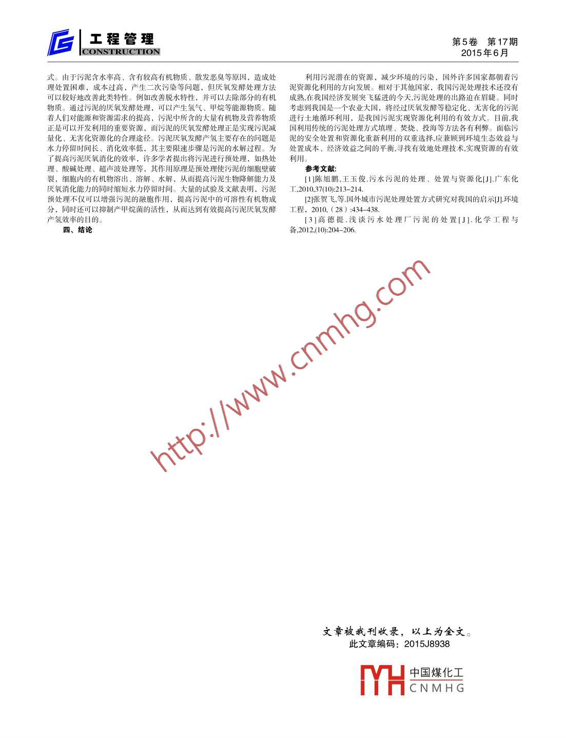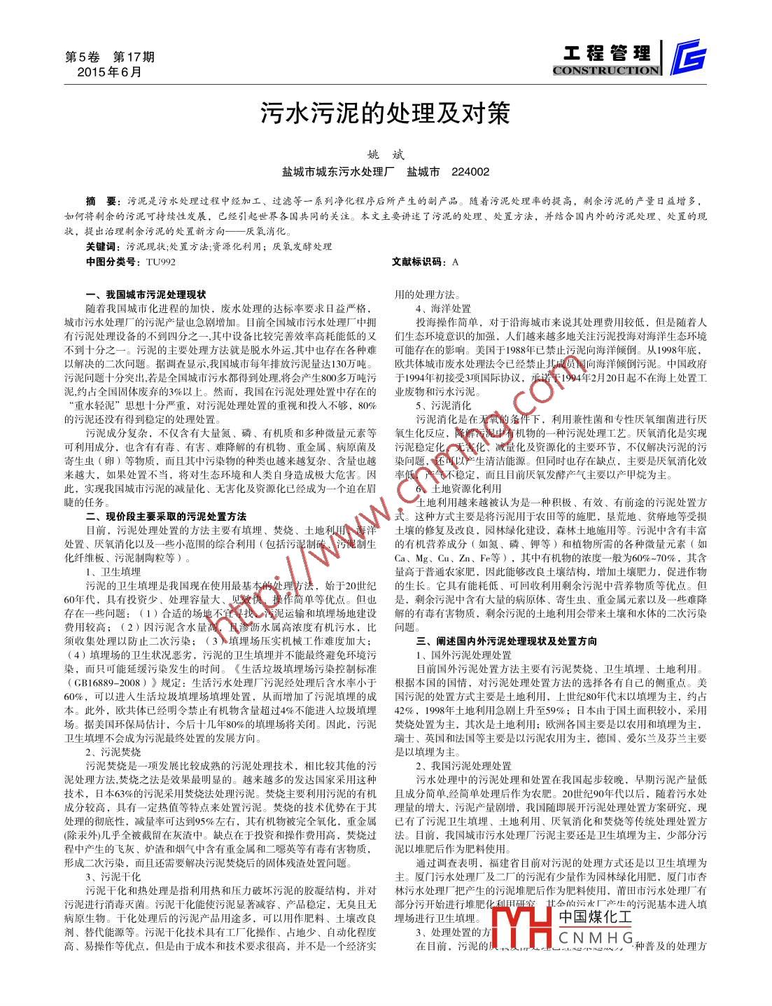 第5卷第17期工程管理2015年6月CONSTRUCTION匠污水污泥的處理及對策姚斌鹽城市城東污水處理廠鹽城市 224002摘要:污泥是污水處理過程中經(jīng)加工、過濾等一系列凈化程序后所產(chǎn)生的副產(chǎn)品。隨著污泥處理率的提高,剩余污泥的產(chǎn)量日益增多,如何將剩余的污泥可持續(xù)性發(fā)展,已經(jīng)引起世界各國共同的關(guān)注。本文主要講述了污泥的處理、處置方法,并結(jié)合國內(nèi)外的污泥處理、處置的現(xiàn)狀,提出治理剩余污泥的處置新方向-- 厭氧消化。關(guān)鍵詞:污泥現(xiàn)狀;處置方法;資源化利用;厭氧發(fā)酵處理中圖分類號: TU992文獻(xiàn)標(biāo)識碼: A一、我國城市污泥處理現(xiàn)狀用的處理方法。隨著我國城市化進(jìn)程的加快,廢水處理的達(dá)標(biāo)率要求日益嚴(yán)格,4、 海洋處置城市污水處理廠的污泥產(chǎn)量也急劇增加。目前全國城市污水處理廠中擁投海操作簡單,對于沿海城市來說其處理費用較低,但是隨著人有污泥處理設(shè)備的不到四分之- _ ,其中設(shè)備比較完善效率高耗能低的又們生 態(tài)環(huán)境意識的加強(qiáng),人們越來越多地關(guān)注污泥投海對海洋生態(tài)環(huán)境不到十分之一。污泥的主要處理方法就是脫水外運.其中也存在各種難可 能存在的影響。美國于1988年已禁止污泥向海洋傾倒。從1998年底,以解決的二次問題。據(jù)調(diào)查顯示,我國城市每年排放污泥量達(dá)130萬噸。歐共體 城市廢水處理法令已經(jīng)禁止其成員國向海洋傾倒污泥。中國政府污泥問題十分突出若是全國城市污水都得到處理將會產(chǎn)生800多萬噸污于1994年 初接受3項國際協(xié)議,承諾于1994年2月 20日起不在海上處置工泥,約占全國固體廢棄的3%以上。然而,我國在污泥處理處置中存在的業(yè)廢物 和污水污泥。“重水輕泥”思想十分嚴(yán)重,對污泥處理處置的重視和投人不夠,80%5、污泥消化的污泥還沒有得到穩(wěn)定的處理處置。污泥消化是在無氧的條件下,利用兼性菌和專性厭氧細(xì)菌進(jìn)行厭污泥成分復(fù)雜, 不僅含有大量氮、磷、有機(jī)質(zhì)和多種微量元素等氧生化反應(yīng), 降解污泥中有機(jī)物的一-種污泥處理 工藝。厭氧消化是實現(xiàn)可利用成分,也含有有毒、有害、難降解的有機(jī)物、重金屬、病原菌及污泥穩(wěn)定化 、無害化、減量化及資源化的主要環(huán)節(jié),不僅解決污泥的污寄生蟲(卵)等物質(zhì),而且其中污染物的種類也越來越復(fù)雜、含量也越染問題, 還可以產(chǎn)生清潔能源。但同時也存在缺點,主要是厭氧消化效來越大,如果處置不當(dāng),將對生態(tài)環(huán)境和人類自身造成極大危害。因率低, 產(chǎn)氣不穩(wěn)定,而且目前厭氧發(fā)酵產(chǎn)氣主要以產(chǎn)甲烷為主。此,實現(xiàn)我國城市污泥的減量化、無害化及資源化已經(jīng)成為一個迫在眉6、土地資源化利用睫的任務(wù)土地利用越來越被認(rèn)為是一種積極、 有效、有前途的污泥處置方二、現(xiàn)價段主要采取的污泥處置方法。這種方式主要是將污泥用于農(nóng)田等的施肥,墾荒地、貧瘠地等受損目前,污泥處理處置的方法主要有填埋、焚燒、土地利用、海洋土 壤的修復(fù)及改良,園林綠化建設(shè),森林土地施用等。污泥中含有豐富處置、厭氧消化以及--些小范圍的綜合利用(包括污泥制磚、污泥制生的有機(jī)營養(yǎng)成分(如氮、磷、鉀等)和植物所需的各種微量元索(如化纖維板、污泥制陶粒等)Ca、Mg、Cu、Zn、Fe等),其中有機(jī)物的濃度一般為60%-70%,其含1、衛(wèi)生填埋量高于普通農(nóng)家肥,因此能夠改良土壤結(jié)構(gòu),增加土壤肥力,促進(jìn)作物污泥的衛(wèi)生填埋是我國現(xiàn)在使用最基本的處理方法,始于20世紀(jì)的生長。它具有能耗低、可回收利用剩余污泥中營養(yǎng)物質(zhì)等優(yōu)點。但60年代,具有投資少、處理容量大、見效快、操作簡單等優(yōu)點。但也是, 剩余污泥中含有大量的病原體、寄生蟲、重金屬元索以及一些難降存在一些問題: ( 1 )合適的場地不宜尋找,污泥運輸和填埋場地建設(shè)解的有 毒有害物質(zhì),剩余污泥的土地利用會帶來土壤和水體的二次污染費用較高; (2) 因污泥含水量高,且滲瀝水屬高濃度有機(jī)污水,比問題。須收集處理以防止二次污染; (3) 填埋場壓實機(jī)械工作難度加大:三、闡述國內(nèi)外污泥處理現(xiàn)狀及處置方向(4)填埋場的衛(wèi)生狀況惡劣,污泥的衛(wèi)生填埋并不能最終避免環(huán)境污1、國外污泥處理處置染,而只可能延緩污染發(fā)生的時間。《生活垃圾填埋場污染控制標(biāo)準(zhǔn)目前國外污泥處置方法主要有污泥焚燒、衛(wèi)生填埋、土地利用。( CB16889- 2008)》規(guī)定:生活污水處理廠“污泥經(jīng)處理后含水率小于根據(jù) 本國的國情,對污泥處理處置方法的選擇各有自己的側(cè)重點。美60%,可以進(jìn)入生活垃圾填埋場填埋處置,從而增加了污泥填埋的成國污泥的處置方式主要是土地利用,上世紀(jì)80年代末以填埋為主,約占本。此外,歐共體已經(jīng)明令禁止有機(jī)物含量超過4%不能進(jìn)人垃圾填埋42%, 1998年 土地利用急劇上升至59%;日本由于國土面積較小,采用場。據(jù)美國環(huán)保局估計,今后十幾年80%的填埋場將關(guān)閉。因此,污泥焚燒處