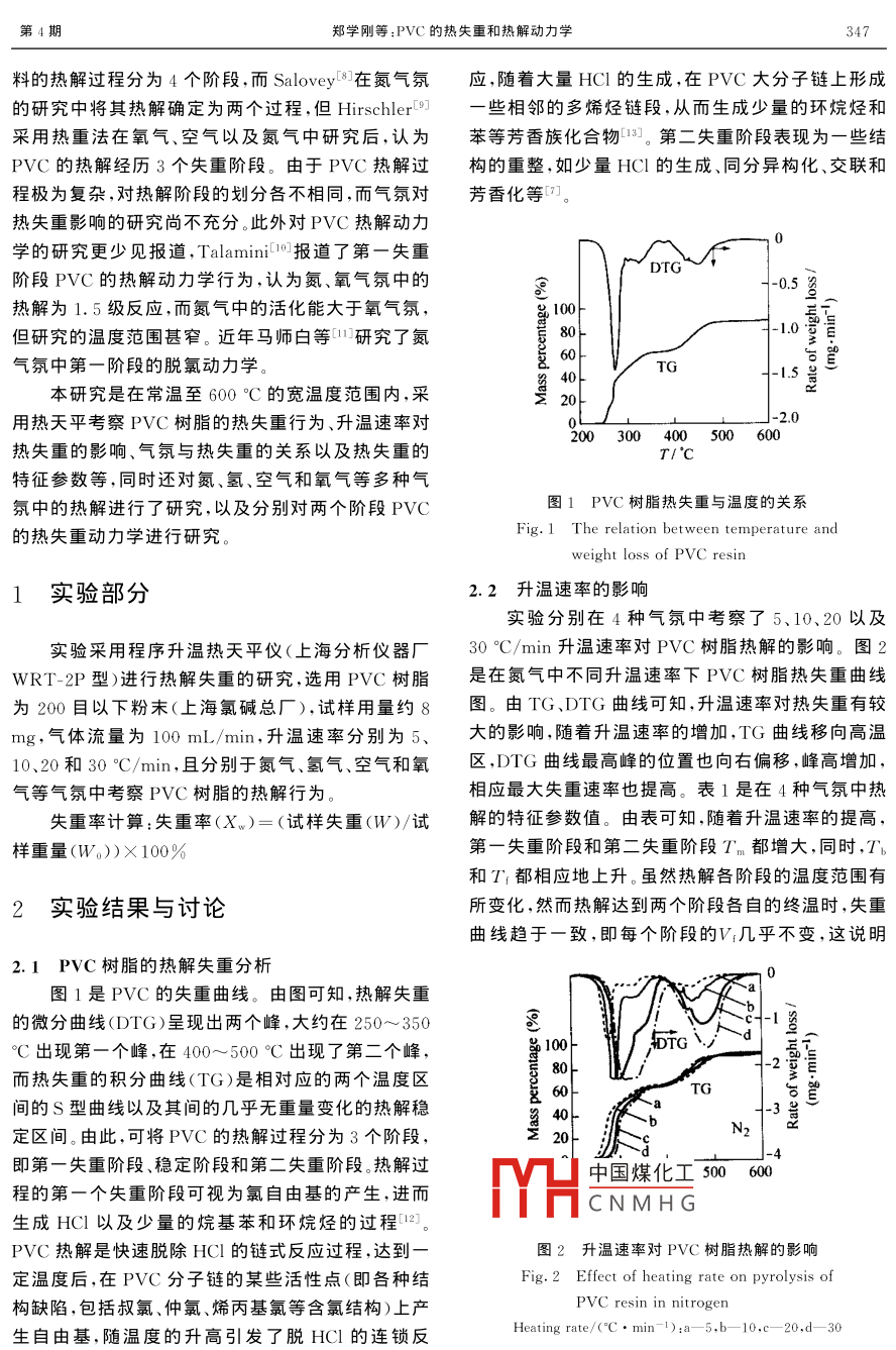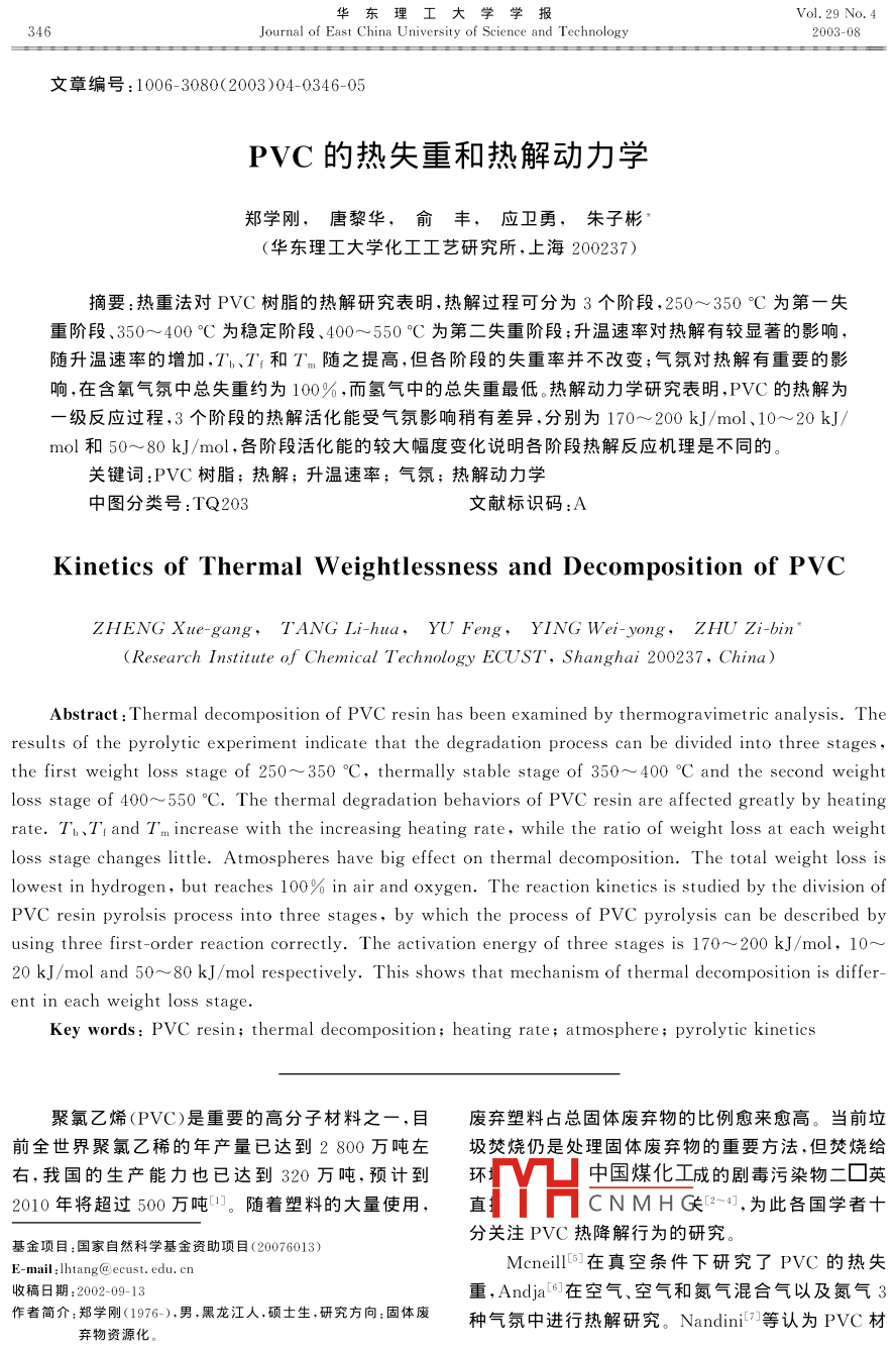 華東理工大學(xué)學(xué)報Vol 29 No 4Journal of East China University of Science and Technology2003-08文章編號:1006-3080(2003)04-0346-05PⅤC的熱失重和熱解動力學(xué)鄭學(xué)剛,唐黎華,俞豐,應(yīng)衛(wèi)勇,朱子彬華東理工大學(xué)化工工藝研究所,上海200237)摘要:熱重法對PⅤC樹脂的熱解研究表明,熱解過程可分為3個階段,250~350°C為第一失重階段、350~400℃為穩(wěn)定階段、400~550℃C為第二失重階段;升溫速率對熱解有較顯著的影響,隨升溫速率的增加,Tb、T'和T~隨之提高,但各階段的失重率并不改變;氣氛對熱解有重要的影響,在含氧氣氛中總失重約為100%,而氫氣中的總失重最低。熱解動力學(xué)研究表明,PVC的熱解為級反應(yīng)過程,3個階段的熱解活化能受氣氛影響稍有差異,分別為170~200kJ/mol、10~20kJ/mol和50~80kJ/mol,各階段活化能的較大幅度變化說明各階段熱解反應(yīng)機理是不同的關(guān)鍵詞:PVC樹脂;熱解;升溫速率;氣氛;熱解動力學(xué)中圖分類號:TQ203文獻(xiàn)標(biāo)識碼Kinetics of Thermal Weightlessness and Decomposition of PvcZHENG Xue-gang, TANG Li-hua, YU Feng, YING Wei-yong, ZHU Zi-bin(Research Institute of Chemical Technology ECUsT, Shanghai 200237, China)Abstract: Thermal decomposition of Pvc resin has been examined by thermogravimetric analysis. Theresults of the pyrolytic experiment indicate that the degradation process can be divided into three stagesthe first weight loss stage of 250-350C, thermally stable stage of 350-400C and the second weightloss stage of 400-550C. The thermal degradation behaviors of Pvc resin are affected greatly by heatingrate. Tb, TI and T,m increase with the increasing heating rate, while the ratio of weight loss at each weightloss stage changes little. Atmospheres have big effect on thermal decomposition. The total weight loss islowest in hydrogen, but reaches 100% in air and oxygen. The reaction kinetics is studied by the division ofPVC resin pyrolsis process into three stages, by which the process of Pvc pyrolysis can be described byusing three first-order reaction correctly. The activation energy of three stages is 170-200 kJ/mol, 1020 kJ/mol and 50-80 kJ/mol respectively. This shows that mechanism of thermal decomposition is different in each weight loss stageKey words PVC resin; thermal decomposition; heating rate; atmosphere; pyrolytic kinetics聚氯乙烯(PVC)是重要的高分子材料之一,目廢棄塑料占總固體廢棄物的比例愈來愈高。當(dāng)前垃前全世界聚氯乙稀的年產(chǎn)量已達(dá)到2800萬噸左圾焚燒仍是處理固體廢棄物的重要方法,但焚燒給右,我國的生產(chǎn)能力也已達(dá)到320萬噸,預(yù)計到環(huán)H中國煤化工成的劇毒污染物二囗英2010年將超過500萬噸。隨著塑料的大量使用,直CNMHG2-4,為此各國學(xué)者十基金項目:國家自然科學(xué)基金資助項目(20076013)分關(guān)注PⅤC熱降解行為的研究E-mail:litang@ecust.edu.cnMcneill在真空條件下研究了PVC的熱失收稿日期:2002-09-13重,Anda6在空氣、空氣和氮氣混合氣以及氮氣3作者簡介:鄭學(xué)剛(1976-),男黑龍江人碩士生研究方向:固體廢種氣氛中進(jìn)行熱解研究。 Nandinia等認(rèn)為PVC材棄物資源化第4期鄭學(xué)剛等:PⅤC的熱失重和熱解動力學(xué)347料的熱解過程分為4個階段,而 Salovey在氮氣氛應(yīng),隨著大量HCl的生成,在PVC大分子鏈上形成的研究中將其熱解確定為兩個過程,但 Hirschler些相鄰的多烯烴鏈段,從而生成少量的環(huán)烷烴和采用熱重法在氧氣、空氣以及氮氣中研究后,認(rèn)為苯等芳香族化合物3。第二失重階段表現(xiàn)為一些結(jié)PⅤC的熱解經(jīng)歷3個失重階段。由于PVC熱解過構(gòu)的重整,如少量HCl的生成、同分異構(gòu)化、交聯(lián)和程極為復(fù)雜,對熱解階段的劃分各不相同,而氣氛對芳香化等熱失重影響的研究尚不充分。此外對PVC熱解動力學(xué)的研究更少見報道, talaminil報道了第一失重階段PⅤC的熱解動力學(xué)行為,認(rèn)為氮、氧氣氛中的熱解為1.5級反應(yīng),而氨氣中的活化能大于氧氣氛但研究的溫度范圍甚窄。近年馬師白等-研究了氮氣氛中第一階段的脫氯動力學(xué)本研究是在常溫至600℃C的寬溫度范圍內(nèi),采用熱天平考察PVC樹脂的熱失重行為、升溫速率對2.0200300400500600熱失重的影響、氣氛與熱失重的關(guān)系以及熱失重的特征參數(shù)等,同時還對氮、氫、空氣和氧氣等多種氣氛中的熱解進(jìn)行了研究,以及分別對兩個階段PVC圖1PVC樹脂熱失重與溫度的關(guān)系的熱失重動力學(xué)進(jìn)行研究。The relation between temperatureweight loss of Pvc resin1實驗部分2.2升溫速率的影響實驗分別在4種氣氛中考察了5、10、20以及實驗采用程序升溫?zé)崽炱絻x(上海分析儀器廠30"℃/min升溫速率對PVC樹脂熱解的影響。圖RT-2P型)進(jìn)行熱解失重的研究,選用PVC樹脂是在氮氣中不同升溫速率下PVC樹脂熱失重曲線為200目以下粉末(上海氯堿總廠),試樣用量約8圖。由TG、DTG曲線可知,升溫速率對熱失重有較mg,氣體流量為100mL/min,升溫速率分別為5、大的影響,隨著升溫速率的增加,TG曲線移向高溫10、20和3o℃/min,且分別于氮氣、氫氣、空氣和氧區(qū),DTG曲線最高峰的位置也向右偏移,峰高增加氣等氣氛中考察PVC樹脂的熱解行為相應(yīng)最大失重速率也提高。表1是在4種氣氛中熱失重率計算:失重率(X)=(試樣失重(W)/試解的特征參數(shù)值。由表可知隨著升溫速率的提高樣重量(W))×100%第一失重階段和第二失重階段Tn都增大,同時,T和T都相應(yīng)地上升。雖然