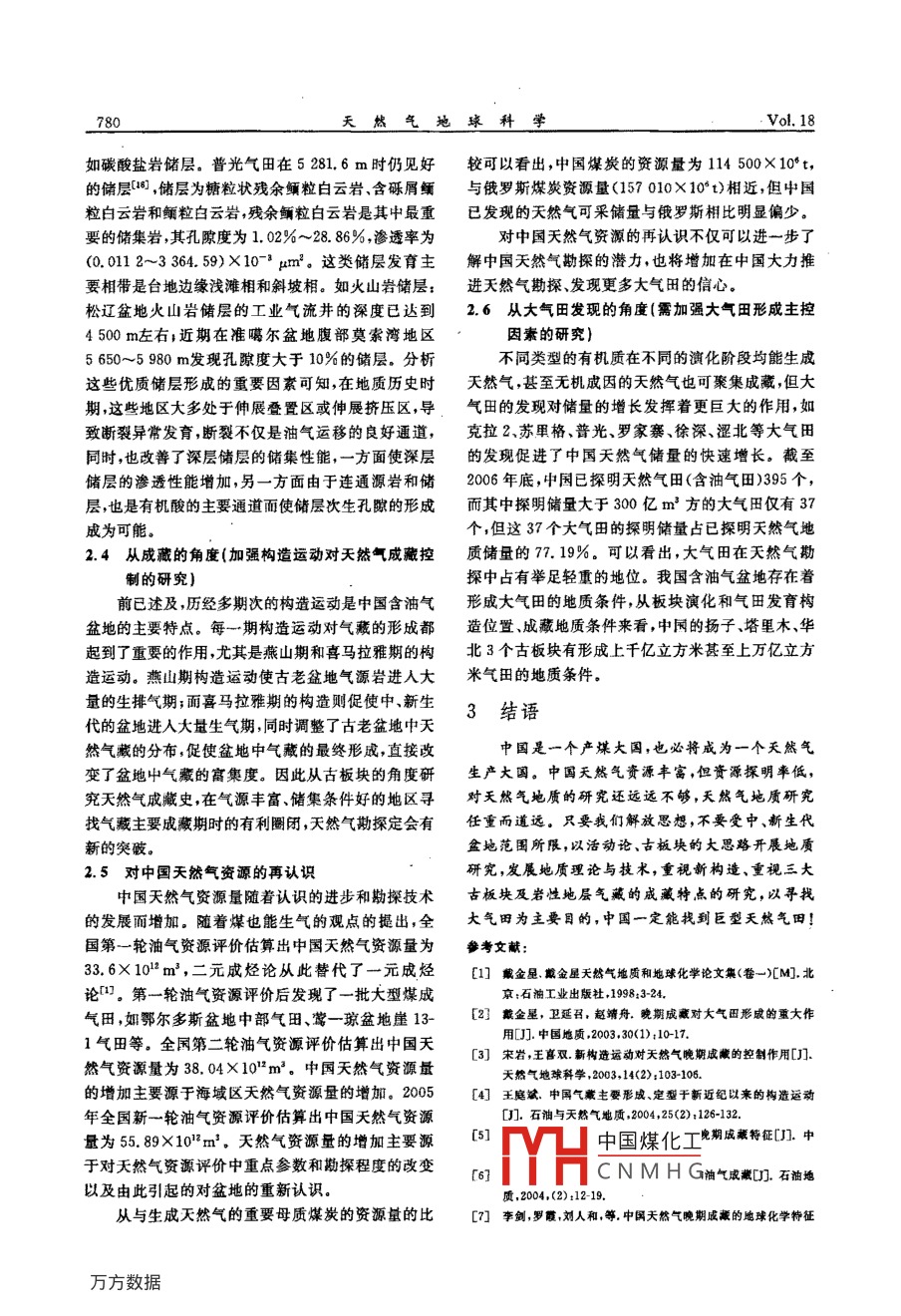 第18卷第6期天然氣地球科學VoL 18 No 62007年12月NATURAL GAS GEOSCIENCEDee.2007綜述與評述中國天然氣地質(zhì)研究的戰(zhàn)略思考李景明,羅霞,李東旭(中國石油勤探開發(fā)研究院廊坊分院,河北廊坊065007)摘要:評述了近年來中國天然氣地質(zhì)研究的重要進展,如多元成烴理論、晚期成藏理論與巖性地層成藏理論的形成及其帶來的勘探的重大突破。指出了中國天然氣地質(zhì)研究面臨的難點,主要是中國盆地地質(zhì)結(jié)構(gòu)的復雜性,而過去的天然氣地質(zhì)研究主要針對中、新生代形成的盆地。認為中國的天然氣地質(zhì)研究要取得更大更多發(fā)現(xiàn),需拓展勤探思路,發(fā)展現(xiàn)有的理論與技術(shù),以活動論思想、以古板塊思路、以大氣田為目標來進行。關(guān)鍵詞:天然氣;地質(zhì)研究;戰(zhàn)略思考中圖分類號:TE12文獻標識碼:A文章編號:1672-1926(2007)060777-05引言盆地南緣、松遼盆地深層天然氣的謝探得到了足夠的重視,也就是說,煤成氣理論的提出在天然氣勘2005年完成的中國新一輪油氣資源評價估算探戰(zhàn)略選區(qū)方面發(fā)揮了重要的作用。中國天然氣資源量為56×102m3。截止2006年天然氣晚期成藏理論及巖性地層成藏理論的不底,中國已探明天然氣地質(zhì)儲量為5.39×102m3,斷深化和預示著未來巨大的勘探潛力,近幾年所發(fā)現(xiàn)的天然要的作善,在天然氣區(qū)帶優(yōu)選評價中發(fā)揮了重天然氣資源探明率僅9.63%。較低的資源探明率氣田的特征主要表現(xiàn)為:埋深普遍偏大、物性偏差、中國地處三大板塊間的三角地帶,是世界上新圈閉條件偏復雜;巖性地層氣藏比例越來越大;多數(shù)構(gòu)造運動活躍地區(qū)之一,中國天然氣藏的形成與新氣田集中在三大古板塊。中國已有50余年的天然構(gòu)造活動的關(guān)系密切27,除鄂爾多斯盆地、松遼盆氣勘探史針對的主要是中新生界盆地及其下伏的地外,其他盆地的氣藏主要形成定型于新近紀以來沉積層對古板塊控制的古生代盆地研究甚少。因的構(gòu)造運動,由此提出了天然氣晚期成藏此,拓寬研究思路,拓展研究范圍,對發(fā)展中國天然論”,天然氣自身的擴散速率比石油快而不易保氣勘探領(lǐng)域有重要意義。存,要求晚期成藏的特性決定了新構(gòu)造運動在天然氣的聚集過程中必然起到重要的作用,主要表現(xiàn)在1天然氣地質(zhì)研究促進了勘探的突破,是新構(gòu)造運動促進了深部源巖有機質(zhì)的演化進但天然氣地質(zhì)研究的廣度仍不夠程,烴源巖在短時期內(nèi)大量生氣和聚集,從而形成了高效氣藏”;二是新構(gòu)造運動對早期形成的氣藏1.1天然氣地質(zhì)理論的發(fā)展與完著促進了天然氣起到調(diào)整改造作用,直接控制了盆地中不同區(qū)帶天勘探的突破然氣的富集程度;三是新構(gòu)造運動形成或改造天然氣成烴理論向多元化發(fā)展,拓展了天然氣形成了一系列圈閉,改造了儲集條件,形成了有利的勘探領(lǐng)域。構(gòu)造裂縫,構(gòu)造成為了油氣運移輸導系統(tǒng)等。煤成氣理論明確指出含煤盆地和廣殖型有機隨著可供鉆探的簡單的構(gòu)造圈閉日漸減少,勘質(zhì)也能生氣。這一理論使鄂爾多斯盆地古生界、探家盾坐字廣再田敗坦出了巖性地層天四川盆地上三疊統(tǒng)、塔里木盆地庫車場陷、準噶爾然氣中國煤化工生界巖性地層氣CNMHG收稿日期:20070829;修回日期:207-10-16作者簡介;李景明(1956)勇四川永川人,教授級高級工程師,主要從事天然氣助探與開發(fā)研究Ema1lim@petrochinA.comcn.778天然氣地球科學VoL. 18藏主要受河道砂體的控制;四川盆地飛仙關(guān)組鮞有“階段性”和“多動性”的特征,因此,在不同的灘氣藏分布主要受鮞灘相帶控制1,如羅家寨、鐵地質(zhì)時期,由于板塊活動與古地理、古氣候等因素的山坡普光等礁灘氣藏就是構(gòu)造背景下的巖性氣影響導致相應的沉積盆地中心發(fā)生遷移,現(xiàn)今的盆藏0;松遼盆地深層火山巖氣藏主要受火山巖有利地格局僅是古盆地的一部分。因此我們應以活動相帶的控制也是構(gòu)造背景上的巖性氣藏1s論思想為指導、以古板塊控制古今盆地形成為思路、此外生物氣形成機理研究發(fā)現(xiàn)可溶有機質(zhì)對以發(fā)現(xiàn)大氣田為目的,來開展天然氣地質(zhì)研究。生物氣的生成具有重要意義,科學地解釋了柴達2.1從構(gòu)造的角度(盆地周繚古板塊區(qū)值得研究木盆地三湖地區(qū)的生物氣源巖。在該盆地,雖然有中國大陸板塊系古生代以來由50多個大小不機碳含量很低,但可溶有機質(zhì)含量高具有形成大氣等的陸塊拼接形成,每個小陸塊在拼接和匯聚過程田的地質(zhì)背景。趙文智等提出的有機質(zhì)接力生中,都會對盆地形成產(chǎn)生影響因而導致中國大陸地氣的模式,揭示了有機質(zhì)在每一階段都能生成天然殼的多旋回性及在區(qū)域地質(zhì)上發(fā)展的不平衡性a1氣,大大拓寬了找氣的領(lǐng)域。近年來無機成因天然長期多期構(gòu)造活動使盆地具有多期生烴油氣多期氣理論研究得到了重新重視,主要是因為在松成藏的過程,只有動態(tài)研究在盆地中各套烴源巖、儲遼盆地深層天然氣成因研究上不斷取得突破盡管層蓋層圈閉斷裂及保存條件,才能有根據(jù)地提出在這方面尚存在較大的爭議。天然氣有利聚集區(qū)。北方氣田( North field,儲量271.2天然氣