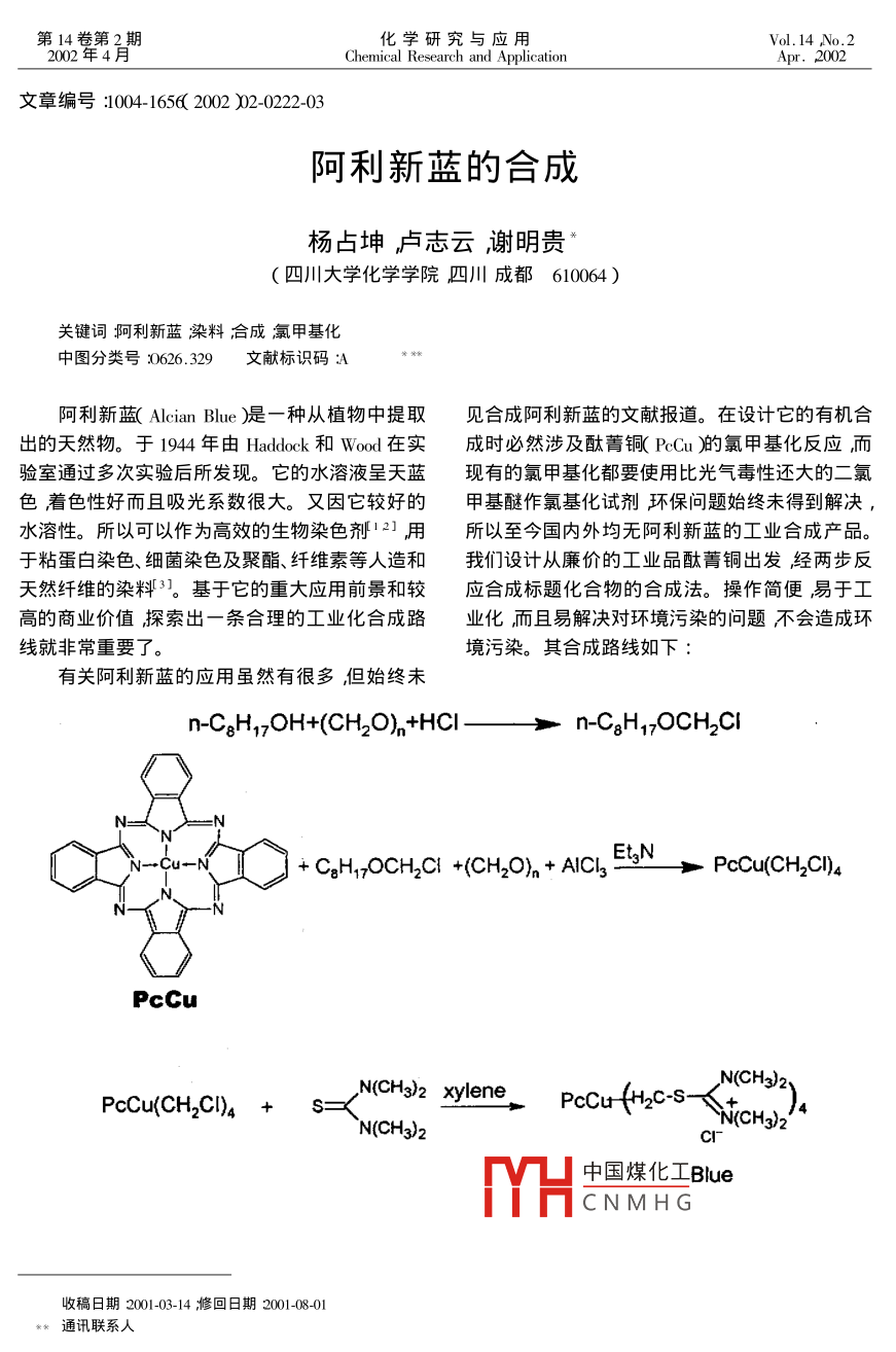 第14卷第2期化學(xué)研究與應(yīng)用Vol. 14 ,No.22002年4月Chemical Research and ApplicationApr. 2002文章編號:1004-1656( 2002 )02-0222-03阿利新藍的合成楊占坤盧志云謝明貴(四川大學(xué)化學(xué)學(xué)院四川成都610064 )關(guān)鍵詞阿利新藍染料合成氯甲基化中圖分類號:0626. 329文獻標(biāo)識碼:A阿利新藍( Alcian Blue )是一種 從植物中提取見合成阿利新藍的文獻報道。在設(shè)計它的有機合出的天然物。于1944 年由Haddock和Wood在實成時必然涉及酞菁銅(PcCu)的氯甲基化反應(yīng)而驗室通過多次實驗后所發(fā)現(xiàn)。它的水溶液呈天藍現(xiàn)有的氯甲基化都要使用比光氣毒性還大的二氯色著色性好而且吸光系數(shù)很大。又因它較好的甲基醚作氯基化試劑環(huán)保問題始終未得到解決,水溶性。所以可以作為高效的生物染色劑12],用所以至今國內(nèi)外均無阿利新藍的工業(yè)合成產(chǎn)品。,于粘蛋白染色、細菌染色及聚酯、纖維素等人造和我們設(shè)計從廉價的工業(yè)品酞菁銅出發(fā)經(jīng)兩步反天然纖維的染料3?;谒闹卮髴?yīng)用前景和較應(yīng)合成標(biāo)題化合物的合成法。操作簡便易于工高的商業(yè)價值探索出-條合理的工業(yè)化合成路業(yè)化而且易解決對環(huán)境污染的問題不會造成環(huán)線就非常重要了。境污染。其合成路線如下:有關(guān)阿利新藍的應(yīng)用雖然有很多,但 始終未n-CgH,7OH+(CH2O)n+HCI-一? n-CgH1;OCH2CI+ CgHzOCH2CI +(CH2O)n + AICI3, EgN ?PcCu(CH2C)。N- -NPcCuN(CH3)2.PcCu(CH2CI)4 +,N(CH3)2 xylenePcCuH2C-S-
