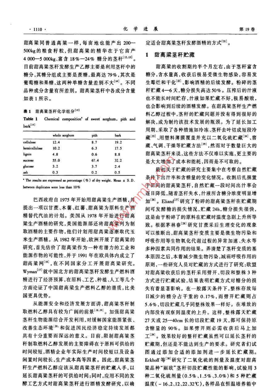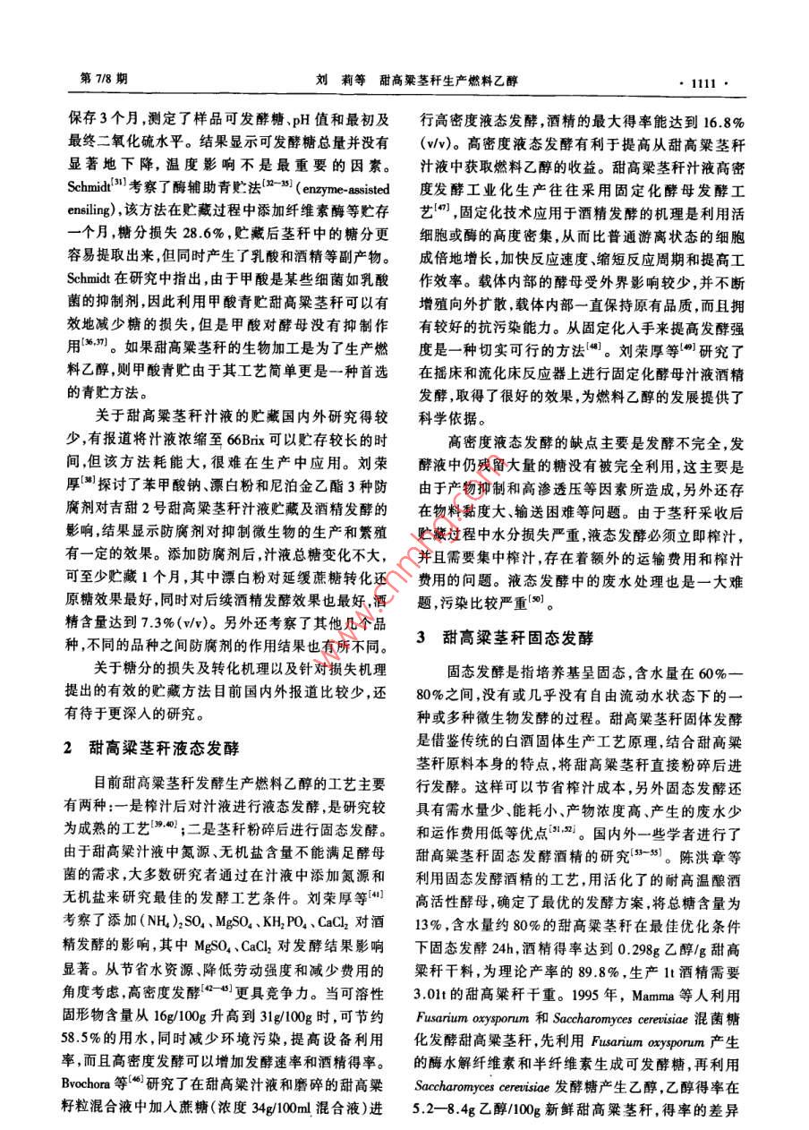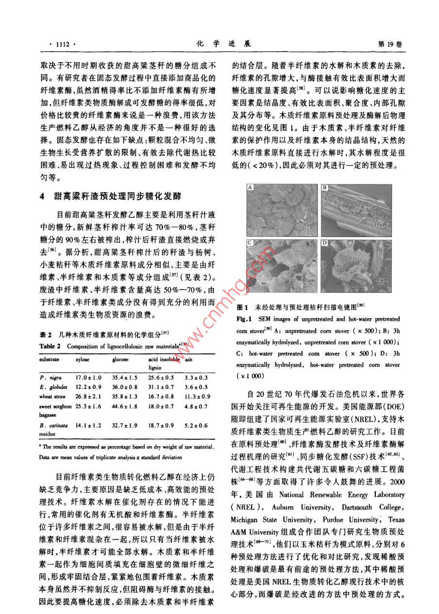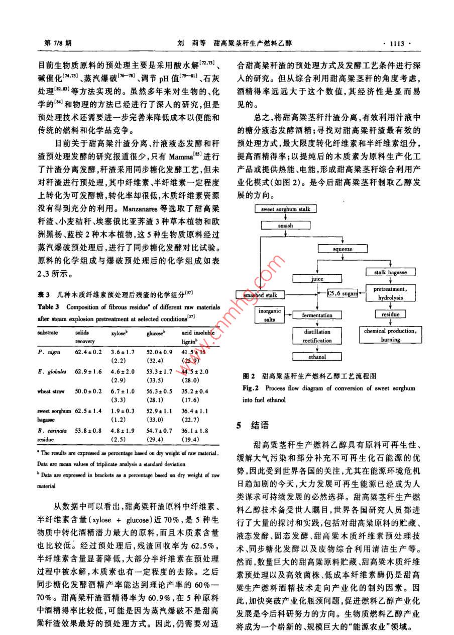 第19卷第78期化學(xué)進(jìn)展 Vol.19 No.7/82007年8月 PROGRESS IN CHEMISTRYAug.,2007甜高粱莖稈生產(chǎn)燃料乙醇劉莉?qū)O君社康利平劉萍(中國(guó)農(nóng)業(yè)大學(xué)食品科學(xué)與營(yíng)養(yǎng)工程學(xué)院北京100083)摘要本文對(duì)甜高粱莖稈原料的貯藏、汁液液態(tài)發(fā)酵、莖稈直接粉碎固態(tài)發(fā)酵以及榨汁后剩余的稈渣預(yù)處理同步糖化發(fā)酵4個(gè)方面的研究情況進(jìn)行了綜述,重點(diǎn)論述了甜高粱莖稈生產(chǎn)燃料乙醇的瓶頸問(wèn)題即原料的貯藏和稈渣木質(zhì)纖維素預(yù)處理技術(shù)。提出了一種更經(jīng)濟(jì)合理的甜高粱莖稈生產(chǎn)燃料乙醇工藝流程。關(guān)鍵詞甜高粱莖稈乙醇液態(tài)發(fā)酵固態(tài)發(fā)酵預(yù)處理中圖分類號(hào):TK6;S216.2文獻(xiàn)標(biāo)識(shí)碼:A文章編號(hào):1005-281X(2007)078-1109-07 The Fuel Ethanol Production from Sweet Sorghum Stalk Liu Li Sun Junshe"' Kang Liping Liu Ping (College of Food Science and Nutritional Engineering, China Agricultural University, Beijing 100083, China) Abstract The progress of fuel ethanol production from sweet sorghum stalk is introduced in this paper, including methods of preserving raw materials, liquid-state fermentation of juice, solid-stated fermentation of smashed stalks, pretreatment of stalk bagasse and simultaneous saccharification and fermentation (SSF). The key technologies of converting sweet sorghum stalks into fuel ethanol are discussed in detail, which are raw materials preservation and pretreatment of stalk bagasse. A more economical and feasible process flow, found promising for further investigation is suggested. Key words sweet sorghum; ethanol; liquid-state fermentation solid-state fermentation; pretreatments隨著經(jīng)濟(jì)和社會(huì)的高速發(fā)展,能源的需求量越燃料乙醇勢(shì)必會(huì)出現(xiàn)“車與人爭(zhēng)糧”“車與糧爭(zhēng)地”的來(lái)越大,能源短缺和溫室氣體效應(yīng)已經(jīng)成為各國(guó)問(wèn)題從我國(guó)的國(guó)情出發(fā),大量使用糧食為原料生面臨的重大問(wèn)題。在國(guó)際國(guó)內(nèi)石油價(jià)格不斷上漲的產(chǎn)燃料乙醇也必將帶來(lái)嚴(yán)重的現(xiàn)實(shí)問(wèn)題,而利用生情況下世界各國(guó)都在積極探索利用可再生能物質(zhì)為原料生產(chǎn)燃料乙醇是符合可持續(xù)發(fā)展的最理源24。發(fā)展可再生的石油替代燃料勢(shì)在必行。燃想的選擇。目前研究最多的是以玉米秸稈和甘蔗料乙醇是來(lái)源于可再生生物質(zhì)的重要能源之一,從為原料,國(guó)內(nèi)外正在積極研究開發(fā)利用其他生物質(zhì)國(guó)家安全和可持續(xù)發(fā)展的角度出發(fā),發(fā)展燃料乙醇生產(chǎn)燃料乙醇的技術(shù),包括木薯、小麥秸稈、甜高是一項(xiàng)重要的措施56粱莖稈、速生楊、柳枝稷、生活垃圾等。我國(guó)燃料在美國(guó)和巴西,利用糖和淀粉生產(chǎn)燃料乙醇已乙醇生產(chǎn)也應(yīng)建立多元結(jié)構(gòu)的原料體系。經(jīng)達(dá)到工業(yè)化規(guī)模。“十五”期間,國(guó)家批準(zhǔn)河南天甜高粱屬于C4作物,光合效率高,抗旱、耐澇、冠、黑龍江華潤(rùn)、吉林燃料乙醇和安徽豐原4家企業(yè)耐鹽堿,在一般耕地、荒地、山地、鹽堿地均可種植。加工燃料乙醇,年產(chǎn)能力達(dá)102萬(wàn)噸。但這些燃料在不適宜種植其他糧食作物和糖料作物的地區(qū)種植乙醇主要是由糧食(包括陳化糧)轉(zhuǎn)化而來(lái),生產(chǎn)成甜高粱既不與糧爭(zhēng)地,又可糧、糖雙收,因而引起了本高,需要國(guó)家補(bǔ)貼企業(yè)才能運(yùn)轉(zhuǎn)。使用糧食生產(chǎn)許多國(guó)家的廣泛重視、積極研究和大力推廣收稿:2006年5月★國(guó)家自然科學(xué)基金項(xiàng)目(No.20436020)資助通訊聯(lián)系人e-mail: e-mail: sunjsh61@163.com61@163.com1110化學(xué)進(jìn)展第19卷甜高粱同普通高粱一樣,每畝地也能產(chǎn)出200一定適合甜高粱莖稈發(fā)酵酒精的方式2500kg的糧食籽粒,但甜高粱的精華在于它畝產(chǎn)40005000g、富含18%24%糖分的莖211甜高粱莖稈貯藏目前甜高粱莖稈發(fā)酵生產(chǎn)乙醇主要是利用莖稈中的甜高粱的收割期約半個(gè)月左右,由于莖稈富含糖分,其糖分組成主要是蔗糖,最高達(dá)79%,其次是糖分,含水量高,收獲后極易受微生物感染,容易發(fā)葡萄糖和果糖,這兩種單糖含量差別不大。不同生霉?fàn)€和干化,影響酒精的后續(xù)發(fā)酵。粉碎的莖品種成分含量有所差別。甜高粱莖稈中各成分含量稈貯藏46天,糖分損失高達(dá)50%。壓榨后的汁液如表1所示。也不能長(zhǎng)時(shí)間貯存,汁液如果貯藏不好,極易酸敗,也會(huì)影響到后續(xù)的酒精發(fā)酵。在甜高粱莖稈生產(chǎn)燃表1甜高粱莖化學(xué)組分(料乙醇過(guò)程中,莖稈的貯藏問(wèn)題并沒(méi)有得到很好的 Table Chemical composition' of sweet sorghum, pith and解決,成為制約該技術(shù)發(fā)展的瓶頸。為了延長(zhǎng)加工 bark [is]周期,采取了各種措施如冷凍、莖稈去葉切成短段冷 whole sorghum pith bark藏、用塑料薄膜覆蓋并充以二氧化硫貯藏24、窖 cellulose12.48.719.2 hemicellulose 10.26.317.5藏、氣調(diào)、干燥等貯藏方法2,然而對(duì)于數(shù)量巨大的 lignin4.80.68.8甜高粱莖稈來(lái)說(shuō),這些方法不僅難以實(shí)施,更主要的 ucrose55.067.432.2g ucose3.2是大大增加了成本和能耗,因而是不可取的。3.72.4