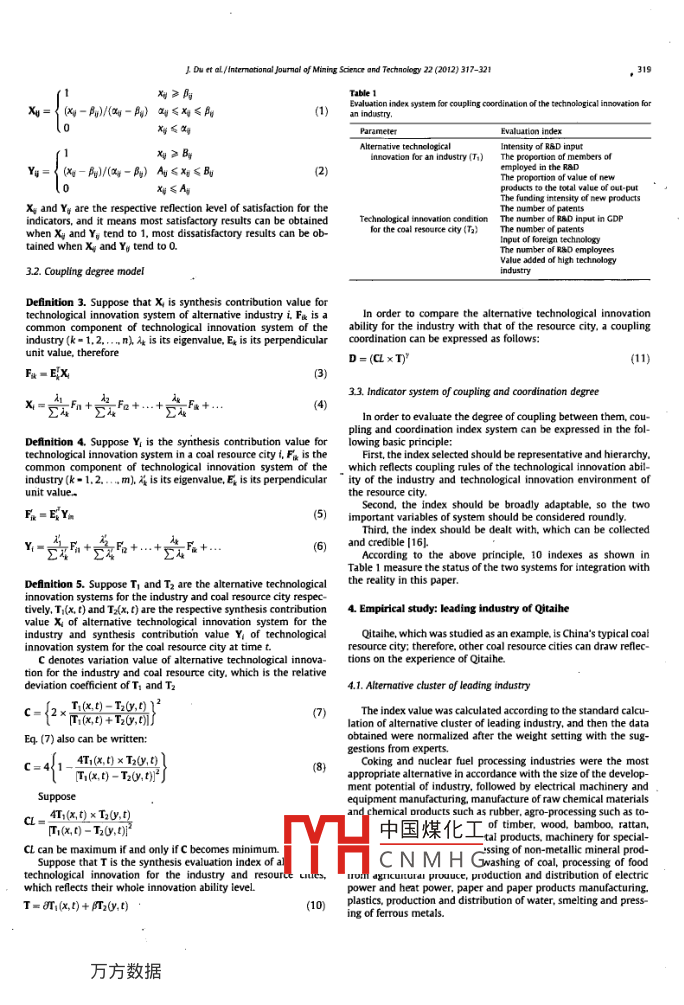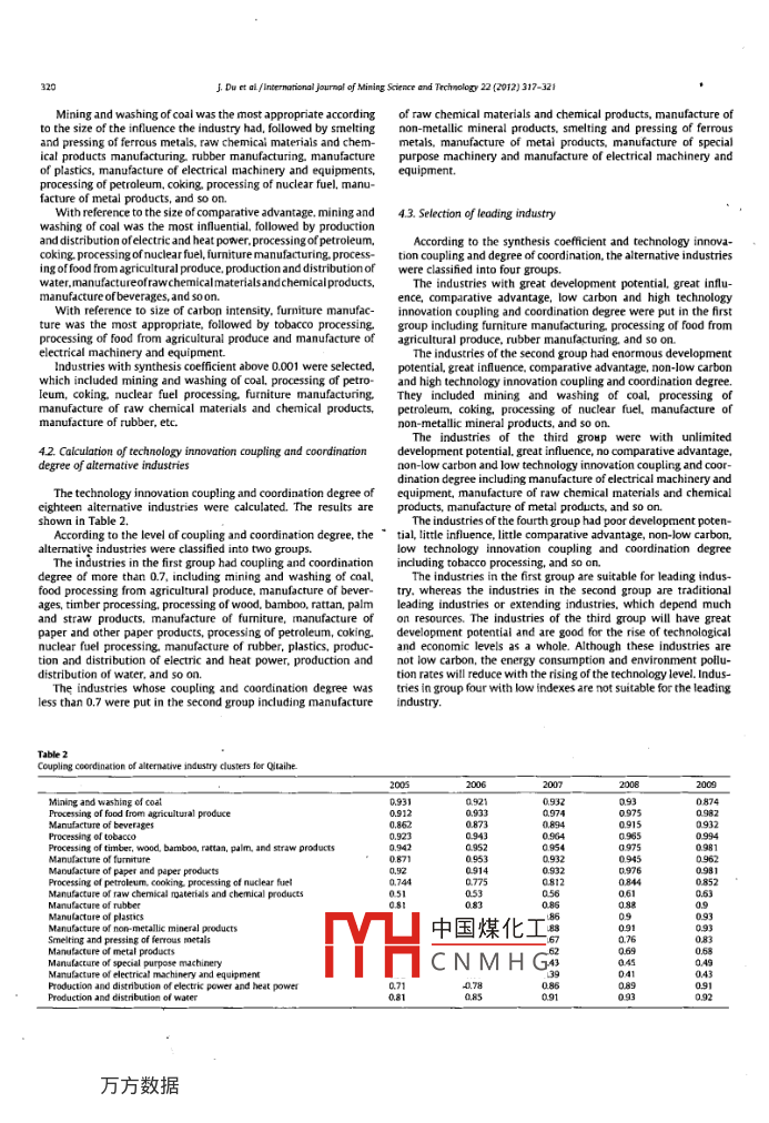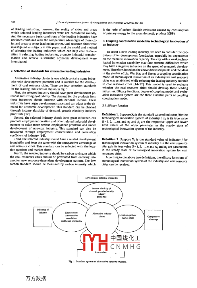 International loumal of Mining Science and Technology 22(2012)317-321Contents lists available at Sciverse Science DirectInternational Journal of Mining Science and TechnologyELSEVIERjournalhomepagewww.elsevier,com/locate/ijmstSelection of leading industries for coal resource cities basedon coupling coordination of industry's technological innovationDu Jiming, Yu Bo, Yao XilongSchool of Management Harbin Institute of Technoiog, Harbin 150001, ChinaARTICLE INFOA BSTRACTReceived 25 October 2011Accepted 12 December 207May2012sent of coale cities. Formineral productsnfluence poteand low carmissions should be attached much impoo 2012 Published by Elsevier B V. on behalf of China University of Mining Technology.1 Introductionand the latter proposed increasing rate of productivity, incomeelasticity and industrial connections [4, 5 Meng and Dang preation, Forcality formmm20mm年hmpaal proposed income elastilished by Hirschman, Rostow and Shinohara, respectively[1-3) They Ithat the leading industries had to haventageal features, i. e. one with greater outpurith a strong industrial connection, with referenoduction rate, income elasticity of demand, industrial conned. elasticity of sction standard of ented labor, and stronger driving effect on correlation industriading industries cavided into 3-7 different steps. Zhou [12]. Zhang et al. proposed seven selection standards of leadi中國(guó)煤化工 I production rate, industrial conntution elasticity benchmark and the bottleneck berparison of the production factors.C DevelopCorresponding author. TeL: +86 18745135376of the alternative industry and itsinfluence were more considered in the above selection standards2095-2686/s-see front matter a 2012 Published by Elsevier B.V. on behalf of China University of Mining Technology.J Du er a/Intemational Joumal of Mini Sience and Technoiog 22(2012)317-321of leading industries, however, the reality of cities and areas is the ratio of carbon dioxide emissions caused by consumptionnot considered roundly. of primary energy to the gross domestic product(GDP)3. Coupling coordination model for technologlcal innovatiovestigated as subjects in this paper and the model and methodTo select a new leading industry, we need to consider the 4saE N Mop Selecting leading industries, promote industrial transfor- ditions of its development fouelection oftries with development potential and is suitable for the develop-cities [14-17) This model is used to evaluatFirst, the selected industry should have great dindustries Efficacy functions, degree of coupling model and evalation indication system are the three essential parts of coupling31. Eficacy functionnrough income elasticity of demand, growth elasticity industryelected industryhave great influence, castry i, xy is itsnd loweoymentelected industryFourth, the selected industry should be carbon saving, in which resources cities.other newarce-dependent development pattern. Theentering into According to the above two definitions, the efficacy functions ofry and coal rerbon standard should be measured by carbon intensity which cities can be receiveddemand growh clasticityAlternative industrycoefficient of indutryH中國(guó)煤化工CNMHGFg. 1. standard system of alternative industry clustJ Du rt al/ntemahonal Joumal of Mining Sarno and iechncog 22(2012)317-32為≥丙x=-)-即)叫≤為≤(1) En indian index sysrem for coupling coordinaton of the technological inovation frinnovation for an industry (T,v=-)/(一)A≤x≤為≤AThe funding intensity of new productsX and Y are the respective reflection level of satisfaction for theinput in GDPwhen X, and Y, tend to 1. most dissatisfactory results can be ob-the coal resource city(Ta) The number of parentstained when X and Yy tend to OThe naumber of ralue added of high technology1.2. Coupling degree modelindustryDefinition 3. Suppose that X is synthesis contributiontem t theIn order to compare thearce city, a couplingndustry(k-1.2,,. n) A is its eigenvalue, Ea is its perpD=(CL x T'(11)33 Indicator system of coupling and coordination degreeF廢+In order to evaluate the degree of coupling between them, cornation index system can be expressed in the fol-on value for lof, F is the First, the index selected should be representative and hierarchy.system of the which reflects coupling rules of the technological innovation abilindustry(k-1.2..m), x is its eigenvalue, E, is its perpendicular ity of the industry and technological innovation environment ofSecond, the index should be broadly adaptable so the twF= EYThird, the index should be dealt with, which can be collected+…+四F+and creAccording to the above principle, 10 indexes as shown inTable 1 measure the status of the two systems for integration with5. Suppose T, and T2 are the altemative technological the reality in this paperresource city resp4. Empirical study: leading industry of Qitaihealternative technological innovation system for thetechnological Qitaihe, which was studied as an example, is China's typical coalsource city: therefore, other coal resource cities can draw reflec-denotes variation value of altemative technological innova- tions ontion for the industry and coal resource city. which is the relativedeviation coefficient of T, and T24. 1. Altermative chester of leading industry2r(+1obtained were normalized after the weight setgestions from experts.4Tn(xt)×T0yCoking and nuclear fuel processing industriest-T20, tin accordance with the size of the developT,(x, t)-T2,中國(guó)煤化工al products, machinery for special-CL can be maximum if and only if cCNMH Gashing oftechnological innovation for the industry and resourwhich reflects their whole innovation ability level.power and heat power, paper and paper products manufacturing.I=d(x, t)+ pT20, t)(10) plastics, production and distribution of water, smelting and press-ing of ferrous metals.j, Dw et al/internanonal joumal of Miming Science and Trchmolop 22 (2012)317-321Mining and washing of coal was the most appropri