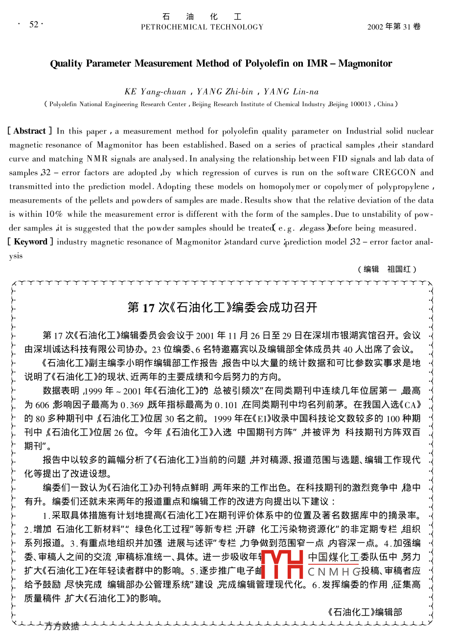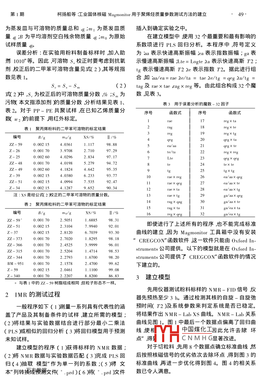 石油化工PETROCHEMICAL TECHNOLOGY2002年第31卷第1期工業(yè)固體核磁 Magmonitor用于聚烯烴質量參數測試方法的建立柯揚船,楊志濱,楊林娜北京化工研究院聚烯烴國家工程中心,北京100013)[摘要]利用實際采集的系列試樣在工業(yè)固體核醯 Mammonite(IMR)上建立了標準曲線在IMR上運行標樣的核磁信號后對FID信號與實驗數值之間的匹配使用32個誤差分析因子進行分析并在 Oregon軟件下運行回歸分析將結果轉化成儀器預測模型。結果表明測試相對偏差在10%以內數據重現性好而粉料與共聚物的測試誤差有待改進。將IMR測試結果與不同測試方法進行比較建議測試前對粉料進行脫氣與脫水處理關鍵詞]工業(yè)固體核磁標準曲線預測模型32因子誤差分析[文章編號]1000-81442002)1-0048-05[中圖分類號]TQ3172[文獻標識碼]A工業(yè)固體核磁IMR),首先由Aubυ urn interna-液進行沉淀并過濾所得濾出物經干燥至恒重即為tional公司發(fā)明現在由 Oxford- nstruments儀器RT-sRT-i和RT-s用于 C NMR測試標定等公司向世界推廣1北京化工研究院現有的IMR規(guī)序列。13CNMR測定條件去除H-質子耦合及是國內第一臺引進的設備可測定項目有聚烯烴的核的NOE效應取甲基的晶格馳豫時間為基準脈密度、二甲苯可溶物含量、熔體指數、共聚物中的乙沖間隔取3~5倍甲基的弛豫時間進行定量碳譜測烯或丙烯含量、聚苯乙烯含油度、添加劑含量等。定。濬劑及鎖場為氘代鄰-二氯苯。等規(guī)度Ⅱ以IMR的顯著優(yōu)點是克服液體核磁在測定聚烯烴結甲基三單元缊mm旳的譜峰強度的分數計。樹脂標構時只能采用絕對測定"的方法盧其它表征方法樣的庚烷等規(guī)指數參照GB2412-80。GPC測試在相比具有快速、靈活及實用性強的特點。PL-GPC-220C儀上進行。溶劑TCB,測試溫度本工作利用實際采集的系列試樣在IMR上建150℃,流率1.000ml/min;采用寬分布 Hamelin立等規(guī)度及共聚乙烯含量的測試方法標準;采用一階多項逼近擬合曲線,校正基線從實驗部分15.32~25.32min計算;標樣為寬分布PE。本工作對IM7~IM12進行GPC標定,確定其相對分子1.1原料和試劑質量相近。二甲苯可溶物實驗參照 ASTM D5492124-三氯苯TCB)AP級進口;鄰-二甲98標準操作條件與步驟:選取鄰-二甲苯,沸點苯,ACS級;氘代鄰-二氯苯百靈威試劑公司產。14℃;選擇長程沉降時間24h,恒溫水浴(25±1.2標樣制備0.5)℃添加劑校正BOPP樹脂粉料、粒料或共聚物試樣經標定后1.4計算作為標準試樣。其中試樣IM2、IMl4、IM15由Hi計算二甲苯可溶物的公式見式(1)mont工藝生產淇其余為國內各廠家的產品,包括共S,=(( Vho/Vb m2-mi)聚試樣IM12和IM13。IM1~IM6為切粒試樣Vo/V2×B)m0)×100%(1)IM7~IM5為粉料試樣。標樣以z"起頭BM等式1沖,S為試樣可溶物質量分數,%;Vt為溶劑特殊字頭的為實驗室合成試樣原始體積叫l(wèi)‘V·為用干確定可溶物的溶液體積,1.3試樣的表征nl v中國煤化工勺溶液體積ml;m2試樣的室溫可溶物RT-s)與不溶物(RT-i)CNMHG實驗將P試樣置于TCB溶劑中升溫至130℃溶[收稿日期]2001-05-24[修改稿日期12001-07-26[作者簡介]柯揚般(1964-)男安徽省巢湖市人搏士高級工程解保持此溫度2h以上然后將此熱溶液過濾濾師電話010-64216131-2621。液冷卻至室溫再過濾濾出物即為RT-i。在所收[基金項目]國家重點基礎研究發(fā)展規(guī)劃項目及北京化工研究院基集的濾液矸改廂對于濾液兩倍體積的丙酮對濾金資助項目第1期柯揚船等冮業(yè)固體核醯 Magmonitor用于聚烯烴質量參數測試方法的建立為蒸發(fā)皿與可溶物的質量總和g;m1為蒸發(fā)皿質插入到確定實驗之中。量g;B為平均溶劑空白殘余物質量g漂mo為原始在建立模型中使用32個最重要和最有影響的試樣質量系數項進行PLS回歸分析。本程序中符號定義誤差分析∶在實驗用粉料制備標樣時加入助為a表示快速高斯振幅細a表示指數振幅;ga表劑lo0″等。因此冋可溶物S。校正時要考慮到抗氧示慢速高斯振幅;te= Logte ta表示快速高斯T2劑校正后的二甲苯可溶物含量見式(2)其等規(guī)指表示慢速高斯T2e表示指數T2。據此進行組數見表1。合如a/ea= rae , te/.ta= tae te/tgS=S-S(2)tag及 rae x tae rag x reg等。由此組合構成32個魔式2),S為校正后的可溶物質量分數%;Sn為數見表3污物本文指添加劑的質量分數分析結果見表1表3用于誤差分析的魔數-32因子表2。對于PP-PE共聚試樣在已知乙烯質量分序號數式序號函數式數2的前提下用紅外標定。reg x ta表1聚丙烯粉料的二甲苯可溶物的標定結果18g×tg0.002154.0361ea/aa2.71097.29Z-250.002604.02962.834eg×qegZZ-480.0017094.72lg×tgZ-390.002154.03806.23393.770.002154.099492.47rae x gegZ-349.652ea/aa x tg注:Xs是經公式2)校正的二甲苯可溶物的質量分數表2聚丙烯粒料的二甲苯可溶物的標定結果ga aa x terao x taB/gXS/%Ol/0,001702.31047.994092.0即使進行了上述所有的程序,也不能完成標準2,81206.703993.30曲線的建立因為 Magmonitor工具箱中沒有安裝ZZ-3732.70201.829598.18CREGCON"函數軟件這一軟件只能由 Oxford In2,452999996ZZ-3150.001702.52041.471498.53struments公司提供。以下的模型就是在 Oxford InZZ-3440.001702,27931,6700struments公司提供了 CReGCON"函數軟件的情況BM-9510.001702.4700下建立的Z-3400.001708.82003建立模型餐與表1中的ZZ-59樹脂組成相同但粒子形態(tài)不一樣先用儀器測試粉料標樣的NMR-FID信號儀2IMR的測試過程器先預熱至少3h。通過檢測其核的自旋-自旋弛般程序如下(1測量一系列具有代表性的涵預時間(72服及系統(tǒng)參數來判定系統(tǒng)是否已穩(w