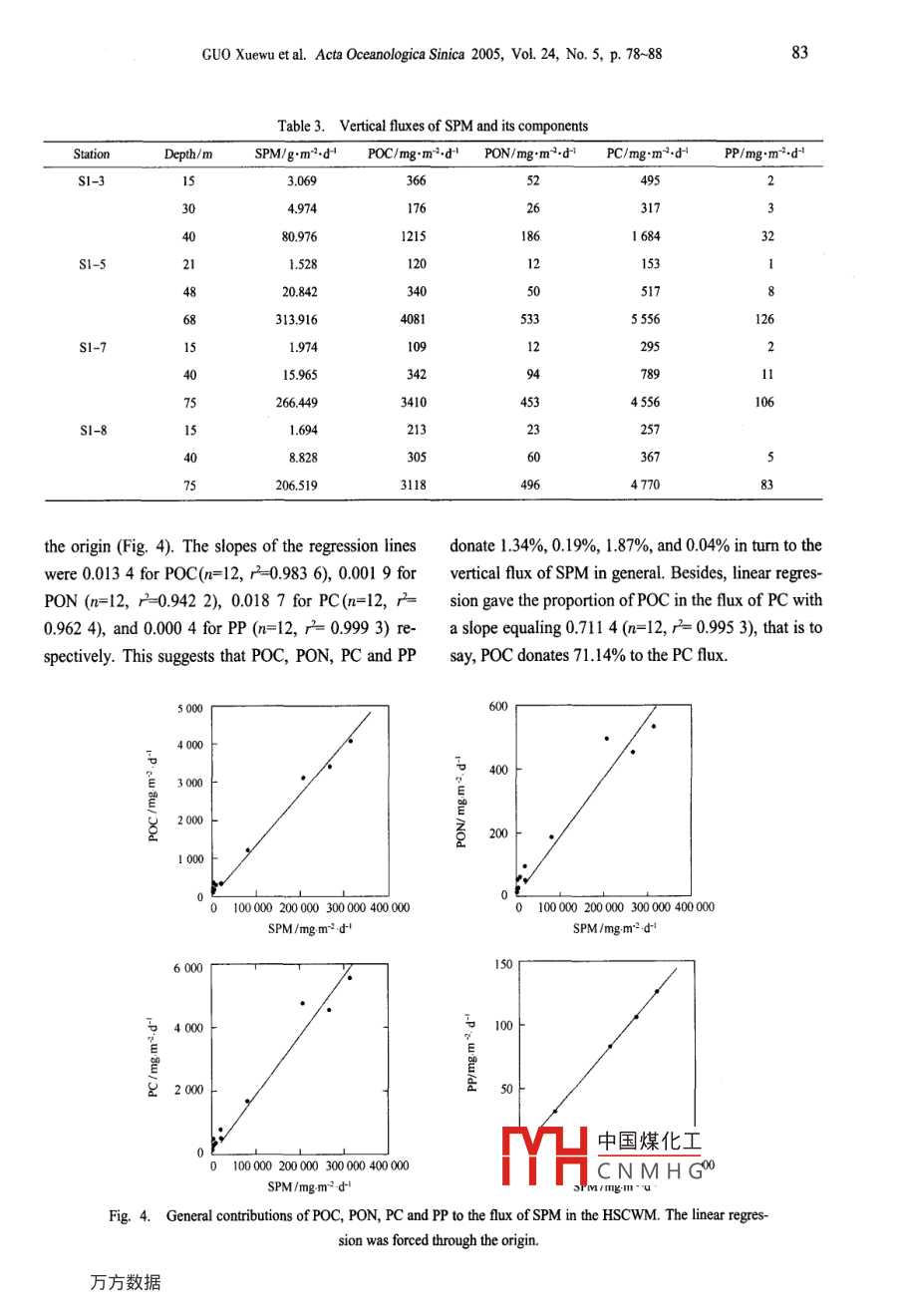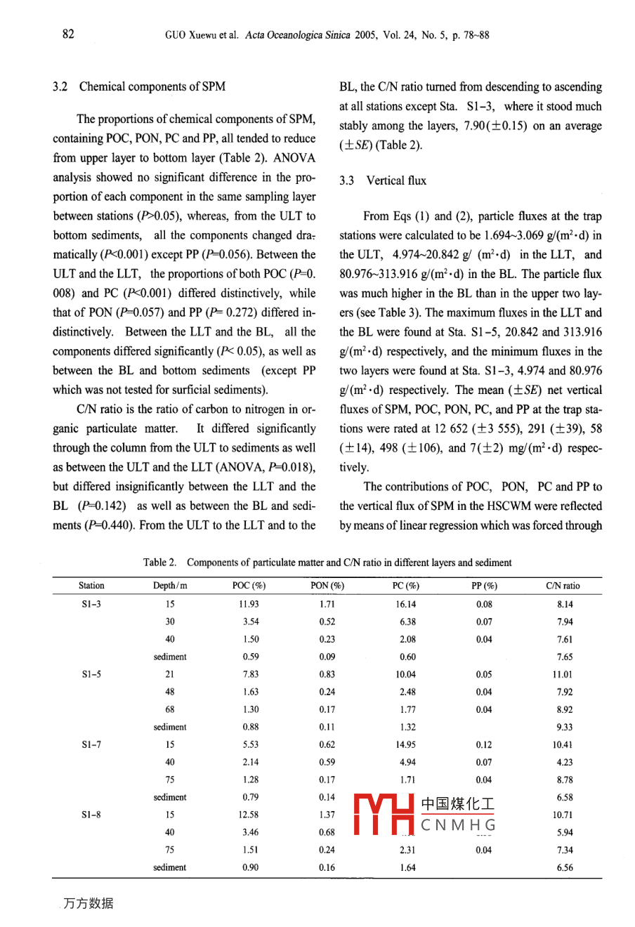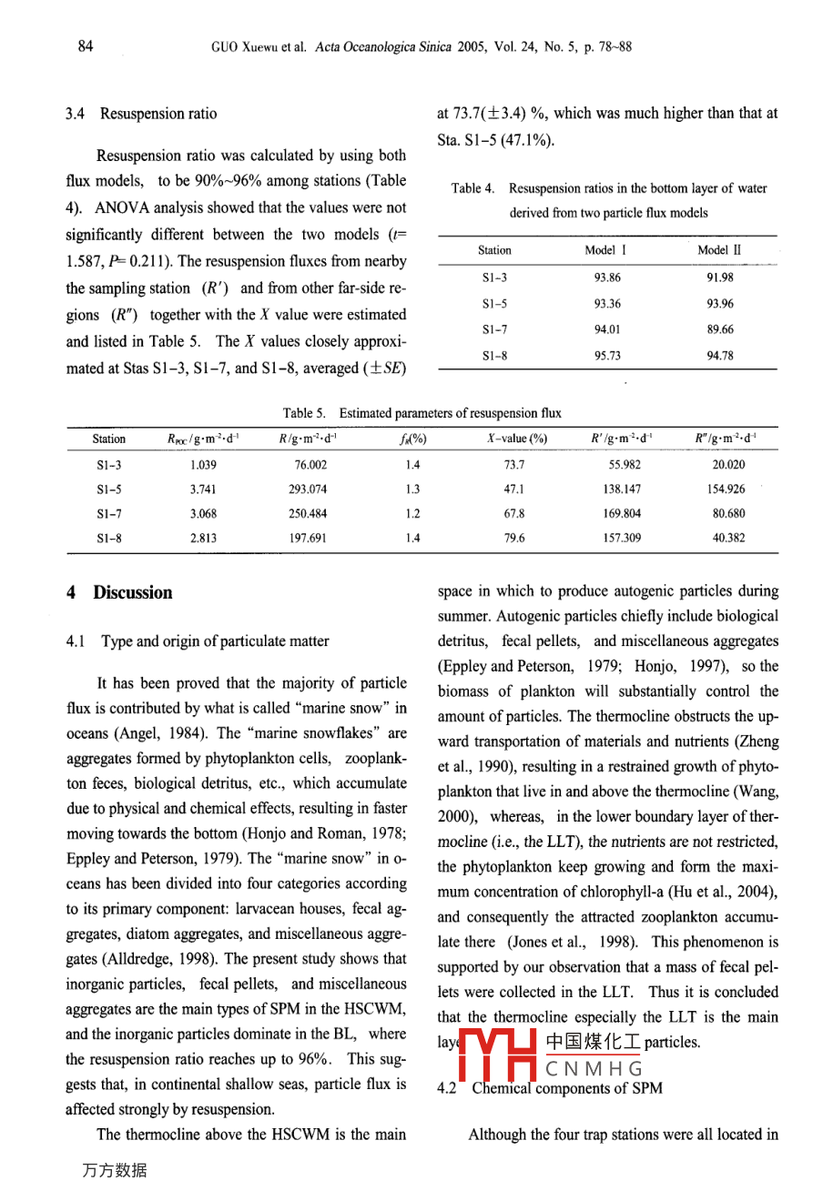 Acta Oceanologica Sinica 2005, Vol. 24, No.5, p. 78~88htp://www .occanpress .com.cnE- -mail: bhyxbe@263.netParticle flux through the Huanghai Sea cold water massGUO Xuewu!", ZHANG Yansong21. Yellow Sca Fisheries Research Institute, Chinese Academy of Fishery Sciences, Qingdao 266071, China2. Jiaozhou Environmental Protection Bureau, Jiaozhou 266300, ChinaReceived 14 April 2005; accepted 3 July 2005AbstractSetting particulate matter (SPM) was ollected by using sediment traps at four stations in a survey section from Qingdao to Cheju-do,across the Huanghai Sea cold water mass (HSCWM), in August 2002. The sediment traps were planted in three layers: the upper layerof the thermocline (ULT) above the HSCWM, the lower layer of the thermocline (LT), and the bottom layer of water column (BL).To determine the particle flux, the contents of organic carbon (POC), organic nitrogen (PON), total carbon (PC), and total phosphorous(PP) in SPM were analyzed, and two fux models(I and II) were improved to calculate the resuspension ratio, with an assumption inModel I that the vertical fux of SPM in the LLT equals the net vertical fux of SPM in the whole water column. AnX value, i.e, thefraction of the resuspension flux originating from the surficial sediments nearby the sampling station, was deduced from Model I toestimate the contribution of lateral currents to the total resuspension flux. The results showed that inorganic particles, fecal pellets, andmisellaneous aggregates were the major types of SPM in the HSCWM, and the contents of POC, PON, PC, and PP all decreased withwater depth. A great deal of fecal pellets found in the LLT indicatcs that the main space producing biogenic SPM is the thermocline,and especially the LLT, where the CN ratio is lower than that in the ULT. The resuspension ratios, 90%~ 96% among stations, implystrong impact of resuspension on particle fux in the BL. These values were not significantly different between the two fux models,suggesting that the hypothesis in Model I that the fux in the LLT equaling the net flux to the bottom is aceptabl for shallow waterswith sratification like the HSCWM. The POC export ratio from the HSCWM ranges from 35% to 68%。It benefts fom the shortsinking distance in shallow water. The upwelling in the HSCWM enhanced the POC flux through the water mass, and the lateralcurrents provides up to being greater than 50% of resuspension fux in the BL according to evaluation of the X value.Key words: stling particulate matter, particle fux model, resuspension ratio, thermocline, Huanghai Sea Cold Water Mass1 Introductiontonic tests and carcasses. The efficiency of biologicalpump just lies on how much atmospheric carbon diox-Particle flux is a subject in the ocean flux re-ide is transported to bottom by planktonic organismssearch because of its significant function in the global(Wang, 2003). It has been proved that the flux of pri-ecosystem (SCOR, 1990). Atmospheric carbon dioxidemary particles depends on the plankton living in the e-is regulated by the ocean working as a biological pumpuphotic zone (Bishop et al, 1977), and is susbtantially(Longhurst and Hrrison, 1989), in which phytoplank-affected by stratifcation (Weyhenmeyer, 1996). Auto-ton absorb carbon dioxide and translate them, throughgem |中國煤化τε into larger ones dur-a series of biological, chemical, and physical process-CNMH(; speed (Honjo, 1997),es, partly into particulates, such as fecal pellets, plank-and panuics ural ICaul uwu can be easily driven bywind, wave, tide, and bioturbulence into resuspension* Corresponding author, E -mail: guoxw@ysfri.ac.cnmode in shallow waters (Zheng et al., 1990). The re-GUO Xuewu et al. Acta Oceanologica Sinica 2005, Vol. 24, No. 5, p. 78~8879suspended particles release nutrients back to water col-119° 120° 121° 122° 123° 124° 125’ 126" 127"Eumn due to decomposition and mineralization and pro-,ShandongPeninsuls37°mote growth of phytoplankton, but increase water tur-bidity and restrain photosynthesis on the other hand, so36°+Huanghai Sea●51-3that influence on ecosystem (Bloesch, 1995; Wainright3S*and Hopkinson, 1997). In China seas, analysis of set-4* t●S1-7tling particulate matter collected with large openingChinatime-series sediment traps employed in the northern33cheju-doSouth China Sea revealed that the particulate organicFig. 1. Survey section and sampling stations in thematter was chiefly from the synchronous planktonHuanghai Sea.(Chen et al., 1996). That is also true in the East ChinaSea (Zhan et al, 1993), where particulate matter con-Station S1-3SI-5 .S1-7 S1-8tributed the majority of carbon transportation over the|2:continental shelf, and the particle composition and flux20-225.225201s2°in the bottom layer were influenced intensively by the4010125resuspension process (Song, 1997). The purpose of our5oresearch is to realize the status of the particle flux80through the cold water mass, which leads a special en-100 20000 400vironment in the Huanghai Sea.Distance /kmFig. 2. Vertical distribution of water temperature in the survey2 Materials and methodssection with sampling stations signed above. The 10 C isothermlines line out the two cold centers of the cold water mass..1 Study areaappears when the HSCWM grows up is suggested toIn August 2002,R/V Beidou conducted a multi-be a result of interaction between the warm and coastaldisciplinary survey in the Huanghai Sea. A survey sec-currents (Mao et al, 1986).tion was set from Qingdao, China, to Cheju-do, Korea,across the HSCWM. In this section, CTD data were2.2 Sampling and analysiscollected at 10 stations, and SPM was collected at fourstations marked S1-3, S1-5, S1-7, andS1-8 (Fig. I).To collect settling materials, the sediment traps,The HSCWM is a mass of winter water that is detainedeach equipped with five Plexiglas cylinders (6.5 cm inin the central trough of the Huanghai Sea when theinner diameter, 100 cm in height),were employed.surface water temperature begins to increase in spr