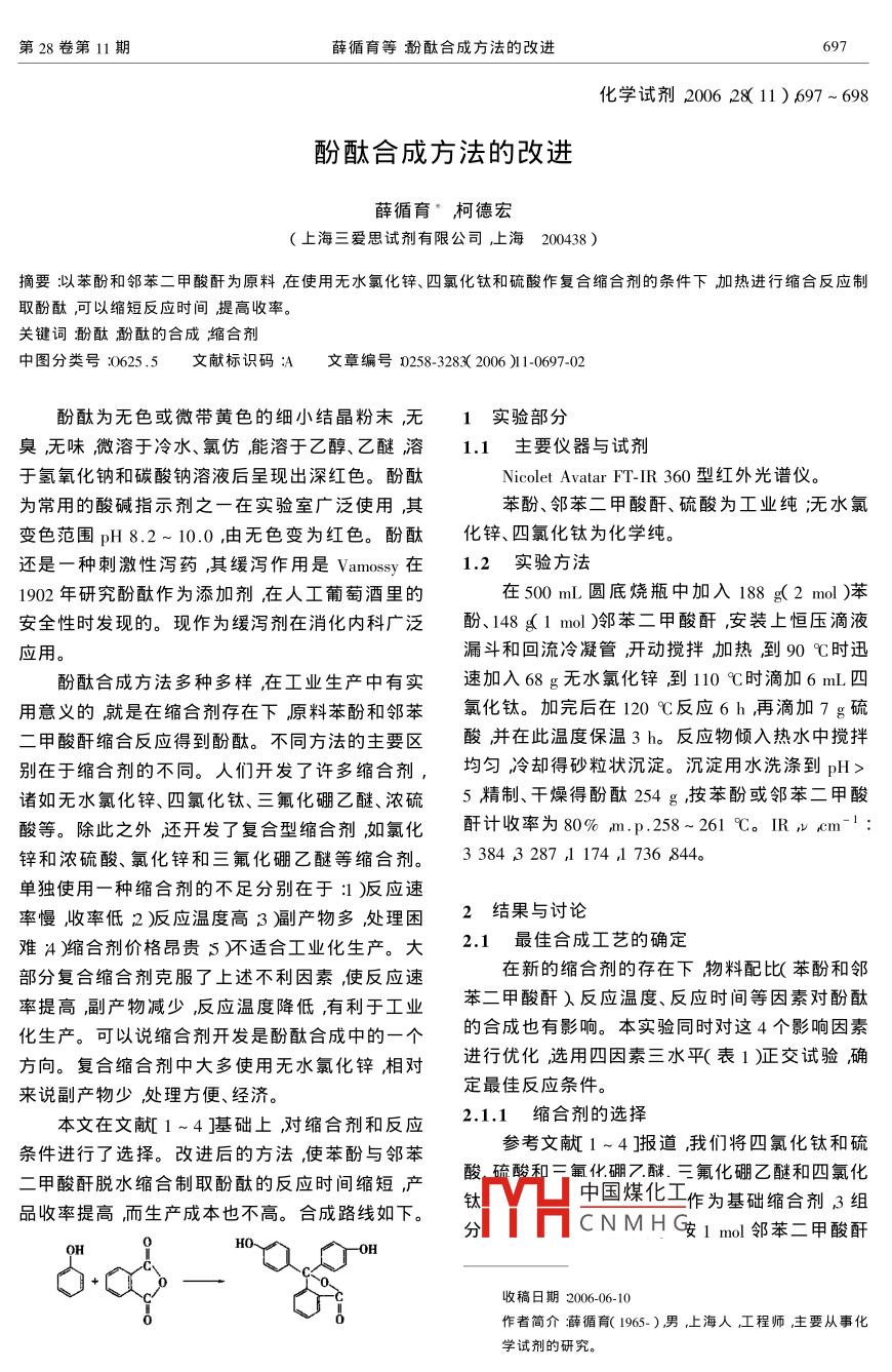 第28卷第1期薛循育等酚酞合成方法的改進(jìn)697化學(xué)試劑,2006 28( 11 ) 697 ~ 698酚酞合成方法的改進(jìn)薛循育*柯德宏(上海三愛(ài)思試劑有限公司上海200438)摘要:以苯酚和鄰苯二甲酸酐為原料在使用無(wú)水氯化鋅、四氯化鈦和硫酸作復(fù)合縮合劑的條件下加熱進(jìn)行縮合反應(yīng)制取酚酞可以縮短反應(yīng)時(shí)間提高收率。關(guān)鍵詞酚酞酚酞的合成縮合劑中圖分類號(hào):0625.5文獻(xiàn)標(biāo)識(shí)碼:A文章編號(hào)0258-3283( 2006 )11-0697-02酚酞為無(wú)色或微帶黃色的細(xì)小結(jié)晶粉末,無(wú)1實(shí)驗(yàn)部分臭,無(wú)味,微溶于冷水、氯仿能溶于乙醇、乙醚溶1.1主要儀器與試劑于氫氧化鈉和碳酸鈉溶液后呈現(xiàn)出深紅色。酚酞Nicolet Avatar FT-IR 360型紅外光譜儀。為常用的酸堿指示劑之一在實(shí)驗(yàn)室廣泛使用其苯酚、鄰苯二甲酸酐、硫酸為工業(yè)純;無(wú)水氯變色范圍pH8.2~ 10.0 ,由無(wú)色變?yōu)榧t色。酚酞化鋅、四氯化鈦為化學(xué)純。還是-種刺激性瀉藥其緩瀉作用是Vamossy在.2實(shí)驗(yàn)方法1902年研究酚酞作為添加劑在人工葡萄酒里的在500mL圓底燒瓶中加入188g(2mol)苯.安全性時(shí)發(fā)現(xiàn)的?,F(xiàn)作為緩瀉劑在消化內(nèi)科廣泛酚、148g1mol)鄰苯二甲酸酐,安裝上恒壓滴液應(yīng)用。漏斗和回流冷凝管開(kāi)動(dòng)攪拌加熱到90 C時(shí)迅酚酞合成方法多種多樣,在工業(yè)生產(chǎn)中有實(shí).速加入68g無(wú)水氯化鋅到110C時(shí)滴加6mL四用意義的就是在縮合劑存在下,原料苯酚和鄰苯氯化鈦。加完后在120 C反應(yīng)6h再滴加7 g硫二甲酸酐縮合反應(yīng)得到酚酞。不同方法的主要區(qū)酸并在此溫度保溫3 h。反應(yīng)物傾入熱水中攪拌別在于縮合劑的不同。人們開(kāi)發(fā)了許多縮合劑,均勻冷卻得砂粒狀沉淀。沉淀用水洗滌到pH>諸如無(wú)水氯化鋅、四氯化鈦、三氟化硼乙醚、濃硫5精制、干燥得酚酞254 g ,按苯酚或鄰苯二甲酸酸等。除此之外還開(kāi)發(fā)了復(fù)合型縮合劑,如氯化酐計(jì)收率為80% m.p.258~261 C。IR 兒cm-1 :鋅和濃硫酸、氯化鋅和三氟化硼乙醚等縮合劑。3384328711741736844。.單獨(dú)使用一種縮合劑的不足分別在于:1 )反應(yīng)速率慢,收率低2)反應(yīng)溫度高3)副產(chǎn)物多,處理困2結(jié)果 與討論難4)縮合劑價(jià)格昂貴5 )不適合工業(yè)化生產(chǎn)。大2.1最佳合成工藝的確定部分復(fù)合縮合劑克服了上述不利因素,使反應(yīng)速在新的縮合劑的存在下物料配比(苯酚和鄰率提高副產(chǎn)物減少,反應(yīng)溫度降低,有利于工業(yè)苯二甲酸酐)反應(yīng)溫度、反應(yīng)時(shí)間等因素對(duì)酚酞化生產(chǎn)??梢哉f(shuō)縮合劑開(kāi)發(fā)是酚酞合成中的一個(gè)的合成也有影響。本實(shí)驗(yàn)同時(shí)對(duì)這4個(gè)影響因素方向。復(fù)合縮合劑中大多使用無(wú)水氯化鋅,相對(duì)進(jìn)行優(yōu)化選用四因素三水平(表1 )正交試驗(yàn)確定最佳反應(yīng)條件。來(lái)說(shuō)副產(chǎn)物少處理方便、經(jīng)濟(jì)。.本文在文獻(xiàn)[1~4 ]基礎(chǔ)上,對(duì)縮合劑和反應(yīng)2.1.1縮合 劑的選擇條件進(jìn)行了選擇。改進(jìn)后的方法使苯酚與鄰苯參考文獻(xiàn)1~4]報(bào)道,我們將四氯化鈦和硫二甲酸酐脫水縮合制取酚酞的反應(yīng)時(shí)間縮短產(chǎn)酸。硫酸和二氟化硼7.醚.三氟化硼乙醚和四氯化中國(guó)煤化工作為基礎(chǔ)縮合劑3組品收率提高,而生產(chǎn)成本也不高。合成路線如下。分||YHCNMH安1 mol鄰苯二甲酸酐OHH0-a)H收稿日期2006-06-10o作者簡(jiǎn)介:薛循育( 1965-)男上海人工程師,主要從事化學(xué)試劑的研究。698化學(xué)試劑2006年為148g計(jì)根據(jù)文獻(xiàn)13A報(bào)道的配比無(wú)水氯3結(jié)論化鋅加入量為68 g三氟化硼乙醚加入36 g ,四氯對(duì)于苯酚與鄰苯二甲酸酐進(jìn)行縮合反應(yīng)制取.化鈦的加入量為6mL硫酸的加入量為7 g。即我酚酞的工藝通過(guò)改進(jìn)縮合劑,即在以無(wú)水氯化鋅們使用的新縮合劑按1 mol鄰苯二甲酸酐計(jì)為:為主要縮合劑的基礎(chǔ)上,再加入四氯化鈦和硫酸1 )68 g無(wú)水氯化鋅、6 mL四氯化鈦、7 g硫酸2 )68這兩種活性催化劑,使反應(yīng)只需9h就能順利完.g無(wú)水氯化鋅、7 g硫酸、36 g三氟化硼乙醚3 )68成,收率比文獻(xiàn)報(bào)道的無(wú)水氯化鋅加四氯化鈦[4]g無(wú)水氯化鋅、36 g三氟化硼乙醚、6 mL四氯化或硫酸12]-種活性催化劑明顯提高,且催化劑用量很少原料苯酚與硫酸生成樹脂狀雜質(zhì)和苯2.1.2物料配比酚磺酸副產(chǎn)物的幾率減少。另外由于四氯化鈦根據(jù)文獻(xiàn)報(bào)道,使用苯酚和鄰苯二甲酸酐為的用量少對(duì)產(chǎn)品進(jìn)-步精制的影響也小。原料合成酚酞,苯酚和鄰苯二甲酸酐的物質(zhì)的量總之,在2 mol苯酚和1 mol鄰苯二甲酸酐比按2.0:1.2.2:11.8:1進(jìn)行。中90C時(shí)快速加入68g無(wú)水氯化鋅,加熱到2.1.3反應(yīng)溫 度110 C時(shí)滴加6 mL四氯化鈦縮合劑,在120 C反文獻(xiàn)報(bào)道的反應(yīng)溫度基本上都在80~ 140 C應(yīng)6h后緩慢滴加7g硫酸脫水縮合3h,反應(yīng)產(chǎn)之間。我們選擇90、110、130 C 3個(gè)溫度進(jìn)行實(shí)驗(yàn)。物用水洗滌至pH>5后精制、干燥得到酚酞,收2.1.4反 應(yīng)時(shí)間率明顯提高反應(yīng)時(shí)間也大為減少。文獻(xiàn)報