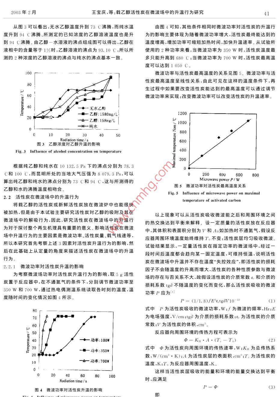 第3卷第1期Vol. 3. No. I2003年2月Journal of Safety and EnvironmentFeb,2003文章編號(hào):1009-6094(2003)01-0040-04載乙醇活性炭在微波場(chǎng)中的升溫行為研究王寶慶1,葛嬡群2,鄭曉明2(1西安建筑科技大學(xué)環(huán)境工程系,西安710055:2河北省灤縣環(huán)保局,河北灤縣063700)摘要:研究了載乙醇活性炭在微波場(chǎng)中的升溫行為。主要包括水和乙醇在微波場(chǎng)中的升溫情況,以及微波功率、活性炭量、氮?dú)饩€速對(duì)活性炭升溫行為的影。結(jié)果表明水與乙醇在微波場(chǎng)中能吸收微波能,從而使其溫度升高。微波功率越大,活性炭升溫越快,活性炭最高溫度也更高?;钚蕴可儆?g時(shí)溫度上升速率隨活性炭量的增加而加快,活性炭量多于5g時(shí)則相反。氬氣線速增加.活性炭升溫速率下降,活性炭最高溫度降低關(guān)鍵詞:微波加熱;活性炭再生;乙醇中圖分類號(hào):X703.1獻(xiàn)標(biāo)識(shí)碼:A醇能吸收微波能并將其轉(zhuǎn)變?yōu)闊崮?而且微波功率不同,溫度引言升高速率也不同。功率越大,乙醇溫度上升越快。如功率為700乙醇生產(chǎn)過程中產(chǎn)生的淡酒液,主要含有乙醇(5%~W時(shí),只需10s就上升到73C沸騰而功率為100W時(shí),則需8%1)及少量酯類和酸類物質(zhì)。目前對(duì)此類淡酒液主要采用排75才能上升到73C沸騰放的方法處理。若采用吸附法,可將這類淡酒液回收山傳統(tǒng)變溫解吸可通過間接加熱吸附劑或直接與熱氣體接觸來實(shí)現(xiàn)。對(duì)活性炭,傳統(tǒng)變溫解吸法需加熱的時(shí)間很長(zhǎng)并且能量消耗大。總之,吸附法的經(jīng)濟(jì)性主要取決于吸附劑的再生方式熱再生方法可以通過引入微波能加熱被解吸的物質(zhì)得到改進(jìn),與傳統(tǒng)的熱再生方法相比,微波加熱有以下優(yōu)點(diǎn)2:1)熱量的引入通過電磁能的傳輸直接進(jìn)入吸附劑內(nèi)部,即體積加熱;2)微波加熱溫度均勻;3)解吸速度快:4)與吸附劑的電子損失相比,被蒸發(fā)吸附質(zhì)的電子損失更高,因此能實(shí)現(xiàn)對(duì)吸附質(zhì)1—微波爐(2450MHz);2—石英玻璃管反應(yīng)器的選擇加熱3一鎧裝熱電偶:4—數(shù)顯溫度指示儀利用微波能解吸載乙醇活性炭,解吸時(shí)間由于微波能的利圖1再生與測(cè)溫部分裝置用可以成倍縮短。微波解吸的另一個(gè)特點(diǎn)是可以回收乙醇,且Fig. 1 Device of reger無其他副產(chǎn)物。相對(duì)傳統(tǒng)的加熱方式,微波解吸再生吸附劑對(duì)于乙醇這類極性物質(zhì)是一種經(jīng)濟(jì)的選擇,微波解吸是再生活性炭的一種很有發(fā)展前景和優(yōu)勢(shì)的再生手段1試驗(yàn)儀器與裝置EO1.1儀器一功率:1009rPτ00型微波爐,特制石英玻璃管,電光分析天平1.2試驗(yàn)裝00一與書:350w再生與測(cè)溫部分裝置如圖1所示。合一功率:7002試驗(yàn)結(jié)果2.1水與乙醇在微波場(chǎng)中的升溫行為Radiation time圖2微波功率對(duì)無水乙醇升溫的影響考察載乙醇活性炭在微波場(chǎng)中的升溫行為,主要考察無水Fig. 2 Influence of microwave power on pure alcohol乙醇和活性炭在微波場(chǎng)中的升溫行為,為后續(xù)試驗(yàn)作準(zhǔn)備temperature不同功率下無水乙醇在微波場(chǎng)中的升溫行為如圖2所示。圖2(分析樣品體積為20mL)表明,將分析純乙醇液體置在微波功率350W、溶液體積20mL時(shí),純水和濃度不同于特制石英玻璃管里放在微波場(chǎng)中,乙醇溫度會(huì)上升,說明乙的乙醇溶液在微波場(chǎng)中的升溫行為如圖3所示2003年2月王寶慶,等:載乙醇活性炭在微波場(chǎng)中的升溫行為研究41從圖3可以看出,無水乙醇溫度升到73C沸騰,而純水溫由圖4可知,其他條件相同時(shí)微波功率對(duì)活性炭的升溫行度升到⑨4℃沸騰、所測(cè)定的已知濃度的乙醇溶液溫度也是升為旳影響主要體現(xiàn)為隨著微波功率増大,活性炭最終能達(dá)到的到Ω4℃沸騰。由乙醇一水溶液的沸點(diǎn)組成圖可以得岀,乙醇在溫度增高,增加功率可縮短加熱時(shí)間,加快升溫速率。從試驗(yàn)所液相中的含量等于1%時(shí),乙醇溶液的沸點(diǎn)為93.10C,所以所使用的2種功率來看,當(dāng)微波功率為350W時(shí),活性炭溫度最測(cè)的2種濃度的乙醇溶液的沸點(diǎn)與純水的沸點(diǎn)基本一致。多只能升高到680C;當(dāng)微波功率為700W時(shí),活性炭最高溫度可以達(dá)到1050C微波功率與活性炭最高溫度的關(guān)系見圖5。微波功率與活性炭最高溫度呈線性關(guān)系,由此可見在這樣的溫度條件下,再生過程中如果要改變活性炭能達(dá)到的最高溫度可以通過調(diào)節(jié)微波功率來實(shí)現(xiàn);改變微波功率可以改變活性炭的升溫速率-無水乙醉一一乙醇:1580mg/L200乙醇:158mg/L000一純水Radiation time/s600圖3乙醇濃度對(duì)乙醇升溫的影響Fig. 3 Influence of alcohol concentration on temperature根據(jù)純乙醇和純水在10132.5Pa下的沸點(diǎn)分別為78.3C和100C,而昆明所處的當(dāng)?shù)卮髿鈮簭?qiáng)為8079.3Pa,可以算出純乙醇和純水的沸點(diǎn)分別為73C和94C,這與所測(cè)得的Microwave power P/w圖5微波功率對(duì)活性炭最高溫度關(guān)系乙醇和水的沸騰溫度相吻合2.2活性炭在微波場(chǎng)中的升溫行為temperature of activated carbon將載乙醇的活性炭或新鮮活性炭放在微波爐中也能很快被加熱,但是由于本試驗(yàn)主要研究活性炭對(duì)乙醇的吸附及其在場(chǎng)中的解吸行