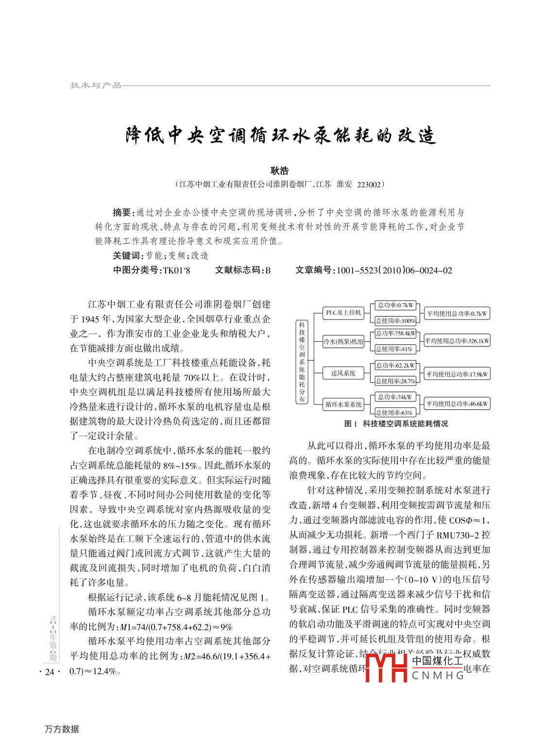 技術與產(chǎn)品-降低中央空調循環(huán)水泵能耗的改造(江蘇中煙工業(yè)有限責任公司淮陰卷煙廠,江蘇淮安223002)摘要:通過對企業(yè)辦公樓中央空調的現(xiàn)場調研,分析了中央空調的循環(huán)水泵的能源利用與轉化方面的現(xiàn)狀、特點與存在的問題,利用變頻技術有針對性的開展節(jié)能降耗的工作,對企業(yè)節(jié)能降耗工作具有理論指導意義和現(xiàn)實應用價值。關鍵詞:節(jié)能;變頻;改造中圖分類號:TK01+8文獻標志碼:B文章編號:1001-5523( 2010 )06- -0024-02江蘇中煙工業(yè)有限責任公司淮陰卷煙廠創(chuàng)建f PIC及上位機總功率:0.7kWF[平均使用總功率0.7kW于1945年,為國家大型企業(yè),全國煙草行業(yè)重點企-總使用率:100業(yè)之一,作為淮安市的工業(yè)企業(yè)龍頭和納稅大戶,r總功率:758.4kw在節(jié)能減排方面也做出成績。樓|一冷水(熱泵機組L總使用率:41% }平均使用總功率:326.1kWy中央空調系統(tǒng)是工廠科技樓重點耗能設備,耗「總功率:62.2kW]電量大約占整座建筑電耗量70%以上。在設計時,送風系統(tǒng). 總使用率28.793]|平均使用總功率:179kW中央空調機組是以滿足科技樓所有使用場所最大冷熱量來進行設計的,循環(huán)水泵的電機容量也是根{循環(huán)水泵系統(tǒng)}f總功率:74kWt平均使用總功率:46.6kW一總使用率:63%]據(jù)建筑物的最大設計冷熱負荷選定的,而且還都留圖1科技樓空調系統(tǒng)能耗情況了一定設計余量。在電制冷空調系統(tǒng)中,循環(huán)水泵的能耗一般約從此可以得出,循環(huán)水泵的平均使用功率是最占空調系統(tǒng)總能耗量的8%~15%。因此,循環(huán)水泵的高的。循環(huán)水泵的實際使用中存在比較嚴重的能量正確選擇具有很重要的實際意義。但實際運行時隨浪費現(xiàn)象,存在比較大的節(jié)約空間。著季節(jié)、晝夜、不同時間辦公間使用數(shù)量的變化等針對這種情況,采用變頻控制系統(tǒng)對水泵進行因素,導致中央空調系統(tǒng)對室內(nèi)熱源吸收量的變改造,新增4臺變頻器,利用變頻按需調節(jié)流量和壓化,這也就要求循環(huán)水的壓力隨之變化?,F(xiàn)有循環(huán)力,通過變頻器內(nèi)部濾波電容的作用,使COSφ≈1,水泵始終是在工頻下全速運行的,管道中的供水流從而減少無功損耗。新增-個西門子RMU730-2控量只能通過閥廣]或回流方式調節(jié),這就產(chǎn)生大量的制器,通過專用控制器來控制變頻器從而達到更加截流及回流損失,同時增加了電機的負荷,白白消合理調節(jié)流量,減少旁通閥調節(jié)流量的能量損耗,另耗了許多電量。外在傳感器輸出端增加一個(0~10V)的電壓信號根據(jù)運行記錄,該系統(tǒng)6~8月能耗情況見圖1。隔離變送器,通過隔離變送器來減少信號干擾和信循環(huán)水泵額定功率占空調系統(tǒng)其他部分總功號衰減,保證PLC信號采集的準確性。同時變頻器率的比例為:M1-74/0.7+758.4+62.2)>-9%的軟啟動功能及平滑調速的特點可實現(xiàn)對中央空調循環(huán)水泵平均使用功率占空調系統(tǒng)其他部分的平穩(wěn)調節(jié),并可延長機組及管組的使用壽命。根平均使用總功率的比例為:M2=46.6(19.1+356.4+據(jù)反復計算論證,結合行如¥5驗刀元業(yè)權威數(shù)中國煤化工. 24. 0.7)≈12.4%。據(jù),對空調系統(tǒng)循環(huán)MYHCNMH G電率在耿浩,降低中央空調循環(huán)水泵能耗的改造-技術與產(chǎn)品表1改造后電量統(tǒng)計數(shù)kW.h6月份電量7月份電量8月份電量平均電量空調系統(tǒng)(除循環(huán)水泵外)41 36498 584.2107 546.482 498.2循環(huán)水泵2 895.58 875.39 313.57028.130%以上。8.5%。經(jīng)過改造,實際使用中循環(huán)水泵能耗占空調為檢查實際水泵改造后的節(jié)能效果,作者在改系統(tǒng)其他總能耗的比例從改造前的12.4%減到改造造完成后3個月內(nèi)對整個空調系統(tǒng)和4臺循環(huán)水泵后的8.5% ,效果明顯。進行電能計量。具體統(tǒng)計數(shù)據(jù)見表1。實際使用中循環(huán)水泵能耗占空調系統(tǒng)其它能耗收稿 日期:2010-05-13比為:7 028.1/82 498.2-8.5%,即使用功率比為<<<<<<<<<<<<<<<<<<<<<<<<<<<<<+<<<<<<<<<<<<<<<<+<<