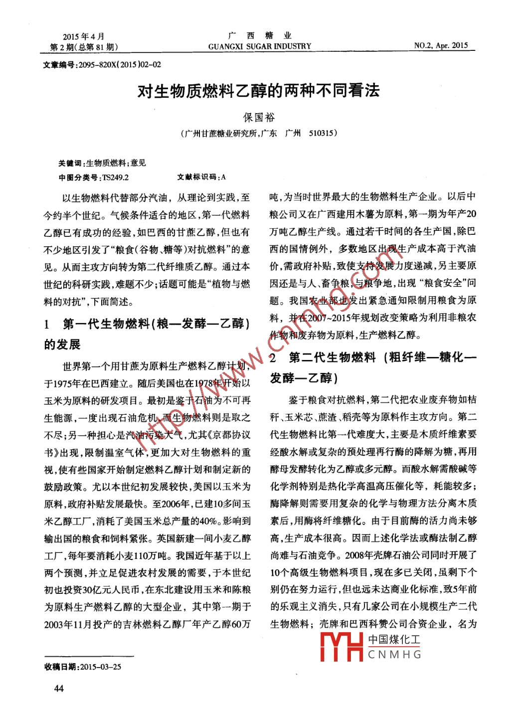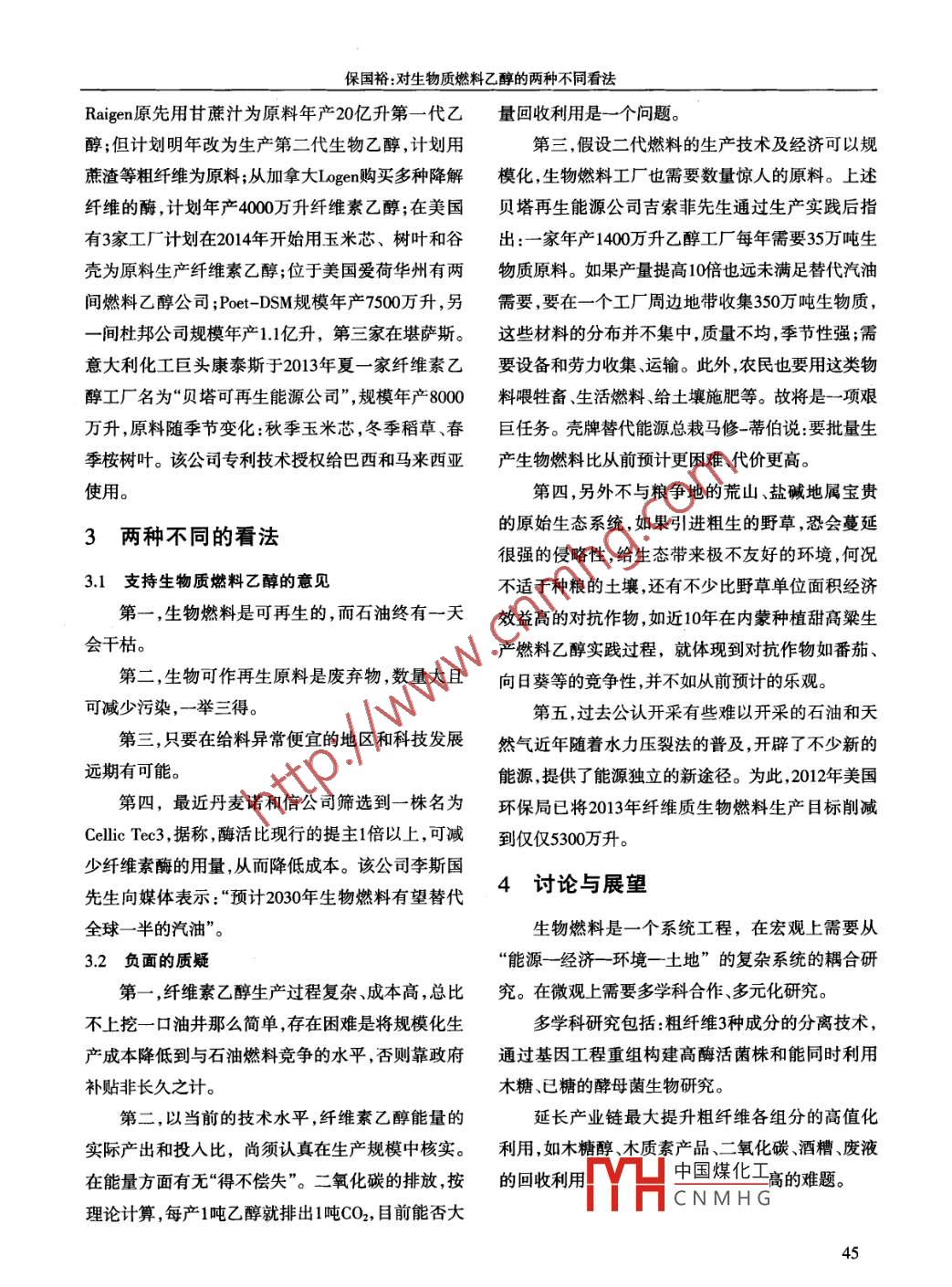 2015年4月廣西糖業(yè)第2期(總第81期)GUANGXI SUGAR INDUSTRYNO. 2, Apr. 201文章編號:2095-820X(2015)02-02對生物質(zhì)燃料乙醇的兩種不同看法保國裕(廣州甘蔗糖業(yè)研究所,廣東廣州510315)關(guān)鍵詞:生物質(zhì)燃料;意見中圖分類號:TS249.2文獻(xiàn)標(biāo)識碼:A以生物燃料代替部分汽油,從理論到實踐,至噸,為當(dāng)時世界最大的生物燃料生產(chǎn)企業(yè)。以后中今約半個世紀(jì)。氣候條件適合的地區(qū),第一代燃料糧公司又在廣西建用木薯為原料,第一期為年產(chǎn)20乙醇已有成功的經(jīng)驗,如巴西的甘蔗乙醇但也有萬噸乙醇生產(chǎn)線。通過若干時間的各生產(chǎn)國除巴不少地區(qū)引發(fā)了“糧食(谷物糖等)對抗燃料的意西的國情例外,多數(shù)地區(qū)出現(xiàn)生產(chǎn)成本高于汽油見。從而主攻方向轉(zhuǎn)為第二代纖維質(zhì)乙醇。通過本價,需政府補(bǔ)貼,致使支持發(fā)展力度遞減,另主要原世紀(jì)的科研實踐難題不少;話題可能是“植物與燃因還是與人、畜爭糧,與糧爭地,出現(xiàn)“糧食安全問料的對抗”,下面簡述。題。我國農(nóng)業(yè)部也發(fā)出緊急通知限制用糧食為原1第一代生物燃料(糧一發(fā)酵一乙醇)料,并在20020年規(guī)劃改變策略為利用非糧農(nóng)作物和廢棄物為原料,生產(chǎn)燃料乙醇。的發(fā)展世界第一個用甘蔗為原料生產(chǎn)燃料乙醇計劃,2第二代生物燃料(粗纖維一糖化于75年在巴西建立。隨后美國也在1978年開始以發(fā)酵一乙醇玉米為原料的研發(fā)項目。最初是鑒于石油為不可再鑒于糧食對抗燃料,第二代把農(nóng)業(yè)廢棄物如桔生能源,一度出現(xiàn)石油危機(jī),而生物燃料則是取之稈、玉米芯、蔗渣、稻殼等為原料作主攻方向。第二不盡;另一種擔(dān)心是汽油污染大氣,尤其《京都協(xié)議代生物燃料比第一代難度大,主要是木質(zhì)纖維素要書》出現(xiàn),限制溫室氣體,更加大對生物燃料的重經(jīng)酸水解或復(fù)雜的預(yù)處理再行酶的降解為糖,再用視,使有些國家開始制定燃料乙醇計劃和制定新的酵母發(fā)酵轉(zhuǎn)化為乙醇或多元醇。而酸水解需酸堿等鼓勵政策。尤以本世紀(jì)初發(fā)展較快,美國以玉米為化學(xué)劑特別是熱化學(xué)高溫高壓催化等,耗能較多;原料,政府補(bǔ)貼發(fā)展最快。至2006年,已建10多間玉酶降解則需要用復(fù)雜的化學(xué)與物理方法分離木質(zhì)米乙醇工廠,消耗了美國玉米總產(chǎn)量的40%影響到素后,用酶將纖維糖化。由于目前酶的活力尚未夠輸出國的糧食和飼料緊張。英國新建一間小麥乙醇高,生產(chǎn)成本很高。因而上述化學(xué)法或酶法制乙醇工廠,每年要消耗小麥110萬噸。我國近年基于以上尚難與石油競爭。2008年殼牌石油公司同時開展了兩個預(yù)測,并立足促進(jìn)農(nóng)村發(fā)展的需要,于本世紀(jì)10個高級生物燃料項目,現(xiàn)在多已關(guān)閉,雖剩下個初也投資30億元人民幣,在東北建設(shè)用玉米和陳糧別仍在努力運(yùn)行,但也遠(yuǎn)未達(dá)商業(yè)化標(biāo)準(zhǔn)致5年前為原料生產(chǎn)燃料乙醇的大型企業(yè),其中第一期于的樂觀主義消失,只有幾家公司在小規(guī)模生產(chǎn)二代2003年1月投產(chǎn)的吉林燃料乙醇廠年產(chǎn)乙醇60萬生物燃料;殼牌和巴西科贊公司合資企業(yè),名為中國煤化工CNMHG收稿日期:2015-03-25保國裕:對生物質(zhì)燃料乙醇的兩種不同看法Raige原先用甘蔗汁為原料年產(chǎn)20億升第一代乙量回收利用是一個問題。醇;但計劃明年改為生產(chǎn)第二代生物乙醇,計劃用第三,假設(shè)二代燃料的生產(chǎn)技術(shù)及經(jīng)濟(jì)可以規(guī)蔗渣等粗纖維為原料;從加拿大 Logen購買多種降解?;?生物燃料工廠也需要數(shù)量驚人的原料。上述纖維的酶,計劃年產(chǎn)4000萬升纖維素乙醇;在美國貝塔再生能源公司吉索菲先生通過生產(chǎn)實踐后指有3家工廠計劃在2014年開始用玉米芯、樹葉和谷出:一家年產(chǎn)1400萬升乙醇工廠每年需要35萬噸生殼為原料生產(chǎn)纖維素乙醇;位于美國愛荷華州有兩物質(zhì)原料。如果產(chǎn)量提高10倍也遠(yuǎn)未滿足替代汽油間燃料乙醇公司;Poet-DSM規(guī)模年產(chǎn)7500萬升,另需要,要在一個工廠周邊地帶收集350萬噸生物質(zhì),間杜邦公司規(guī)模年產(chǎn)1.1億升,第三家在堪薩斯。這些材料的分布并不集中,質(zhì)量不均,季節(jié)性強(qiáng);需意大利化工巨頭康泰斯于2013年夏一家纖維素乙要設(shè)備和勞力收集、運(yùn)輸。此外,農(nóng)民也要用這類物醇工廠名為“貝塔可再生能源公司”,規(guī)模年產(chǎn)8000料喂牲畜、生活燃料、給土壤施肥等。故將是一項艱萬升,原料隨季節(jié)變化:秋季玉米芯,冬季稻草、春巨任務(wù)。殼牌替代能源總栽馬修-蒂伯說:要批量生季桉樹葉。該公司專利技術(shù)授權(quán)給巴西和馬來西亞產(chǎn)生物燃料比從前預(yù)計更困難、代價更高。使用。第四,另外不與糧爭地的荒山、鹽堿地屬寶貴3兩種不同的看法的原始生態(tài)系統(tǒng),如果引進(jìn)粗生的野草,恐會蔓延很強(qiáng)的侵略性,給生態(tài)帶來極不友好的環(huán)境,何況3.1支持生物質(zhì)燃料乙醇的意見不適于種糧的土壤,還有不少比野草單位面積經(jīng)濟(jì)第一,生物燃料是可再生的,而石油終有一天效益高的對抗作物,如近10年