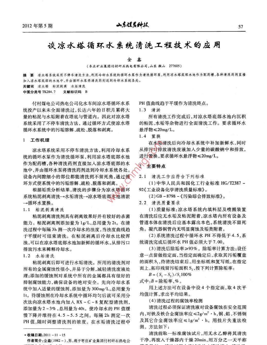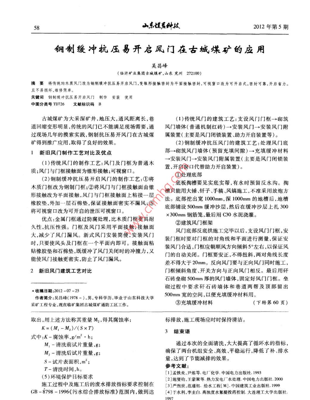 2012年第5期山東媒炭種技57談涼水塔循環(huán)水系統(tǒng)清洗工程技術(shù)的應(yīng)用金鑫(棗莊礦業(yè)集團(tuán)付村矸石熱電有限公司,山東徵山277605)摘要涼水塔系統(tǒng)采用不停車清洗方法,利用冷卻水系統(tǒng)的循環(huán)水泵作為清洗循環(huán)泵,利用涼水塔底部水池作為配藥槽.各種清洗藥劑直接加入涼水塔底部的水池中,并由循環(huán)水泵將清洗藥劑送到冷卻水系統(tǒng)各處。關(guān)鍵詞涼水塔粘泥剩離水垢清洗中圖分類號(hào)TK284.7文獻(xiàn)標(biāo)識(shí)碼 B付村煤電公司熱電公司化水車間涼水塔循環(huán)水系PH值曲線趨于平緩作為清洗終點(diǎn)。統(tǒng)投產(chǎn)以來(lái)未全面清洗過(guò),長(zhǎng)達(dá)六年的日積月累將大1.3 清淤量的粘泥與水垢附著在塔底與管道內(nèi)。因此對(duì)涼水塔所有清洗工作完成后,對(duì)涼水塔底部水池內(nèi)沉積系統(tǒng)采用了不停車清洗方法,通過(guò)循環(huán)方式使涼水塔的粘泥、水垢等雜物進(jìn)行全面清洗工作。要求循環(huán)水循環(huán)水系統(tǒng)中的污垢溶解、疏松、脫落和剝離。懸浮物≤20mg/L。1.4 置換1工作機(jī)理在水垢清洗后向冷卻水系統(tǒng)中補(bǔ)加新鮮水,同時(shí)涼水塔系統(tǒng)采用不停車清洗方法,利用冷卻水系從排污口排放清洗廢液加人少量的碳酸鈉中和排放,統(tǒng)的循環(huán)水泵作為清洗循環(huán)泵,利用涼水塔底部水池進(jìn)行置換,要求循環(huán)水懸浮物<20mg/L。作為配藥槽,各種清洗藥劑直接加入涼水塔底部的水2主要特點(diǎn)池中,并由循環(huán)水泵將清洗藥劑送到冷卻水系統(tǒng)各處。設(shè)備內(nèi)間隙細(xì)小的部位都能清洗到不留死角,通過(guò)循2.1清洗工作應(yīng)符合 下列標(biāo)準(zhǔn)環(huán)方式使系統(tǒng)中的污垢溶解、疏松、脫落和剝離。(1)中華人民共和國(guó)化工行業(yè)標(biāo)準(zhǔn)HG/T2387-根據(jù)垢質(zhì)分析結(jié)果,清洗的步驟分為涼水塔循環(huán)92《工業(yè)設(shè)備化學(xué)清洗質(zhì)量標(biāo)準(zhǔn)》。系統(tǒng)粘泥剝離清洗→水垢清洗-→涼水塔底部水池清淤(2)GB - 8798 -《污染綜合排放標(biāo)準(zhǔn)》。- +循環(huán)水置換。2.2清洗質(zhì)量要求.1粘泥剝離清洗(1)質(zhì)量標(biāo)準(zhǔn):涼水塔系統(tǒng)內(nèi)填料層及噴濺裝置粘泥剝離清洗劑具有剝離效果好并有較好的殺菌在清洗后應(yīng)無(wú)水垢及粘泥附著,涼水塔內(nèi)所有設(shè)備及.能力。粘泥剝離劑添加量為1g/L,總用量為2t。在清管道本體在清洗后應(yīng)基本露出本色,系統(tǒng)清洗不留死洗過(guò)程中每隔3h測(cè)--次冷卻水的濁度,當(dāng)濁度曲線趨角。凝汽器銅管內(nèi)無(wú)明顯腐蝕及垢類附著。于平緩時(shí)可結(jié)束清洗。在粘泥剝離后冷卻水比較渾(2)系統(tǒng)清洗過(guò)程中循環(huán)水PH不得低于4.5,系濁,可以在涼水塔底部水池加新鮮的循環(huán)水,從排污口統(tǒng)清洗完成后循環(huán)水PH值必須大于7.00。排放污水來(lái)稀釋冷卻水。(3)清洗后除垢率≥93%。除垢率計(jì)算方法:設(shè)任1.2 水垢清洗意一點(diǎn)留做指定面,當(dāng)指定面確定后,求取其污垢覆蓋粘泥剝離后即可進(jìn)行水垢清洗。所用的清洗劑對(duì)的面積S, ,待清洗結(jié)束后,用坐標(biāo)紙和復(fù)寫(xiě)紙,在指定所有的金屬腐蝕性很小,并易于分解,減輕清洗廢液處面上,拓印殘留污垢面積S, ,按下列計(jì)算除垢率:理;添加的緩蝕劑對(duì)系統(tǒng)中所有的金屬都具有很好的B=(S, - 52)/S, 100%抑制腐蝕能力,確保設(shè)備的絕對(duì)安全。先向冷卻水系式中:B=除垢率,%。統(tǒng)中加入適量的緩蝕劑,添加量為300mg/L,總用量為用上述方法可在設(shè)備中設(shè)4個(gè)指定面,取4次平1t。待緩蝕劑在冷卻水系統(tǒng)中循環(huán)均勻后就可采用分均值計(jì)算,求出平均結(jié)果。次法向涼水塔水池內(nèi)加入RX-C-8復(fù)配型清洗劑,(4)清洗過(guò)程的腐蝕率檢測(cè)添加量為2 ~3% ,總用量為40t。使冷卻水的PH值緩清洗過(guò)程必須保證清洗液對(duì)設(shè)備腐蝕在安全范圍慢下降并維持在4.5~5.5之間。每隔2h測(cè)定一-次內(nèi),對(duì)鐵及鐵合金腐蝕率應(yīng)≤2g/m2 . h,銅、鋁、不銹鋼P(yáng)H值,隨時(shí)調(diào)整清洗劑的濃度。在水垢清洗過(guò)程中及其它合金腐蝕率應(yīng)≤1g/m2. h。用掛片失重法檢測(cè)。方法如下:*收稿日期:2011-11 -15清洗前取一標(biāo)準(zhǔn) 腐蝕試片,用無(wú)水乙醇將其清洗作者簡(jiǎn)介:金鑫(1982-),男,現(xiàn)于棗莊礦業(yè)集團(tuán)付村矸石熱電公干凈,再放入干燥器內(nèi)干燥20min,用萬(wàn)分之一天平稱5山東媒炭種技2012年第5期鋼制緩沖抗壓易開(kāi)啟風(fēng)門(mén)在古城煤礦的應(yīng)用吳昌峰(臨沂礦業(yè)集團(tuán)古城謀礦,山東兗州272100)摘要將傳統(tǒng)的木質(zhì)風(fēng)門(mén)改為鋼制緩沖抗壓易開(kāi)啟風(fēng)門(mén),變錐形接觸密封為平面接觸密封,可視窗口改為可開(kāi)啟式,密封可靠,開(kāi)啟省力。且不易損壞,維修簡(jiǎn)單。關(guān)鍵詞鋼制縵沖抗壓易開(kāi)啟風(fēng)門(mén) 制作安裝使用中圖分類號(hào)TD726文獻(xiàn)標(biāo)識(shí)碼E古城煤礦為大采深礦井,地壓大,通風(fēng)距離長(zhǎng),巷(1)傳統(tǒng)風(fēng)門(mén)的建筑工藝:支設(shè)風(fēng)門(mén)門(mén)框→砌筑道