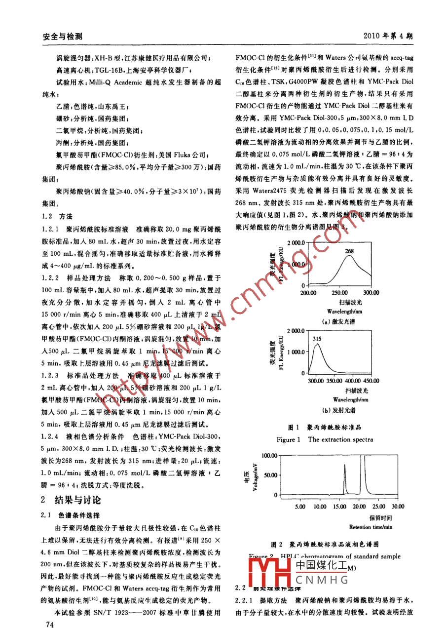 第26卷第4期Vol. 26,No.4F 00D&MACHINERY2010年7月July,20 1010. 3969/J isn 1003一5788.2010 04. 020面粉增筋劑聚丙烯酸鈉中聚丙烯酰胺的測(cè)定Determination of polyacrylamide in sodium polyacrylate in flour gluten fortifier黃紅霞HUANG Hong-tia(福建省中心檢驗(yàn)所,福建福州350002)(Fujian Provincial Central Inspection Institute, Fuzhou, Fujian 350002, China)摘要:研究建立熒光衍生劑氯甲酸芴甲酯(FM0C-CI)柱前衍的面團(tuán),表面光滑而具有光澤;②形成穩(wěn)定的面團(tuán)膠體,防止生,高效液相色譜熒光檢測(cè)器檢測(cè)面粉增筋劑聚丙烯酸鈉中可溶性淀粉滲出;③增加產(chǎn)品的保水性,使水分均勻保持于聚丙烯酰胺的檢測(cè)方法。樣品經(jīng)水提取,在弱堿性條件下通面團(tuán)中,防止干燥;④提高面團(tuán)的延展性;⑤使原料中的油脂過(guò)FMOC-CI衍生,經(jīng)二醇基柱分離,并以熒光檢測(cè)器測(cè)定。成分穩(wěn)定地分散至面團(tuán)中,制作以小麥粉、紅薯、玉米、燕麥、.結(jié)果表明:該方法聚丙烯酰胺檢測(cè)限為0.2 g/kg;樣品回收馬鈴薯等為原料的鹵條、粉絲、粉條、粉皮時(shí),可提高產(chǎn)晶品的率為85. 5%~90.9% ,相對(duì)標(biāo)準(zhǔn)偏差(RSD)為3. 1%~4.7%筋力,增強(qiáng)耐煮性[1-8]。(n=6),在4.28~428 μg/mL濃度范圍內(nèi)呈良好的線性關(guān)系,線性回歸系數(shù)r大于0. 999.聚丙烯酰胺簡(jiǎn)稱PAM,由丙烯酰胺單體聚合而成,是- -關(guān)鍵詞:柱前衍生;高效液相色譜熒光法;聚丙烯酸鈉;聚丙種水溶性線型高分子物質(zhì)。主要用作絮凝劑,用于石油工烯酰胺業(yè).紡織工業(yè)、造紙工業(yè)等[3-1。聚丙烯酰胺常含有丙烯酰.胺單體,丙烯酰胺具神經(jīng)毒作用,可引起疲嗜睡.手指麻木,with FLD detection of polyacrylamide(PAM) in sodium polyacrylate位置性震顫,步態(tài)紊亂,肌肉萎編,肌肉尤力,手出汗脫屑以(PAANa), The flour gluten forifier-PAANa samples were extractedby water and pre column derivarization with FM0C-C. HPIC sepa-及接觸性皮炎等凹,屬中等毒類,具有生殖毒性、致突變性、ration was performed on YMC-Pack Diol-300 column (8. 0 X致癌性。因此,中國(guó)明確規(guī)定聚丙烯酰胺不允許作為食品添300 mm.5 μm) and the fluorescence detection was used. Conclu-加劑使用(6)。但由于聚內(nèi)烯酰胺具有比聚丙烯酸鈉更好的.sion; The detection limit was about 0. 2 g/kg . The recoveries增筋效果,一些不法廠家為S使自己的產(chǎn)品更好銷售,不顧ranged from 85. 5% to 90. 9%,and the relative standard deviationswere3.1%~4.7% (n- 6). The linear range was 4. 28μg/mL ~國(guó)家標(biāo)準(zhǔn)的規(guī)定違規(guī)使用聚丙烯酰胺來(lái)代替聚丙烯酸鈉。428 ug/mI, and the correlation coefficient (R) was over 0. 999.目前,檢測(cè)聚丙烯酰胺的方法有溴氧化一可見(jiàn)光譜法[]、凝Keywords: pre column derivaization; HPLC-fluorescence detection;膠色譜分析方法0等。但溴氧化-可見(jiàn)光譜法測(cè)試的干擾sodium polyacrylate; polyacrylamide因素多、步驟繁瑣、測(cè)試精確度低、應(yīng)用范圍窄,由于聚丙烯面粉增筋劑是一類與蛋白質(zhì)(面筋)聯(lián)結(jié)以改進(jìn)面粉制酰胺和聚內(nèi)烯酸鈉的部分分子最有交叉,采用凝膠色譜分析品品質(zhì)的添加劑,包括改進(jìn)面筋的機(jī)械加工性能、氣體保留方法也難以分離鑒定。性能及血制品的體積.勻稱性.組織結(jié)構(gòu)和顆粒等。主要由本試驗(yàn)通過(guò)熒光街生劑氯甲酸芴甲酯(FM0C-CI)柱前聚丙烯酸鈉、偶氨甲酰胺、活性磷酸鹽、變性淀粉等原料衍生,高效液相色譜熒光檢測(cè)器檢測(cè),建立了面粉增筋劑聚丙烯酸鈉中聚丙烯酰胺含量的測(cè)定方法。該方法抗干擾性制成。驟丙烯酸鈉簡(jiǎn)稱PAANa,是一種水溶性樹脂,分子最數(shù)強(qiáng),重現(xiàn)性好,靈敏度商,為產(chǎn)品質(zhì)量執(zhí)法與檢驗(yàn)提供了技術(shù)百萬(wàn),無(wú)色或淡黃色粘稠液體,在面制食品中作為增筋劑有方法和依據(jù)。如下功效:①增強(qiáng)原料面粉中的蛋白質(zhì)黏結(jié)力,使淀粉粒子中國(guó)煤化工相互結(jié)合,分散滲透至蛋白質(zhì)的網(wǎng)狀結(jié)構(gòu)中,形成質(zhì)地致密1.11HCNMHG高效液相色譜儀Alliance" 2695(配2475熒光檢測(cè)器),作者簡(jiǎn)介:黃紅霞(1965 - ),女,福建省中心檢驗(yàn)所高級(jí)工程師。美國(guó)沃特世公司;E-mil.hy@fei. net收稿日期:2010-02- 20電子分析天平:BT 224S,德國(guó)賽多利斯;73安全與檢測(cè)2010年第4期渦旋混勻器:XH-B型,江蘇康鍵醫(yī)療用品有限公司;FMOC-CI的術(shù)生化條件"]和Waters公川氦基酸的accq-tag高速離心機(jī):TGL-16B,上海安亭科學(xué)儀器廠:街生化條件[1]對(duì)聚丙烯酰胺術(shù)生后進(jìn)行檢測(cè)。分別采用試驗(yàn)用水:MilliQAcademic超純水發(fā)生器制備的超Crn色譜柱.TSK, G4000PW凝膠色譜柱和YMC-Pack Diol純水;二醇基柱來(lái)分離兩種衍生刪的衍生產(chǎn)物,結(jié)果只有采用乙腈:色譜純,山東禹王;FMOC-CI術(shù)生的產(chǎn)物能通過(guò)YMC-Pack Diol 二醇基柱來(lái)有硼砂:分析純,國(guó)藥集團(tuán);效分離。采用YMC-Pack Diol-300,5 μm,300X8.0 mm LD二氯甲烷;分析純,國(guó)藥集團(tuán);色譜柱,試驗(yàn)同時(shí)比較了用0,0. 05,0. 075.0. 1,0. 15 mol/L .丙酮:分析純,國(guó)藥集團(tuán);磷酸二氫鉀溶液為流動(dòng)相的分離效果并調(diào)節(jié)與乙腈的比例,氯甲酸芴甲脂(FMOC- CI)術(shù)生劑:美國(guó)Fluka公司;最終確定以0. 075 mol/L磷