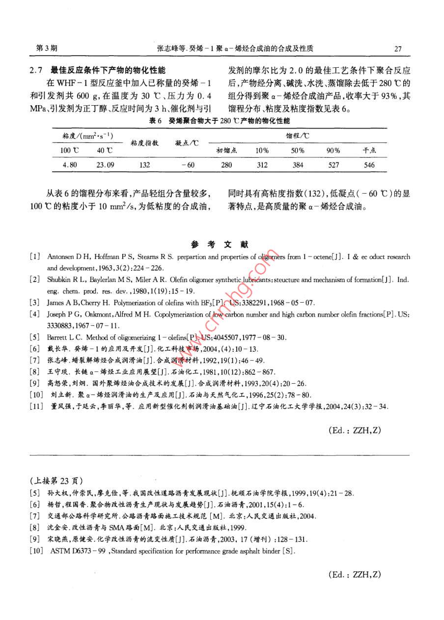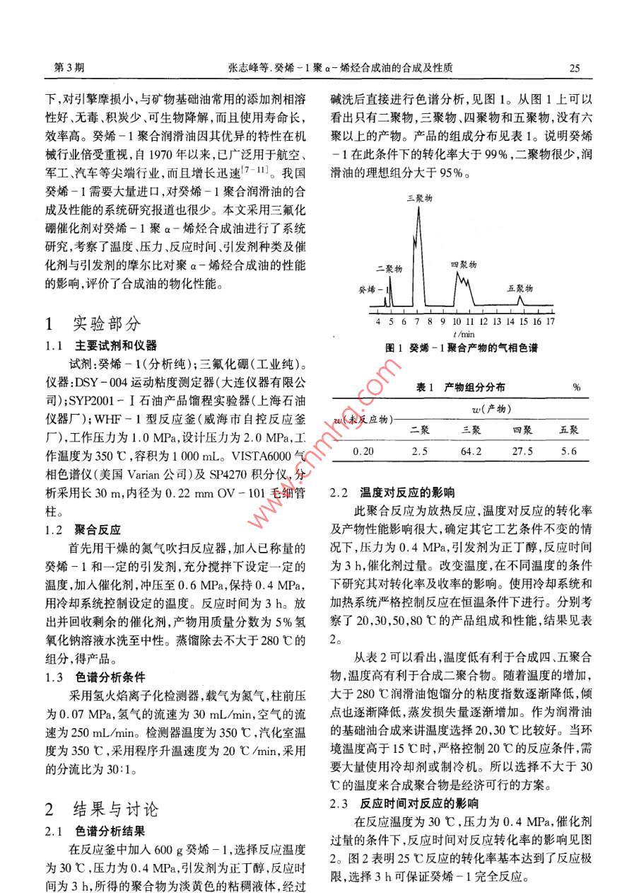 第25卷第3期遼寧石油化工大學(xué)學(xué)報(bào)Vol.25 No.32005年9月JOURNAL. OF LIAONING UNIVERSITY OF PETROLEUM & CHEMICAL TECHNOLOGYSep.2005文章編號(hào):1672 - 6952(2005)03 - 0024 - 04癸烯-1聚a一烯烴合成油的合成及性質(zhì)張志峰1.2,丁洪生',權(quán)成光”,錢(qián)建華1(1.遼寧石油化工大學(xué),遼寧撫順113001; 2.中油撫順石油化工公司石化一廠,遼寧撫順113003)摘要:聚a-烯烴合成油(PAO)是重要的合成潤(rùn)滑油之一。使用三氟化硼為催化劑對(duì)癸烯-1聚合物合成油進(jìn)行了研究。考察了不同溫度、壓力、反應(yīng)時(shí)間、引發(fā)劑、催化劑與引發(fā)劑的摩爾比等工藝條件對(duì)癸烯-1聚合及合成油性能的影響。確定了合成聚a-烯烴合成油的最佳工藝條件:溫度為30C ,壓力為0.4 MPa,反應(yīng)時(shí)間為3h,以正丁醇作引發(fā)劑,催化劑與引發(fā)劑的摩爾比為2.0。采用氣相色譜法對(duì)聚合物合成油的組分進(jìn)行了分析。在最佳工藝條件下,癸烯-1的轉(zhuǎn)化率為99.8%,二聚物的質(zhì)量分?jǐn)?shù)為2.5%,三聚物的質(zhì)量分?jǐn)?shù)為64.5% ,四聚物的質(zhì)量分?jǐn)?shù)為27.5%,五聚物的質(zhì)量分?jǐn)?shù)為5.6%。采用運(yùn)動(dòng)粘度儀和石油產(chǎn)品餾程測(cè)定器等儀器研究了聚合物合成油的物化性能,100 C的粘度為4. 80 mm2/s,40 C的粘度為23. 09 mm2/s,其粘度指數(shù)為132,凝點(diǎn)為-60 C。.關(guān)鍵詞:癸烯-1; 聚a- 烯烴合成油;合成工藝;性能中圖分類號(hào): TE666文獻(xiàn)標(biāo)識(shí)碼:ASynthesis and Properties of Poly - Alpha - Olefin With 1 - DeceneZHANG Zhi - fengl:2,DING Hong - sheng' , QUAN Cheng - guang ,QIAN Jjan - hua(1. Liaoning Unirversity of Petroleum & Chemical Technology, Fushun Liaoning 113001, P. R. China;2. No.1 Plant of Funshun Petrochemical Company of CCPC, Fushun Liaoming 113003, P. R. China)Received 12 April 2005;revised 12 June 2005 ;accepted 16 June 2005Abstract: Poly - alpha - olefin is one kind of important lubricants. The polymerization of 1 - decene catalyzed by boron trifluoridecatalyst was studied. The properties of the synthesized poly - alpha - olefin lubricant were investigated under various kinds oftechnological conditions, for example, reaction temperature, reaction pressure, reaction time, various kinds of initiator, mole ratio ofthe catalyst and promoter. The optimum condition for the synthesis of poly - alpha - olefin are as ollows: the reaction temperature is30 C , the reaction pressure is 0. 4 MPa, the reaction time is 3 hours, the initiator is butanol, and the mole ratio of the catalyst to theinitiator is 2.0. The components of poly - alpha - olefin lubricants were analyzed using gas chromatograph. Under the optimumtechnological conditions, the conversionof 1 - decene is 99. 8%,the mass fraction of dimer is 2.5%,the mass fraction of trimer is64.5%,the mass fraction of tetramer is 27.5%,and the mass fraction of pentamer is 5. 6%. The properties of the poly - alpha-olefin oils were studied by kinematical vicometer and petrolic products dstllig test instrument. The viscosity is 4. 80 mm?/s and23.09 mm2/sat 100 C and 40 C , respectively. The viscosity index is 132, the freing pointis -60 C .Key words: 1 - Decene; PAO; Snthesis technology; PopertyCorresponding author. Tel.: + 86 -413 - 6864372; fax: + 86 -413 - 6860918; e - mil:ding63@126. com癸烯-1(1 - decene, 1 - decylene)為無(wú)色液體,調(diào)制性質(zhì)、規(guī)格更高的產(chǎn)品。癸烯- 1經(jīng)聚合、加氫能溶于醇和醚,不溶于水,熔點(diǎn)為- 66.5C,沸點(diǎn)為后,作為潤(rùn)滑油的基礎(chǔ)油,具有比礦物基礎(chǔ)油更為優(yōu)172 C,癸烯-1廣泛用于生產(chǎn)合成潤(rùn)滑油基礎(chǔ)異的性能[4-6]。油[1-3]。近年來(lái),潤(rùn)滑油升級(jí)換代更新發(fā)展迅速,癸烯-1聚合油和礦物基礎(chǔ)油比,具有更好的原天然礦物基礎(chǔ)油的質(zhì)量性能已接近極限,難以再潤(rùn)滑性能,使用溫度范圍寬,低溫性能好,粘度指數(shù)高,熱安定性好,低揮發(fā)性,氧化安定性好,閃點(diǎn)、著收稿日期:2005 -04-12 .火點(diǎn)、自然點(diǎn)高,高溫下不吸濕,水解安定性好,剪切作者簡(jiǎn)介:張志峰(1966- ),男,遼寧朝陽(yáng)市,在讀工程碩士。安定性好,對(duì)設(shè)備無(wú)腐蝕性,在低溫高速和高溫條件第3期張志峰等.癸烯-1聚a-烯烴合成油的合成及性質(zhì)25下,對(duì)引擎摩損小,與礦物基礎(chǔ)油常用的添加劑相溶堿洗后直接進(jìn)行色譜分析,見(jiàn)圖1。從圖1上可以性好、無(wú)毒、積炭少、可生物降解,而且使用壽命長(zhǎng),看出只有二聚物,三聚物、四聚物和五聚物,沒(méi)有六效率高。癸烯-1聚合潤(rùn)滑油因其優(yōu)異的特性在機(jī)聚以上的產(chǎn)物。產(chǎn)品的組成分布見(jiàn)表1。說(shuō)明癸烯械行業(yè)倍受重視,自1970年以來(lái),已廣泛用于航空、- 1在此條件下的轉(zhuǎn)化率大于99% ,二聚物很少,潤(rùn)軍工、汽車(chē)等尖端行業(yè),而且增長(zhǎng)迅速7-11。我國(guó)滑油的理想組分大于95%。癸烯-1需要大量進(jìn)口,對(duì)癸烯- 1聚合潤(rùn)滑油的合三聚物成及性能的系統(tǒng)研究報(bào)道也很少。本文采用三氟化硼催化劑對(duì)癸烯-1聚a-烯烴合成油進(jìn)行了系統(tǒng)研究,考察了溫度、壓力、反應(yīng)時(shí)間、引發(fā)劑種類及催化劑與引發(fā)劑的摩爾比對(duì)聚a-烯烴合成油的性能二聚物四聚物的影響,評(píng)價(jià)了合成油的物化性能。癸烯-五聚物1實(shí)驗(yàn)部分567891011121314151617t/min1.1主要試劑和儀器圖1癸烯-1聚合產(chǎn)物的氣相色