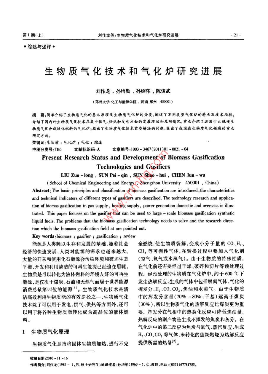 第1期(上)劉作龍等:生物質(zhì)氣化技術和氣化爐研究進展.21.●綜述與述評●生物質(zhì)氣化技術和氣化爐研究進展劉作龍,孫培勤,孫紹暉,陳俊武(鄭州大學化工與能源學院,河南鄭州450001)摘要:簡單介紹了 生物質(zhì)氣化的基本原理及生物質(zhì)氣化爐的分類,闡述了不同類型氣化爐的特點及技術指標。介紹了國內(nèi)外生物質(zhì)氣化技術在集中供氣、供熱和發(fā)電方面的發(fā)展現(xiàn)狀和應用情況,重點介紹了適用于大規(guī)模生物質(zhì)氣化合成液體燃料的氣化爐;指出了生物質(zhì)氣化技術需要解決的問題,提出了我國在生物質(zhì)氣化領域的重點研究方向。關鍵詞:生物質(zhì);氣化爐;氣化;綜迷中團分類號:TK6文獻標識碼:A文章編號:1003 - 3467(2011)01 -0021 -04Present Research Status and Development of Biomass GasificationTechnologies and GasifiersLIU Zuo- long , SUN Pei -qin , SUN Shao- hui,CHEN Jun - wu( School of Chemical Engineering and Energy , Zhengzhou Univrsity 450001 ,China)Abstract: The basic principles and lassifcation of biomass gasification are introduced , the characteristicsand technical indicators of different types of gasifiers are described. The technology research and applica-tion of biomas gasification in gas supply, heating supply, power generation domestie and overseas is ilus-trated. This paper focuses on the gasifier that can be used to large - scale biomass gasification syntheticliquid fuels. The problems that the biomass gasifcation technology needs to solve and the research direc-tion which the biomass gasification field at are pointed out.Key words:biomass ; gasifier ; gasification ; review能源是人類賴以生存和發(fā)展的基礎,隨著社會全燃燒,使生物質(zhì)裂解,變成小分子量的CO、H2、經(jīng)濟的快速發(fā)展,人類對能源的需求也越來越大。CH。等可燃性氣體,在轉(zhuǎn)換過程中要加入氣化劑.大量的開采和使用化石能源會污染環(huán)境和破壞生態(tài)(空氣、氧氣或水蒸氣)。由于生物質(zhì)的特殊性質(zhì),平衡,開發(fā)和利用清潔的可再生能源已經(jīng)迫在眉睫,在氣化前還需要經(jīng)過干燥、破碎和切片等預處理過生物質(zhì)是呵以轉(zhuǎn)化為液體燃料的環(huán)境友好的可再生程。經(jīng)預處理的生物質(zhì)在氣化爐中,約于600 C下能源,是僅次于煤炭、石油和天然氣而居于世界能源發(fā)生熱解反應,生成的氣體中包括解離氣體、氣化的消費總量第四位的能源"。生物質(zhì)氣化技術是清揮發(fā)分、H2、CO、CO2、焦油和水蒸氣。由于生物質(zhì)潔高效利用生物質(zhì)能的有效途徑之- ,生物質(zhì)氣化中的揮發(fā)分含量(70% ~ 80%,干基)遠高于煤炭技術除了可以用于發(fā)電、供氣、供熱等方面外,還可(30%),所以生物質(zhì)氣化的熱解反應比煤炭更為重以用于將各種生物質(zhì)能轉(zhuǎn)化成為高品位的液體燃要。揮發(fā)分在氣相中的熱裂化反應可降低焦油量,料。熱解反應的副產(chǎn)物是生成不揮發(fā)的焦炭和灰分。在氣化爐中的第二反應為焦炭與氧氣、蒸汽反應,生成.1生 物質(zhì)氣化原理H2、CO、CO2等氣體,未轉(zhuǎn)化的焦炭燃燒為熱解反應生物質(zhì)氣化是指將固體生物質(zhì)加熱,進行不完提供所需的熱量”。收稿日期:2010-11-16作者簡介:劉作龍(1984- ),男,碩士研究生;通訊作者:孫培動( 1963 - ),女,教授,電話:(0371)67781755河南化工●22●IIFNAN CHEMICAL INDLSTRY2011年第28卷2生物質(zhì)氣化技術的國內(nèi)外發(fā)展現(xiàn)狀廠和商業(yè)應用規(guī)模的氣化爐(見表1)。生物質(zhì)氣化領域處于領先世界水平的國家有瑞典、丹麥、奧地2.1國外生物質(zhì) 氣化技術發(fā)展概況利、德國、美國和加拿大等。瑞典和丹麥正在實行利生物質(zhì)氣化技術早在18世紀就已出現(xiàn),第二次用生物質(zhì)進行熱電聯(lián)產(chǎn)的計劃,使生物質(zhì)能在轉(zhuǎn)換世界大戰(zhàn)期間,為解決石油燃料的短缺,用于內(nèi)燃機為高品位電能的同時滿足供熱的需求,可以大幅度的小型氣化裝置得到廣泛使用。20世紀五六十年提高其轉(zhuǎn)換效率。美國在利用生物質(zhì)能發(fā)電方面處代,煤炭和石油等化石能源的廣泛應用,使能源短缺于世界領先地位。目前,美國生物質(zhì)發(fā)電裝機總容問題得到暫時性的緩解。由于生物質(zhì)氣化技術的不量已達10 500 MW, 70%為生物質(zhì)-媒混合燃燒氣完善和利用率低等原因,生物質(zhì)氣化技術的發(fā)展和化技術,單機容量30~ 100 MW.發(fā)電成本3-6美應用產(chǎn)生了延滯。20世紀70年代,受石油危機的分/(kW.h),預計到2015年美國生物質(zhì)發(fā)電裝機影響,世界各國再-次深該認識到化石能源的不可總容量將達16 300 MWil。美國在生物質(zhì)氣化合成再生性,重新開始了對生物質(zhì)能源的開發(fā)和研究。乙醇方面取得了很大的成就。歐盟國家在生物質(zhì)氣經(jīng)過幾十年的發(fā)展,歐美等國的生物質(zhì)氣化技化合成柴油方面取得了很大的成就。2004年歐盟術取得了很大的成就。生物質(zhì)氣化設備規(guī)模較大,國家的生物質(zhì)氣化合成柴油的產(chǎn)量達到224萬t,德自動化程度高,工藝較復雜,主要以供熱、發(fā)電和合國是歐盟最大的生物質(zhì)氣化合成柴油生產(chǎn)國,2004成液體燃料為主,目前開發(fā)了多系列已達到示范I年的生產(chǎn)能力達到了109.7 萬中。表1國外氣化爐應用情況一 覽^$)國家氣化爐類型原料效率/%規(guī)模/t.d-'應用美國Tay