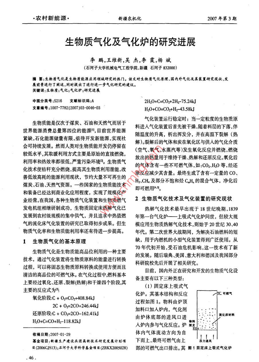 ●農(nóng)村新能源.新疆農(nóng)機(jī)化2007年第3期生物質(zhì)氣化及氣化爐的研究進(jìn)展李鵬,王維新,吳杰,李霞,楊斌(石河子大學(xué)機(jī)械電氣工程學(xué)院,新疆石河子832000)摘要:生物質(zhì)氣化是生物質(zhì)能源應(yīng)用領(lǐng)域研究的熱門。該文對生物質(zhì)氣化原理、國內(nèi)外氣化及其裝置研究現(xiàn)狀、發(fā)展前景進(jìn)行了闡述,同時提出了進(jìn)行進(jìn)一步氣化研究的建議。關(guān)鍵詞:生物質(zhì);氣化;氣化爐;研究進(jìn)展中圖分類號:S216.文獻(xiàn)標(biāo)識碼:A2H20+C=CO+2H2-75.24kJ文章編號:1007-7782 (2007 )03-0046-03H20+C0=CO2+H- 43.58kJ氣化裝置運(yùn)行穩(wěn)定時:當(dāng)- -定粒度的生物質(zhì)原生物質(zhì)能是僅次于煤炭、石油和天然氣而居于料進(jìn)入氣化裝置后首先被干燥,隨著料層的下落,伴世界能源消費(fèi)總量第四位的能源",目前世界能源隨溫度的升高,析出揮發(fā)分,并在高溫下裂解(熱緊缺,石化能源儲量有限,亟待開發(fā)新能源,實(shí)現(xiàn)社解)。裂解后的氣體和炭在氧化區(qū)與供人的氣化介質(zhì)會可持續(xù)發(fā)展。然而人類對生物質(zhì)能開發(fā)仍停留在(空氣、氧氣、水蒸汽等)發(fā)生氧化反應(yīng)并燃燒,燃燒較低水平,其取暖利用方式主要是原始的直接燃燒,放出的熱量用于維持干燥熱解和還原反應(yīng)。氧化后利用率和熱效率都很低,嚴(yán)重污染環(huán)境吧。生物質(zhì)氣的氣體含有一些不可燃?xì)怏w,如:CO2、H20等,經(jīng)還化技術(shù)使秸稈充分燃燒,提高其生物質(zhì)利用潛能,改原反應(yīng)減少其含量。最終生成了含有一定量的CO、善低效高耗的能源利用現(xiàn)狀,節(jié)約大量不可再生的H2、CH,及部分不飽和烴C.H的混合氣體,凈化后煤炭石油、天然氣資源。- 一些國家的生物質(zhì)能技術(shù)即可燃用14.9。和裝備已經(jīng)達(dá)到商業(yè)化應(yīng)用程度,實(shí)現(xiàn)了規(guī)?;a(chǎn)業(yè)經(jīng)營。在我國,各種生物質(zhì)氣化裝置和生物質(zhì)燃?xì)?生物質(zhì)氣化技術(shù)及氣化裝置的研究現(xiàn)狀發(fā)電機(jī)組相繼研制成功,生物質(zhì)固定床熱解氣化已熱解氣化技術(shù)最早出現(xiàn)于18世紀(jì)晚期, 1839發(fā)展到農(nóng)村級規(guī)模的集中供氣,并且追求中熱值燃年第- -臺氣化爐一-上吸式氣化爐問世, 但較大規(guī)氣的流化床氣化裝置的研究已取得初步成果。但生模應(yīng)用生物質(zhì)熱解氣化技術(shù),則始于20世紀(jì)30、40物質(zhì)氣化率和生物質(zhì)能利用率還有待進(jìn)- -步 提高。年代。第二次世界大戰(zhàn)期間,為解決石油燃料的短1生物質(zhì)氣化的基本原理缺,用于內(nèi)燃機(jī)的小型氣化裝置得到廣泛使用。從生物質(zhì)氣化是生物質(zhì)能高品位利用的一-種主要70年代初開始,受石油危機(jī)影響,這一-技術(shù)有了新技術(shù),通過氣化裝置將生物質(zhì)原料的能量進(jìn)行轉(zhuǎn)換的發(fā)展。隨后瑞典美國、意大利和德國及我國部分過程,可以將固態(tài)生物質(zhì)原料轉(zhuǎn)換成使用方便而且科研院校先后開展了相關(guān)研究。目前,國內(nèi)外正在研究和開發(fā)的生物質(zhì)氣化設(shè)清潔的高品位的可燃?xì)怏w。在氣化過程中,燃料基本備主要有以下三種類型: ;上要經(jīng)過氧化、還原裂解(熱解)和干燥四個階段,其(1)固定床上吸式氣主要的反應(yīng)式為.化爐。其基本結(jié)構(gòu)和反應(yīng)1產(chǎn)可燃?xì)庋趸A段:C + 0=C0+408.84kJ過程如圖1。物料由爐頂2C + 02=2C0+246.44kJ加料口加人爐內(nèi),氣化劑還原階段:C + C02=2C0-162.41kJ流化床材料由爐體底部的進(jìn)風(fēng)口進(jìn)H20+C=C0+H-118.82kJ人爐內(nèi)參與氣化反應(yīng)。爐援龍體內(nèi)氣體流動方向?yàn)樽允崭迦掌?2007-01-29基金項(xiàng)目:新疆生產(chǎn)建設(shè)兵團(tuán)高新技術(shù)研究發(fā)展計劃項(xiàng)下而上,最終可燃?xì)庥缮蠅毫νL(fēng)目(2006CJS13);石河子大學(xué)科學(xué)基金項(xiàng)目(ZRKX2005028)部的可燃?xì)獬隹谂懦?。其?固定床上吸式氣化爐. 46.2007年第3期新疆農(nóng)機(jī)化●農(nóng)村新能源●優(yōu)點(diǎn)是:可燃?xì)饨?jīng)過熱分解層和干燥層時將熱量傳拿大通用燃料氣化裝置有限公司(0mnifuel Gasifica-遞給物料,自身溫度降低,爐子熱效率高;可燃?xì)鉄醫(yī)ion System Limitred) 設(shè)計制造的流化床氣化裝置、值較高;熱分解層和干燥層對可燃?xì)庥羞^濾作用,使美國標(biāo)準(zhǔn)固體燃料公司(Standard SolidFuels Ine)設(shè)出爐的可燃?xì)饣曳稚佟H秉c(diǎn)是:添料不方便;可燃?xì)庥嬛圃斓奶炕瘹饣久簹獍l(fā)生系統(tǒng)、德國茵貝爾特中焦油、蒸汽含量較多。能源公司( Imbert Energietechnik GMBH)設(shè)計制造(2)固定床下吸式氣化爐。圖2為其基本結(jié)構(gòu)的下行式氣化爐-內(nèi)燃機(jī)發(fā)電機(jī)組系統(tǒng)等等,氣化和氣化反應(yīng)示意圖。物料由效率可達(dá)60% ~-90%,可燃?xì)鉄嶂禐?1.7-2.5)x104爐頂加料口加人爐內(nèi),氣化可繼氣kJ/m2。美國近年來在生物質(zhì)熱解氣化技術(shù)方面有所劑由爐體上部進(jìn)入爐內(nèi),部突破,研制出了生物質(zhì)綜合氣化裝置-燃?xì)廨啓C(jī)發(fā)分氣化劑也可隨物料一起還厚屋電系統(tǒng)成套設(shè)備,為大規(guī)模發(fā)電提供了樣板圖。進(jìn)人爐膛,爐內(nèi)料層自上而國