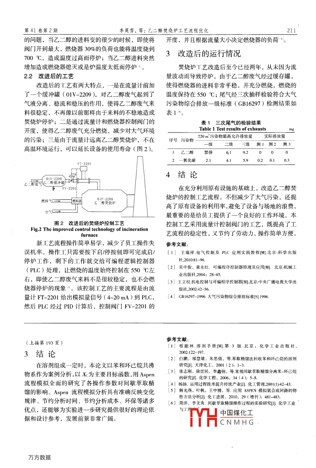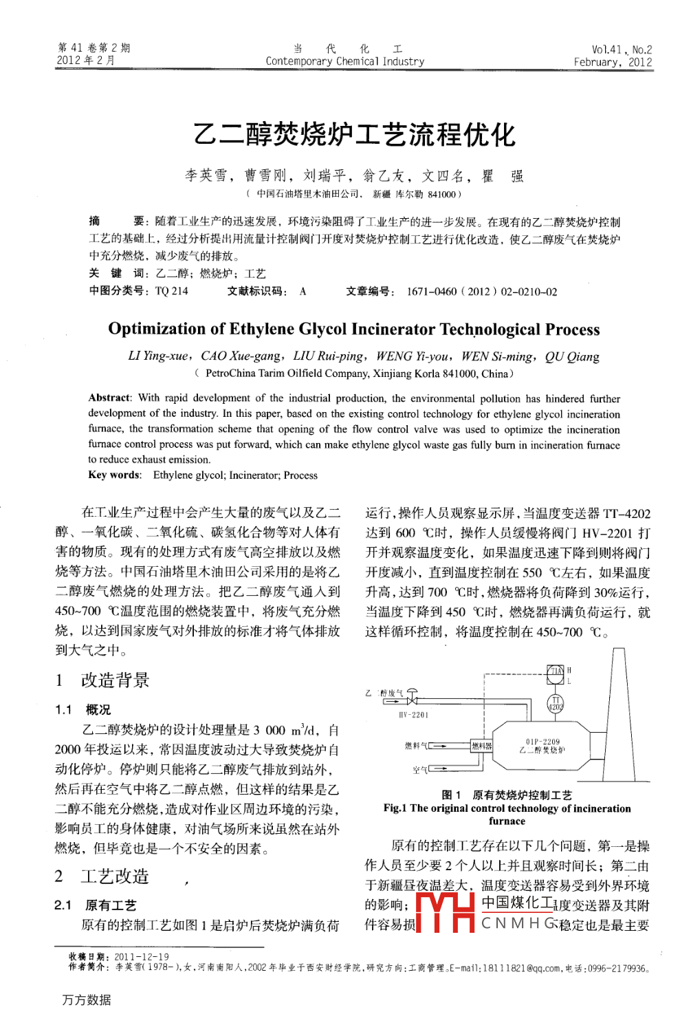 第41卷第2期當(dāng)代化vo.41,No.22012年2月Contemporary Chemical IndustryFebruary, 2012乙二醇焚燒爐工藝流程優(yōu)化李英雪,曹雪剛,劉瑞平,翁乙友,文四名,瞿強(qiáng)(中國石油塔里木油田公司,新疆庫爾勒841000摘要:隨著工業(yè)生產(chǎn)的迅速發(fā)展,環(huán)境污染阻礙了工業(yè)生產(chǎn)的進(jìn)一步發(fā)展。在現(xiàn)有的乙二醇焚燒爐控制工藝的基礎(chǔ)上,經(jīng)過分析提出用流量計控制閥門開度對焚燒爐控制工藝進(jìn)行優(yōu)化改造,使乙二醇廢氣在焚燒爐中充分燃燒,減少廢氣的排放。關(guān)鍵詞:乙二醇;燃燒爐;工藝中圖分類號:TQ214文獻(xiàn)標(biāo)識碼:A文章編號:1671-0460(2012)02-0210-02Optimization of ethylene glycol Incinerator Technological ProcessLI Ying-xue, CAO Xue-gang, LIU Rui-ping, WENG Yi-you, WEN Si-ming, QU QiangPetroChina Tarim Oilfield Company, Xinjiang Korla 841000, ChinaAbstract: With rapid development of the industrial production, the environmental pollution has hindered furtherdevelopment of the industry. In this paper, based on the existing control technology for ethylene glycol incinerationfurnace, the transformation scheme that opening of the flow control valve was used to optimize the incinerationfurmace control process was put forward, which can make ethylene glycol waste gas fully burn in incto reduce exhaust emissionKey words: Ethylene glycol; Incinerator; Process在工業(yè)生產(chǎn)過程中會產(chǎn)生大量的廢氣以及乙二運(yùn)行,操作人員觀察顯示屏,當(dāng)溫度變送器TT-4202醇、一氧化碳、二氧化硫、碳?xì)浠衔锏葘θ梭w有達(dá)到600℃時,操作人員緩慢將閥門HV-2201打害的物質(zhì)。現(xiàn)有的處理方式有廢氣高空排放以及燃開并觀察溫度變化,如果溫度迅速下降到則將閥門燒等方法。中國石油塔里木油田公司采用的是將乙開度減小,直到溫度控制在550℃左右,如果溫度二醇廢氣燃燒的處理方法。把乙二醇廢氣通入到升高,達(dá)到700℃時,燃燒器將負(fù)荷降到30%運(yùn)行,450~-700℃溫度范圍的燃燒裝置中,將廢氣充分燃當(dāng)溫度下降到450℃時,燃燒器再滿負(fù)荷運(yùn)行,就燒,以達(dá)到國家廢氣對外排放的標(biāo)準(zhǔn)才將氣體排放這樣循環(huán)控制,將溫度控制在450~700℃。到大氣之中。1改造背景1.1概況l1-220乙二醇焚燒爐的設(shè)計處理量是3000m/ld,自2000年投運(yùn)以來,常因溫度波動過大導(dǎo)致焚燒爐自燃料氣→乙二醉焚燒爐動化停爐。停爐則只能將乙二醇廢氣排放到站外,空氣匚一二然后再在空氣中將乙二醇點燃,但這樣的結(jié)果是乙圖1原有焚燒爐控制工藝二醇不能充分燃燒,造成對作業(yè)區(qū)周邊環(huán)境的污染Fig. I The original control technology of incineration影響員工的身體健康,對油氣場所來說雖然在站外furnace燃燒,但畢竟也是一個不安全的因素。原有的控制工藝存在以下幾個問題,第一是操2工藝改造作人員至少要2個人以上并且觀察時間長;第二由于新疆晝夜溫差大,溫度變送器容易受到外界環(huán)境2.1原有工藝的影響;中國煤化工度變送器及其附原有的控制工藝如圖1是啟爐后焚燒爐滿負(fù)荷件容易損CNMHG穩(wěn)定也是最主要收稿日期:2011-12-19作者簡介:李莢雪(1978-),女,河南南陽人,2002年畢業(yè)于西安財經(jīng)學(xué)院,研究方向:工商管理。E-mail18111821@.c0m,電話:095-2179936。第41卷第2期李英雪,等:乙二醇焚燒爐工藝流程優(yōu)化211的問題,當(dāng)乙二醇的進(jìn)料變的很少的時候,即使將開度,并且根據(jù)流量大小決定燃燒器的負(fù)荷閥門開到最大,燃燒器30%的負(fù)荷也能將溫度燒到700℃,造成溫度過高而停爐;當(dāng)乙二醇進(jìn)料突然3改造后的運(yùn)行情況增加造成燃燒器熄滅或是爐溫度太低而停爐焚燒爐工藝改造后至今已經(jīng)兩年,從未因為流22改進(jìn)后的工藝量波動而導(dǎo)致停爐,由于乙二醇廢氣經(jīng)過緩存罐改造后的工藝有兩大特點,一是在流量計前加使得燃燒器的進(jìn)料非常平穩(wěn),并充分燃燒,燃燒的了一個緩沖罐(0V-2209),對乙二醇廢氣起到了溫度保持在550℃;尾氣經(jīng)三次抽樣檢驗符合大氣氣液分離、穩(wěn)流和穩(wěn)壓的作用,使得乙二醇廢氣來污染物綜合排放一級標(biāo)準(zhǔn)(GB16297)檢測結(jié)果如料很穩(wěn)定,不再像以前那樣由于來料的不穩(wěn)地造成表1。焚燒爐停爐;二是通過流量計和燃燒器控制閥門的表1三次尾氣的檢驗結(jié)果開度,使得乙二醇廢氣充分燃燒,減少對大氣環(huán)境Table 1 Test results of exhausts的污染;三是由于流量計遠(yuǎn)離乙二醇焚燒爐,不在序號污染物20m染物最高元許排數(shù)量實際掛放量級測1測2測3高溫環(huán)境運(yùn)行,可以延長設(shè)備的使用壽命(圖2)乙二醇禁排2一氧化碳24.15.90.20.l0.3FT-22014結(jié)論乙二醇緩沖FF-220在充分利用原有設(shè)施的基礎(chǔ)上,改造乙二醇焚燃料氣燒爐的控制工藝流程,不但減少了大氣污染,還提乙焚燒爐高了原有設(shè)備的利用率,避免了設(shè)備與場地的浪費,最重要的是給員工提供了一個良好的工作環(huán)境。本圖2改進(jìn)后的焚燒爐控制工藝控制工藝采用流量計控制閥門的工藝,既提高了工Fig. 2 The improved control technology of incinerationfurnace藝流程的穩(wěn)定性,又節(jié)約了勞動力,操作簡單方便。新工藝流程操作簡單易學(xué),減少了員工操作失參考文獻(xiàn)誤機(jī)率。操作工只需要按下啟停按鈕即可完成啟/[1]王瑞祥.電氣控制及P