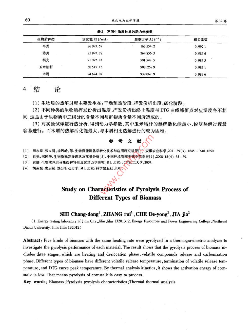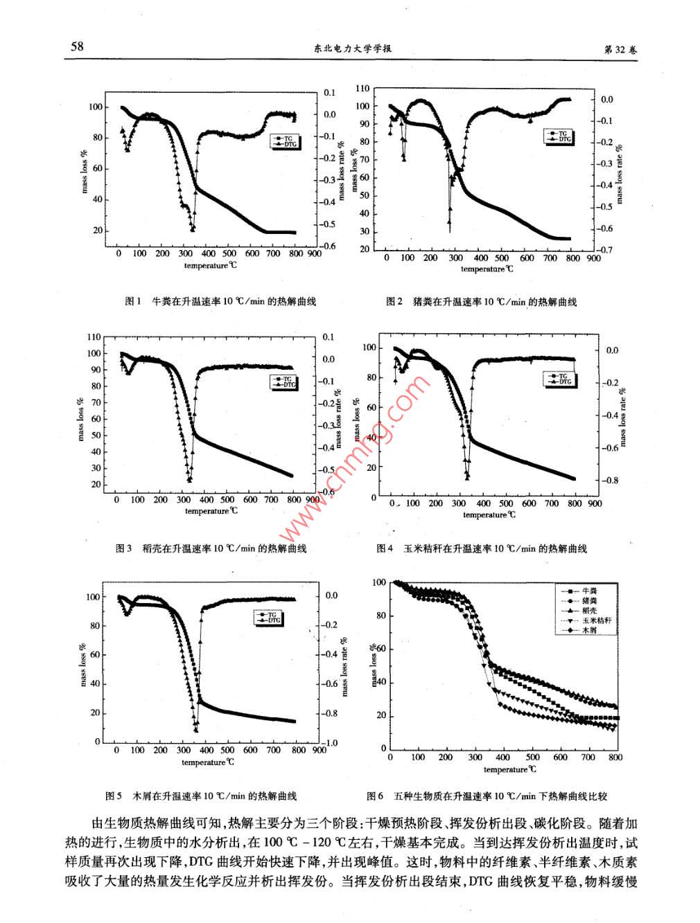 第32卷第1期東北電力大學(xué)學(xué)報Vol 32. No. 12012年2月Journal Of Northeast Dianli UniversityFeb.,2012文章編號:1005-2992(2012)01-0057-04不同種類生物質(zhì)熱解特性研究史長東,張銳2,車德勇2,賈嘉2(1.吉林市能源測試檢驗所,吉林吉林132013;2.東北電力大學(xué)能源與動力工程學(xué)院,吉林吉林132012)摘要:在熱重分析儀上,豬糞、稻殼、玉米秸稈、木屑等五種生物質(zhì)進行熱解實驗研究。研究發(fā)現(xiàn),生物質(zhì)的熱解過程可分為干燥預(yù)熱階段、揮發(fā)份析出段、碳化階段。不同種類的生物質(zhì)揮發(fā)份析出溫度、揮發(fā)份析出終止溫度、最大失重速率對應(yīng)溫度均不相同。通過動力學(xué)計算可知玉米秸稈的熱解活化能較小,說明它的熱解過程最容易進行。關(guān)鍵詞:生物質(zhì);熱解;熱分析中圖分類號:TK6文獻標識碼:A生物質(zhì)能是一種豐富的可再生能源。利用生物質(zhì)能在對于調(diào)整能源結(jié)構(gòu)、緩解能源危機和控制溫室氣體排放等方面意義重大生物質(zhì)的熱化學(xué)轉(zhuǎn)換應(yīng)用一直倍受關(guān)注。熱化學(xué)轉(zhuǎn)換可快速將低品質(zhì)的生物質(zhì)能轉(zhuǎn)化成高品位的合成氣、生物油及焦炭。而熱解技術(shù)是生物質(zhì)熱化學(xué)反應(yīng)應(yīng)用的基礎(chǔ),對進一步進行生物質(zhì)的液化、氣化等研究有著重要的指導(dǎo)意義。依據(jù)來源的不同,將生物質(zhì)分為林業(yè)資源、農(nóng)業(yè)資源、生活污水和工業(yè)有機廢水、城市固體廢物和畜禽糞便等五大類2。本文在熱重分析儀上研究了木屑,秸稈、稻殼和牛糞豬糞的熱解特性,并進行了熱動力學(xué)分析,比較其活化能大小關(guān)系,為進一步研究生物質(zhì)的熱化學(xué)轉(zhuǎn)化提供基礎(chǔ)數(shù)據(jù)。1實驗材料與物性分析本實驗選用的實驗樣品分別為吉林市養(yǎng)殖場的牛糞與豬糞,吉林市木材加工廠的廢棄物木屑,稻米加工廠的稻殼以及農(nóng)田里的廢棄玉米秸稈。實驗前將樣品充分干燥后研磨至0.2mm以下密封保存。實驗儀器采用TA公司的SDTQ600型熱重分析儀。試驗采用非等溫法,升溫速率為10℃/min,溫度范圍為室溫到800℃,通人高純氮氣作為載氣。2實驗結(jié)果及分析圖1-5分別為升溫速率10℃/min下牛糞、豬糞、稻殼、玉米秸稈、木屑的TG及DTG曲線。圖6為五種生物質(zhì)的熱解失重曲線比較。收稿日期:2011-11-20作者簡介:史長東(196-),男,吉林省吉林市人,吉林市能源測試檢驗所高級工程師,主要研究方向:能量平衡測試、石油化工分析等東北電力大學(xué)學(xué)報第32卷110706030圖1牛糞在升溫速率10℃/min的熱解曲線2豬糞在升溫速率10℃/min的熱解曲線I100.110000506010020030040050060070080090000,100200300400500600700800900圖3稻殼在升溫速率10℃/min的熱解曲線圖4玉米秸稈在升溫速率10℃/min的熱解曲線豬糞稻殼0.2玉米秸利60040.600400500600700800圖5木屑在升溫速率10℃/min的熱解曲線圖6五種生物質(zhì)在升溫速率10℃/mn下熱解曲線比較由生物質(zhì)熱解曲線可知,熱解主要分為三個階段:干燥預(yù)熱階段、揮發(fā)份析出段碳化階段。隨著加熱的進行,生物質(zhì)中的水分析出,在100℃-120℃左右,干燥基本完成。當?shù)竭_揮發(fā)份析出溫度時,試樣質(zhì)量再次出現(xiàn)下降,DTG曲線開始快速下降,并出現(xiàn)峰值。這時,物料中的纖維素、半纖維素、木質(zhì)素吸收了大量的熱量發(fā)生化學(xué)反應(yīng)并析出揮發(fā)份。當揮發(fā)份析出段結(jié)束,DTG曲線恢復(fù)平穩(wěn),物料緩慢第1期史長東等:不同種類生物質(zhì)熱解特性研究失重,此階段為生物質(zhì)碳化階段。圖6中可以看出,不同種類生物質(zhì)失重各不相同,木屑的在揮發(fā)份析出段的失重量最大。表1為不同生物質(zhì)的揮發(fā)份析出溫度t1、揮發(fā)份析出終止溫度2與DTG曲線峰值點對應(yīng)溫度t3。表1不同生物質(zhì)種類揮發(fā)份析出溫度與、揮發(fā)份析出終止溫度與DTG曲線峰值點對應(yīng)溫度與樣品℃℃牛糞343.42378.31豬糞稻殼200.26335.7371.21玉米秸稈l63.43365.17木屑205.15358.77386.8由表1可知,不同的生物質(zhì)種類熱解的溫度區(qū)間不同,DTG的峰值點溫度不同。這是由于生物質(zhì)三組分含量不同以及礦物質(zhì)含量與種類不同導(dǎo)致的。木質(zhì)素,纖維素,半纖維素的揮發(fā)份析出溫度段各不相同3,所以不同種類的生物質(zhì)的主要熱解段的溫度范圍也不相同。而生物質(zhì)內(nèi)所含礦物質(zhì)可對生物質(zhì)熱解過程產(chǎn)生催化作用。3熱解動力學(xué)參數(shù)根據(jù)試樣的TG曲線我們可以得到試樣的質(zhì)量隨溫度的變化。試樣在實驗中的質(zhì)量變化比用轉(zhuǎn)化率來表示,寫作:(1)其中:mo為試樣初始質(zhì)量,mg;m,為試樣任意時刻質(zhì)量,mg;m為試樣終止質(zhì)量,mg。生物質(zhì)熱解動力學(xué)方程式可表示為k·f(a)f(a)為熱解機理函數(shù)的微分形式,根據(jù)以往經(jīng)驗選用一級反應(yīng)動力學(xué)機理fk為反應(yīng)速率常數(shù),根據(jù) Arrhenius定律Ek Aexp( rt(4)將公式(3)和公式(4)帶人公式(2),積分后得到In(1-a)ARn5(12RT)E(5)其中φ為升溫速率,A為頻率因子,E為活化能。對不同時間段的ln10)]9進行直線擬合得到的直線斜率為是節(jié)距為lAC2RTARE由于(1-281)-1,所以節(jié)距可簡化為1B過擬合直線的節(jié)距可以求出生物質(zhì)