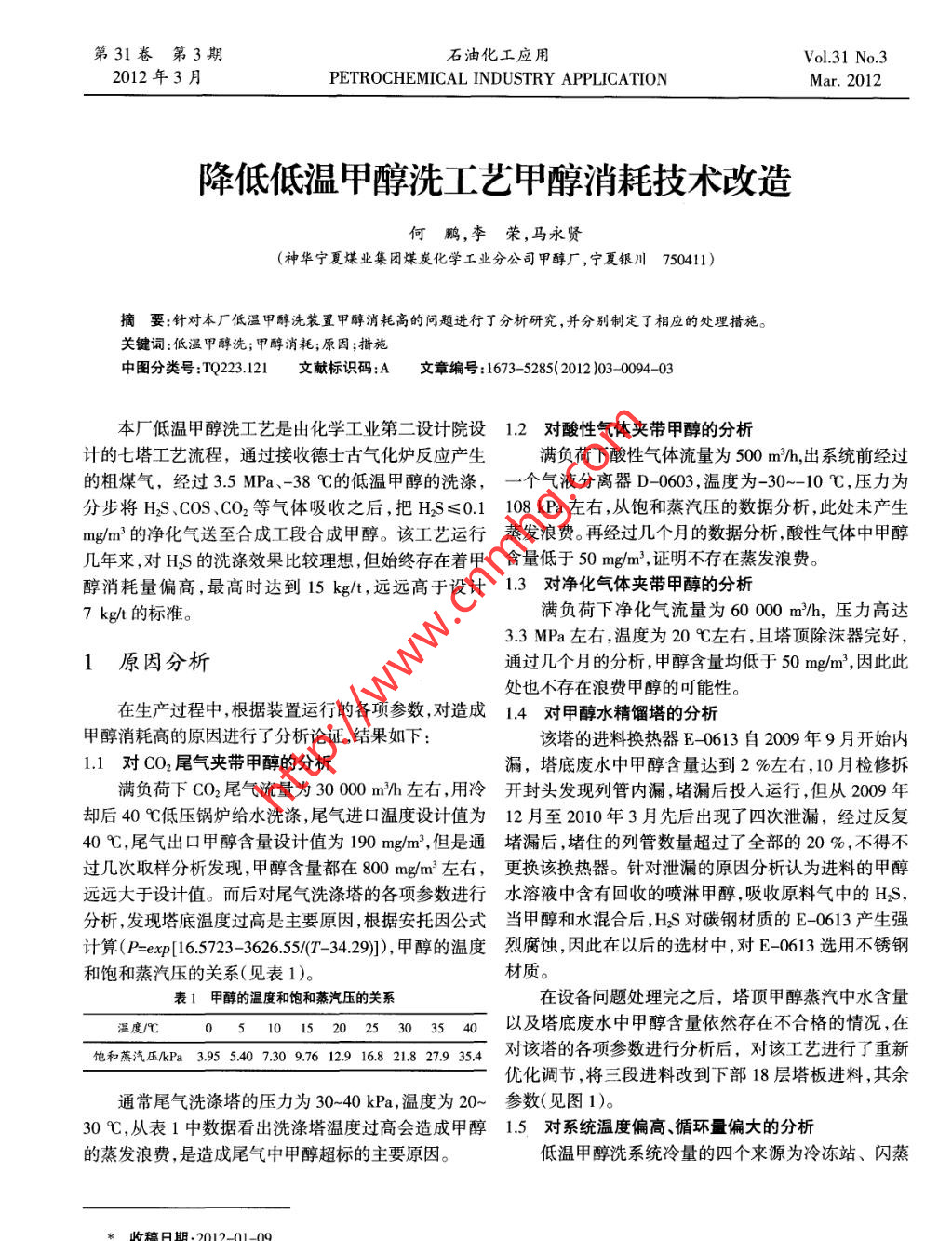 第31卷第3期石油化工應(yīng)用Vol.31 No.32012年3月PETROCHEMICAL INDUSTRY APPLICATIONMar. 2012降低低溫甲醇洗工藝甲醇消耗技術(shù)改造可鵬,李榮,馬永賢(神華寧夏煤業(yè)集團(tuán)煤炭化學(xué)工業(yè)分公司甲醇廠,寧夏銀川750411)摘要:針對本廠低溫甲醇洗裝置甲醇消耗高的問題進(jìn)行了分析研究,并分別制定了相應(yīng)的處理措施。關(guān)鍵詞:低溫甲醇洗;甲醇消耗;原因;措施中圖分類號:TQ223.121文獻(xiàn)標(biāo)識碼:A文章編號:1673- -5285(2012 )03- 0094 -03本廠低溫甲醇洗工藝是由化學(xué)工業(yè)第二設(shè)計(jì)院設(shè)1.2 對酸性氣體夾帶 甲醇的分析計(jì)的七塔工藝流程,通過接收德士古氣化爐反應(yīng)產(chǎn)生滿負(fù)荷下酸性氣體流量為500 m/h,出系統(tǒng)前經(jīng)過的粗煤氣,經(jīng)過3.5 MPa.-38 C的低溫甲醇的洗滌,- 個氣液分離器D- -0603,溫度為-30~-10 C,壓力為分步將H2S、COS、CO2等氣體吸收之后,把HS≤0.1108 kPa左右,從飽和蒸汽壓的數(shù)據(jù)分析,此處未產(chǎn)生m/m2'的凈化氣送至合成工段合成甲醇。該工藝運(yùn)行蒸發(fā)浪費(fèi)。 再經(jīng)過幾個月的數(shù)據(jù)分析,酸性氣體中甲醇幾年來,對HS的洗滌效果比較理想,但始終存在著甲含 量低于50 mg/m',證明不存在蒸發(fā)浪費(fèi)。醇消耗量偏高,最高時達(dá)到15 kg/t, 遠(yuǎn)遠(yuǎn)高于設(shè)計(jì)1.3對凈化氣體夾帶甲醇的分析7 kg/t 的標(biāo)準(zhǔn)。滿負(fù)荷下凈化氣流量為60 000 m2/h, 壓力高達(dá)3.3MPa左右,溫度為20C左右,且塔頂除沫器完好,1原因分析通過幾個月的分析,甲醇含量均低于50mg/m',因此此處也不存在浪費(fèi)甲醇的可能性。在生產(chǎn)過程中,根據(jù)裝置運(yùn)行的各項(xiàng)參數(shù),對造成1.4 對甲醇水精餾塔的分析甲醇消耗高的原因進(jìn)行了分析論證,結(jié)果如下:該塔的進(jìn)料換熱器E -0613自2009年9月開始內(nèi).1 對CO2尾氣夾帶甲醇的分析漏,塔底廢水中甲醇含量達(dá)到2 %左右,10月檢修拆滿負(fù)荷下CO2尾氣流量為30 000 m2/h 左右,用冷開封頭 發(fā)現(xiàn)列管內(nèi)漏,堵漏后投人運(yùn)行,但從2009年卻后40 C低壓鍋爐給水洗滌,尾氣進(jìn)口溫度設(shè)計(jì)值為12 月至2010年3月先后出現(xiàn)了四次泄漏,經(jīng)過反復(fù)40 C,尾氣出口甲醇含量設(shè)計(jì)值為190 mg/m',但是通堵漏后 ,堵住的列管數(shù)量超過了全部的20 % ,不得不過幾次取樣分析發(fā)現(xiàn),甲醇含量都在800 mg/m3左右,更換該換熱器。 針對泄漏的原因分析認(rèn)為進(jìn)料的甲醇遠(yuǎn)遠(yuǎn)大于設(shè)計(jì)值。而后對尾氣洗滌塔的各項(xiàng)參數(shù)進(jìn)行水溶液中含有回收的噴淋甲醇,吸收原料氣中的H2S,分析,發(fā)現(xiàn)塔底溫度過高是主要原因,根據(jù)安托因公式當(dāng)甲 醇和水混合后,H2S對碳鋼材質(zhì)的E -0613產(chǎn)生強(qiáng)計(jì)算(P=exp[16.5723- 36.5/// -4.29)),甲醇的溫度烈腐蝕 ,因此在以后的選材中,對E- 0613選用不銹鋼和飽和蒸汽壓的關(guān)系(見表1)。材質(zhì)。表1甲醇的溫 度和飽和蒸汽壓的關(guān)系在設(shè)備問題處理完之后,塔項(xiàng)甲醇蒸汽中水含量溫度/C0..510152025303540以及塔底廢水中甲醇含量依然存在不合格的情況,在飽和蒸汽壓/kPa 3.95 5.40 7.30 9.76 12.9 16.8 21.8 27.9 35.4對該塔的各項(xiàng)參數(shù)進(jìn)行分析后,對該工藝進(jìn)行了重新優(yōu)化調(diào)節(jié),將三段進(jìn)料改到下部18層塔板進(jìn)料,其余通常尾氣洗滌塔的壓力為30~ 40 kPa,溫度為20~參數(shù)( 見圖1)。30 C,從表1中數(shù)據(jù)看出洗滌塔溫度過高會造成甲醇1.5 對系統(tǒng)溫度偏高、循環(huán)量偏大的分析的蒸發(fā)浪費(fèi),是造成尾氣中甲醇超標(biāo)的主要原因。低溫甲醇洗系統(tǒng)冷量的四個來源為冷凍站、閃蒸*收稿日期:2012-01-09第3期何鵬降低低溫甲醇洗工藝甲醇消耗技術(shù)改造9T10638 84C可以看出主要原因是塔底溫度過高導(dǎo)致的,只要降低甲醇蒸氣0溫度就行,但過低的溫度影響設(shè)備壽命,另外對后續(xù)甲甲醇3m2醇水塔的進(jìn)料溫度也有影響,還會加大能耗。因此需從兩方面著手,- -方面適當(dāng)加大塔頂洗滌水量,另- -方面T-060726需要適當(dāng)降低塔底溫度才行。(直22針對加大洗滌水做以下調(diào)節(jié),以下為2010年7月E-0613TI0637 85C18調(diào)整后報表數(shù)據(jù)統(tǒng)計(jì)(見圖2)。.甲醇、水9m'8一一洗滌水(m'/n)6十一: =排放氣甲醇一(x100mg/m")水8m’TI0642 124CP10609 170kPa日1 低溫甲醇洗工藝改造流程圖35791113151719212325 27 29 .(氣提)、冷卻水和節(jié)流,其中最主要的冷量是由冷凍站圖2洗滌水調(diào)節(jié)示意圖和閃蒸提供的。如果系統(tǒng)冷量不足,溫度上升,為了保從圖2中可以看出,洗滌水控制在7~8 m3左右對證凈化氣的合格,不得不通過加大甲醇循環(huán)量來保證,指 標(biāo)控制比較合適。而甲醇循環(huán)量的加大則會造成溫度的進(jìn)一步升高 ,形其次針對塔底溫度做以下調(diào)節(jié),以下為2010年8成惡性循環(huán),導(dǎo)致甲醇的浪費(fèi)。月份調(diào)整后報表數(shù)據(jù)統(tǒng)計(jì)(見圖3)。2009年裝置運(yùn)行過程中,發(fā)現(xiàn)氨冷器各出口溫度逐漸由原來的- -30 C上升到了-25 C,經(jīng)檢查發(fā)現(xiàn)氨冷3(器有內(nèi)漏現(xiàn)象,導(dǎo)致甲醇和氨的換熱效果不良,利用大25=塔底溫度心-排放氣甲醇檢修對氨冷器進(jìn)行了處理,