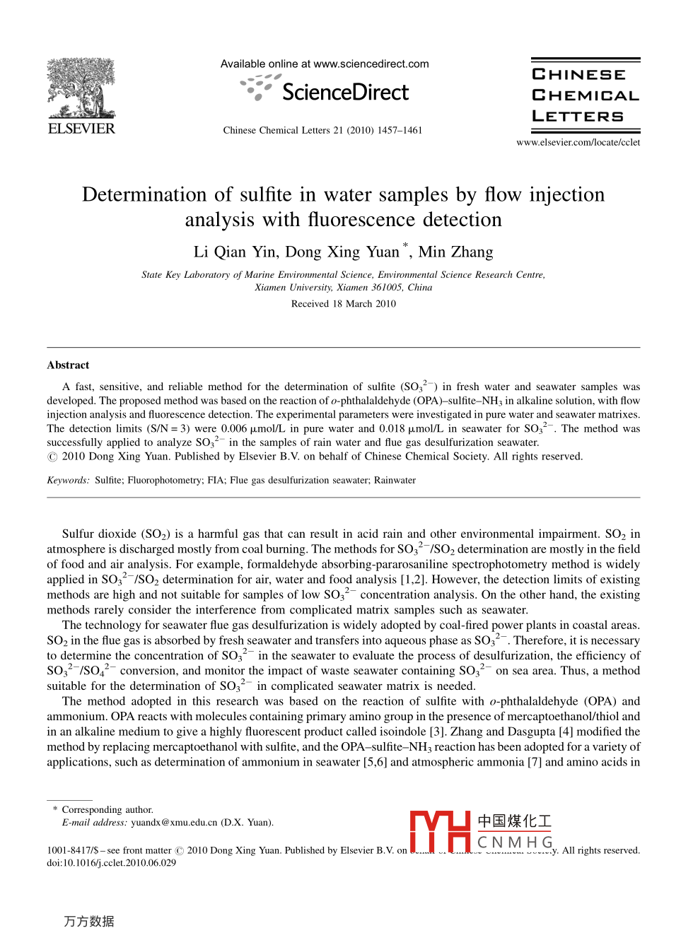 Available online at www.sciencedirect.comCHINESEScienceDirectC HEMICALL .ETTERSELSEVIERChinese Chemical Letters 21 (2010) 1457-1461www.elsevier.com/locate/ccletDetermination of sulfite in water samples by flow injectionanalysis with fluorescence detectionLi Qian Yin, Dong Xing Yuan , Min ZhangState Key Laboratory of Marine Environmental Science, Environmental Science Research Centre,Xiamen University, Xiamen 361005, ChinaReceived 18 March 2010AbstractA fast, sensitive, and reliable method for the determination of sulfite (SO3- ) in fresh water and seawater samples wasdeveloped. The proposed method was based on the reaction of o-phthalaldehyde (OPA)- sulfite-NH3 in alkaline solution, with flowinjection analysis and fluorescence detection. The experimental parameters were investigated in pure water and seawater matrixes.The detection limits (S/N = 3) were 0.006 μmol/L in pure water and 0.018 μmol/L in seawater for SO32- . The method wassuccessfully applied to analyze SO3- in the samples of rain water and fue gas desulfurization seawater.C 2010 Dong Xing Yuan. Published by Elsevier B.V. on behalf of Chinese Chemical Society. All rights reserved.Kerwords: Sufite; Fluorophotometry; FIA; Flue gas desulfurization seawater; RainwaterSulfur dioxide (SO2) is a harmful gas that can result in acid rain and other environmental impairment. SO2 inatmosphere is discharged mostly from coal burning. The methods for SO3- /SO2 determination are mostly in the fieldof food and air analysis. For example, formaldehyde absorbing-pararosaniline spectrophotometry method is widelyapplied in SO3- /SO2 determination for air, water and food analysis [1,2]. However, the detection limits of existingmethods are high and not suitable for samples of low SO3- concentration analysis. On the other hand, the existingmethods rarely consider the interference from complicated matrix samples such as seawater.The technology for seawater fue gas desulfurization is widely adopted by coal-fired power plants in coastal areas.SO2 in the flue gas is absorbed by fresh seawater and transfers into aqueous phase as SO32- . Therefore, it is necessaryto determine the concentration of SO3'- in the seawater to evaluate the process of desulfurization, the efficiency ofSO32- /SO4- conversion, and monitor the impact of waste seawater containing SO3on sea area. Thus, a methodsuitable for the determination of SO32- in complicated seawater matrix is needed.The method adopted in this research was based on the reaction of sulfite with o-phthalaldehyde (OPA) andammonium. OPA reacts with molecules containing primary amino group in the presence of mercaptoethanol/thiol andin an alkaline medium to give a highly fluorescent product called isoindole [3]. Zhang and Dasgupta [4] modified themethod by replacing mercaptoethanol with sulfite, and the OPA- sulfite -NH3 reaction has been adopted for a variety ofapplications, such as determination of ammonium in seawater [5,6] and atmospheric ammonia [7] and amino acids inCorresponding author.E-mail address: yuandx @ xmu.edu.cn (D.X. Yuan).中國(guó)煤化工1001-8417/$ - see front matter◎2010 Dong Xing Yuan. Published by EIsevier B.V. onCHCNMHGAll rights reserved.doi: 10.1016/.cclet.2010.06.0291458L.Q. Yin et al./Chinese Chemical Letters 21 (2010) 1457 -1461clinical samples [8]. The isoindole derived from OPA- -sulite- -NH3 reaction can be determined at ^ex = 362.5 nm andλem= 423.0 nm with a fuorescence detector [5]. However, studies of sulfite determination on the basis of OPA -sulfite- NH3 reaction are few. Tzanavaras et al. [9] determined total sulfite in wines based on the reaction of OPA andNH4Cl in basic medium with sequential injection technique.In this work, the reaction of OPA- -sulite- NH3 in alkaline solution was applied to determine SO32-:in watersamples. The reagents and instrumental parameters were investigated to suit the analyses of fresh water and seawater,respectively. .1. ExperimentalI.I. ReagentsOPA, NH4Cl, ethanol, Na2SO3, HCHO, Na2HPO4, borax and NaOH were purchased from Sinopharm ChemicalReagent Co., China. Pure water(18.2 MA cm) was obtained from a Milli-Q water purification system (Millipore Co.,USA). Reagent 1 (R1), containing 10 mmol/L of OPA, was made by dissolving 1.34 g OPA in 75 mL ethanol anddiluting to 1 L with pure water. Reagent 2 (R2), containing 2.5 mmol/L of NH4Cl, was made by dissolving 0.134gNH4Cl in 1 L pure water, Na2HPO4 was used as buffer at a concentration of 34.4 mmol/L, pH was adjusted withNaOH solution. R2 was used for freshwater measurement. Reagent 3 (R3), containing 2.5 mmol/L of NH4Cl, boraxwas used as buffer at a concentration of 13.5 g/L, pH was adjusted with NaOH solution. R3 was used for seawatermeasurement.1.2. StandardsA 10 mmol/L SO3- stock solution was made daily by dissolving sodium sulfite solid (its purity was determinedbefore use) in 100 mL of 10 mmol/L HCHO solution.1.3. SamplingThe rain water sample was collected in Xiamen University campus, November 12, 2009. The seawater sampleswere obtained from the aeration tank of flue gas desulfurization waste seawater inside a power plant and sea area nearto waste seawater discharging outlets. Samples were added with HCHO right after collection to reach a concentrationof 1 mmol/L HCHO in samples, and filtrated through a filter membrane of 0.45 μm pore diameter before analyzing.Samples with high SO3- concentration should be diluted before analysis.1.4. Analytical equipmentsHH-1 water bath device (Shunhua Instrument Inc., Jintan, China), a 4-channel LEAD-1 peristaltic pump (LongerPrecision Pump Inc., Baoding, China), a 6-way Vici valve (Valco Co, USA), and a flow-through RF-10A XLfluorescence detector (Shimadzu Co., Japan).The flow injection analysis (FIA) schematic diagram is shown in Fig. 1. Samples or standard solutions werepumped into sampling loop at flled position. Pure water or seawater was used as a carrier at injection position to putthe sample zone forward. R1 merged with R2 in the connecting tu
