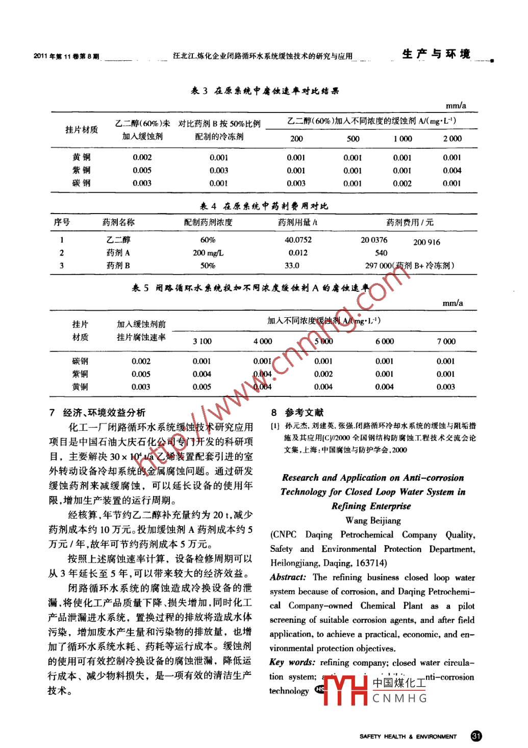 2011年第11卷第8期生產(chǎn)與環(huán)境編輯倪桂才煉化企業(yè)閉路循環(huán)水系統(tǒng)緩蝕技術(shù)的研究與應(yīng)用汪北江(中國石油大慶石化公司質(zhì)量安全環(huán)保處,黑龍江大慶163714)摘要:分析了煉化企業(yè)閉路循環(huán)水系統(tǒng)腐動力車間閉路循環(huán)水系統(tǒng),主要為乙烯裝置蝕的原因,并以大慶石化公司所屬化工一廠為試裂解爐(A.E).丁二烯裝置室外轉(zhuǎn)動設(shè)備提供冷點,篩選了合適的緩蝕藥劑,并經(jīng)現(xiàn)場應(yīng)用,達到卻用水,工藝運行條件為脫鹽水中添加乙二醇降了實用、經(jīng)濟、環(huán)保的目的。低冰點,添加單乙醇胺穩(wěn)定pH值,乙二醇濃度為關(guān)鍵詞:煉化企業(yè)閉路循環(huán)水系統(tǒng) 緩蝕60% ,冰點為. -52C, 來滿足冬季室外低溫運行條劑緩蝕技術(shù)件,泵出口壓力0.4 ~ 0.6 MPa,系統(tǒng)溫度在-30 ~50C范圍內(nèi)變化。系統(tǒng)流程如圖1所示。中國石油大慶石化公司作為中國石油所屬的地區(qū)分公司,是以大慶油田原油輕烴、天然氣為主要原料,從事煉油、乙烯、塑料、橡膠、化工延伸乙二加工、液體化工、化肥、化纖生產(chǎn),并承擔工程技醇罐術(shù)服務(wù)、生產(chǎn)技術(shù)服務(wù)、機械加工制造、礦區(qū)服務(wù)等職能的特大型石油化工聯(lián)合企業(yè)。原油年加工能力650萬噸,擁有生產(chǎn)及輔助裝置137套。近年z二醇泵來,公司所屬煉化單位閉路循環(huán)水系統(tǒng)的腐蝕問乙烯裝置題日趨嚴重,雖然短時間內(nèi)對生產(chǎn)裝置運行影響乙二醇泵不明顯,但從長遠來看,腐蝕泄漏問題將對產(chǎn)品地溝循環(huán)水→4直質(zhì)量及效益產(chǎn)生嚴重影響,因此對工業(yè)循環(huán)水系乙二醇冷卻器統(tǒng)采取有效的緩蝕措施對維持系統(tǒng)長周期穩(wěn)定運行是非常重要的"。2009年初,公司成立了課題攻圖1閉路循環(huán)水系統(tǒng)流程示意關(guān)組,以化工一廠為對象開展了閉路循環(huán)水系.統(tǒng)緩蝕技術(shù)的專項研究,攻克技術(shù)難關(guān),最終使收稿日期:2011-05-11閉路循環(huán)水系統(tǒng)腐蝕問題得到徹底解決。作者簡介:汪北江,工程師,注冊安全工程師,1994年畢業(yè)于哈爾濱工程大學環(huán)境工程專業(yè),1化工一廠閉路循環(huán)水系統(tǒng)概況中國煤化工質(zhì)量安全環(huán)1.1化工一廠 閉路循環(huán)水系統(tǒng)流程保處。MYHCNMHGSAFETY HEALTH & ENVIRONMENT.安全健康環(huán)境生產(chǎn)與環(huán)境2011年第11卷第8期1.2系統(tǒng)運行存在的問題3試驗監(jiān)測系統(tǒng)原設(shè)計只添加乙二醇,在長時間封閉按照研究目標與內(nèi)容,按步驟通過試驗監(jiān)測運行后,系統(tǒng)藥劑量減少,應(yīng)補加乙二醇、單乙以下數(shù)據(jù)。醇胺或脫鹽水。系統(tǒng)運行至現(xiàn)在,出現(xiàn)問題如a)閉路循環(huán)水在運行條件下的碳鋼、銅腐蝕下。速率。a)運行中水質(zhì)變混濁并呈紅色。水質(zhì)分析結(jié)b)現(xiàn)場閉路循環(huán)水在試驗室條件下,加入復果見表1。分析數(shù)據(jù)表明,系統(tǒng)內(nèi)總鐵量較高,有配緩蝕藥劑后,監(jiān)測碳鋼與銅腐蝕速率值。鐵腐蝕傾向。c)在試驗室條件下,將商品藥劑配制的乙二表1化工一廠閉路循環(huán)水系統(tǒng)水質(zhì)分析數(shù)據(jù)醇水溶液加入復配的緩蝕藥劑,監(jiān)測碳鋼、銅腐蝕速率值。分析項目總鐵離子1鈣離子1電導 1pHd)單乙醇胺溶液中碳鋼、銅的腐蝕速率。(mg'L')(mg*L") (μs'cm*)e)在不同的緩蝕藥劑投加濃度和pH值下的結(jié)果323348.7碳鋼、銅腐蝕速率。b)現(xiàn)場掛片測定系統(tǒng)的腐蝕狀況,銅腐蝕速f)閉路循環(huán)水中的異氧菌的測定。率超標,測定結(jié)果如表2。g)投加緩蝕藥劑后的冰點的測定。表2不同材質(zhì)掛片腐蝕速率監(jiān)測數(shù)據(jù)mm/a4技術(shù)考核指標材質(zhì)碳鋼黃銅紫銅根據(jù)GB 50050- -2007《工業(yè)循環(huán)冷 卻水處理設(shè)計規(guī)范》要求,腐蝕速率控制標準如下:腐蝕速率0.004 70.78640.1855腐蝕速率標準值0.0750.005碳鋼腐蝕速率≤0.075 mn/a;銅腐蝕速率≤0.005 mm/a。1.3腐蝕原因分析根據(jù)上述監(jiān)測數(shù)據(jù),理論上分析腐蝕主要為5試驗數(shù)據(jù)與結(jié)論化學腐蝕和電化學腐蝕。經(jīng)過現(xiàn)場監(jiān)測、試驗室試驗和經(jīng)濟性對比分1.3.1化學腐蝕析,結(jié)果見表3~5?;瘜W腐蝕是因系統(tǒng)中的銅材質(zhì)與單乙醇胺發(fā)由表3可知,在原系統(tǒng)中,乙二醇加緩蝕劑A生化學作用而引起的化學反應(yīng),生成銅氨絡(luò)離與對比藥劑B控制腐蝕的能力相當,且表中不同.子。反應(yīng)式:Cu + 4NH3→Cu(NH)2*。.濃度緩蝕劑A均可滿足標準要求,考慮到經(jīng)濟1.3.2電化學腐蝕性,選用濃度較小的200 m/L。電化學腐蝕在腐蝕過程中有電流產(chǎn)生,按照在費用方面,乙二醇加緩蝕劑A低于對比藥電化學作用機理,系統(tǒng)中的金屬鐵是陽極,氧是劑B,故最終選用乙二醇加緩蝕劑A方案。陰極,而引起鐵腐蝕。由表5可知,緩蝕劑A的濃度大于3100mg/L陽極反應(yīng)式:Fe→Fe2+ +2e ;條件下,可滿足碳鋼腐蝕速率≤0.075mm/a、銅腐陰極反應(yīng)式: 02+ 2H2O + 4e→40H。蝕速率≤0.005 mm/a的標準要求。2研究目標與內(nèi)容6現(xiàn)場應(yīng)用a)在不改變現(xiàn)有工藝、水質(zhì)的運行條件下,在現(xiàn)有水質(zhì)條件下,綜合考慮經(jīng)濟