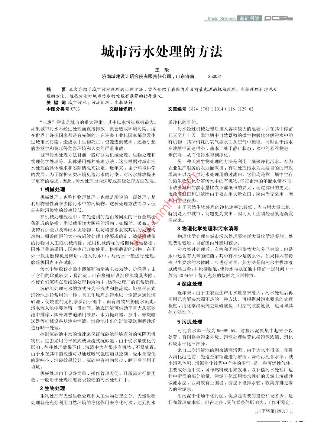 Basic Science基礎(chǔ)科學(xué)口c城市污水處理的方法濟(jì)南城建設(shè)計(jì)研究院有限責(zé)任公司,山東濟(jì)南250031摘要本文介紹了城市污水處理的六種方法,重點(diǎn)介紹了在國內(nèi)外目前最先進(jìn)的機(jī)械處理、生物處理和污泥處理的方法。這些方法對(duì)城市污水的處理有很強(qiáng)的指導(dǎo)意義關(guān)鍵詞城市污水;污泥處理,生物降解中圖分類號(hào)X703文獻(xiàn)標(biāo)識(shí)碼A文章編號(hào)1674-6708(2014)116-0129-02廢”污染是城市的重大污染,其中以水污染危害最大。質(zhì)凈化的目的如果城市污水不經(jīng)過處理而直接排放,就會(huì)造成環(huán)境污染。這污水經(jīng)過機(jī)械處理后排入容積較大的池塘,并在其中停留在世界上許多國家都是有先例的。在許多工業(yè)化國家都曾發(fā)生幾天至幾十天,靠池塘中自然繁殖的微生物氧化分解污水中的過城市水污染,造成水中生物死亡,資源遭到破壞,還會(huì)引起有機(jī)物,其所消耗的氧氣靠水面從空氣中攝取。同時(shí)由于污水病害發(fā)生和蔓延等危害環(huán)境和人類的嚴(yán)重事故在池塘中流速很小,基本上處于靜止?fàn)顟B(tài),水中的懸浮物進(jìn)城市污水處理方法目前一般可分為機(jī)械處理、生物處理和步沉降,從而使污水得到凈化。物理化學(xué)處理等。具體采用哪種處理方法,這應(yīng)根據(jù)對(duì)城市污另一種天然生物處理的方法是利用土壤來凈化污水。有為水處理的具體要求和實(shí)際情況來決定。近年來,由于環(huán)境科學(xué)農(nóng)業(yè)生產(chǎn)服務(wù)的農(nóng)業(yè)灌溉田:有以處理污水為主要目的的市政的發(fā)展,為了保護(hù)人類環(huán)境免遭污水的污染,對(duì)污水排放提出灌溉田以及專供污水處理用的過濾田。它們均是靠士壤中生存了更高的要求,因此,污水處理也向深度或高級(jí)處理方面發(fā)展。的微生物氧化分解污水中的有機(jī)物,但每畝地的年灌水量不同1機(jī)械處理市政灌溉田的灌水量比農(nóng)業(yè)灌溉田的要大,而過濾田的更大。械處理,也稱作物理處理,也就是所說的一級(jí)處理,是市政灌溉田和過濾因由于要占用大量農(nóng)田,園內(nèi)尚無采用,因利用物理性質(zhì)來去除污水中的污染物。這種處理方法簡(jiǎn)單,但外用的也很少。是去除污染物的效率較低。由于天然生物外理的凈化速率比較低,需占用大量土地在機(jī)械處理流程中,首先遇到的是由等間距的平行金屬柵特別是大中城市,問題更為突出,因而人工生物處理就逐漸發(fā)條組成的格柵,用以截留較大顆粒的污物,如棉絲、破布、大展起來塊磚石爐渣以及碎紙木塊等物,以防堵塞水泵或其后的處理構(gòu)3物理化學(xué)處理和污水消毒筑物。柵條間距的大小按后續(xù)處理工序要求確定。被格柵截留物理化學(xué)處理在城市污水處理要消耗大量化學(xué)混凝劑,處的污物可人工或機(jī)械清除。采用機(jī)械淸除的格柵稱機(jī)械格柵費(fèi)用較貴,目前國內(nèi)外應(yīng)用較少。國外已普遍采用,國內(nèi)也已開始使用。格柵截留的污物,在國污水經(jīng)過處理后,有機(jī)和無機(jī)污染物大部分已去除,但是外一般用磨碎機(jī)磨碎后,投入污水中,與污水一起進(jìn)行處理。水中還含有大量的細(xì)菌,其中有不少是病原體。如果排入有特磨碎機(jī)國內(nèi)正在試制。殊衛(wèi)生要求的水體時(shí),應(yīng)進(jìn)行消毒。其方法是向污水中投加液污水中顆粒較小的不溶解礦物雜質(zhì)主要為砂、爐渣等,由氮或漂白粉,并設(shè)接觸池,使污水與氮在池中停留一定時(shí)問(于它們的比重較大,易沉淀,可在格柵后設(shè)沉砂池將其去除,般為30分鐘)得到充分的接觸之后再排放不使它們沉積在后續(xù)的處理構(gòu)筑物中,妨礙處理廠的正常運(yùn)行4深度處理砂池處理污水的方式分為平流式和豎流式。矩形平流式沉沙池是較常用的一種,其工作原理是污水以一定流速通過沉近年來,由于工農(nóng)業(yè)生產(chǎn)用水量愈來愈大,污水處理后再砂池,使較重的無機(jī)雜質(zhì)沉于池中,而有機(jī)物質(zhì)仍隨水流走回用已為解決水源不足的一種方法??筛鶕?jù)對(duì)污水要求的處理污水流入池中要停留一段時(shí)間。池底沉渣可借助于重力從沉砂程度,用化學(xué)混凝劑去除磷酸鹽:用空氣吹脫氨氮:也可和其池中排除,國外則普遍采用砂泵、水力提升器、抓斗、螺旋輸他方法結(jié)合送器等機(jī)械設(shè)備從池中清渣。沉砂池排出的沉渣要送到曬砂場(chǎng)5污泥處理進(jìn)行曬干處理污泥含水率一般為95-99.5%。這些污泥要集中起來予以控制沉砂池中水的流速來保證沉砂池能夠有效的沉降無機(jī)處置,否則將會(huì)污染外境。污泥處理裝置包括污泥濃縮、消化物質(zhì)。過去采用的平流式或豎流式沉砂池,由于受水量變化的影響,往往處理效果不佳,沉渣中含有很多有機(jī)物,不易處置。和脫水干化三部分來自二次沉淀池的剩余活性污泥,由于含水率很高,在進(jìn)由于水在其中的流速可以通過曝氣強(qiáng)度加以控制,受水量變化入消化池之前,先送至濃縮池進(jìn)行濃縮,降低污泥含水率,減的影響小,沉砂效果較好,沉砂中有機(jī)物很少,曬干后可用于小污泥體積。污泥消化過程中產(chǎn)生的沼氣,是一種可燃性氣體填坑機(jī)械處理