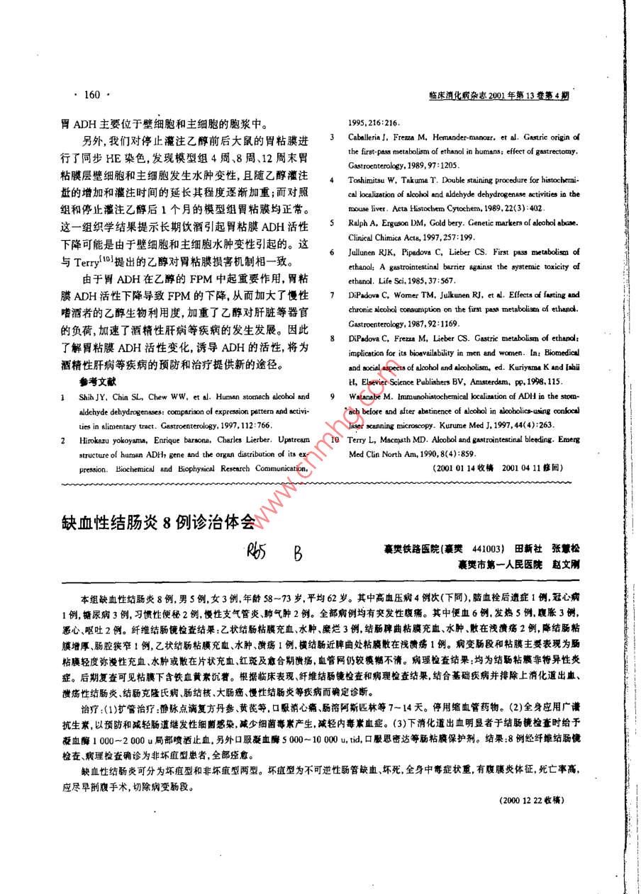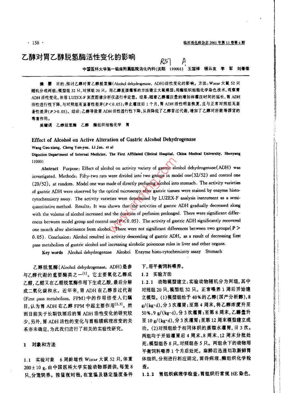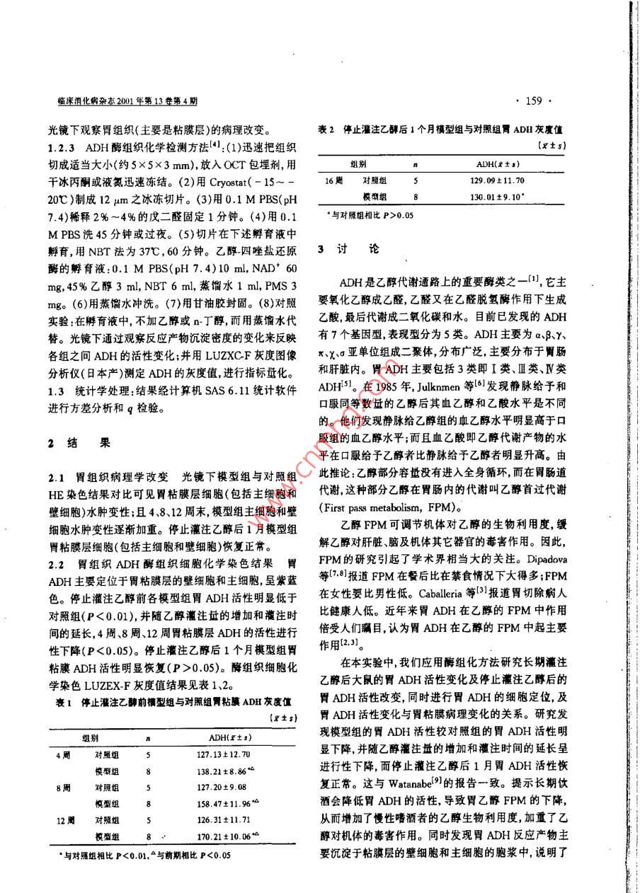 158臨床消化病雜2001年第13卷第4期乙醇對胃乙醇脫氫酶活性變化的影響 R5T A中國醫(yī)科大學(xué)第一臨床附屬醫(yī)院消化內(nèi)科(沈陽1001王國祥程云友李軍劉春榮摘目的:探討乙醇對胃乙醇脫氫酶( Alcohol dehydrogenase,dh)活性變化的影響。方法: Wistar大鼠52只隨機(jī)分成兩組:模型組32只,對照組20只。用乙醇直接灌胃的方法建立大鼠模型用組織細(xì)胞化學(xué)染色技術(shù)觀察ADH活性變化,并用 LUZEX--F灰度圖像分析儀進(jìn)行半定量。結(jié)果:隨著乙醇灌注量的增加和灌注時間的延長,胃adH活性進(jìn)行性下降與對照組有顯著性差異(P<0.05;停止注后1個月、胃ADH活性明顯恢復(fù),且與正常對照組無顯著性差異(P>0.05)。結(jié)論:乙醇導(dǎo)致胃ADH活性進(jìn)行性下降從而降低了乙醇首過代謝增加了乙醇對肝臟等器官的毒害作用。關(guān)鍵詞乙脫氫酶乙醇組織細(xì)胞化學(xué)胃 Effect of Alcohol on Active Alteration of Gastric Alcohol Dehydrogenase Wang Guo-xiang, Cheng Yun-you, LI Jun, et al Digestion Department of Internal Medicine. The First Affiiated Clnical Hospital, China Medical Uaiversity, Shenyang110001 Abstract Purpose: Effect of alcohol on activity variety of gastric alcohol dehydrogenase( ADH) was investigated. Methods: Fifty-two rats were divided into two groups in model one(32/52) and control one (20/52), at random. Model one was made of directly perfusing alcohol into stomach. The activity varieties of gastric ADH were observed by the optical microscopy after gastric tissues were stained by enzyme hista- cytochemistry assay. The activity varieties were determined by LUZEX-F analysis instrument as a semi quantitative method. Results: It was shown that the activities of gastric ADH gradually decreased along with the volume of alcohol increased and the duration of perfusion prolonged. There were significant differ- ences between model group and control one(<0.05). The activity of gastric ADH significantly recovered one month after abstinence from alcohol. There were not significant differences between two groups(P 0.05). Conclusion: Alcohol resulted in activity descending of gastric ADH, as a result of decreasing first Key words Alcohol dehydrogenase Alcohol Enzyme histo-cytochemistr assay Stomach乙醇脫氫酶( Alcohol dehydrogenase,ADH)是參下,用平衡飼料喂養(yǎng)。與乙醇代謝的重要酶類之一。它主要氧化乙醇成1.2實(shí)驗(yàn)方法乙醛,乙醛又在乙醛脫氫酶作用下生成乙酸,最后分解1.2.1動物模型建立:實(shí)驗(yàn)動物隨機(jī)分為兩組,其中成二氧化碳和水。近年來,胃ADH在乙醇首過代謝對照組20只,模型組32只。正常喂養(yǎng)1周后開始建(First pass metabolism,FPM)中的作用倍受人們矚立模型。(1)模型組給予40%的乙醇(國產(chǎn)分析醇),8目,認(rèn)為胃ADH在乙醇FPM中起主要作用231然g/(kgd),分3次胃至第4周末,將乙醇濃度升至而目前關(guān)于長期飲酒后的胃ADH活性變化的研究較50%,9g/(kgd),分3次至第8周末,乙醇量升少,另外,胃ADH活性的變化與胃粘膜病理改變的關(guān)至10g/(kgd)分3次灌胃;至第12周末模型建立成系亦未確定,為此我們進(jìn)行了相關(guān)的實(shí)驗(yàn)性研究。功(2)對照組給予相同體積的蒸餾水灌胃,日3次兩組均于開始胃后4周末、8周末、12周末分批處1對象和方法死:模型組各8只,對照組各5只。兩組余下的動物用平衡飼料喂養(yǎng)1個月后處死。麻醉后迅速切取新鮮胃1.1實(shí)驗(yàn)對象6周齡雄性 Wistar大鼠52只,體重體組織,分別進(jìn)行相應(yīng)固定留待病理酶組織化學(xué)檢200±10g,由中國醫(yī)科大學(xué)實(shí)驗(yàn)動物部提供,每籠8查。只,分籠飼養(yǎng)按夜時程,在室溫及穩(wěn)定濕度條件1.2.2胃組織病理學(xué)檢查:胃組織行常規(guī)HE染色,臨床消化病雜2001年第13第4期159光鏡下觀察胃組織(主要是粘膜層)的病理改變。表2停止灌注乙醇后1個月模型組與對照組胃ADH灰度值1.2.3ADH酶組織化學(xué)檢測方法1:(1)迅速把組織x±s)切成適當(dāng)大小(約5×5×3mm),放入OCT包埋劑,用組別ADh(千冰丙酮或液氮迅速凍結(jié)。(2)用 Cryostat(-15~16周對照組5129.09±11.7020℃)制成12m之冰凍切片。(3)用0.1MPBS(pH模組8130.01±9.107.4)稀釋2%~4%的戊二醛固定1分鐘。(4)用0.1·與對照組相比P>0.05MPBS洗45分鐘或過夜。(5)切片在下述孵育液中孵育,用NBT法為37℃,60分鐘。乙醇四唑鹽還原3討論酶的孵育液:0.1MPBS(p7.4)10ml,AD+60mg,45%乙醇3ml,nT6ml,蒸餾水1ml,PMS3ADH是乙醇代謝通路上的重要酶類之一,它主mg。(6)用蒸餾水沖洗。(7)用甘油膠封固。(8)對照要氧化乙醇成乙醛,乙醛又在乙醛脫氫酶作用下生成實(shí)驗(yàn):在孵育液中,不加乙醇或n-丁醇,而用蒸餾水代乙酸最后代謝成二氧化碳和水目前已發(fā)現(xiàn)的ADH替。光鏡下通過觀察反應(yīng)產(chǎn)物沉淀密度的變化來反映有7個基因型,表現(xiàn)型分為5類。ADH主要為aBy、各組之間ADH的活性變化;并用 LUZXCF灰度圖像亞單位組成二聚體,分布廣泛主要分布于胃腸分析儀(日本產(chǎn))測定ADH的灰度值,進(jìn)行指標(biāo)量化。和肝臟內(nèi)。胃DH主要包括3類即類、類、Ⅳ類1.3統(tǒng)計學(xué)處理:結(jié)果經(jīng)計算機(jī)SAS6.11統(tǒng)計軟件ADH5在1985年, Julknmen等6發(fā)現(xiàn)靜脈給予和進(jìn)行方差分析和q檢驗(yàn)??谘弁葦?shù)量的乙醇后其血乙醇和乙酸水平是不同的。他們發(fā)現(xiàn)靜脈給乙醇組的血乙醇水平明顯高于2結(jié)果服組的血乙醇水平;而且血乙酸即乙醇代謝產(chǎn)物的水平在口服給予乙醇者比靜脈給予