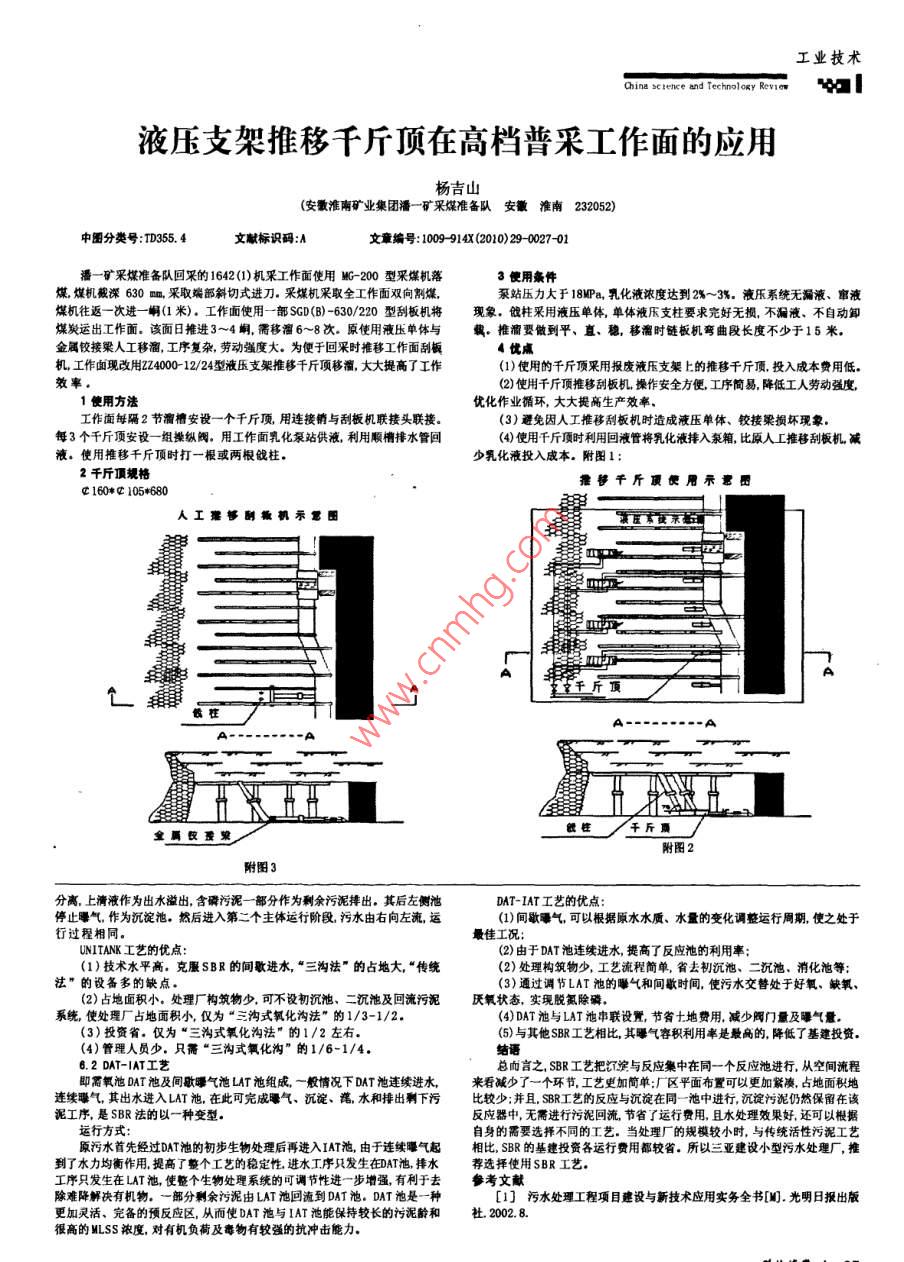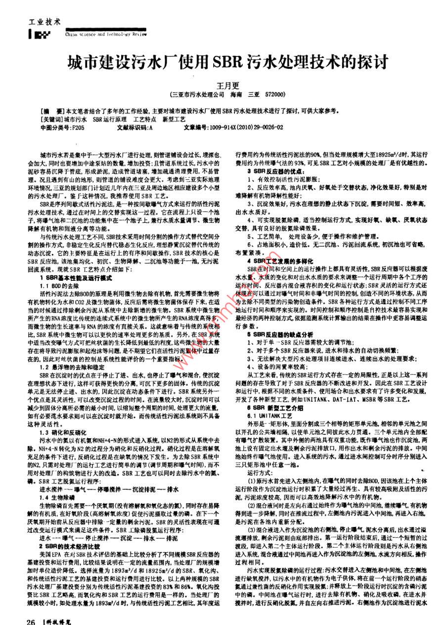 工業(yè)技術IB aaa science and Ter anol wy Revis城市建設污水廠使用SBR污水處理技術的探討王月更三亞市污水處理公司海南三亞572000[摘要本文筆者結合了多年的工作經(jīng)驗,主要對城市建設污水廠使用SBR污水處理技術進行了探討,可供大家參考關鍵詞]城市污水SB運行原理工藝特點新型工藝中圖分類號:F205文獻標識碼:A文章編號:1009914X(2010)29002602城市污水若是集中于一大型污水廠進行處理則管道鋪設會過長埋深也行費用約為傳統(tǒng)活性污泥法的90%,但當處理規(guī)模增大至18925m/d時,其運行會加大同時也要增加中途泵站的數(shù)量增加投資;且管道系統(tǒng)過長污水中的費用約為傳統(tǒng)睡法的93%,可見SBR工藝對小規(guī)模的處理廠是有優(yōu)越性的泥砂容易沉降于管底,形成淤泥,造成管道堵塞,增加疏通清理費用,不易管3SBR反應器的優(yōu)點理。況且遇到有山的地形,則管道的鋪設難度會更大,考慮到三亞實際地理1、有效控制活性污泥膨脹環(huán)境情況,三亞的規(guī)劃部門計劃近兒年內(nèi)在三亞及周邊地區(qū)相應建設多個小型2、反應效率高池內(nèi)厭氧、好氧處于交替狀態(tài)凈化效果好,特別是對的污水處理廠,鑒這種情況,我推薦使用SBR工藝SB是序列間歇式活性污泥法是一種按間歇曝氣方式來運行的活性污泥3、沉淀效果好,污水在理想的靜止狀態(tài)下沉淀,需要時間短、效率高污水處理技術通過在時間上的交替實現(xiàn)這一過程,它在流程上只設一個池出水水質好子,將曝氣池和二沉池的功能集中在一個池子上兼行水質水量調(diào)節(jié)、微生物4、可實現(xiàn)脫氮除磷,適當控制運行方式,實現(xiàn)好氧、缺氧、厭氧狀態(tài)降解有機物和固液分離等功能。交替,具有良好的脫氮除磷效果。與傳統(tǒng)污水處理工藝不同,SB技術采用時間分割的操作方式替代空間分5、工藝簡單,處理設備少便于操作和維護管理割的操作方式,非穩(wěn)定生化反應瞽代穩(wěn)態(tài)生化反應,理想靜實沉淀替代傳統(tǒng)的6、占地面積小,造價低,無二沉池、污泥回流系統(tǒng),初沉池也可省略動態(tài)沉淀。它的主要特征是在運行上的有序和間歇操作,SBR技術的核心是布置緊湊sBR反應池,該池集均化、初沉、生物降解、二沉池等功能于一池無污泥4sBR工藝發(fā)展的多樣化回流系統(tǒng),現(xiàn)就SBR工藝特點介紹如下SB在時間和空間上的運行操作上都具有靈活性,SBR反應器可以根據(jù)廢18BR基本性能及語行模式水水量、水質的變化和對出水水質的要求來調(diào)整一個運行周期中各個工序的1.1B00的去除運行時間、反應器內(nèi)混合液容積的變化和運行狀態(tài);SBR靈活的運行方式還活性污泥法去除B0的原理是利用微生物去除有機物首先需要微生物將體現(xiàn)在可以通過對曝氣時間和非曝氣時間的控制創(chuàng)造不同的環(huán)境狀態(tài),從而有機物轉化為水和C02及微生物菌體,反應后需將微生物菌體保存下來,在適為去除不同類型的污染物創(chuàng)造條件。SBR各種運行方式是通過控制不同工序當?shù)臅r候通過排除剩余污泥從系統(tǒng)中去除新增的微生物。SBR系統(tǒng)中微生物地運行時間和順序來實現(xiàn)的,時間控制和順序控制是白控技術最容易實現(xiàn)和所產(chǎn)生的RMA濃度比傳統(tǒng)的連續(xù)式系統(tǒng)中的微生物所產(chǎn)生的RMA濃度高得多,最經(jīng)濟的兩種控制方式依據(jù)監(jiān)測系統(tǒng)計算輸出的結果在操作中更容易調(diào)整運而微生物的生長速率與RM的濃度有直接關系,這就意味著與傳統(tǒng)的系統(tǒng)相行參數(shù)比,SBR系統(tǒng)中微生物可以以吏快的速率處理更多的基質。另外,在SBR系繞6sBR反應器的峽點分析中適當改變曝氣方式可把絲狀菌的生長降低到最低的程度這些微生物的大量1、對于單一SBR反應器需較大的調(diào)節(jié)池存在將導致污泥膨脹和起泡沫等問題是不期望它們在活性污泥素體中過量存2、對于多個SBR反應器來說,進水和排水的自動切換頻繁在的,因此對絲狀菌的控制是系統(tǒng)性能評價的一個重要指標3、無法解決大型污水處理項目連續(xù)進水、連線出水的處理要求1.2懸浮物的去除和穩(wěn)定4、設備的閑置率較高SBR在沉淀時的優(yōu)點在于停止了進、出水,也停止了曝氣和混合,使沉淀從工藝來看,傳統(tǒng)的SBR運行方式存在一定的局限性,正是以上這一系列在理想狀態(tài)下進行,這樣可獲得更快的分離可沉下更多的固體,傳統(tǒng)的沉淀問題的存在導致了對于SBR反應器的不斷改進和開發(fā)。因此在SBR工藝設計單元是無法停止進、出水的因此沉淀在動態(tài)條件下進行。SBR系統(tǒng)另外一和運行中根據(jù)不同的水質條件、使用場合和出水要求有了許多變化和發(fā)展個優(yōu)點是其靈活性,可以改變沉淀過程的時間。在流量較大時,沉淀時間可以開發(fā)了各種新型工藝例如 UNITANK、DAT-IAT、MSBR等SBR工藝減少到固體分離所必需的最小時間,以縮短整個周期的時間處理更大的流量,6sBR新型工藝介紹如有必要潷水要求則可以在沉淀時就開始,而傳統(tǒng)活性污泥法系統(tǒng)則不具備6.1WN|TANK工藝這種靈活性外形是矩形體里面分割成三個相等的矩形單元池,相鄰的單元池之間1.3硝化和反硝化以開孔的公共墻相隔,以使單元池之間彼此水力貫通。三個單元池內(nèi)全部配污水中的氮以有機
