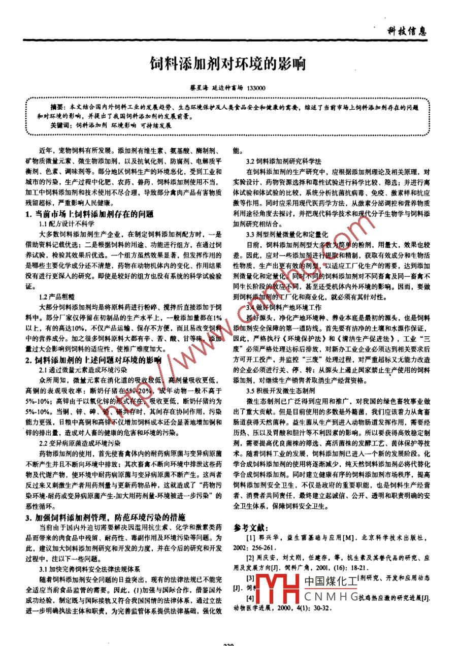 科技信息飼料添加劑對環(huán)境的影響蔡星海延邊種畜場13000摘要:本文結(jié)合國內(nèi)外飼料工業(yè)的發(fā)展趨勢、生態(tài)環(huán)境保護(hù)及人類食品安全和健康的需要,綜述了當(dāng)前市場上飼料添加劑存在的問題和對環(huán)境的影響,并提出了我國飼料添加劑的發(fā)展前景。關(guān)鍵詞:飼料添加劑環(huán)堍影響可持續(xù)發(fā)展近年,寵物飼料有所發(fā)展。添加劑有維生素、氨基酸、酶制劑、能。礦物質(zhì)微量元素、微生物添加劑,以及抗氧化劑、防腐劑、電解質(zhì)平3.2飼料添加劑研究科學(xué)法衡劑、色素、調(diào)味劑等。部分地區(qū)飼料生產(chǎn)的環(huán)境惡化,受到工業(yè)和在飼料添加劑的生產(chǎn)研究中,應(yīng)根據(jù)舔加劑理論及相關(guān)原理,對城市的污染,生產(chǎn)過程中化肥、農(nóng)藥、獸藥、飼料添加劑使用不當(dāng),實(shí)驗(yàn)設(shè)計(jì)、 藥物資源選撣和毒性試驗(yàn)進(jìn)行科學(xué)比較、篩選;并進(jìn)行離加工中飼料添加劑和技術(shù)使用不盡合理,導(dǎo)致部分禽肉產(chǎn)品有害物質(zhì)體試驗(yàn)和體試驗(yàn)的比較,系統(tǒng)分析抗菌抗病毒、免疫、激素樣和抗應(yīng)殘留超標(biāo),嚴(yán)重影響人民健康。激等作用。同時(shí)應(yīng)采用現(xiàn)代醫(yī)藥學(xué)方法,從激素分泌調(diào)控和營養(yǎng)物質(zhì)1.當(dāng)前市場上:飼料添加劑存在的問題利用途徑角度去探討,并把現(xiàn)代科學(xué)技術(shù)和現(xiàn)代分子生物學(xué)與飼料添1.1 配方設(shè)計(jì)不科學(xué)加劑研究相結(jié)合。大多數(shù)飼料添加劑生產(chǎn)企業(yè),在制定飼料添加劑配方時(shí),一是3.3劑型劑量微量化和定量化借助資料記載優(yōu)選;二是根據(jù)飼料的用途、功能進(jìn)行組方,在通過飼目前,飼料添加劑劑型大多數(shù)為簡單的粉劑,用量大,效果也較養(yǎng)試驗(yàn),檢驗(yàn)其效果后優(yōu)選。-一個(gè)組方雖然效果顯著,但發(fā)揮作用的差。 因此,應(yīng)對-些添加劑進(jìn)行提取和精制,獲取有效成分和生物活是哪些主要化學(xué)成分還不清楚,藥物在動(dòng)物機(jī)體內(nèi)的變化、作用結(jié)果性物質(zhì), 生產(chǎn)出更有效的劑型,以適應(yīng)工廠化生產(chǎn)的需要,達(dá)到添加沒有進(jìn)行更深人的研究。即使是較好的組方也沒有系統(tǒng)的科學(xué)試驗(yàn)驗(yàn)劑微 量化和定量化。同時(shí)不同的飼料添加劑對不同畜禽及同一畜禽不證。同生長階段的效應(yīng)不同,甚至還受機(jī)體內(nèi)外環(huán)境的影響。因而,要做1.2產(chǎn)品粗糙到飼料添加劑的工廠化和商業(yè)化,就必須有其針對性。大部分飼料添加劑均是將原料藥進(jìn)行粉碎、攪拌后直接添加于飼3.4做好飼料產(chǎn)地環(huán)境工作料中。部分廠家僅停留在初制品的生產(chǎn)水平上,一般添加量都在1%抓好源頭,凈化產(chǎn)地環(huán)境種、養(yǎng)業(yè)本底是最初的瀕頭,也是飼料以上,有的高達(dá)10%,不僅產(chǎn)品運(yùn)輸、保存不方便,而且易改變飼料添加劑安全保障的第- -道防線。首先要有潔凈的土壤和水源作保證,中的營養(yǎng)成分。加之很多飼料原料大都有辛、苦、酸、甘等味,舔加因此, 嚴(yán)格執(zhí)行《環(huán)境保護(hù)法》和《清潔生產(chǎn)促進(jìn)法》,工業(yè)“三量過大會(huì)影響到飼料的適應(yīng)性,使推廣難度加大。廢"必須嚴(yán)格處理達(dá)標(biāo)后排放,對新辦工業(yè)企業(yè)必須達(dá)到相關(guān)要求后2.飼料添加劑的上.述問題對環(huán)境的影響方可開工投產(chǎn),并監(jiān)控“三廢"處理過程,對嚴(yán)重超標(biāo)又尤能力改造2.1通過微量元素造成環(huán)境污染的企業(yè)必須進(jìn)行關(guān)、停、轉(zhuǎn);從源頭上遏止國家禁止生產(chǎn)使用的飼料眾所周知,微量元素在消化道的吸收較低,高劑量吸收更低,添加劑,對繼續(xù)生產(chǎn)銷售者取消生產(chǎn)經(jīng)營資格。高銅的表觀吸收率:斷奶仔豬在5%-20%,成年動(dòng)物一般不高于3.5積極開發(fā)微生態(tài)制劑5%-10%;高鋅由于以氧化鋅的形式存在,吸收更低,斷奶仟豬約為微生態(tài)制劑已廣泛得到應(yīng)用和推廣,對我國的綠色畜牧事業(yè)做5%-10%。當(dāng)銅、鋅、砷、鉛、鎘共存時(shí),其間存在協(xié)同作用,污染出了重大貢獻(xiàn)。 但是目前使用的多數(shù)是外籍菌,我們應(yīng)該著力從禽畜能力更強(qiáng),日糧中高銅和高鋅不僅增加飼料成本還會(huì)顯著地增加銅和腸道 獲得天然菌種。益生菌從生產(chǎn)到進(jìn)入動(dòng)物腸道發(fā)揮作用,需要經(jīng)鋅的排出量,造成對人畜的健康的危害和環(huán)境的污染。歷熱、壓以及臂酸和膽汁等不利因素的影響。所以要獲得高效穩(wěn)定制2.2變異病原菌造成環(huán)境污染劑,需要提高優(yōu)良菌株的篩選、高活菌株的發(fā)酵工藝、茵體保護(hù)等枝藥物添加劑的使用,首先使畜禽體內(nèi)的耐藥病原菌與變異病原菌術(shù)。隨著飼料工業(yè)的發(fā)展,飼料添加劑已進(jìn)入一-個(gè)新的發(fā)展階段?;粩喈a(chǎn)生并且不斷向環(huán)境中排放;其次畜禽不斷向環(huán)境中排泄這些藥學(xué)合 成飼料添加劑的使用將逐漸減少,純天然飼料添加劑必將代替化物及代謝產(chǎn)物,使環(huán)境中耐藥病原菌與變