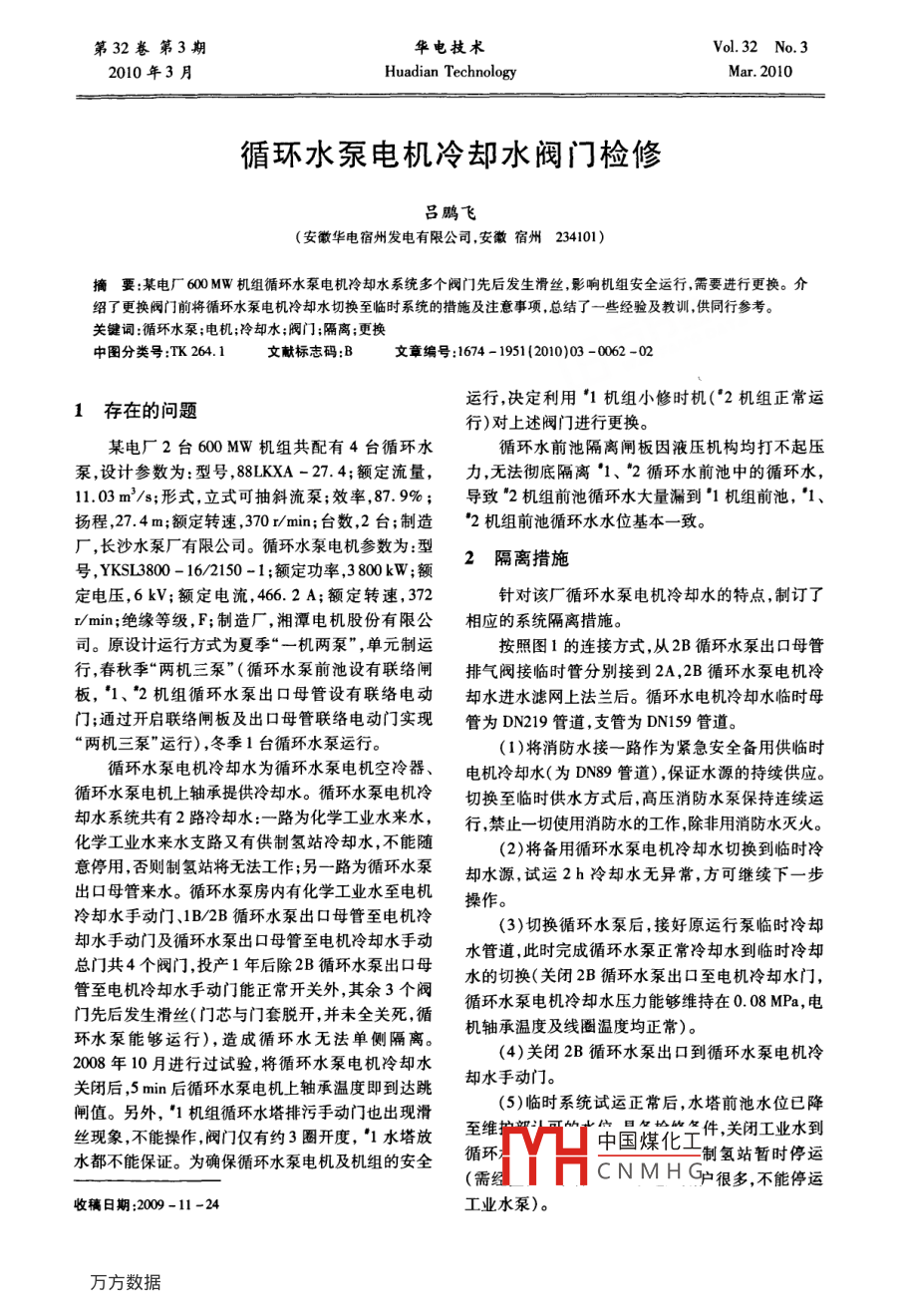 第32卷第3期華電技術Vol.32 No.32010年3月Huadian TechnologyMar.2010循環(huán)水泵電機冷卻水閥門檢修呂鵬飛(安徽華電宿州發(fā)電有限公司,安徽宿州234101)摘要:某電廠600 MW機組循環(huán)水泵電機冷卻水系統(tǒng)多個閥門先后發(fā)生滑絲,影響機組安全運行,需要進行更換。介紹了更換閥門前將循環(huán)水泵電機冷卻水切換至臨時系統(tǒng)的措施及注意事項,總結了一些經(jīng)驗及教訓,供同行參考。關鍵詞:循環(huán)水泵;電機;冷卻水;閥門;隔離;更換中圖分類號:TK 264.1文獻標志碼:B文章編號:1674 - 1951 (2010)03 -0062 -02運行,決定利用'1機組小修時機("2機組正常運1存在的問題行)對上述閥門進行更換。某電廠2臺600MW機組共配有4臺循環(huán)水.循環(huán)水前池隔離閘板因液壓機構均打不起壓泵,設計參數(shù)為:型號,88LKXA - 27.4;額定流量, .力,無法徹底隔離1、*2循環(huán)水前池中的循環(huán)水,11.03 m'/s;形式,立式可抽斜流泵;效率,87.9%;導致"2機組前池循環(huán)水大量漏到"1機組前池,'1、揚程,27.4 m;額定轉速,370 r/min;臺數(shù),2臺;制造*2機組前池循環(huán)水水位基本- -致。廠,長沙水泵廠有限公司。循環(huán)水泵電機參數(shù)為:型2隔離措施號,YKSL3800 - 16/2150 -1;額定功率,3800 kW;額定電壓,6kV;額定電流, 466.2 A;額定轉速,372針對該廠循環(huán)水泵電機冷卻水的特點,制訂了r/min;絕緣等級, F;制造廠,湘潭電機股份有限公相應的系統(tǒng)隔離措施。司。原設計運行方式為夏季“- -機兩泵" ,單元制運按照圖1的連接方式,從2B循環(huán)水泵出口母管行,春秋季“兩機三泵"(循環(huán)水泵前池設有聯(lián)絡閘排氣閥接臨時管分別接到2A,2B循環(huán)水泵電機冷板,*1、*2機組循環(huán)水泵出口母管設有聯(lián)絡電動卻水進水濾網(wǎng)上法蘭后。循環(huán)水電機冷卻水臨時母門;通過開啟聯(lián)絡閘板及出口母管聯(lián)絡電動門實現(xiàn)管為DN219管道,支管為DN159管道。“兩機三泵”運行),冬季1臺循環(huán)水泵運行。(1)將消防水接--路作為緊急安全備用供臨時循環(huán)水泵電機冷卻水為循環(huán)水泵電機空冷器、電機冷卻水(為DN89管道) ,保證水源的持續(xù)供應。循環(huán)水泵電機上軸承提供冷卻水。循環(huán)水泵電機冷切換至臨時供水方式后,高壓消防水泵保持連續(xù)運卻水系統(tǒng)共有2路冷卻水:一路為化學工業(yè)水來水,行,禁止- -切使用消防水的工作,除非用消防水滅火?;瘜W工業(yè)水來水支路又有供制氫站冷卻水,不能隨(2)將備用循環(huán)水泵電機冷卻水切換到臨時冷意停用,否則制氫站將無法工作;另一路為循環(huán)水泵卻水源,試運2h冷卻水無異常,方可繼續(xù)下一步出口母管來水。循環(huán)水泵房內(nèi)有化學工業(yè)水至電機操作。冷卻水手動門、1B/2B循環(huán)水泵出口母管至電機冷(3)切換循環(huán)水泵后,接好原運行泵臨時冷卻卻水手動門及循環(huán)水泵出口母管至電機冷卻水手動水管道,此時完成循環(huán)水泵正常冷卻水到臨時冷卻總門共4個閥門,投產(chǎn)1年后除2B循環(huán)水泵出口母水的切換(關閉2B循環(huán)水泵出口至電機冷卻水門,管至電機冷卻水手動門能正常開關外,其余3個閥循環(huán)水泵電機冷卻水壓力能夠維持在0.08MPa,電門先后發(fā)生滑絲(門芯與門套脫開,并未全關死,循機軸承溫度及線圈溫度均正常)。環(huán)水泵能夠運行),造成循環(huán)水無法單側隔離。(4)關閉2B循環(huán)水泵出口到循環(huán)水泵電機冷2008年10月進行過試驗,將循環(huán)水泵電機冷卻水卻水手動門。關閉后,5min后循環(huán)水泵電機上軸承溫度即到達跳閘值。另外, *1機組循環(huán)水塔排污手動門也出現(xiàn)滑至維(5)臨時系統(tǒng)試運正常后,水塔前池水位已降件,關閉工業(yè)水到絲現(xiàn)象,不能操作,閥門僅有約3圈開度, '1水塔放循環(huán)中國煤化工=制氫站暫時停運水都不能保證。為確保循環(huán)水泵電機及機組的安全(需經(jīng)YHCN M H G中很多,不能停運收稿日期:2009-11 -24工業(yè)水泵)。第3期呂鵬飛:循環(huán)水泵電機冷卻水閥門檢修.63●1A循環(huán)水泵1B循環(huán)水泵2A循環(huán)水泵2B循環(huán)水泵接空器冷查查金查-◎一?t?文586圣日電_器制氫站冷卻水略果文咽文- D41B出」 2B出圈1循環(huán)水泵電機冷 卻水系統(tǒng)(臨時管路)(6)關閉2A,2B循環(huán)水泵電機冷卻水電動門并關閉 備用泵冷卻水手動門,聯(lián)系汽機維護部緊急恢掛禁.止操作。復臨時管道。(2)加強對運行循環(huán)水泵電機軸承溫度及上導3技術要求瓦溫度、繞組溫度的監(jiān)控,發(fā)現(xiàn)溫度異常升高應及時(1)開工前檢查循環(huán)水泵房排污泵,保證其完分析原因并處理,必要時可開啟2臺循環(huán)水泵。檢好備用。1A,1B 循環(huán)水泵停電( '1機組小修), '1修 工作未開工前(待拆法蘭未松開螺栓或仍能迅速涼水塔放水(將'1機組水塔排污門門蓋上法蘭螺栓恢復) ,如臨時系統(tǒng)有故障,危及循環(huán)水泵安全,可取下,抽出門芯放水),放入循環(huán)水前池隔離閘板,切換至正式系統(tǒng)(通過開啟*2B 循環(huán)水泵出口至電在1A,1B循環(huán)水泵前池放人4臺150Vh的潛水泵機冷卻水手動門、循環(huán)水泵電機冷卻水電動門、旁路抽水,保證1A,1B循環(huán)水泵前池水位降到1B循環(huán).門) ,隔離漏點后聯(lián)系相關部門檢修臨時系統(tǒng)。水泵出口到電機冷卻水門標高